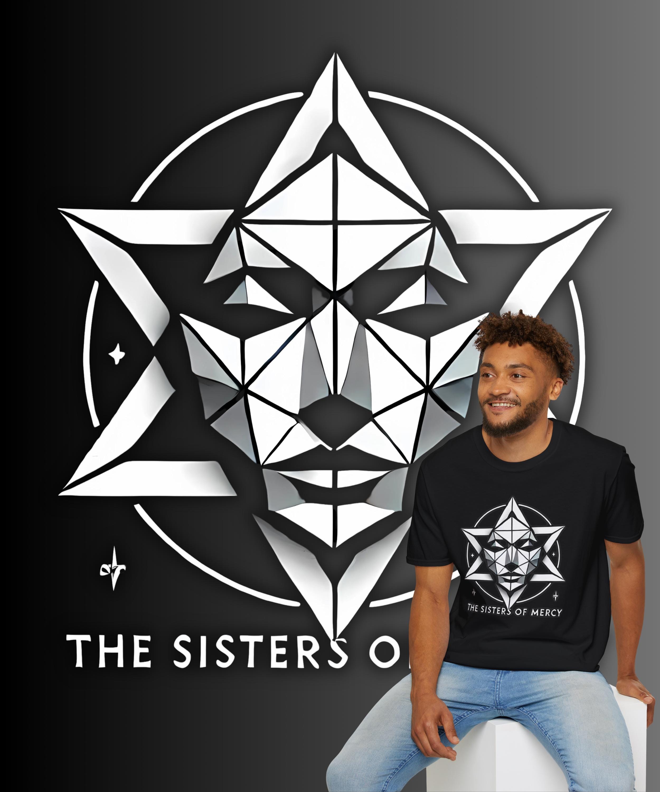 Discover the Sisters of Mercy Facet of Darkness T-Shirt, a striking Gothic minimalist geometric portrait tee that captures the enigmatic allure of dark music and alternative style. Crafted from ultra-soft, Ethically grown cotton, this unisex casual top offers exceptional comfort and versatile wear all year round. Its unique design features an intricately built face from intertwining guys, evoking mystery and intrigue with a gothic-industrial vibe that stands out from the crowd.