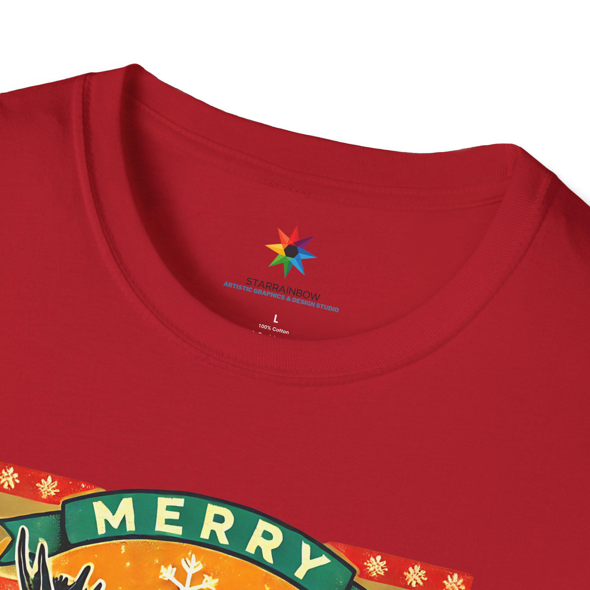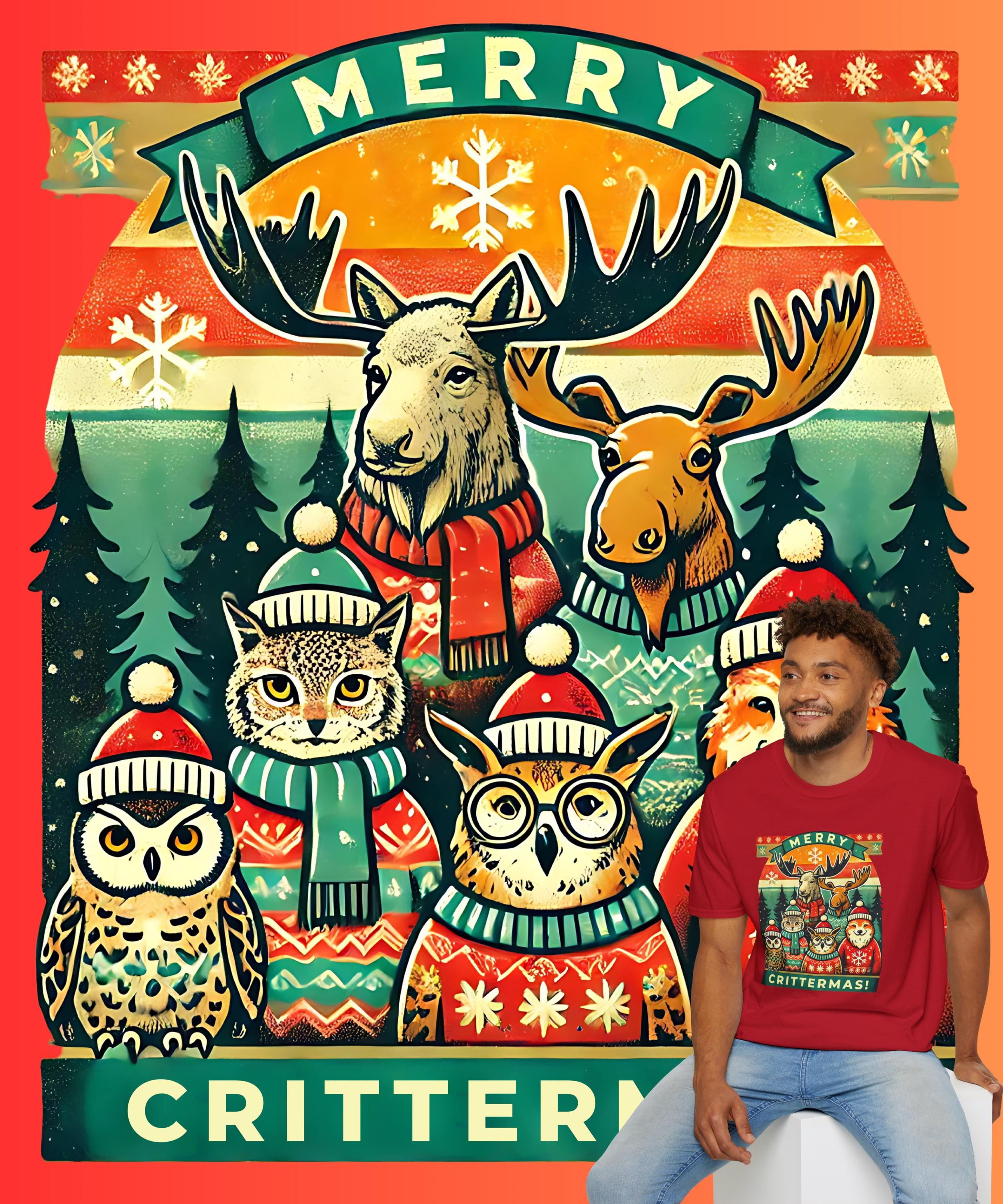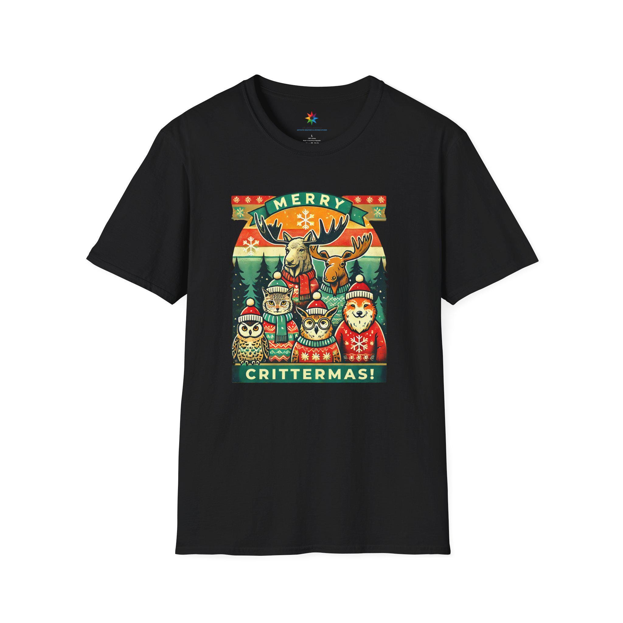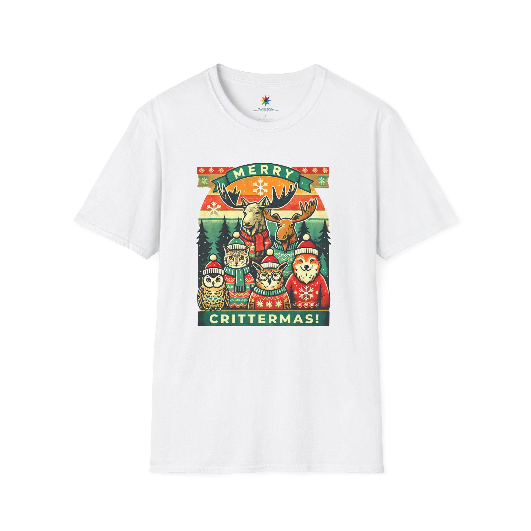 A festive and whimsical unisex softstyle t-shirt featuring charming vintage-inspired illustrations of adorable forest animals in cozy sweaters, perfect for adding a touch of holiday cheer to your wardrobe or as a unique gift for animal lovers. The lightweight fabric and classic fit make it comfortable to wear year-round for any occasion, formal or casual.