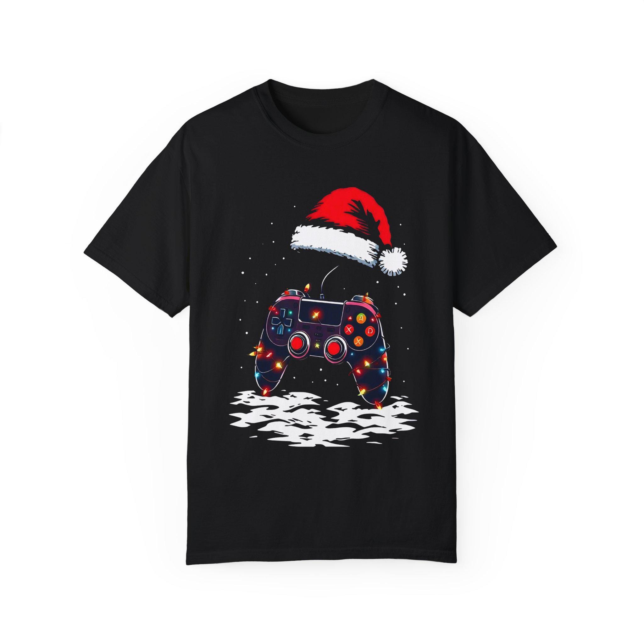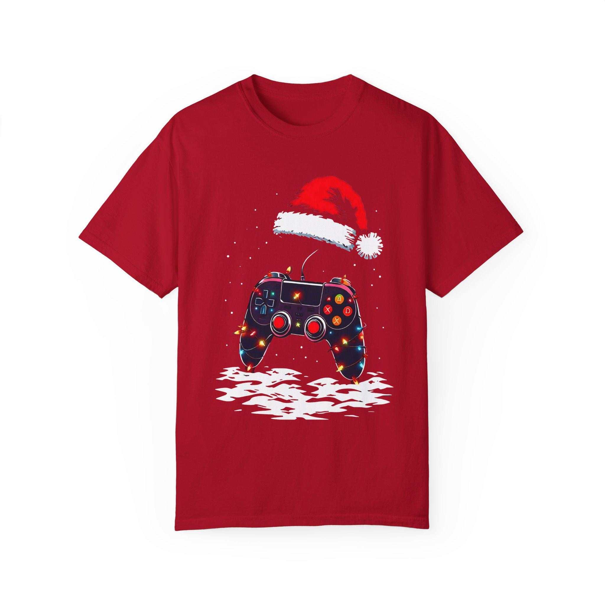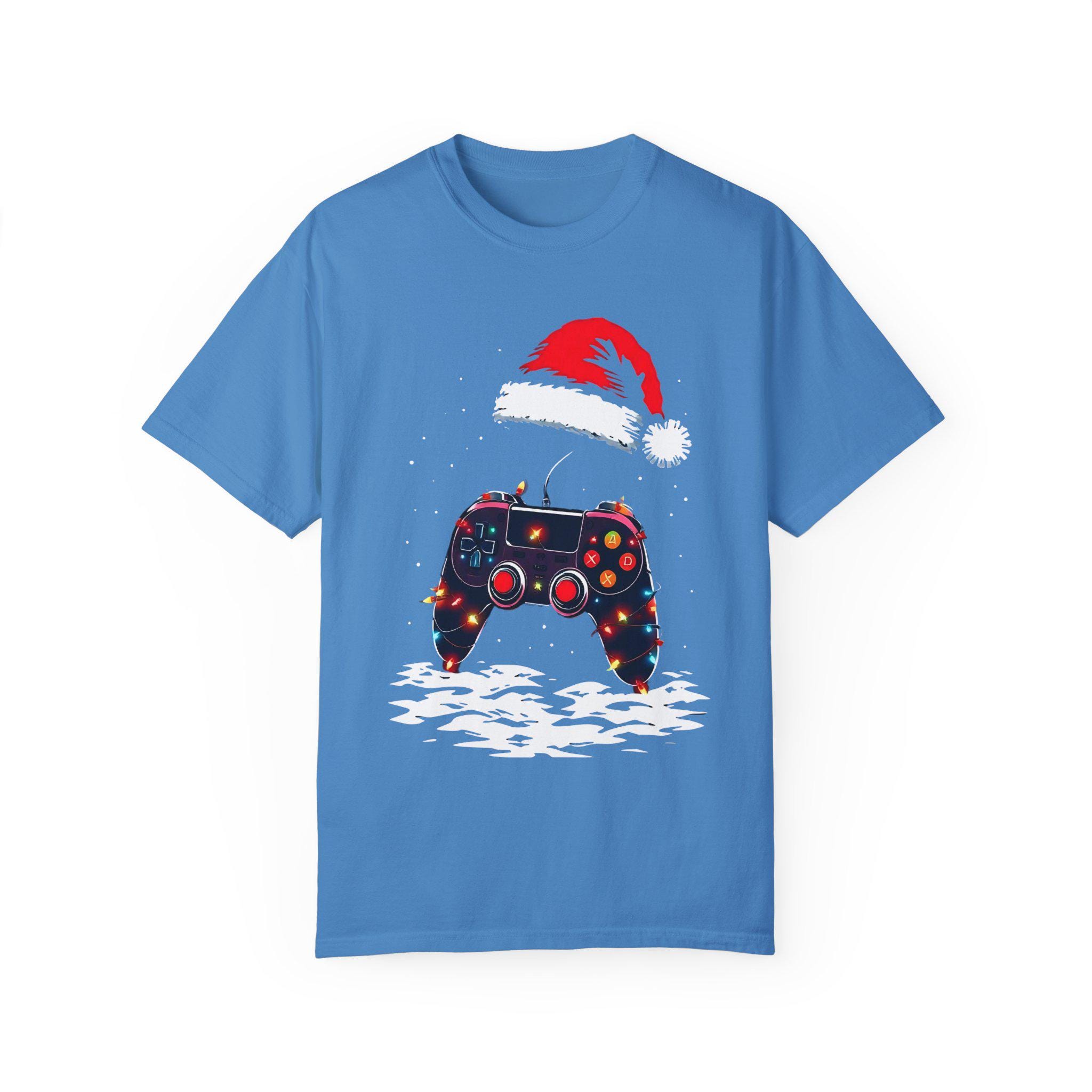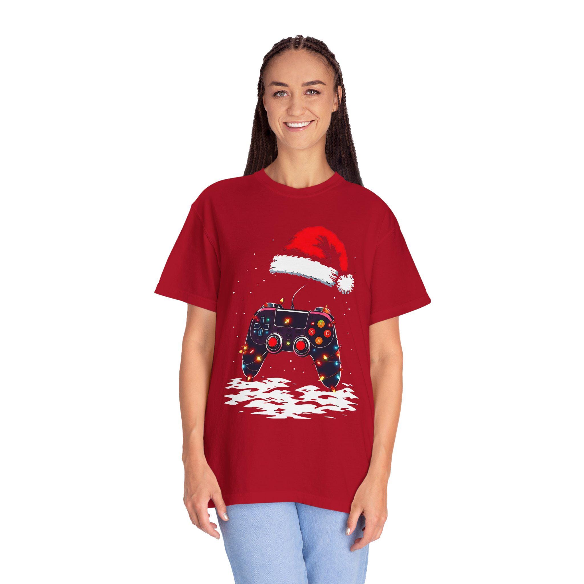 Level up your holiday spirit with this festive gaming T-shirt featuring a gaming controller decked out in Christmas lights and a Santa hat. Perfect for gamers who love to celebrate the holidays, this comfortable garment-dyed tee is made with high-quality ring-spun US cotton for long-lasting comfort. The relaxed fit and crew neckline make it suitable for both casual and semi-formal settings. Perfect for those who enjoy gaming during the holiday season.