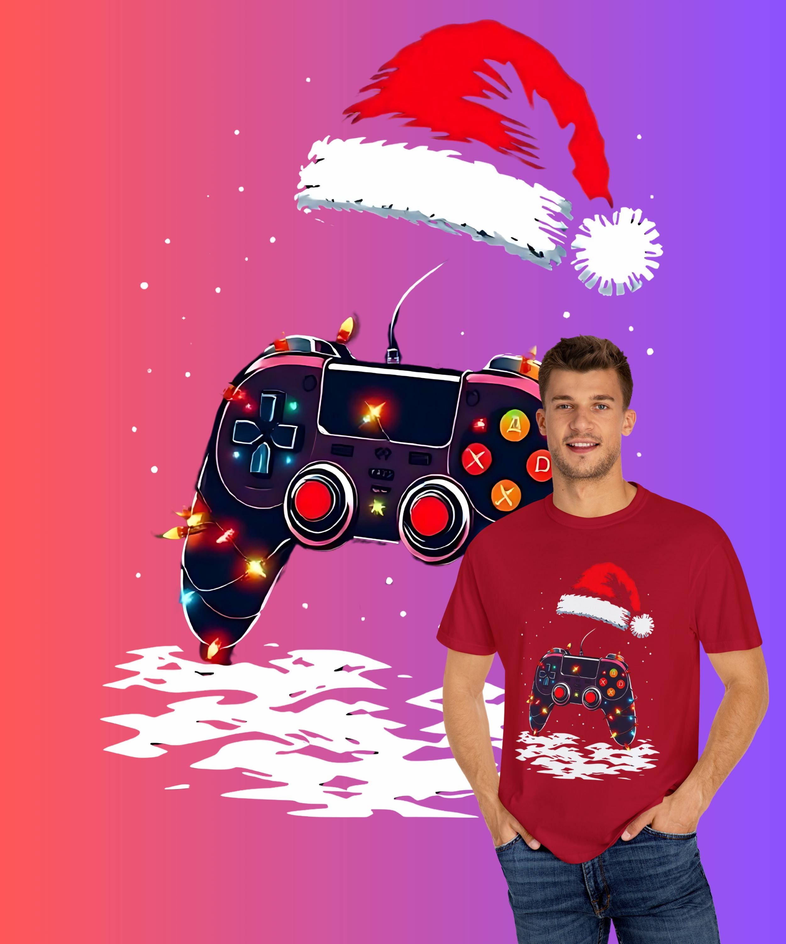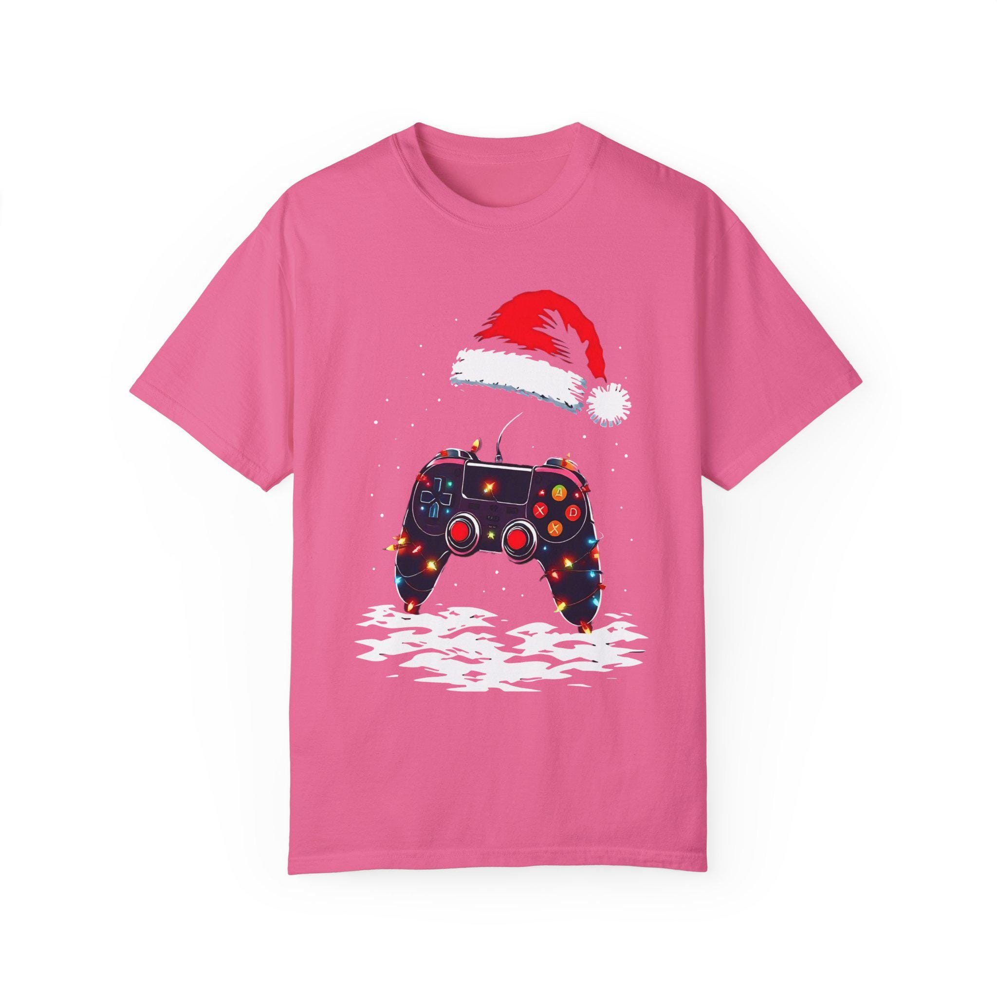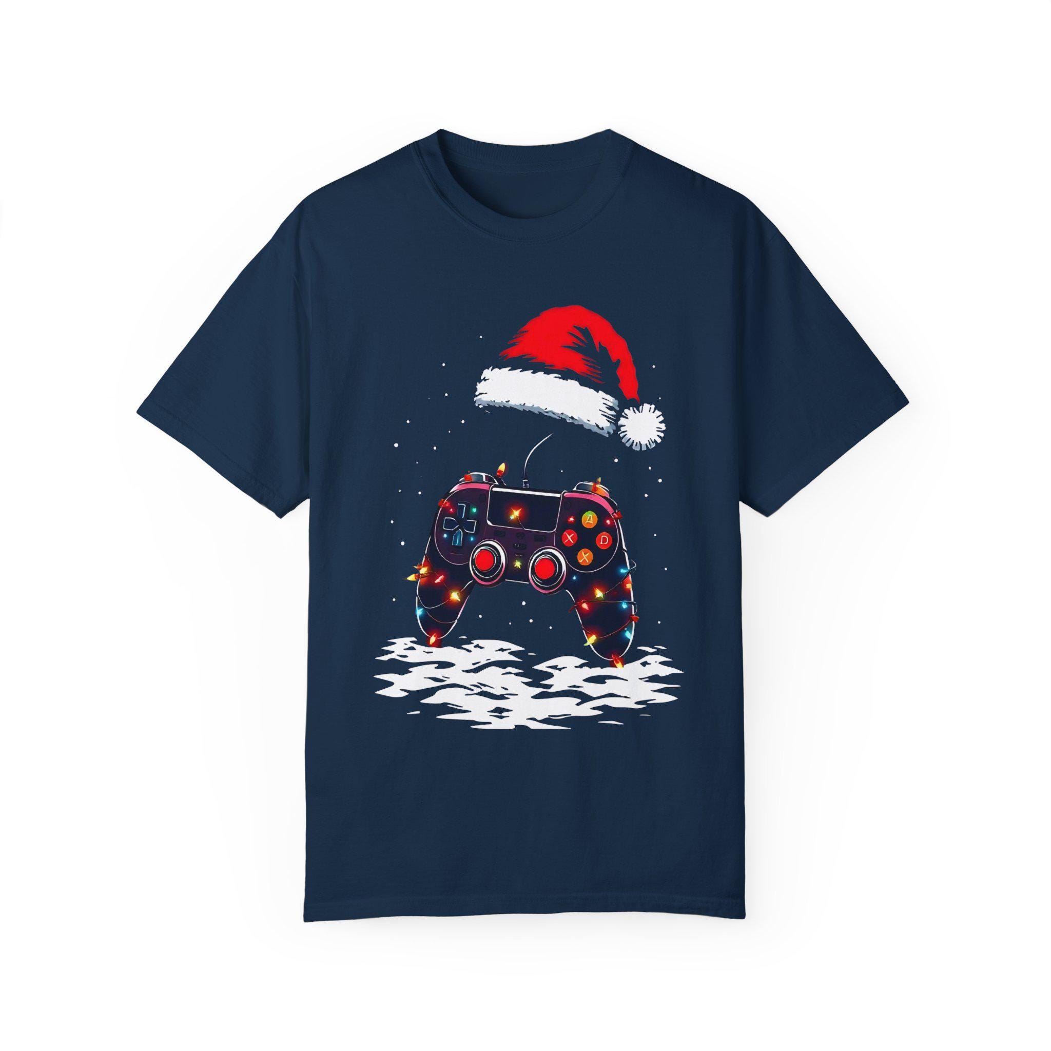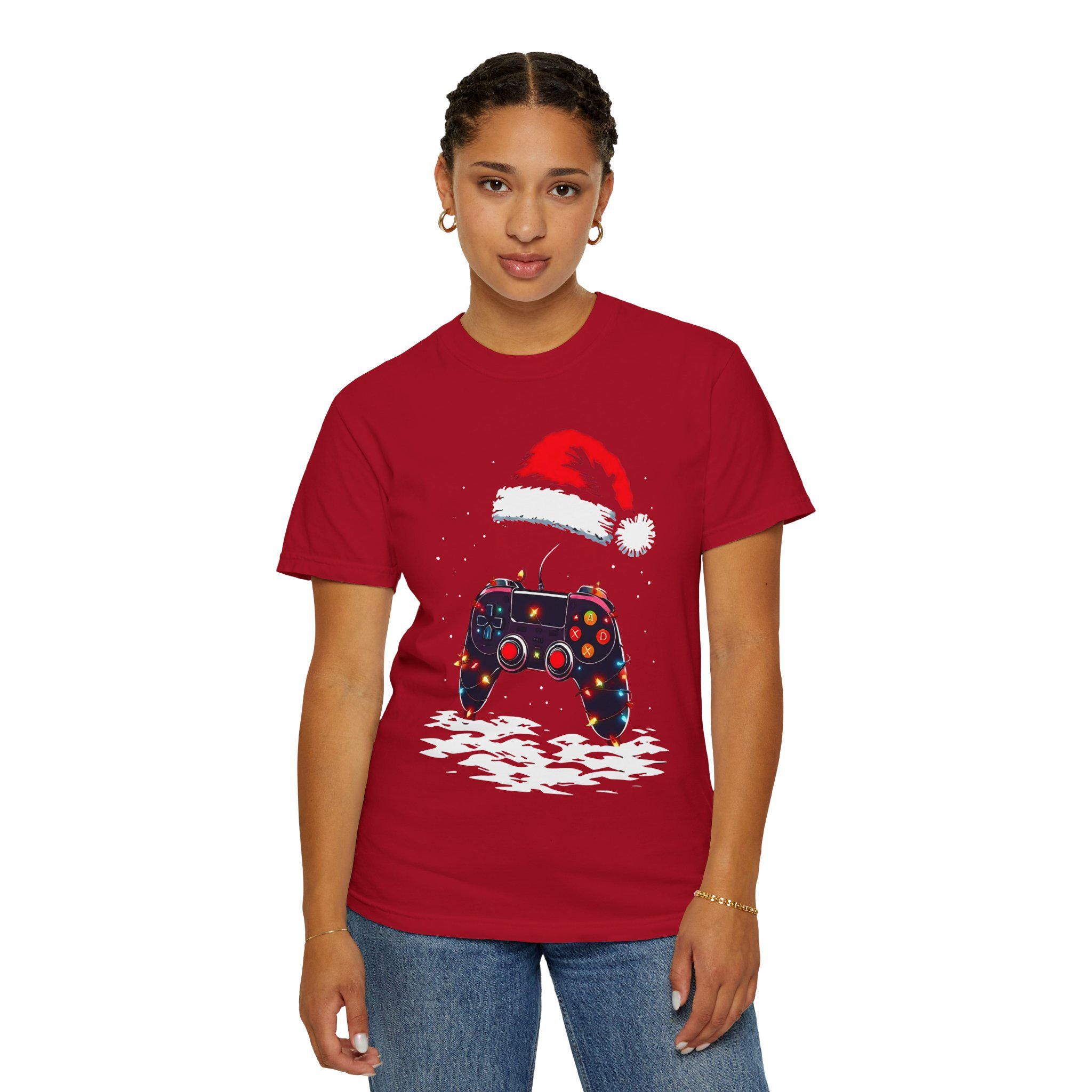 Level up your holiday spirit with this festive gaming T-shirt featuring a gaming controller decked out in Christmas lights and a Santa hat. Perfect for gamers who love to celebrate the holidays, this comfortable garment-dyed tee is made with high-quality ring-spun US cotton for long-lasting comfort. The relaxed fit and crew neckline make it suitable for both casual and semi-formal settings. Perfect for those who enjoy gaming during the holiday season.