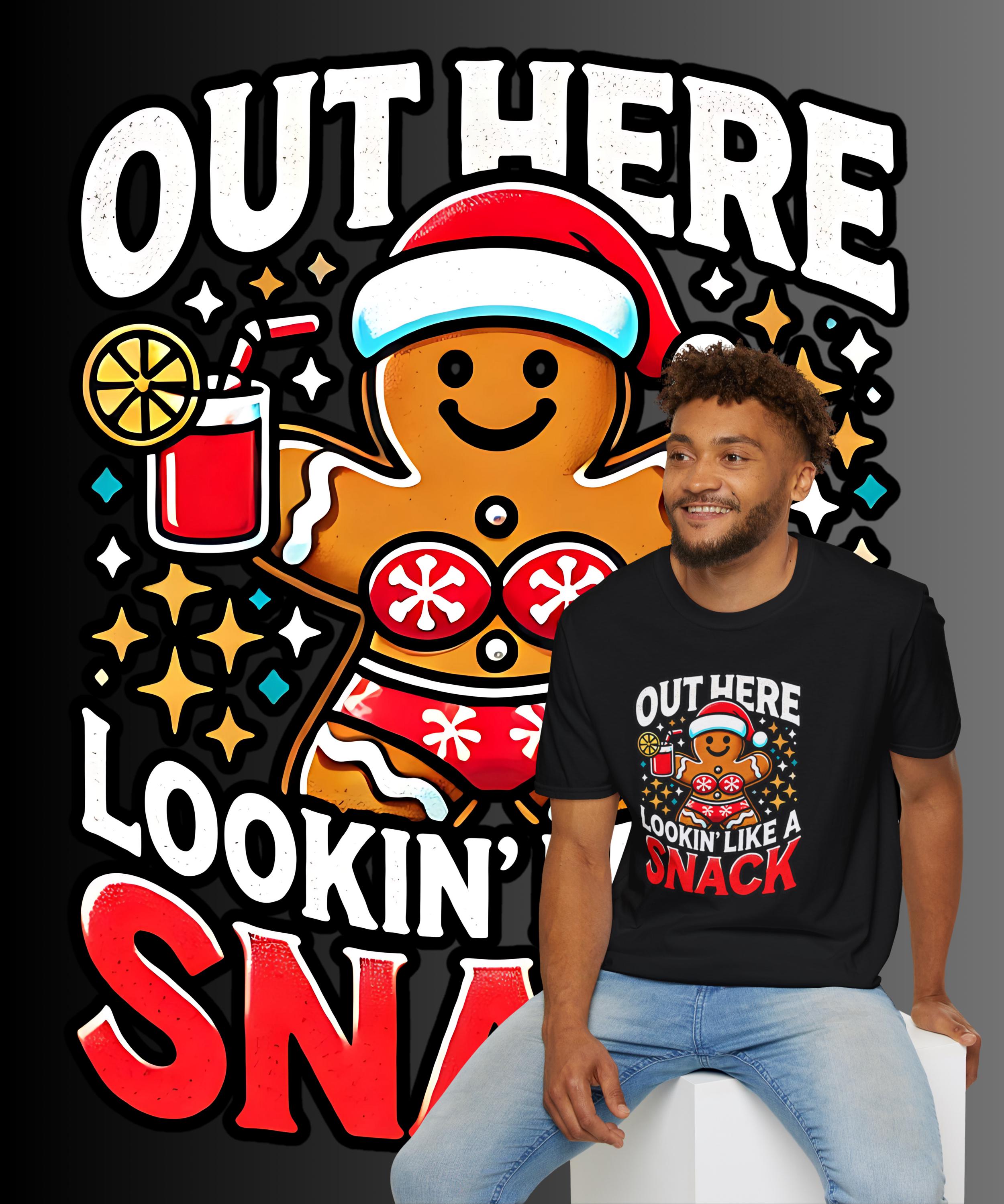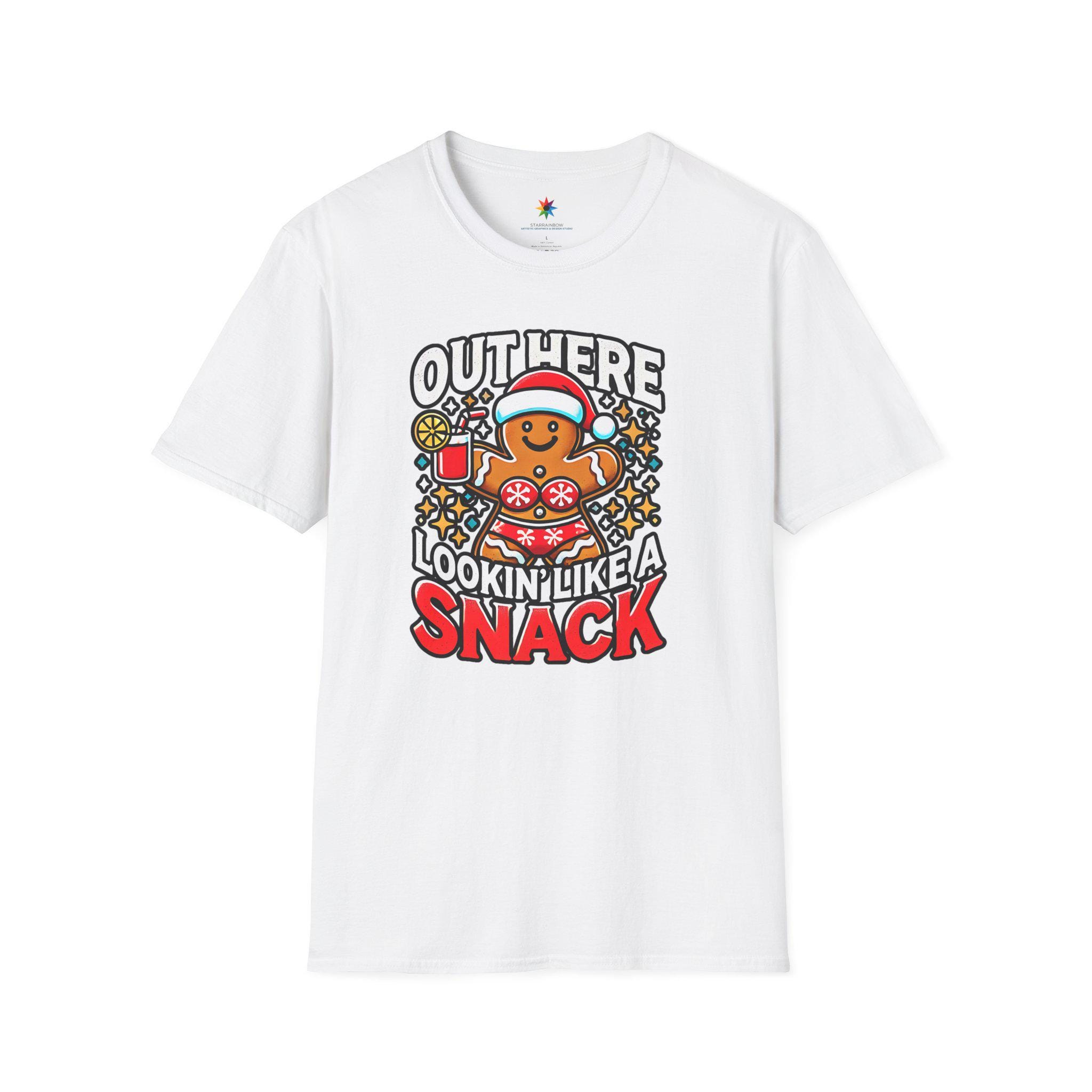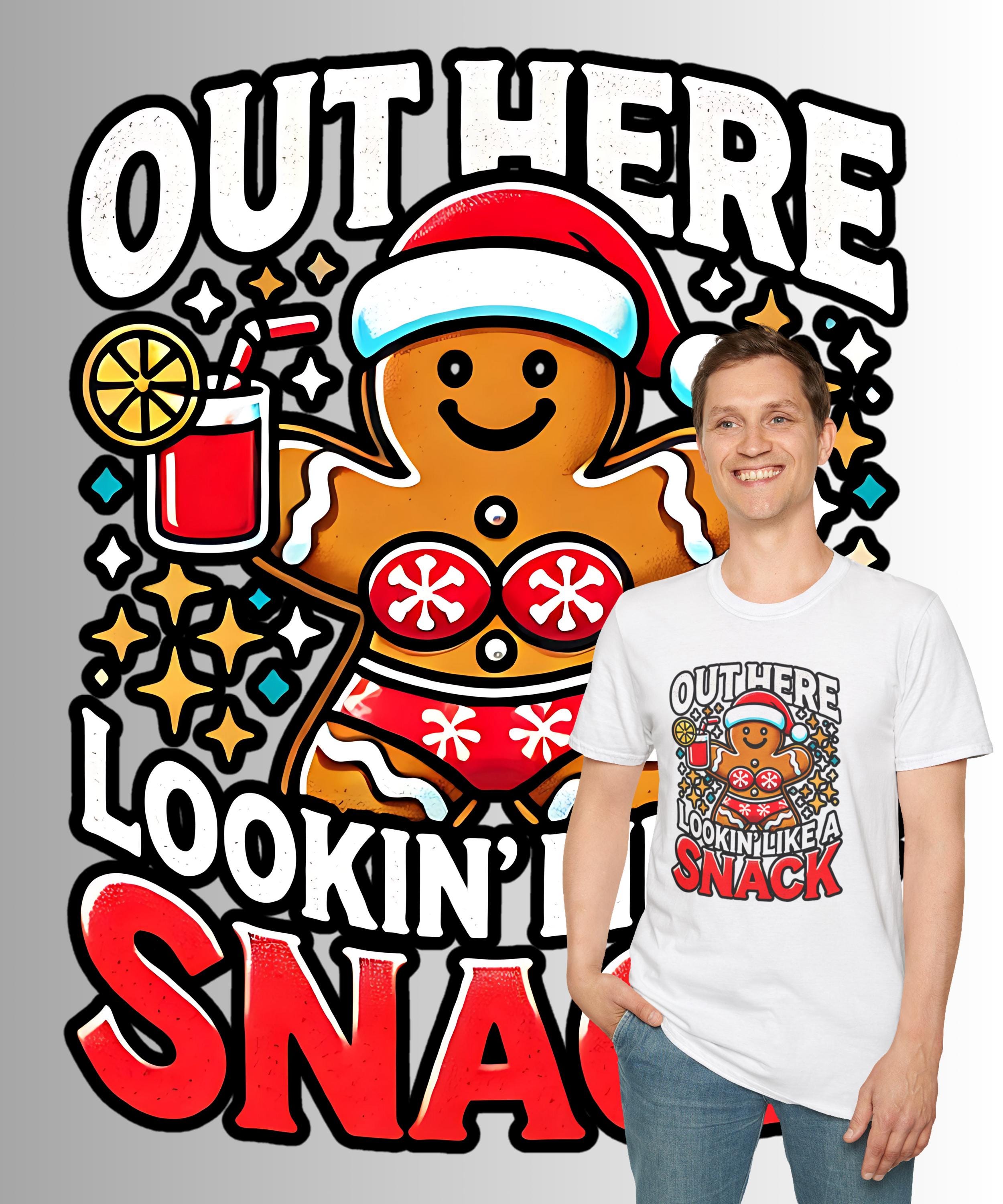 Spread holiday cheer with this fun and playful gingerbread-themed T-Shirt featuring a cute gingerbread figure dressed in festive attire with the caption 'Out Here Lookin' Like a Snack'. Perfect for Christmas season, this whimsical, colorful, and humorous design is a great addition to any holiday celebration. The unisex soft-style T-Shirt made from 100% ring-spun cotton offers comfort and style for all occasions.