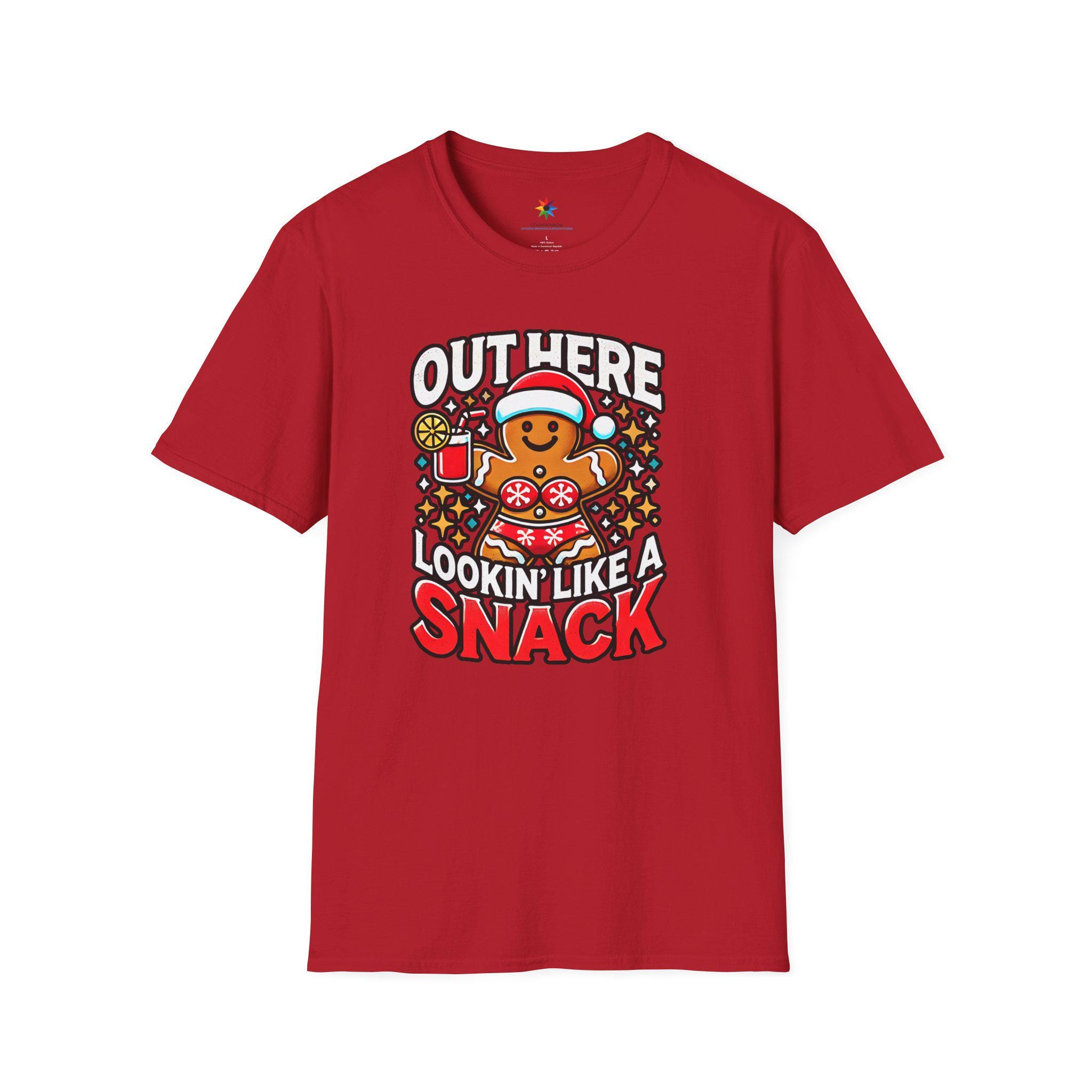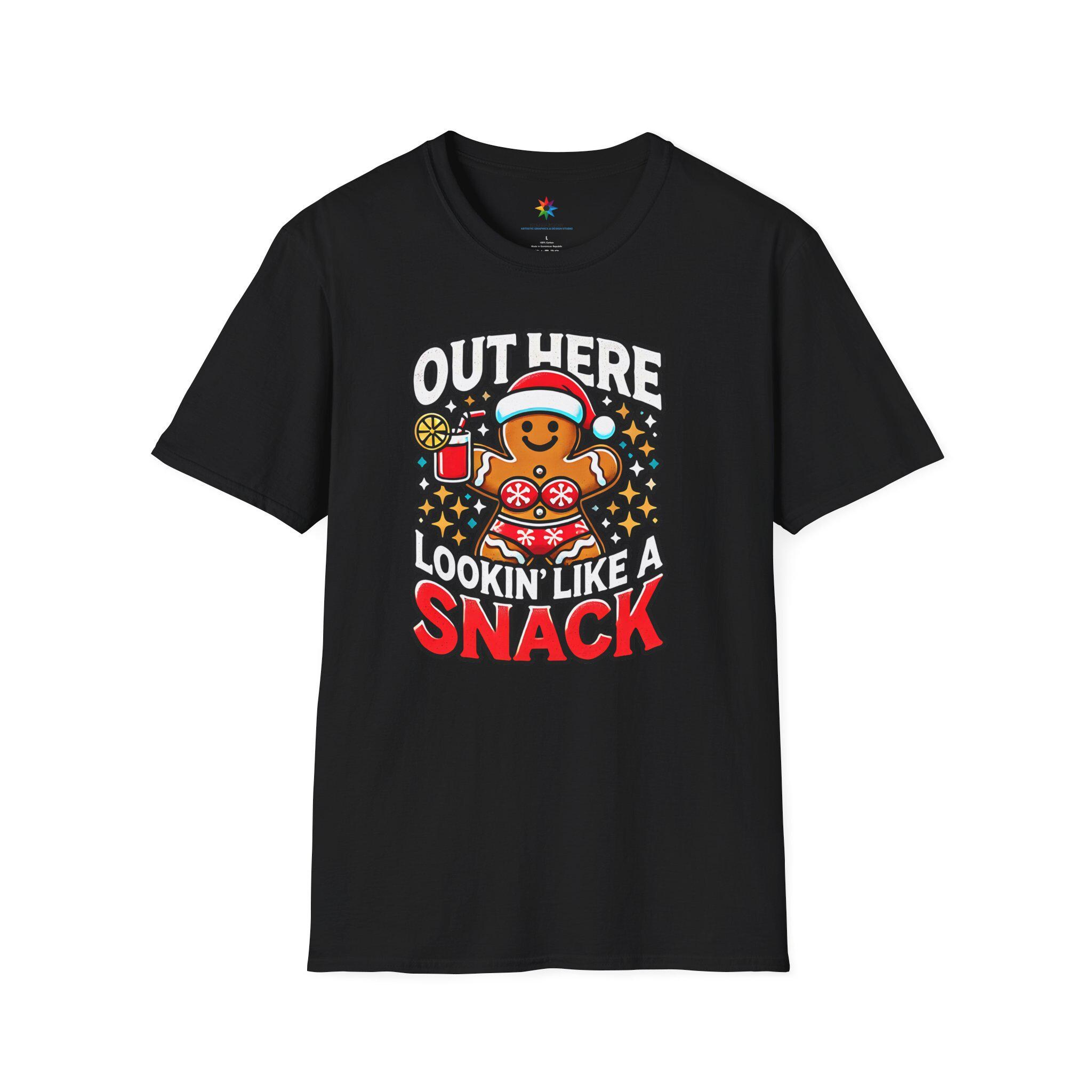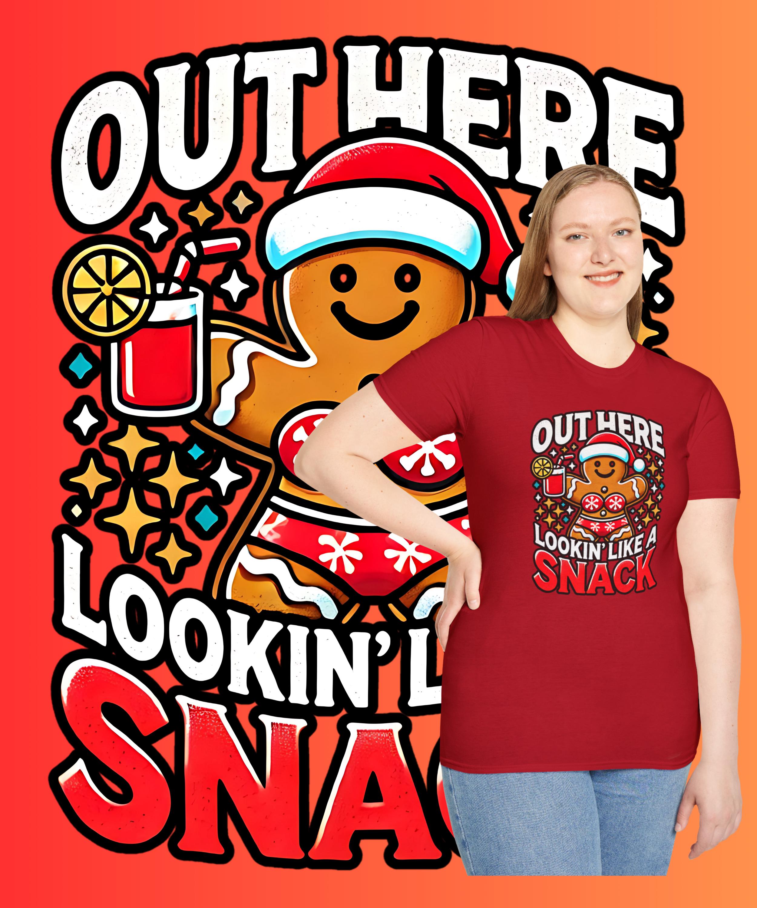 Spread holiday cheer with this fun and playful gingerbread-themed T-Shirt featuring a cute gingerbread figure dressed in festive attire with the caption 'Out Here Lookin' Like a Snack'. Perfect for Christmas season, this whimsical, colorful, and humorous design is a great addition to any holiday celebration. The unisex soft-style T-Shirt made from 100% ring-spun cotton offers comfort and style for all occasions.