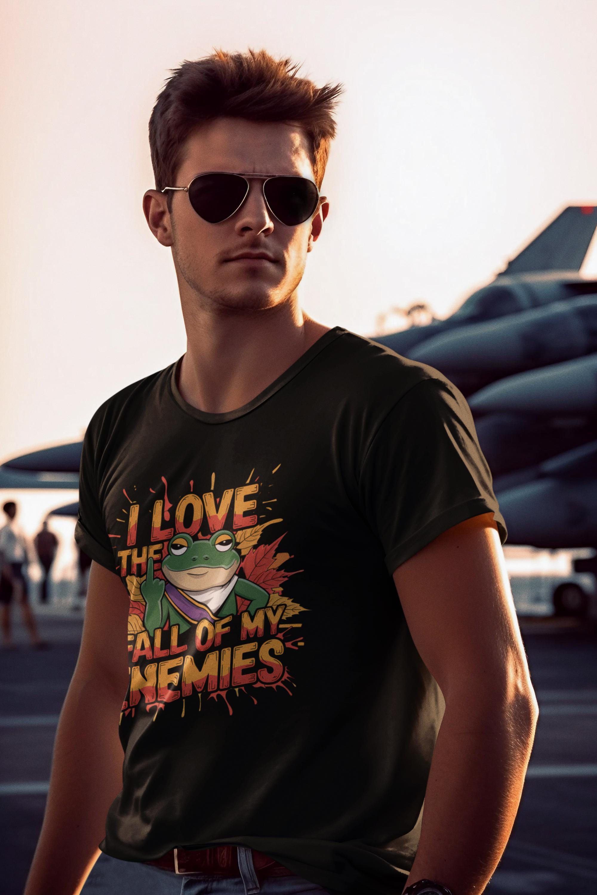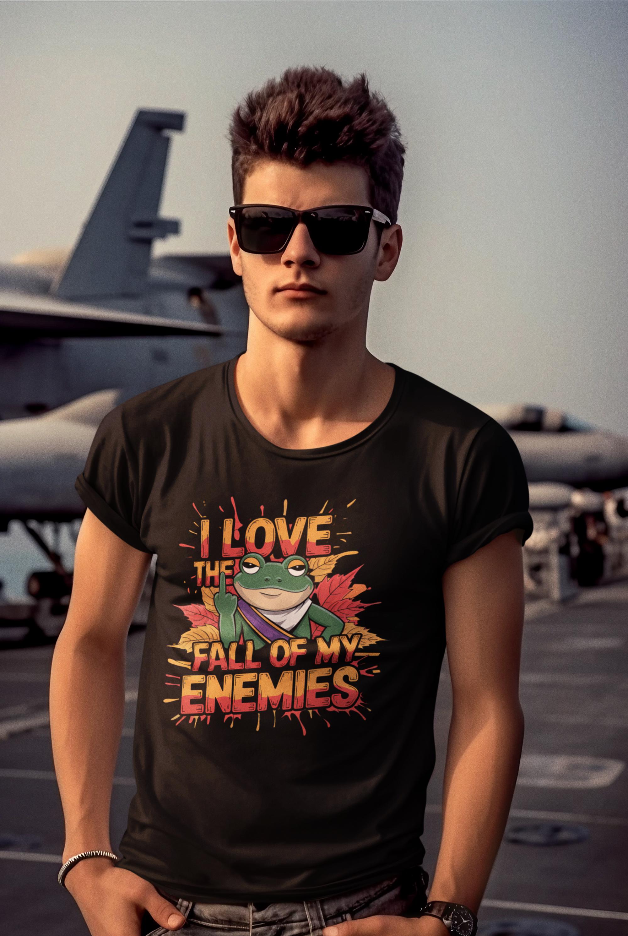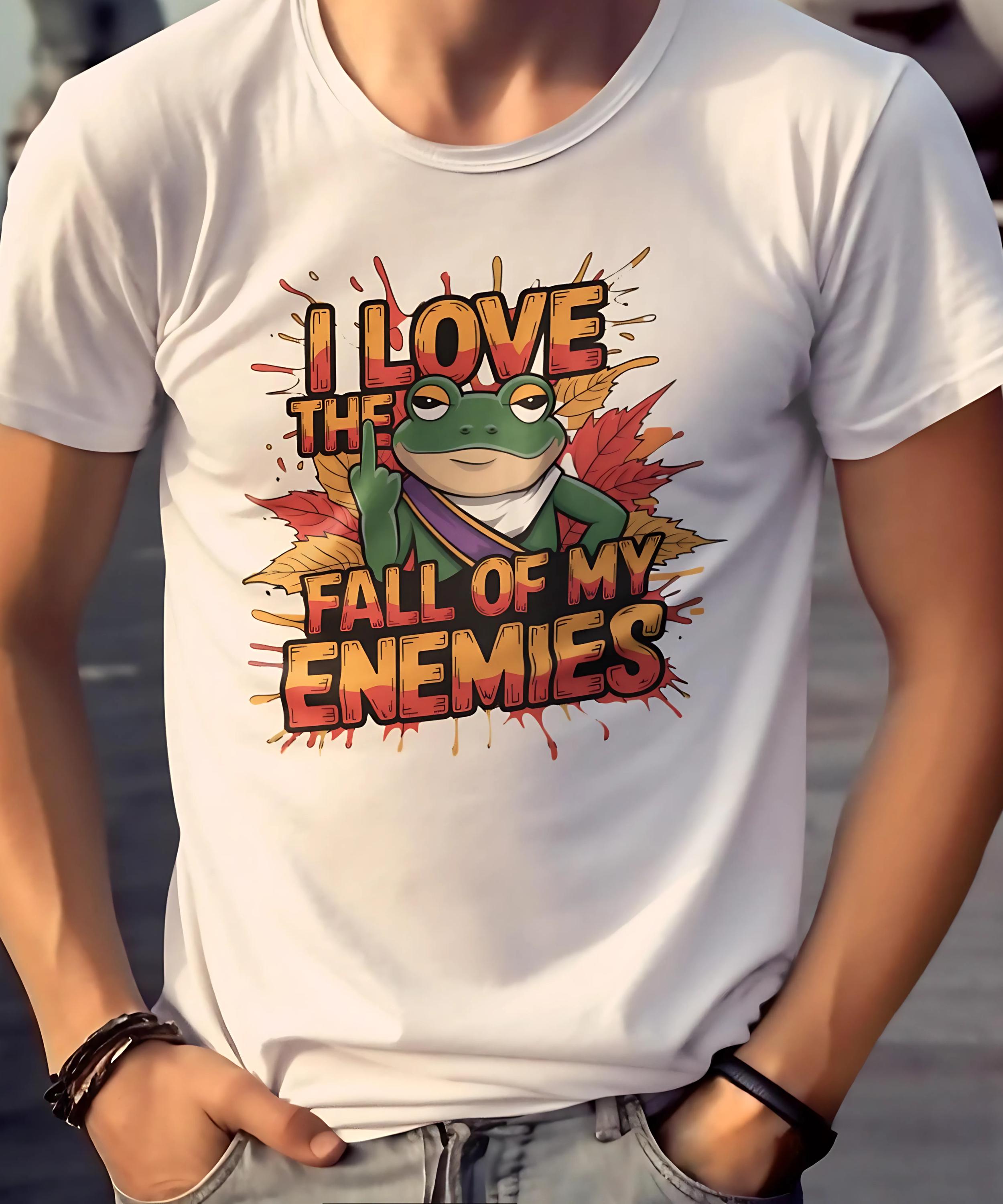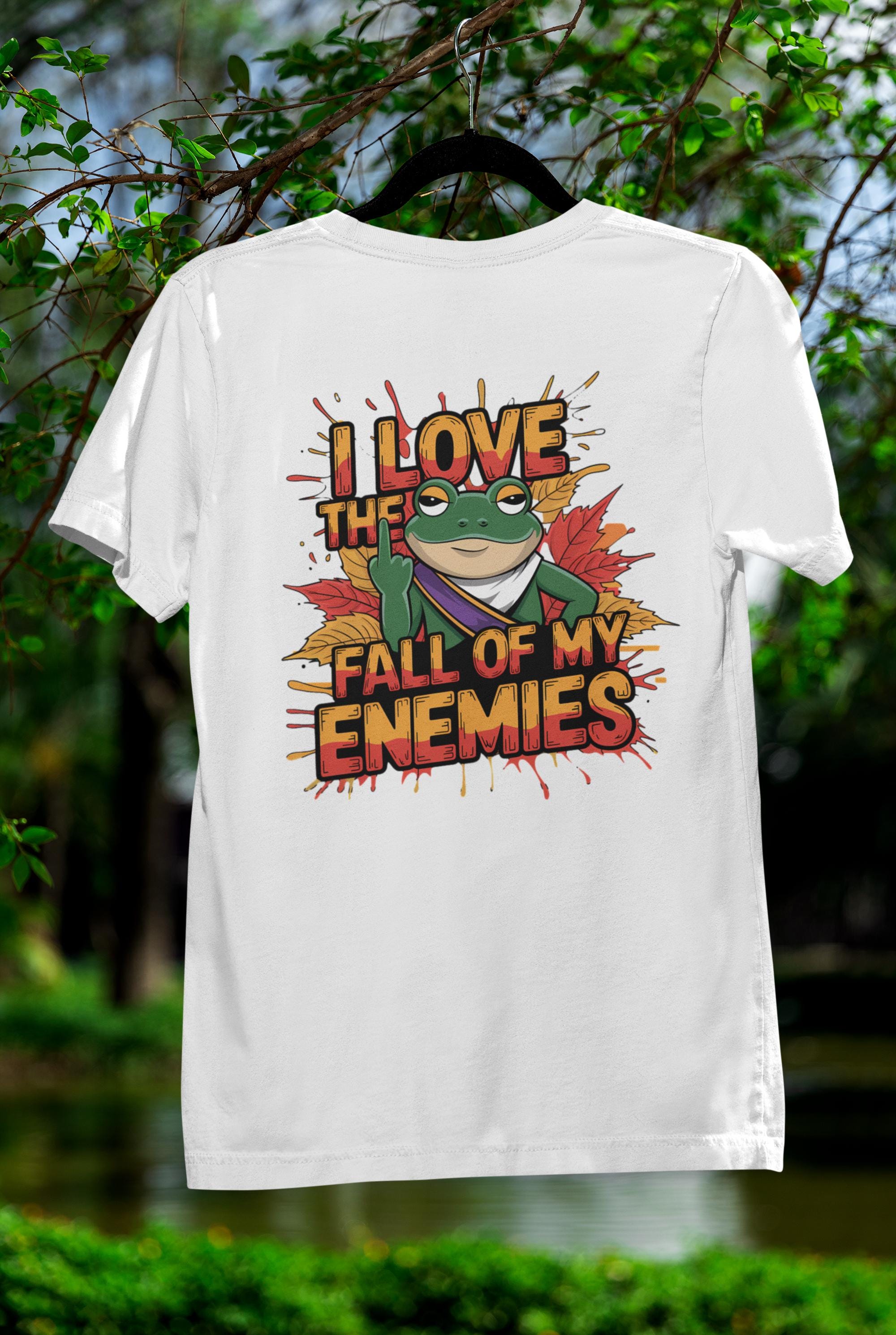 This Funny Frog Graphic Tee is perfect for anyone who loves a cheeky and humorous touch in their wardrobe! Featuring a bold graphic of a frog with the hilarious phrase "I Love the Fall of My Enemies," this quirky animal lover shirt is both eye-catching and playful. It's an excellent statement frog t-shirt that will spark conversations and bring laughs wherever you go.