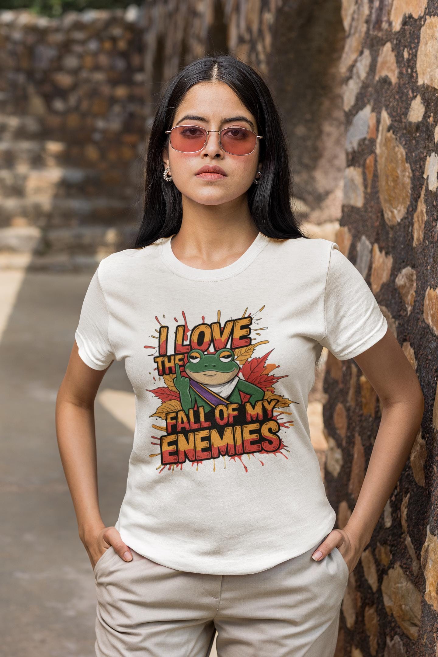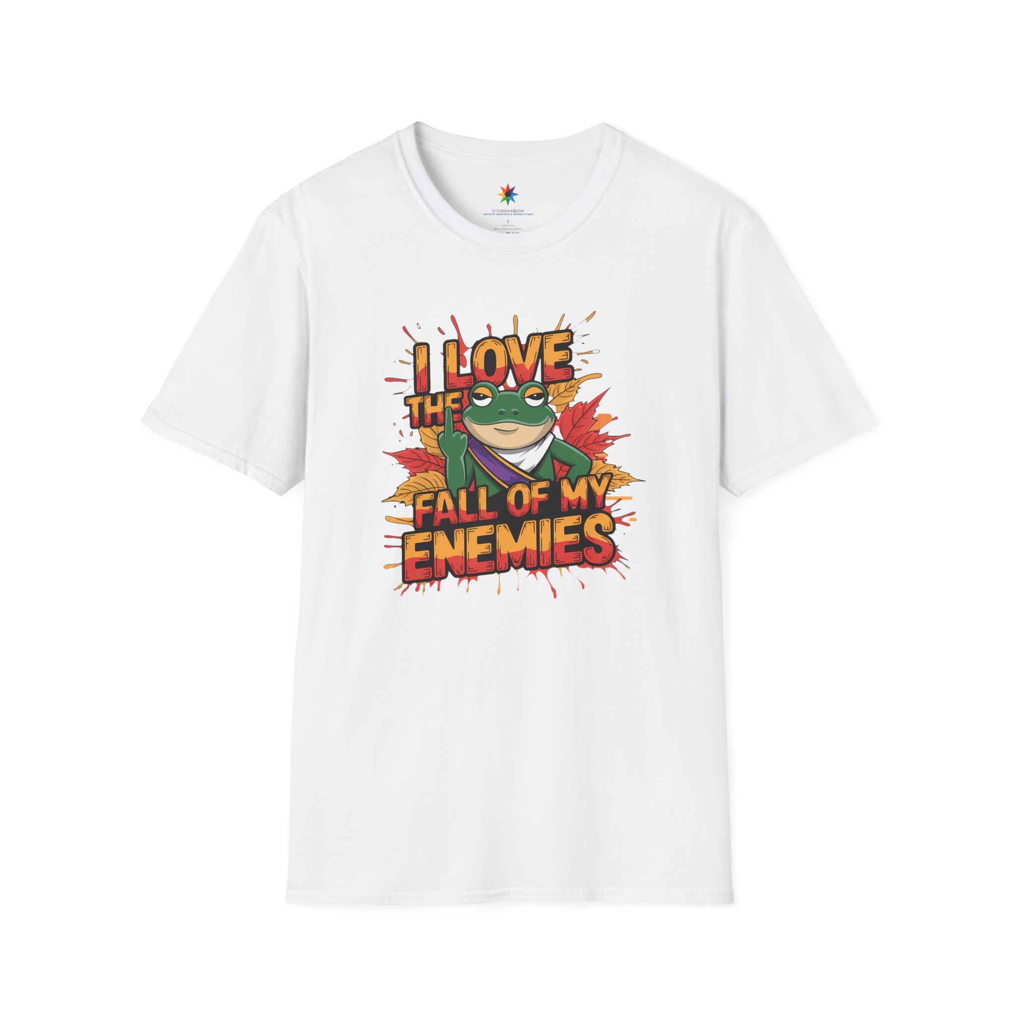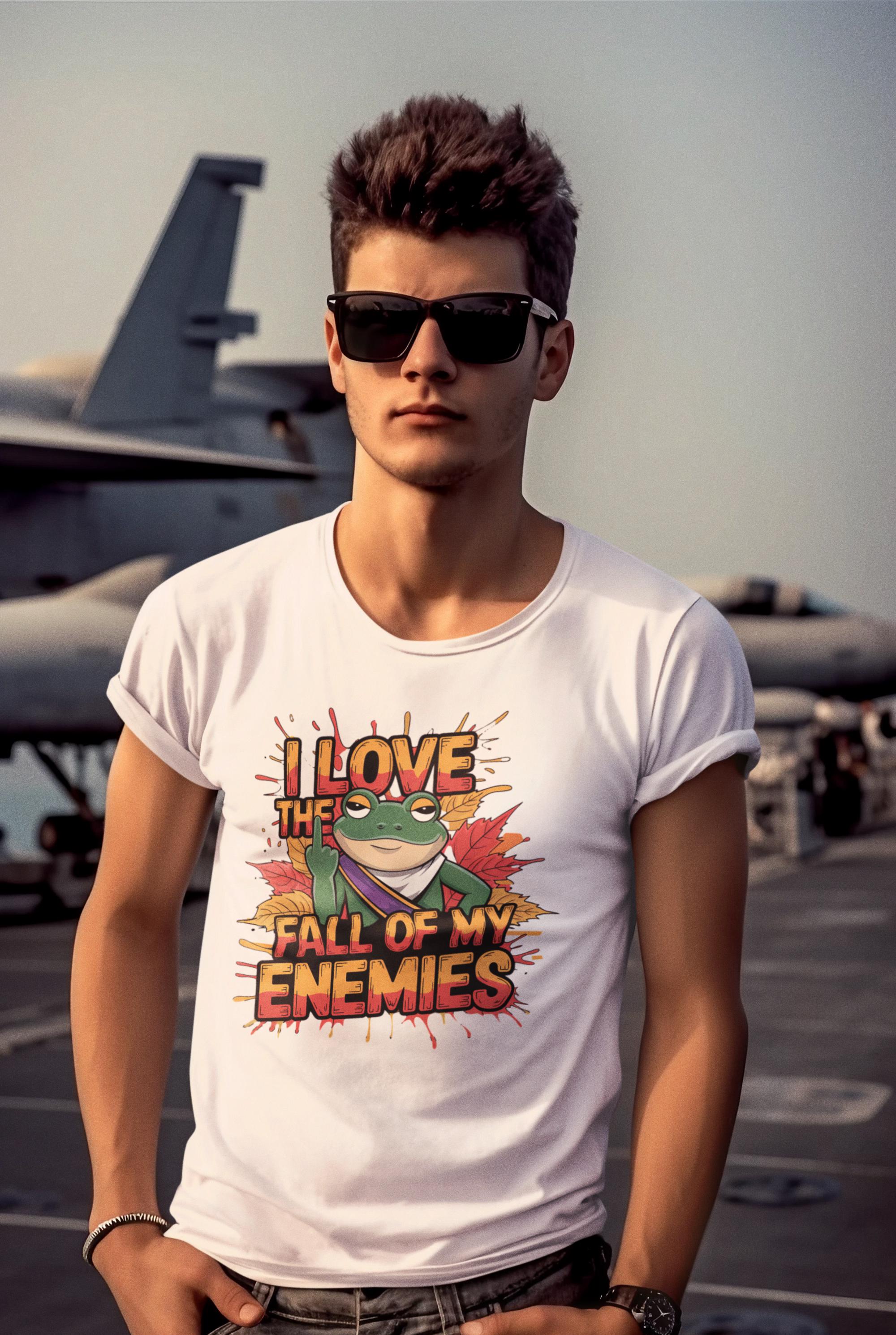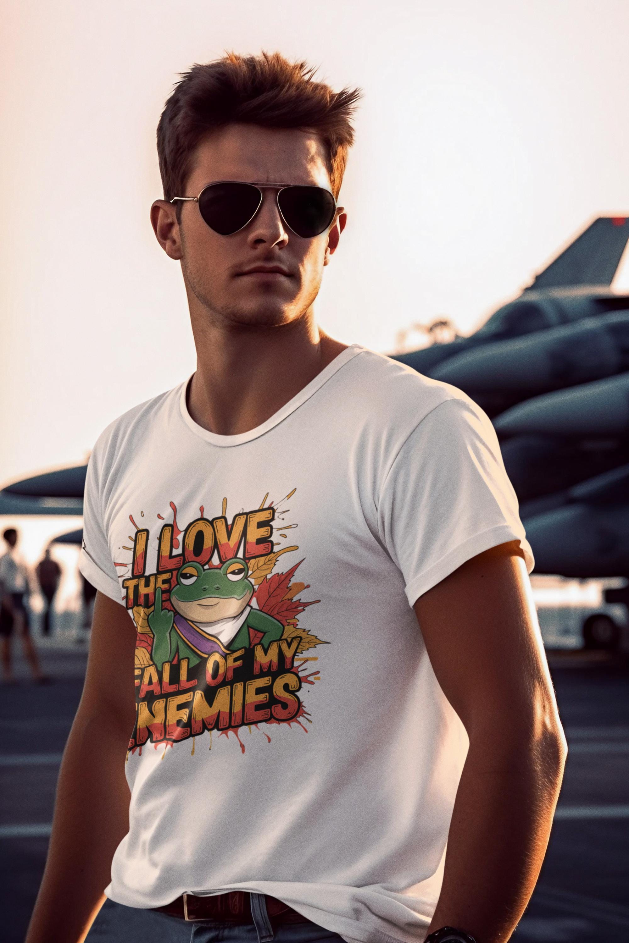 This Funny Frog Graphic Tee is perfect for anyone who loves a cheeky and humorous touch in their wardrobe! Featuring a bold graphic of a frog with the hilarious phrase "I Love the Fall of My Enemies," this quirky animal lover shirt is both eye-catching and playful. It's an excellent statement frog t-shirt that will spark conversations and bring laughs wherever you go.