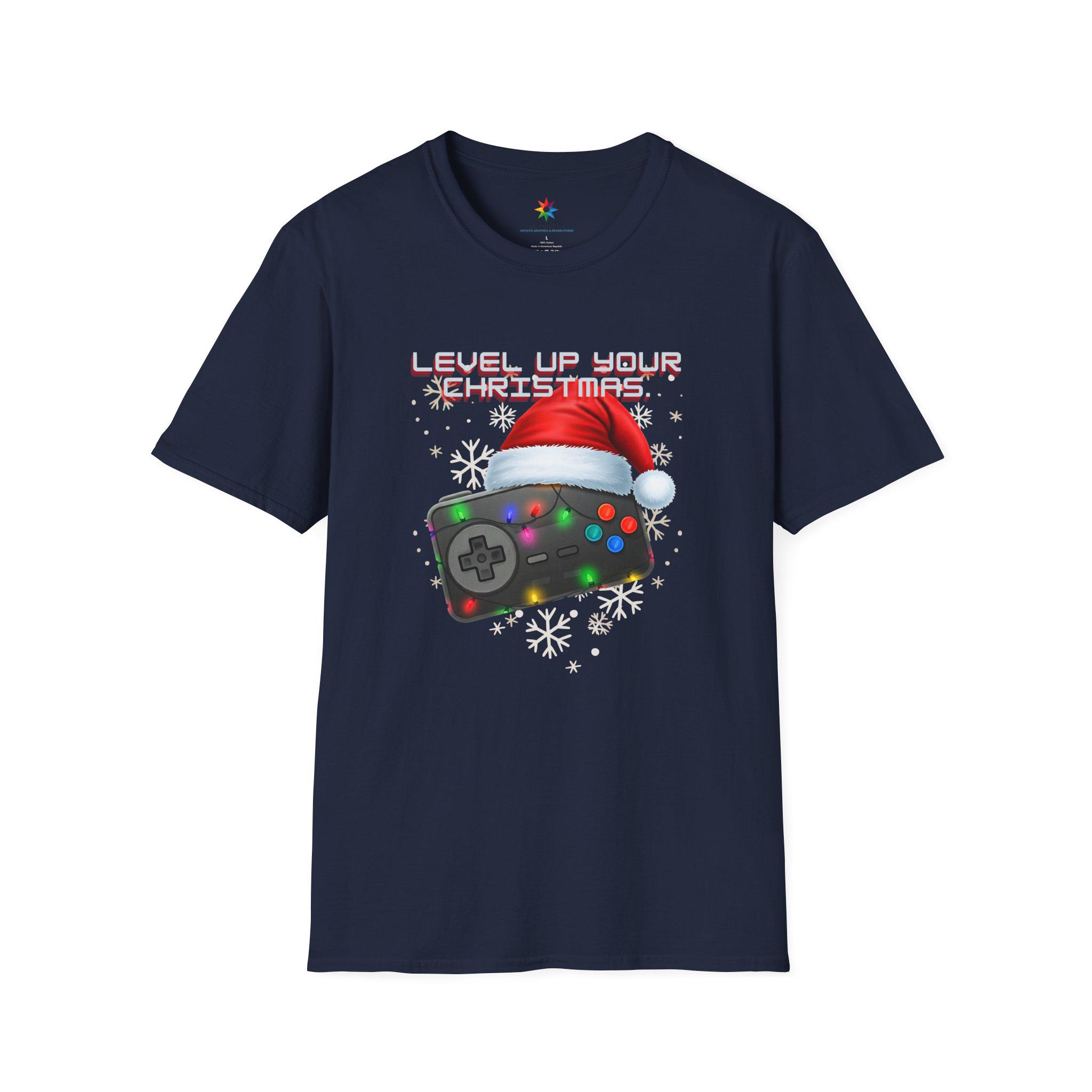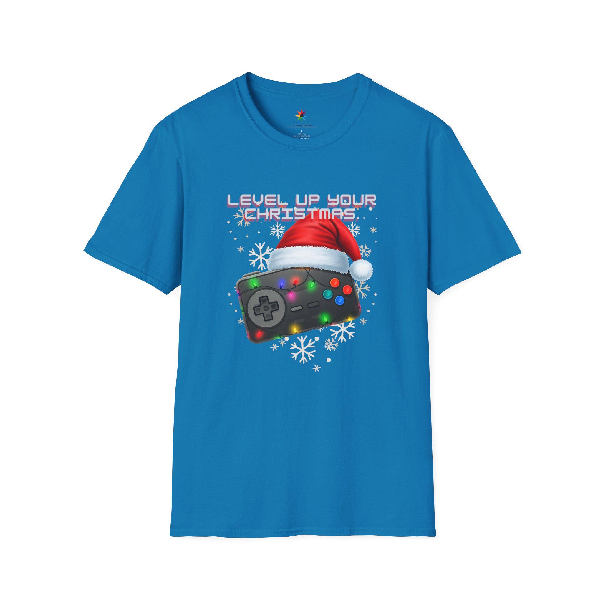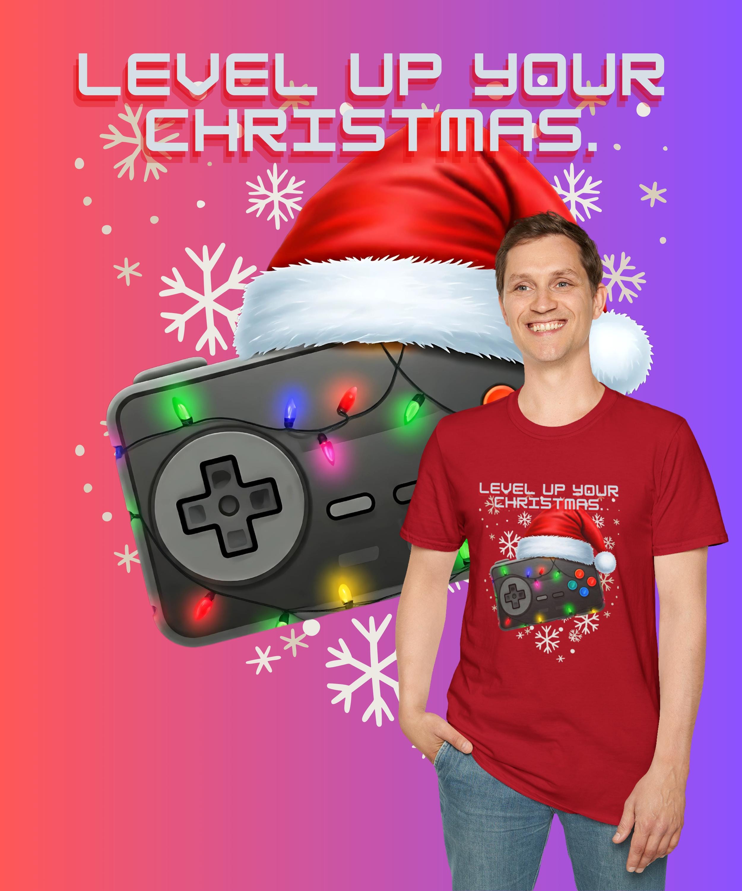 Celebrate the holidays with this festive gaming design on a soft and durable T-Shirt. Featuring a video game controller adorned with colorful Christmas lights and topped with a Santa hat, this design is perfect for gamers of all ages. Show off your love for gaming and the Christmas season with this unique and eye-catching T-Shirt. Perfect for holiday parties, gaming events, and casual everyday wear.