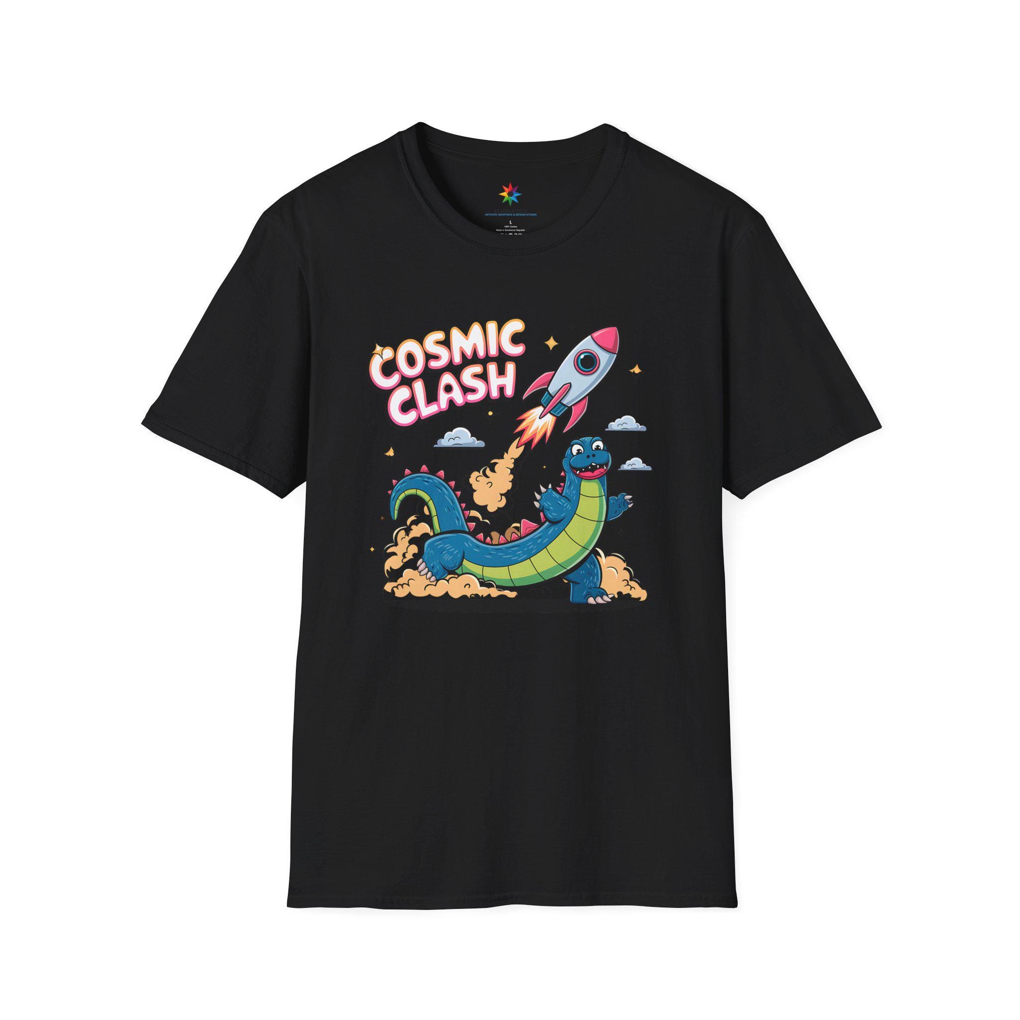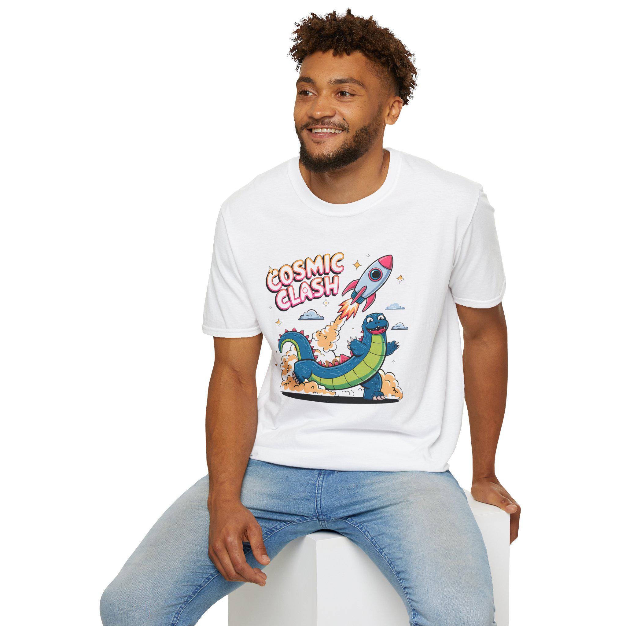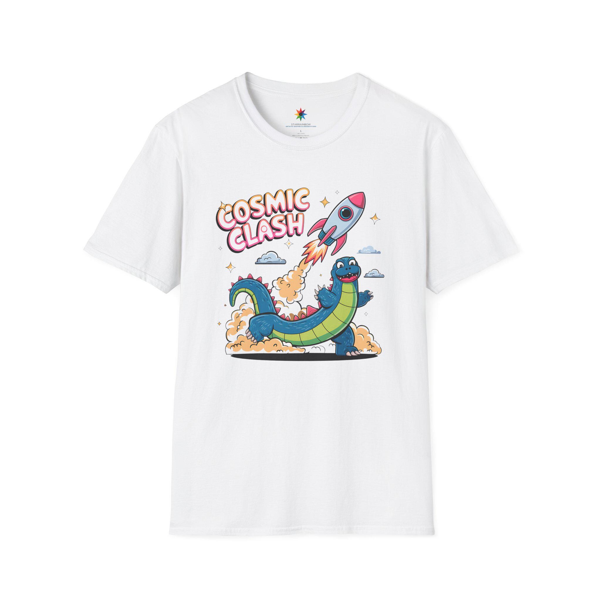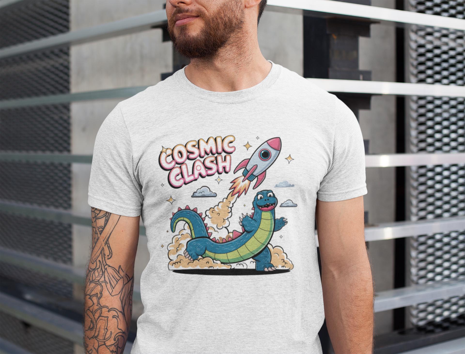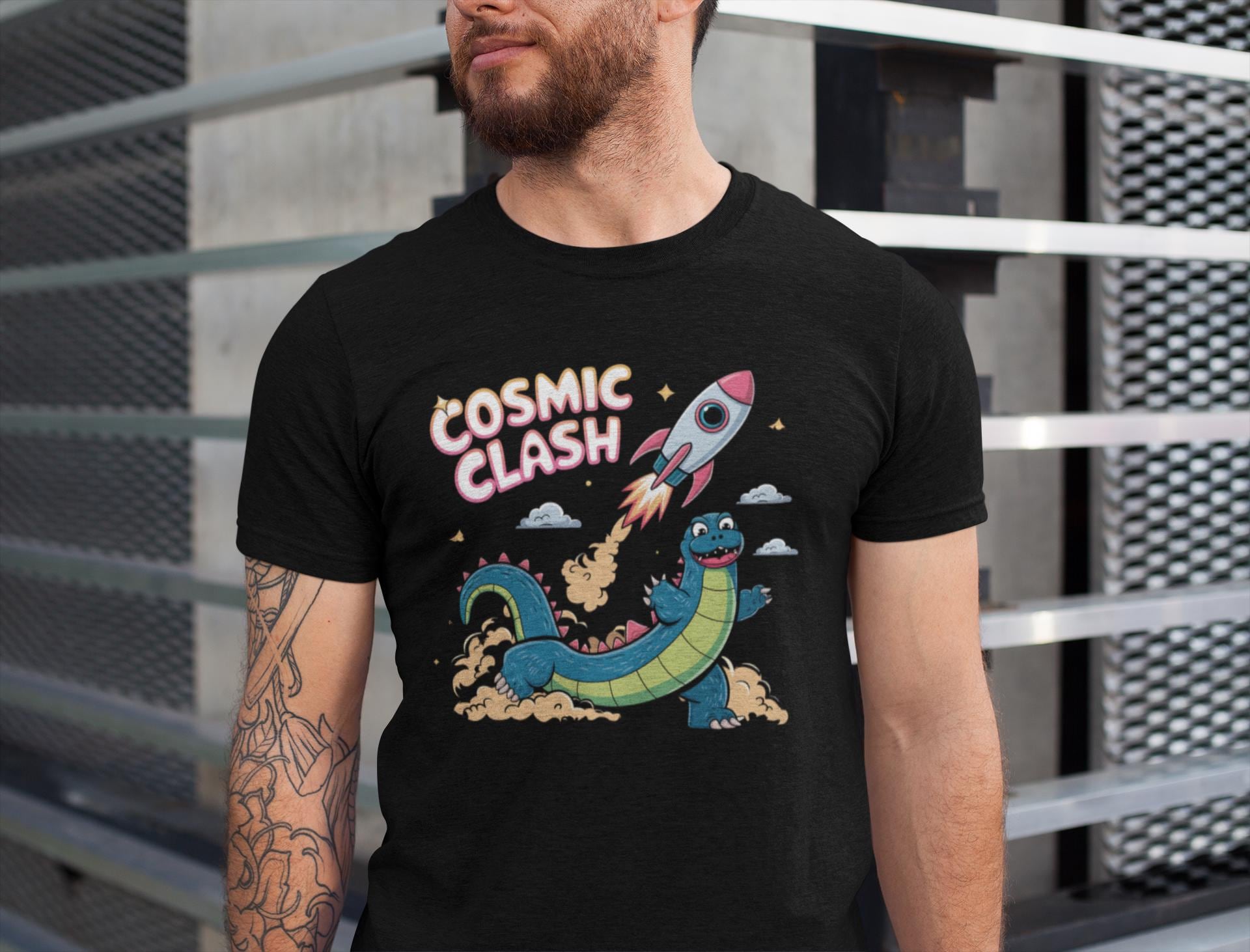 The "Cosmic Clash" T-shirt features an adorable Godzilla-like character in a dynamic space-themed design. With a cartoon rocket ship blasting off into the stars and surrounded by cosmic clouds, this unisex shirt is the perfect fit for science nerds, rocket enthusiasts, and space exploration fans. The vibrant and playful design is a great way to show off your love for science, geek culture, and creative fashion. Ideal as a gift for space lovers, science enthusiasts, or anyone who appreciates unique and fun apparel. Whether for casual wear or a special occasion, this tee is a standout piece for any wardrobe.