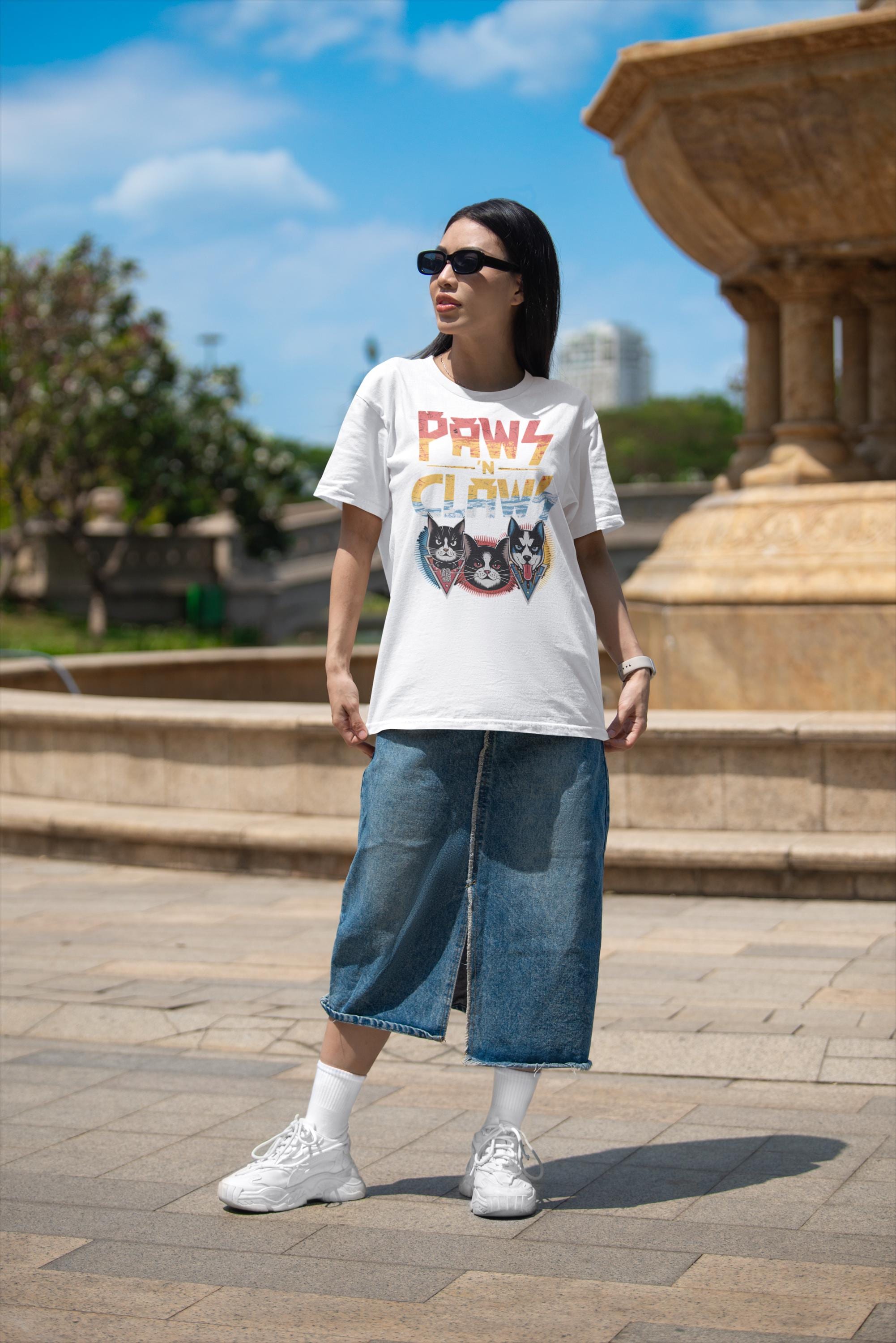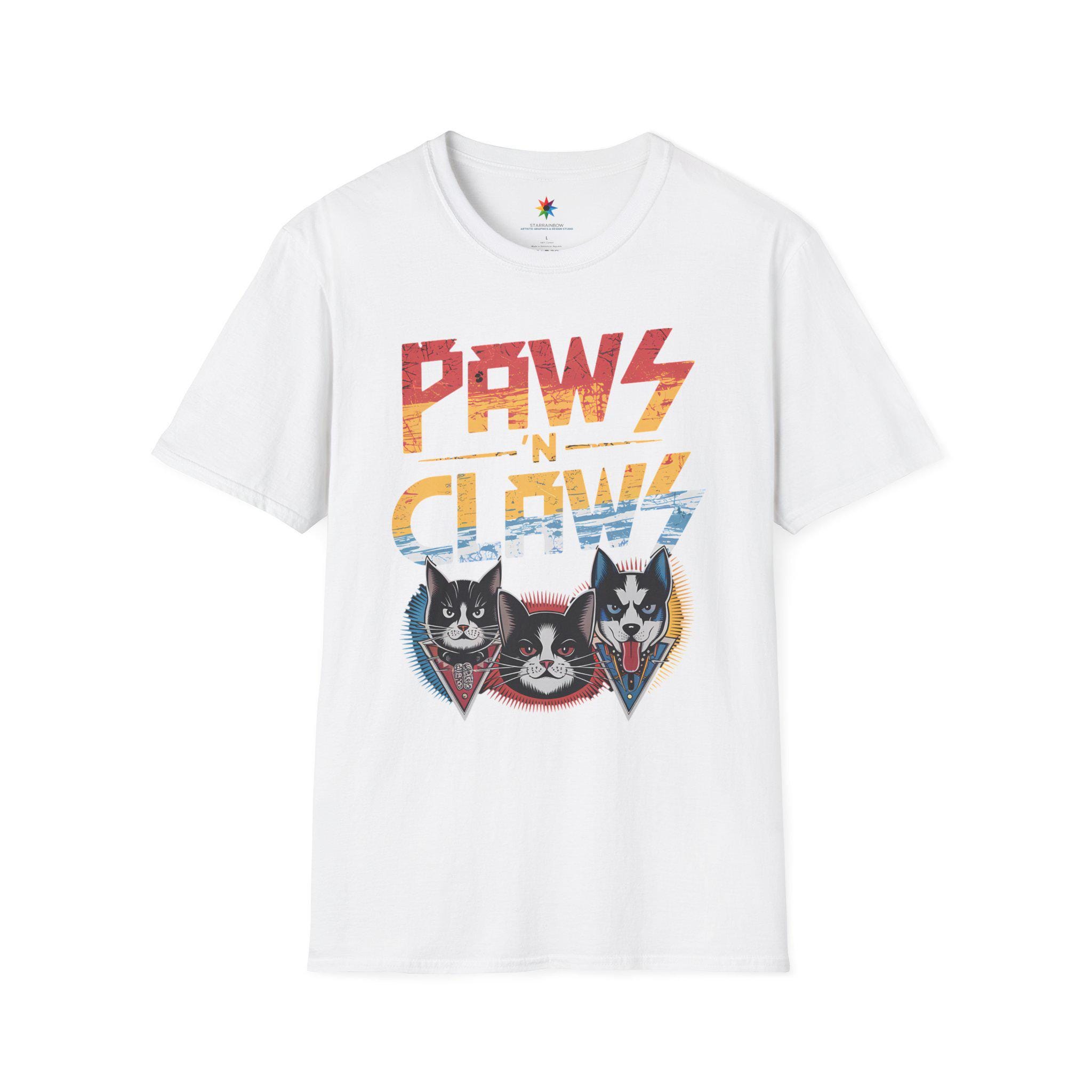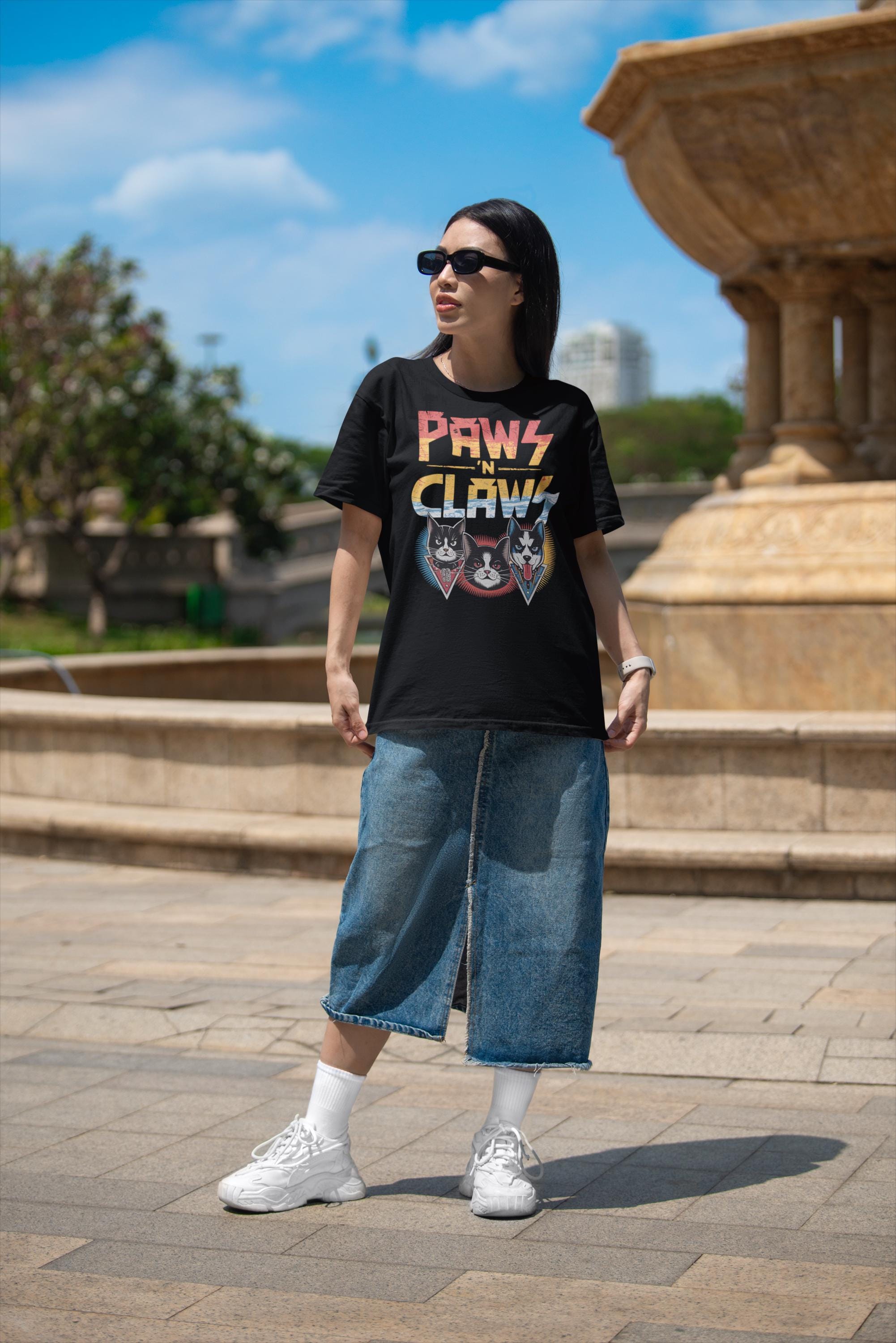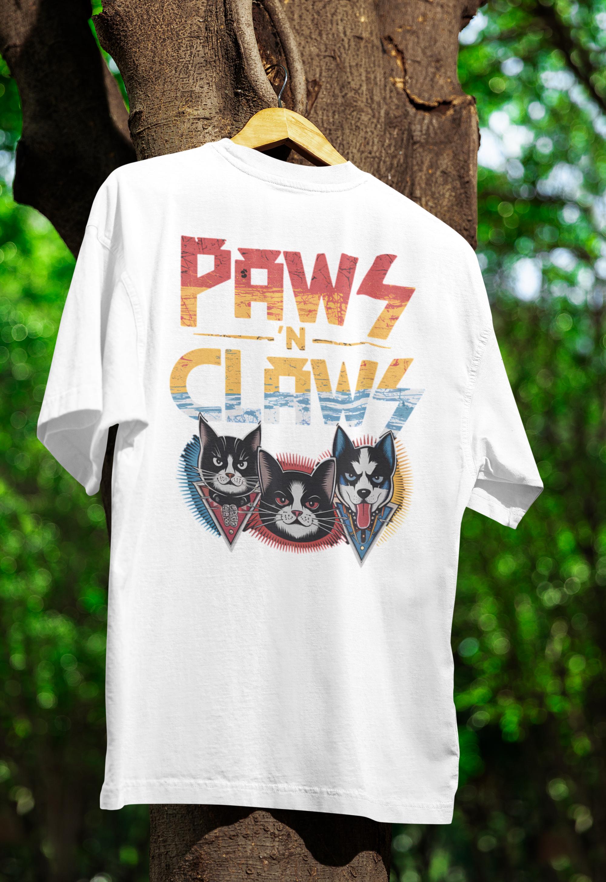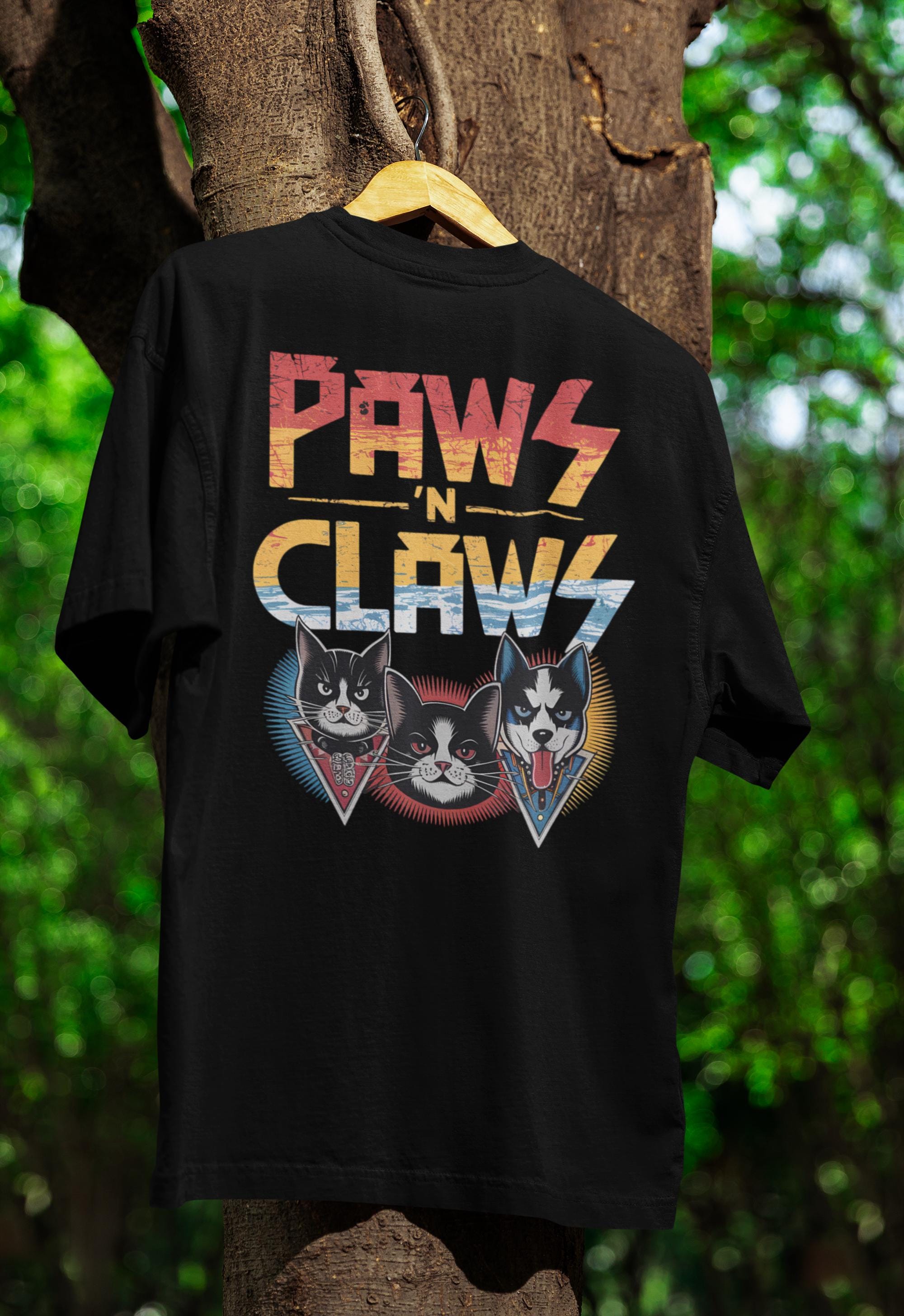 Celebrate your love for cats and dogs with this bold "Paws 'N Claws" t-shirt! Featuring a retro-inspired graphic of cats and a dog with striking colors and playful typography, this design is perfect for animal lovers, music fans, or anyone who enjoys unique and creative apparel. Its standout print is ideal for casual outings or as a fun gift for friends and family.
