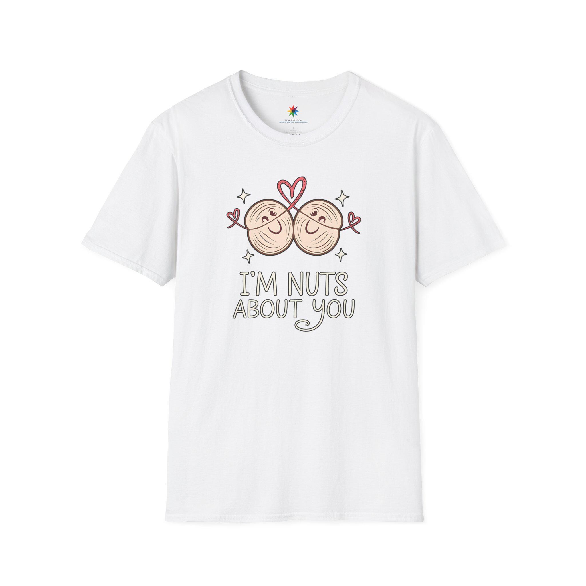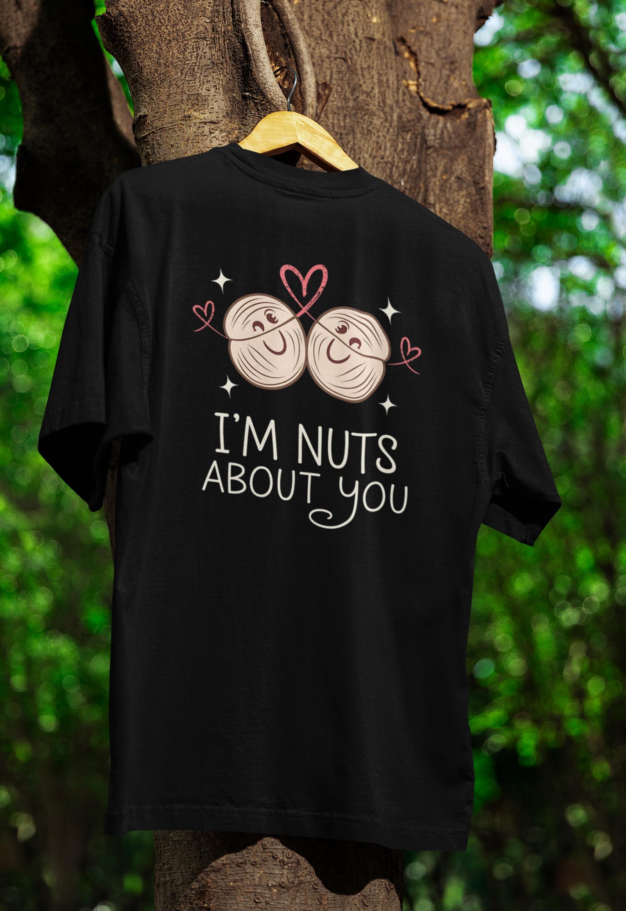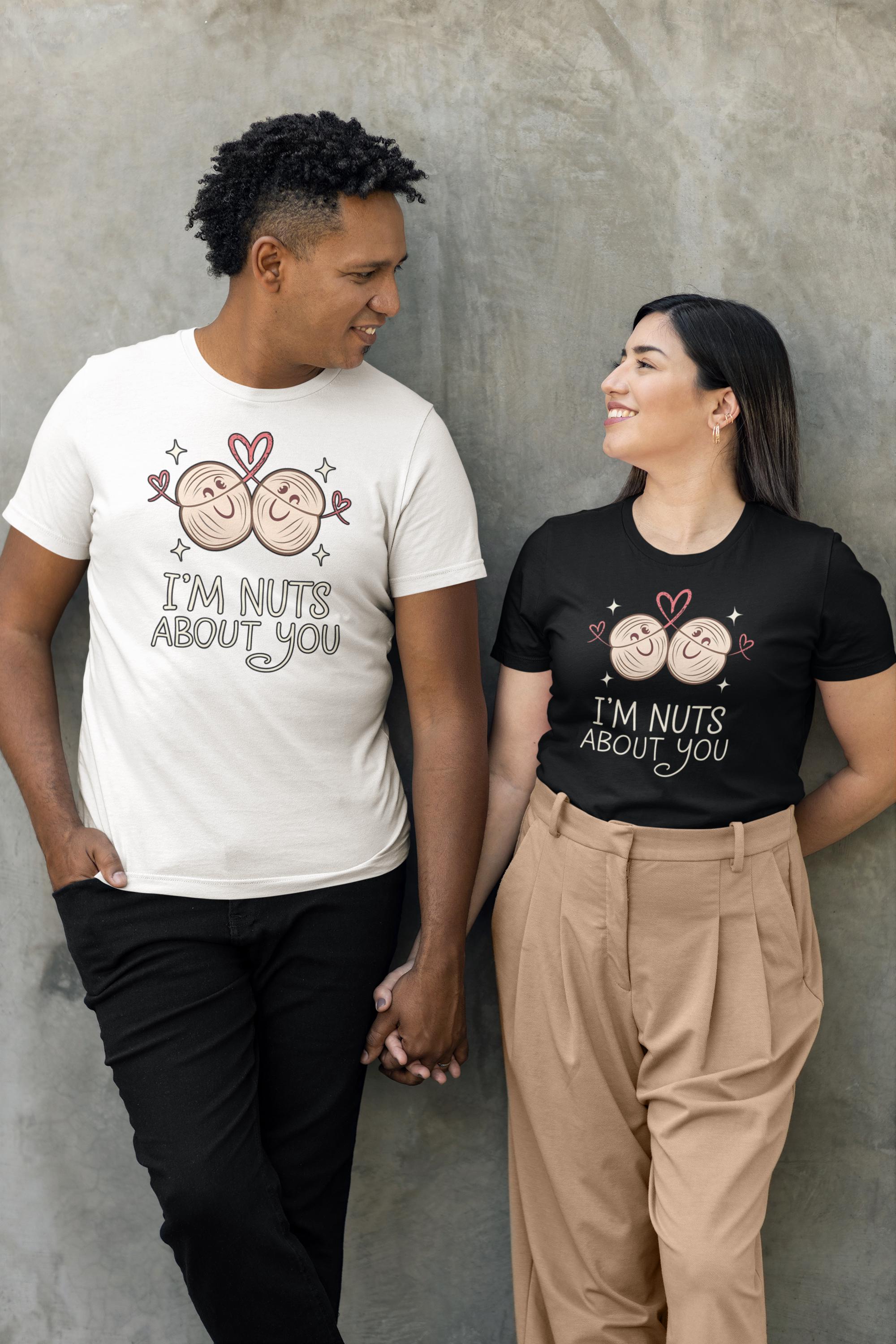Express your love with humor and sweetness with this "I'm Nuts About You" t-shirt! Featuring two adorable cartoon hazelnuts connected by a heart, this playful design is perfect for couples, Valentine's Day, or anyone who appreciates a cute and lighthearted gift. Whether for your partner, a friend, or yourself, this design adds fun and charm to any outfit.