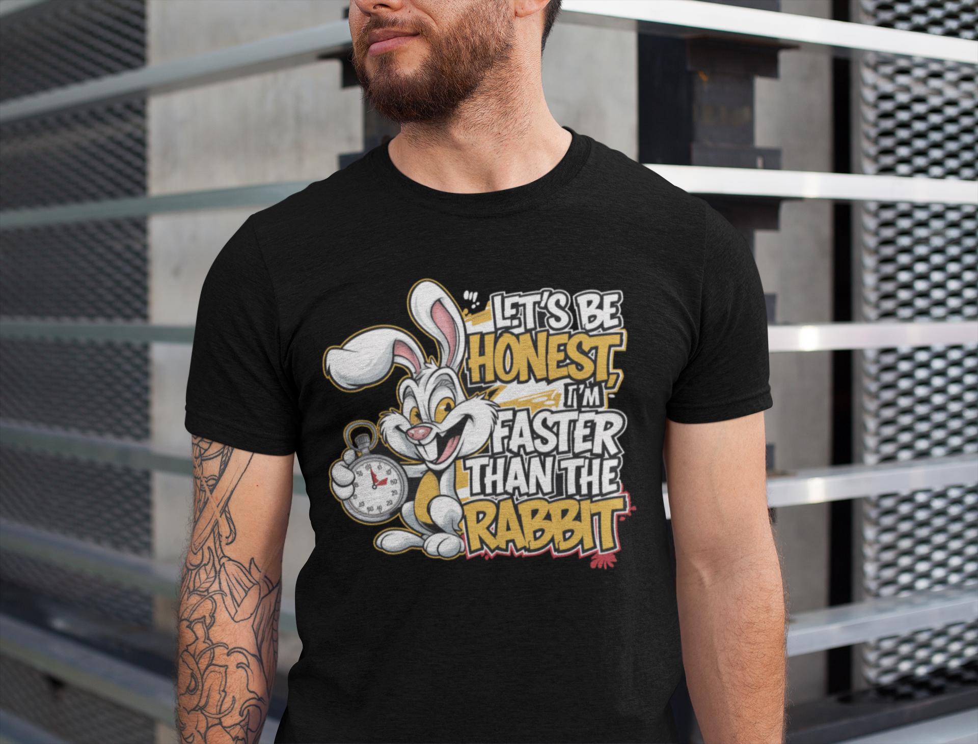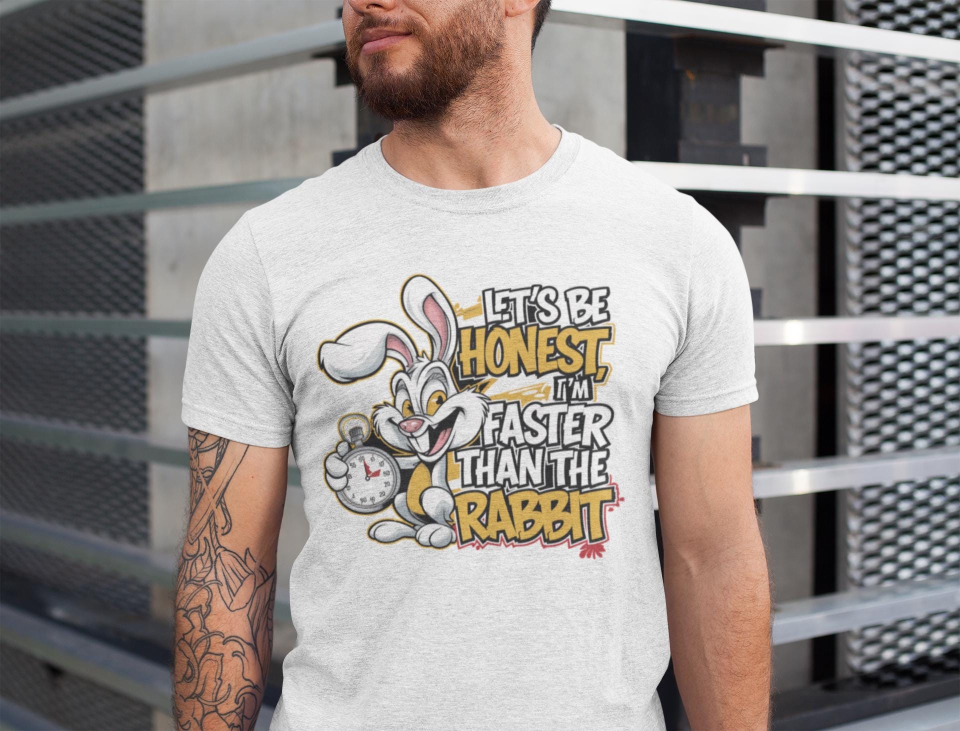 Add humor and charm to your wardrobe with this Funny Bunny T-Shirt, featuring the playful phrase "Let's Be Honest, I'm Faster Than the Rabbit." This quirky Cartoon Bunny Graphic Tee is perfect for fans of speed humor, rabbits, or anyone who loves a good laugh.