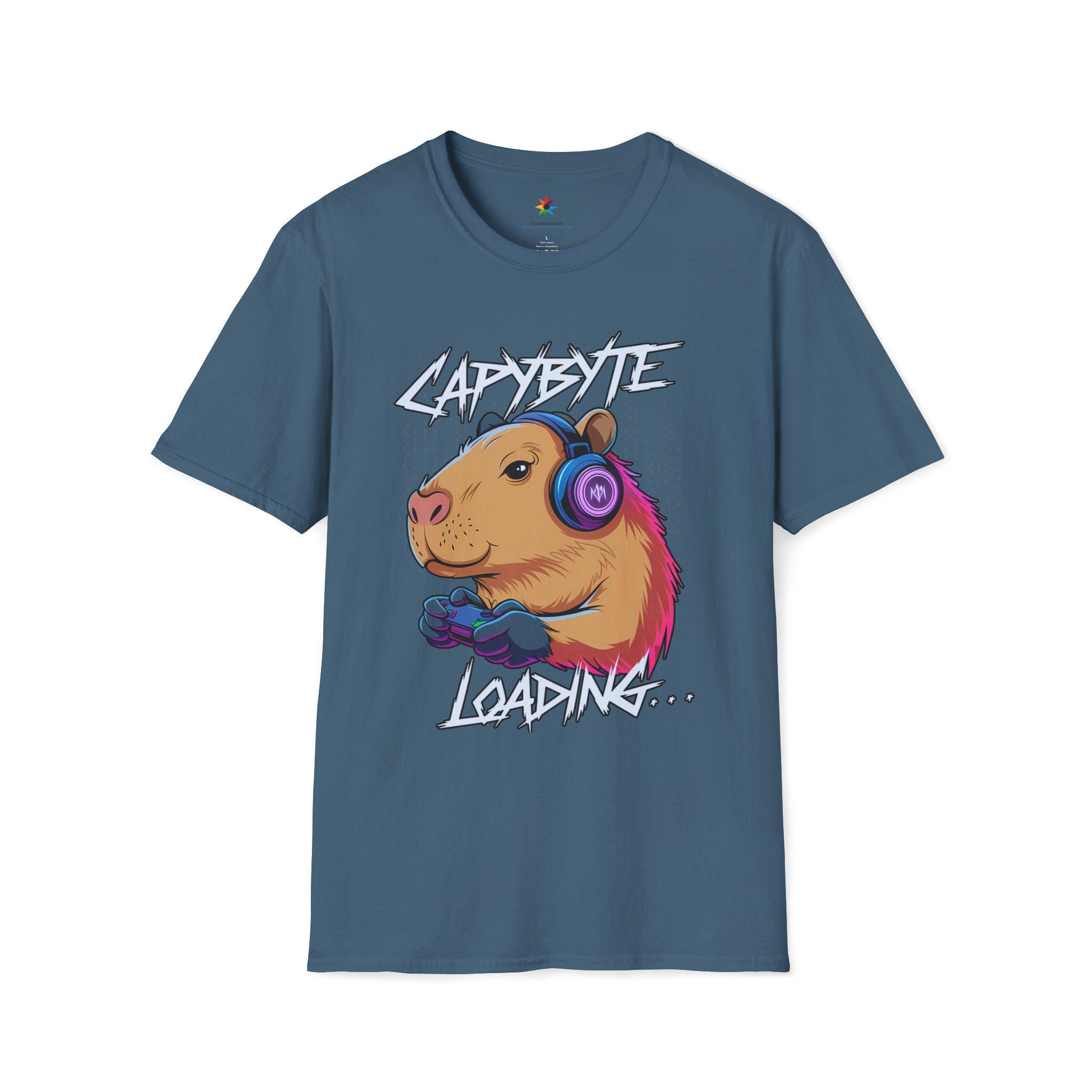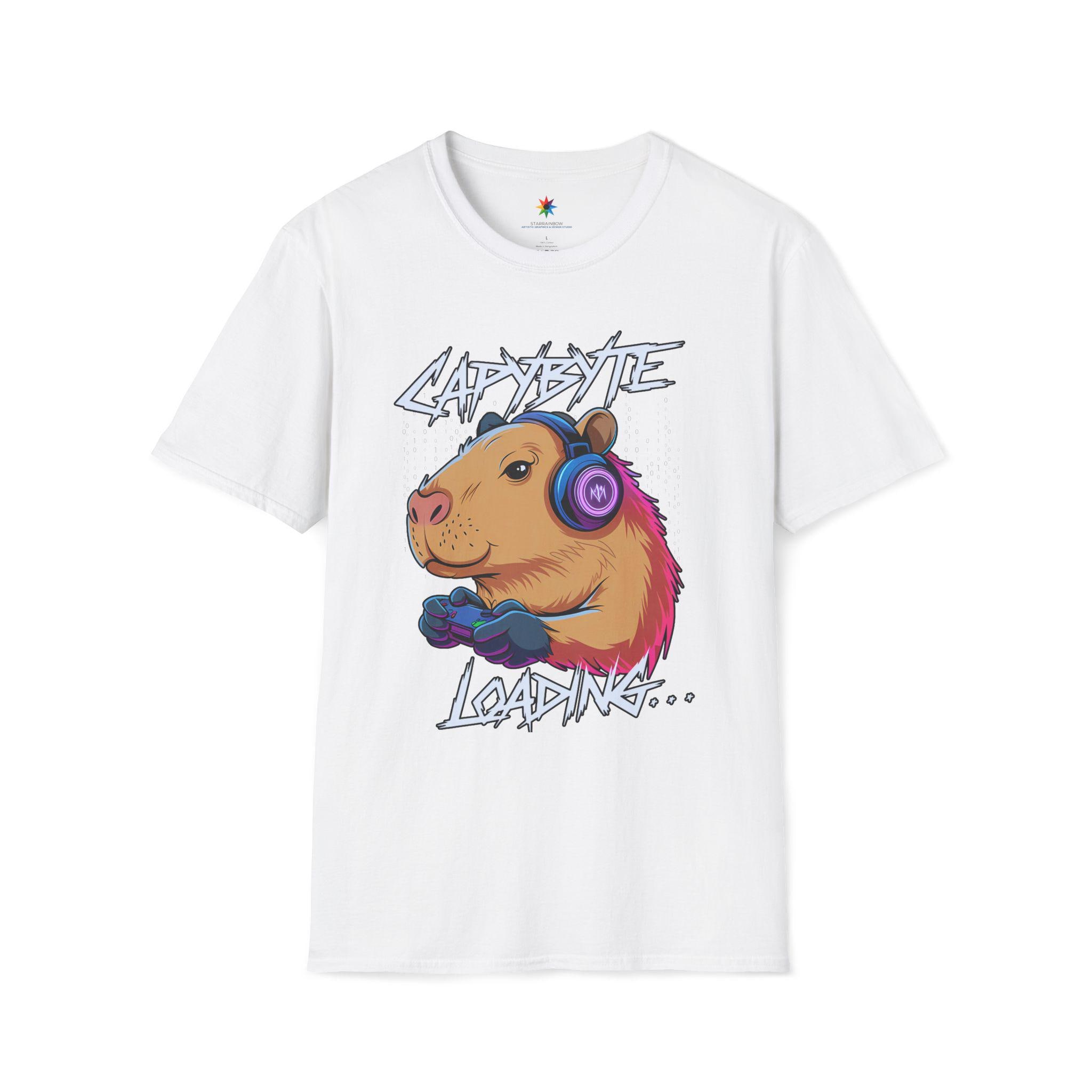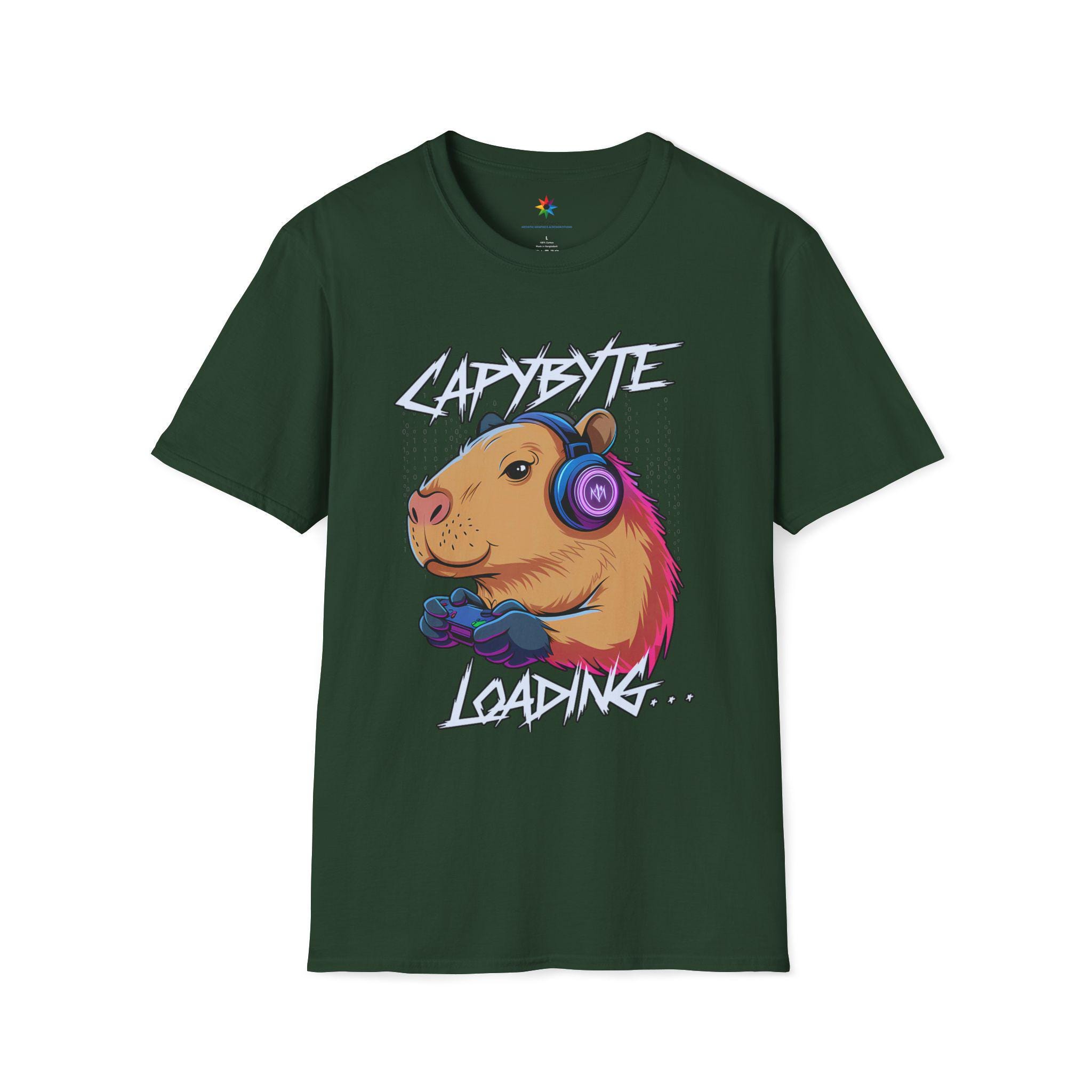 Level up your wardrobe with the Capybara Gamer Shirt—a cute, funny graphic tee in a neon retro aesthetic. Our original art spotlights a chilled-out capybara wearing headphones and gripping a controller, with the playful caption “Capybyte Loading…” The colors stay bold and the lines crisp, so the design looks great season after season.