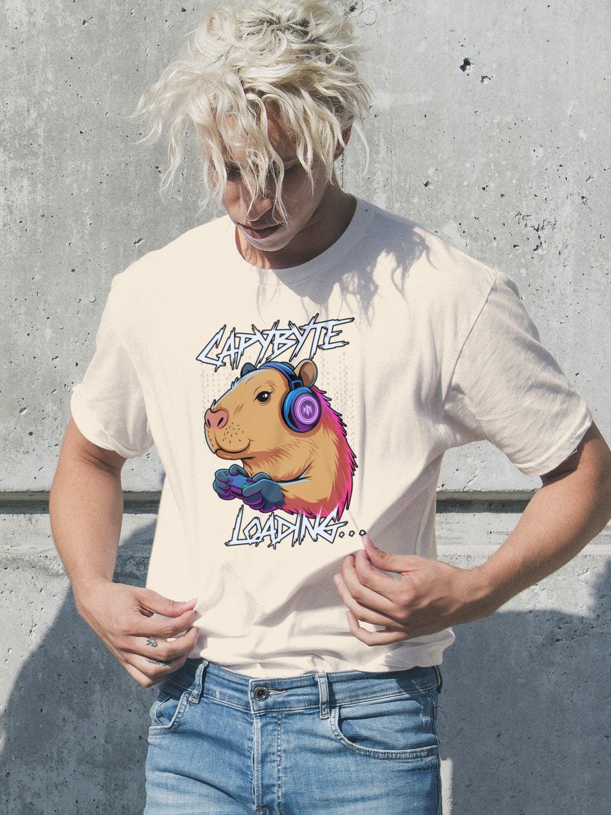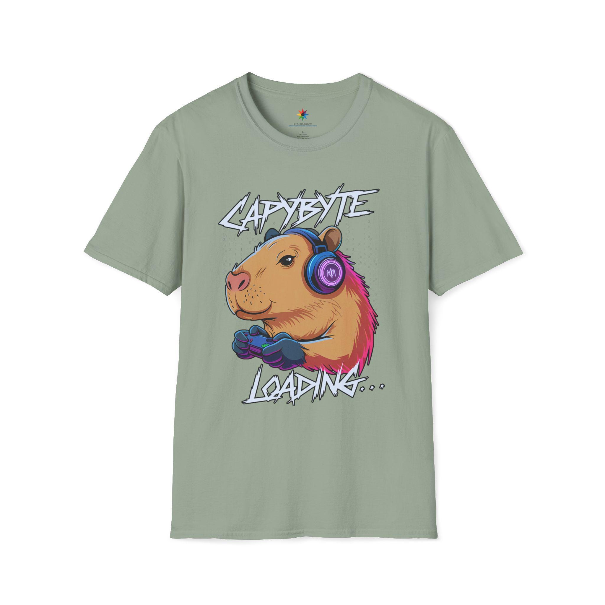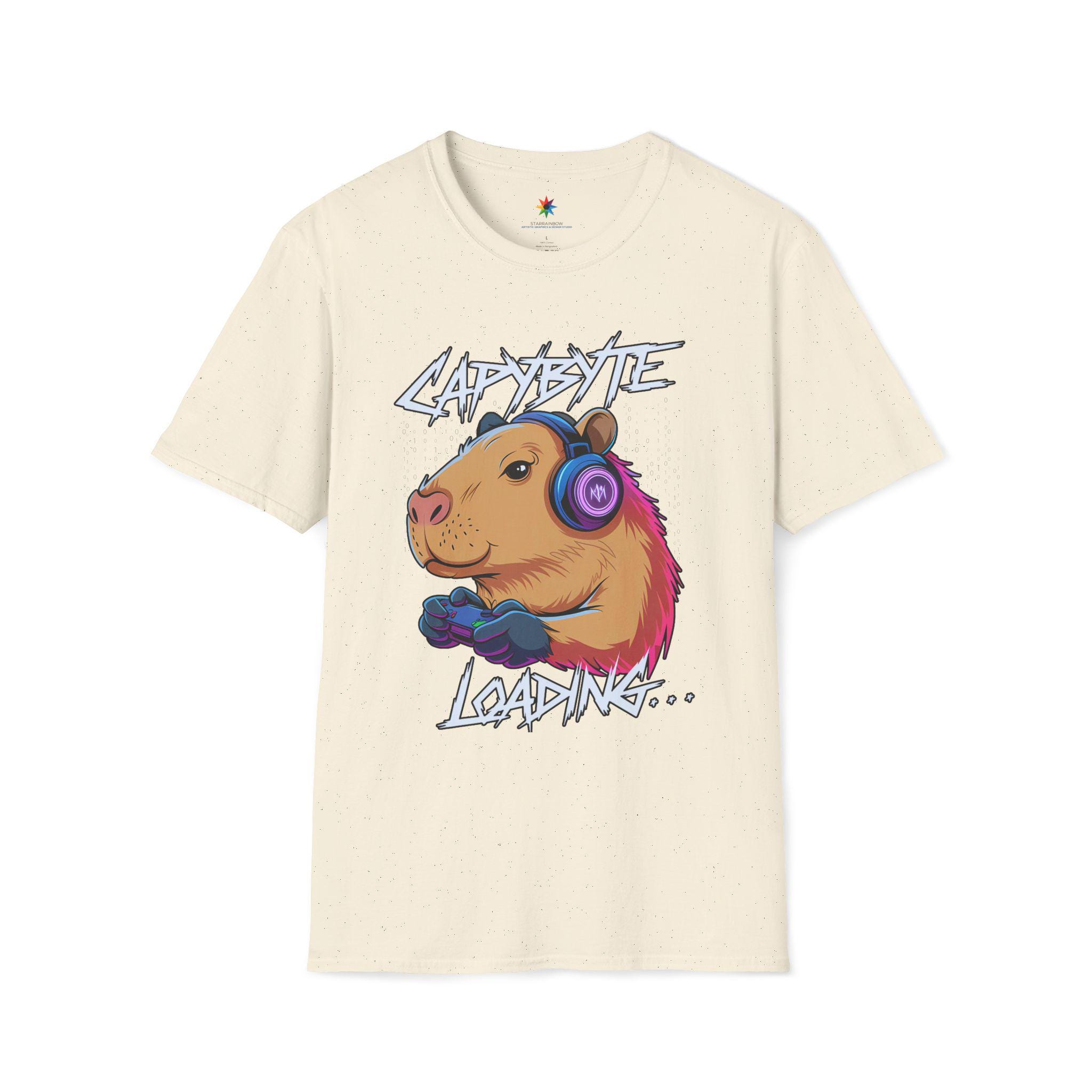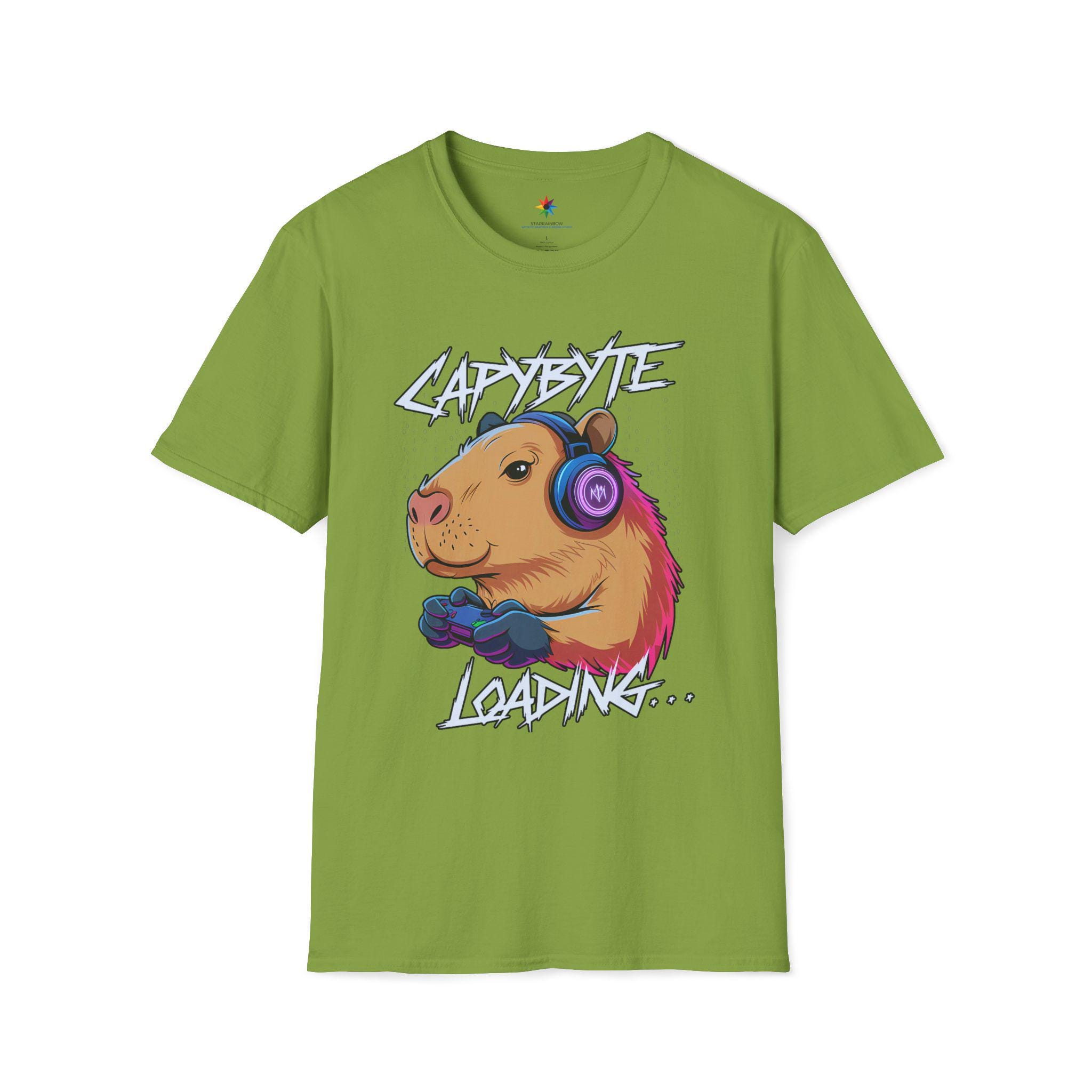 Level up your wardrobe with the Capybara Gamer Shirt—a cute, funny graphic tee in a neon retro aesthetic. Our original art spotlights a chilled-out capybara wearing headphones and gripping a controller, with the playful caption “Capybyte Loading…” The colors stay bold and the lines crisp, so the design looks great season after season.