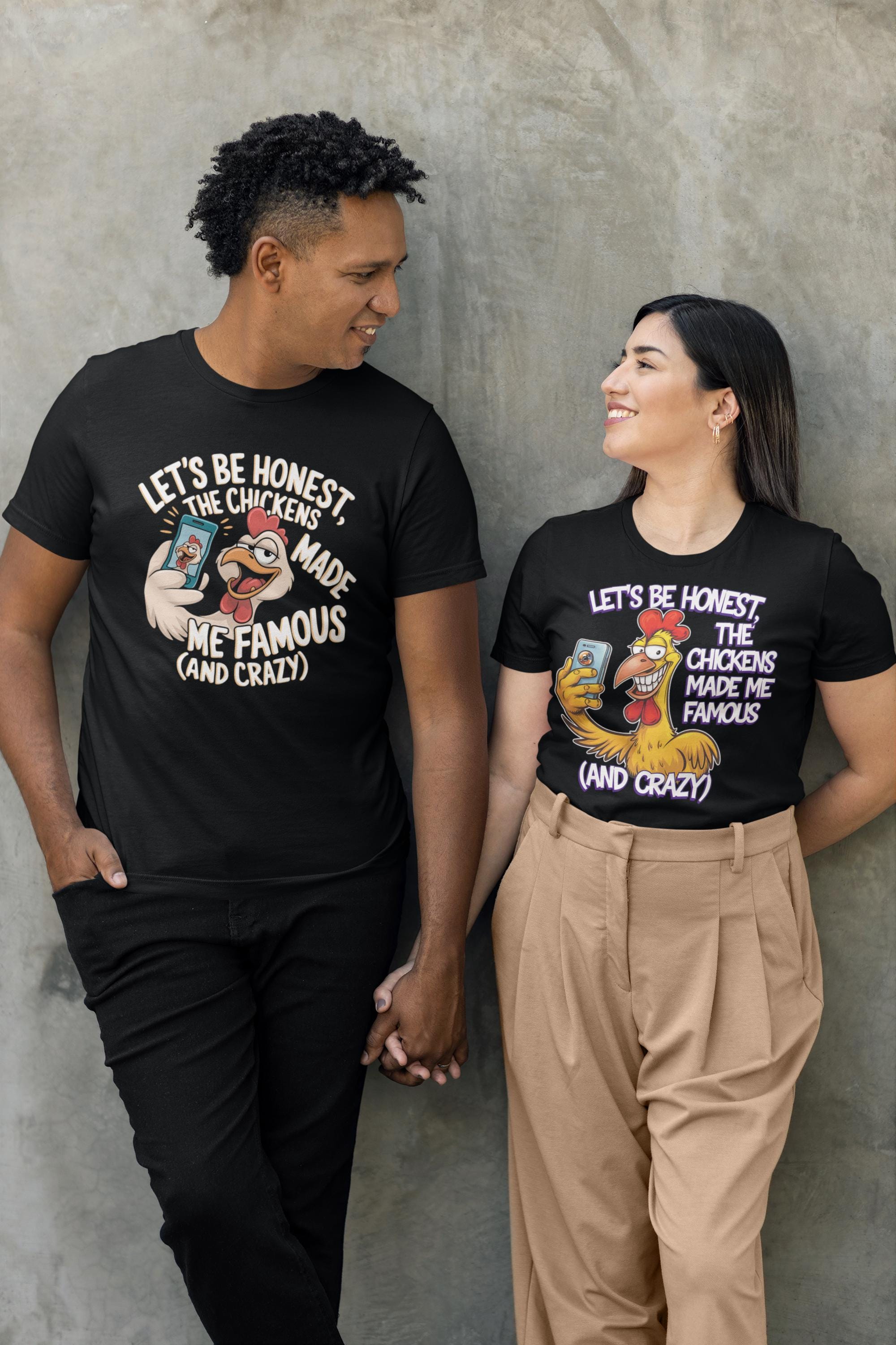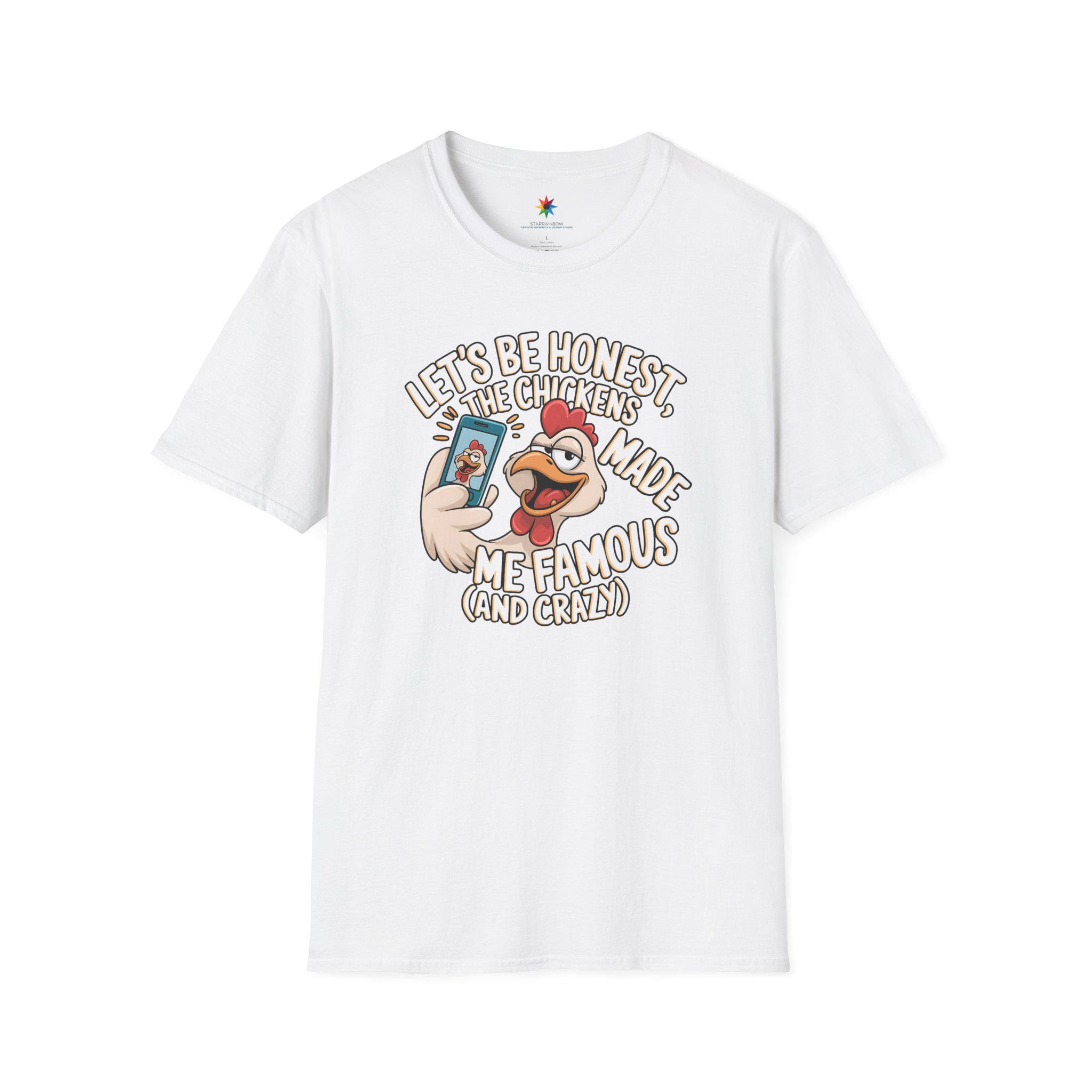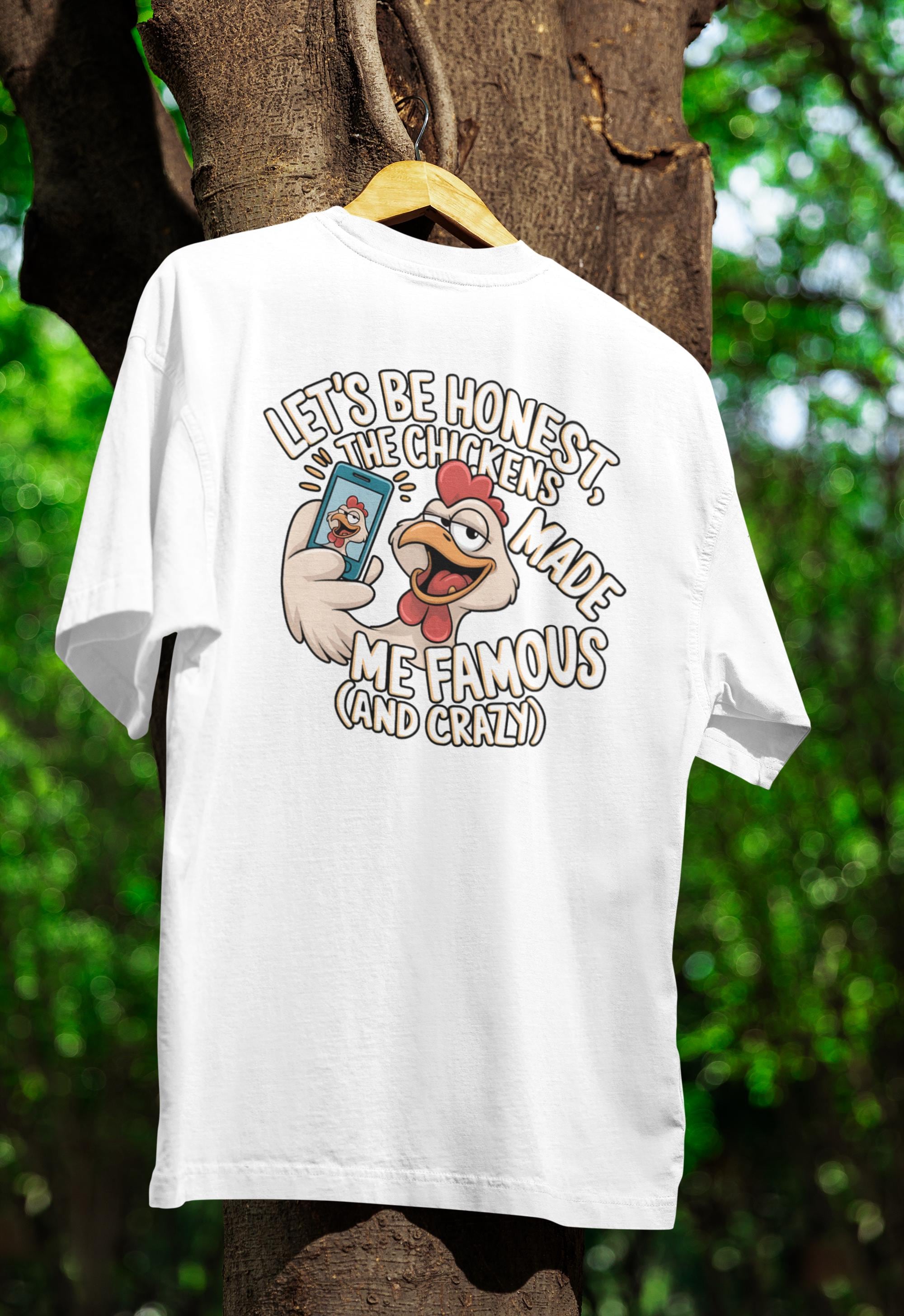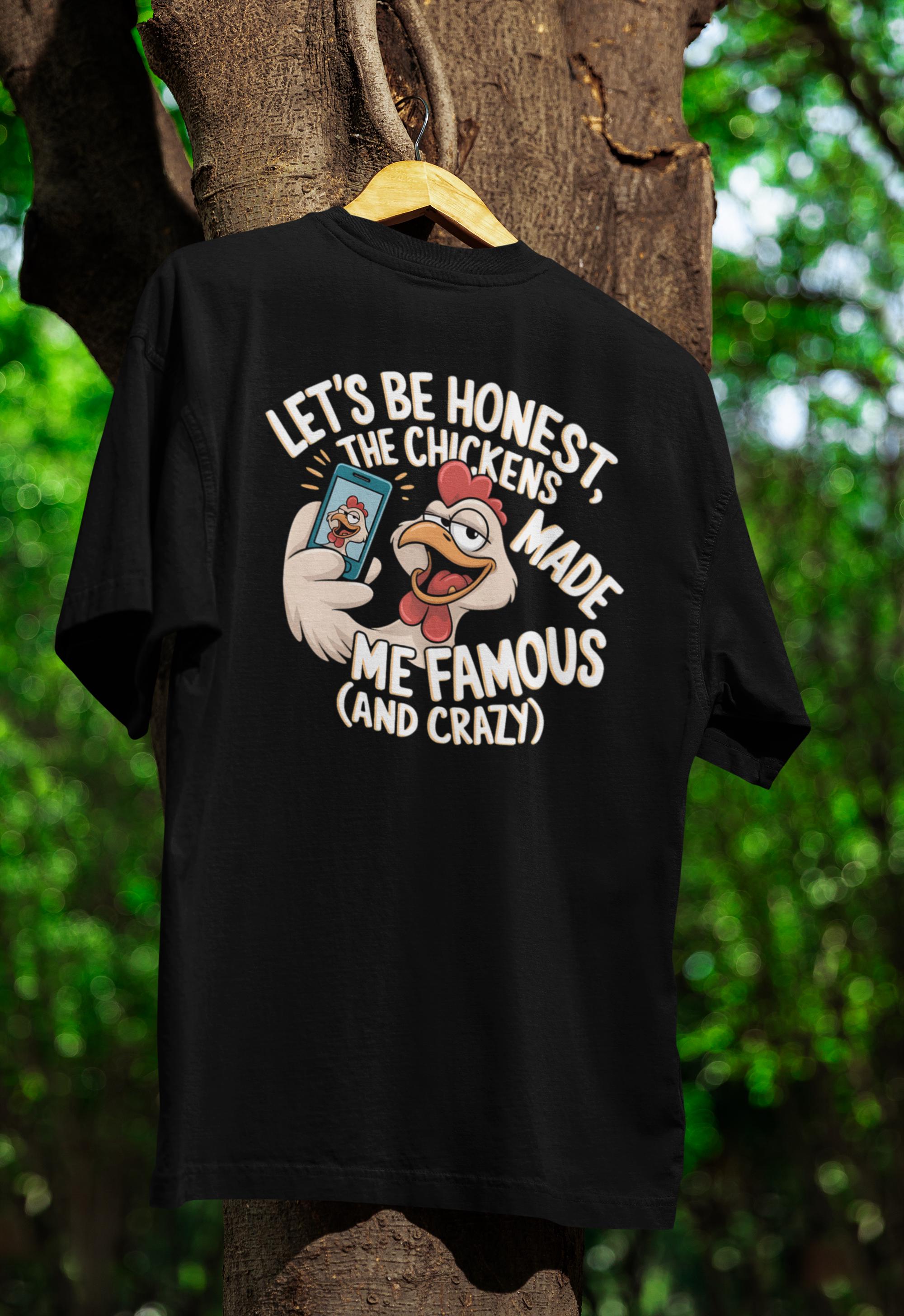 The playful goofy chicken graphic features a chicken holding a phone, which is bound to get a few chuckles. This chickenful design is ideal for those who want to show off their passion for farming tees or chicken farming. With the phrase "Let's be honest, the chickens made me famous (and crazy)," this shirt is a great gift for anyone who enjoys the lighter side of chicken nuts and the farming tee culture.