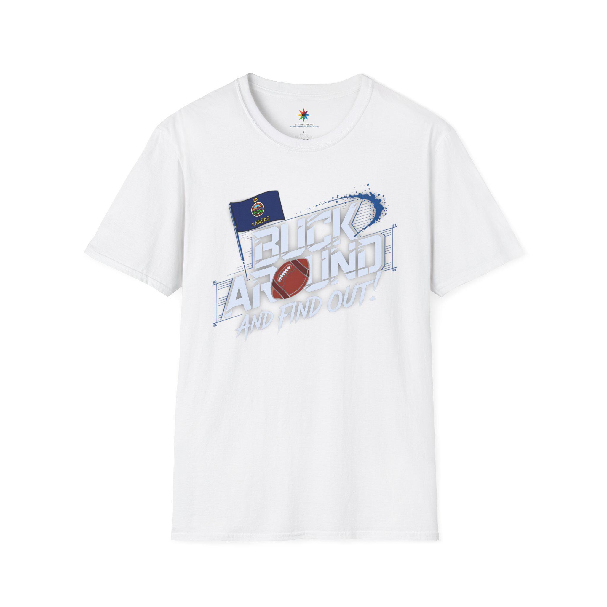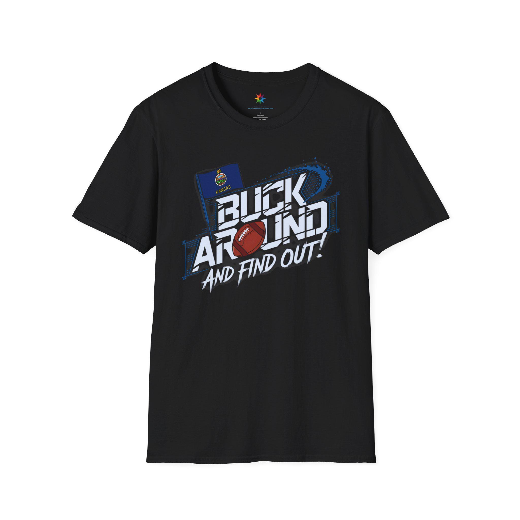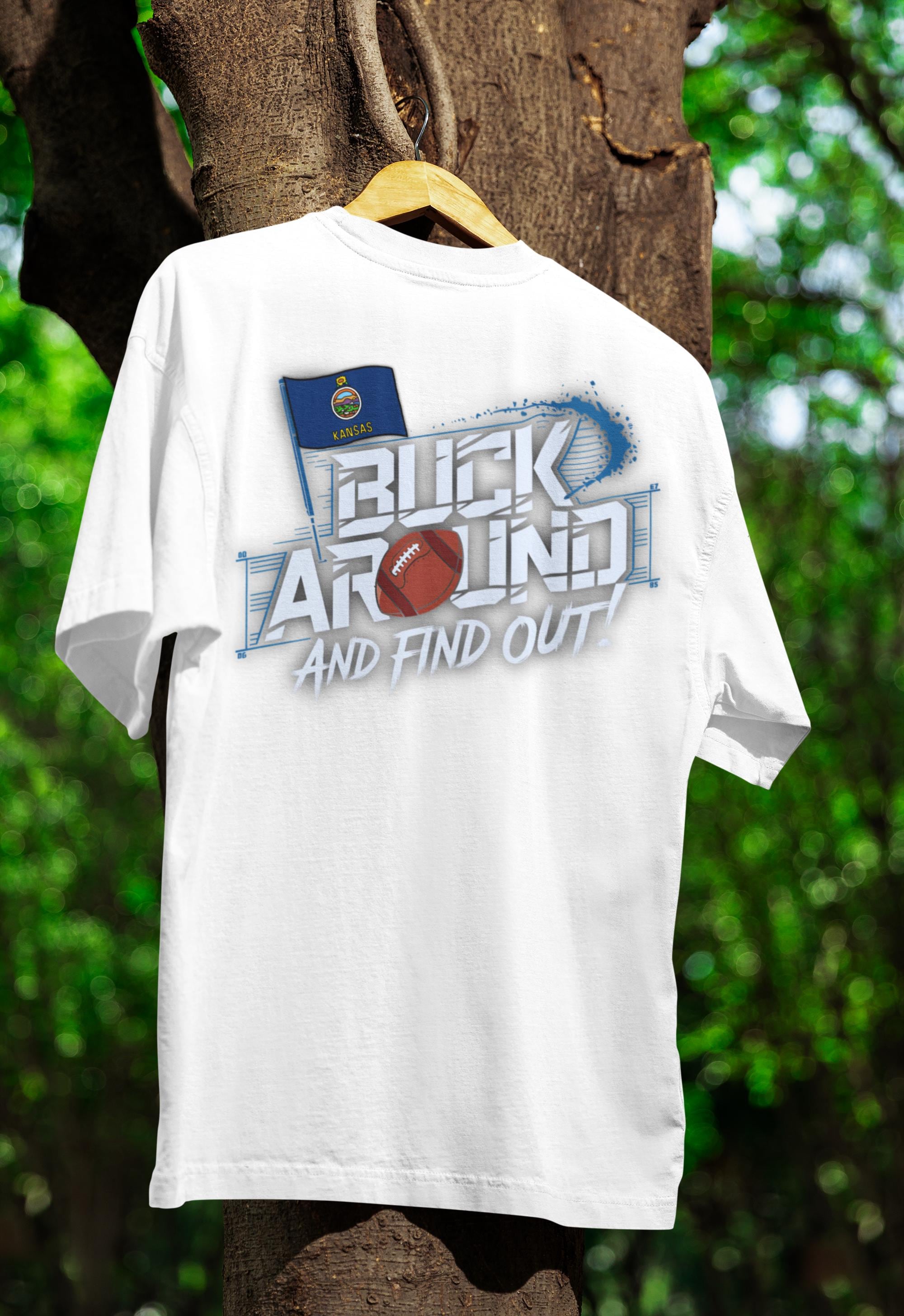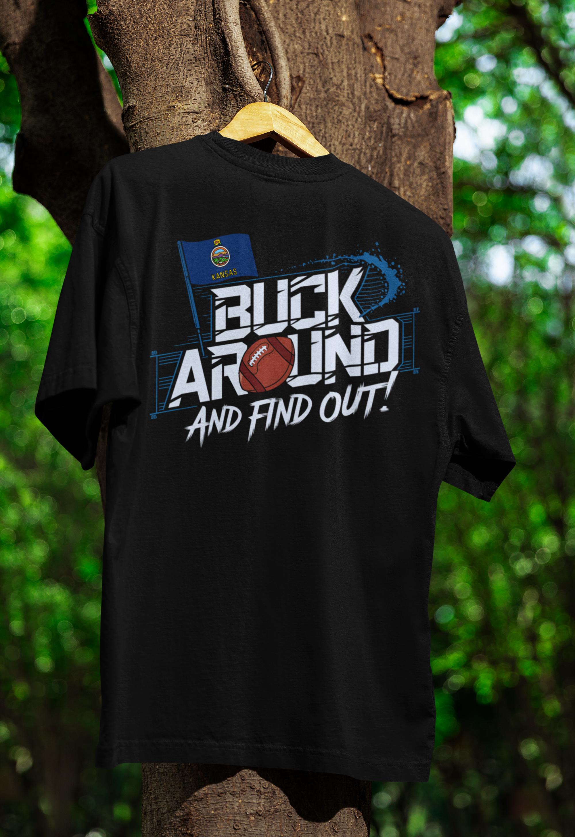 Show your pride for Kansas and football with the Buck Around and Find Out Kansas Football Shirt! Whether for yourself or as a gift, this tee is sure to be a hit with fans who love the game and the state. Order yours today and wear your pride on game day!
