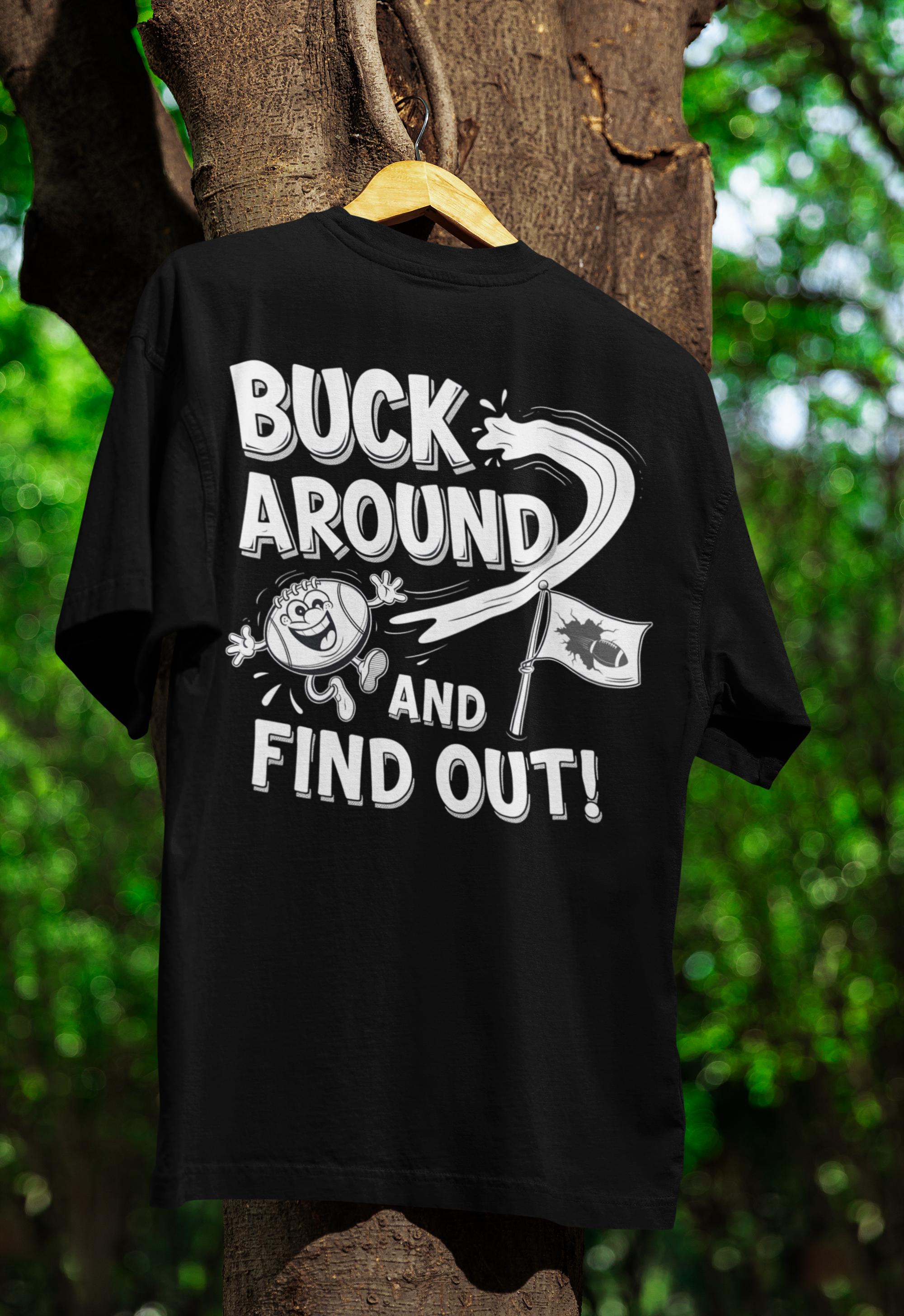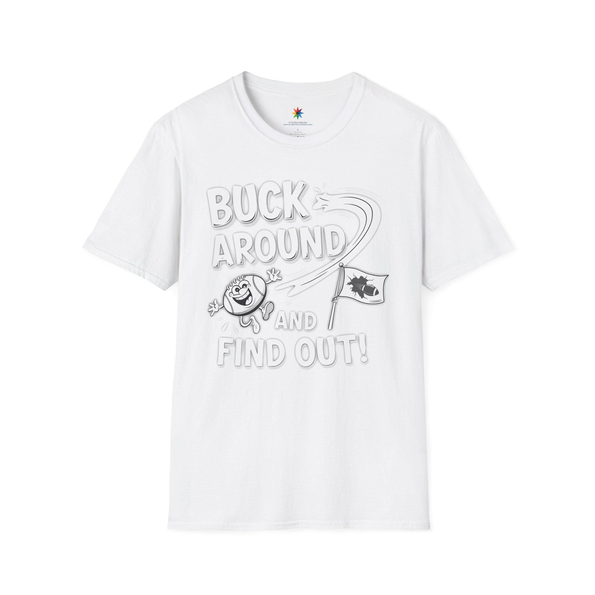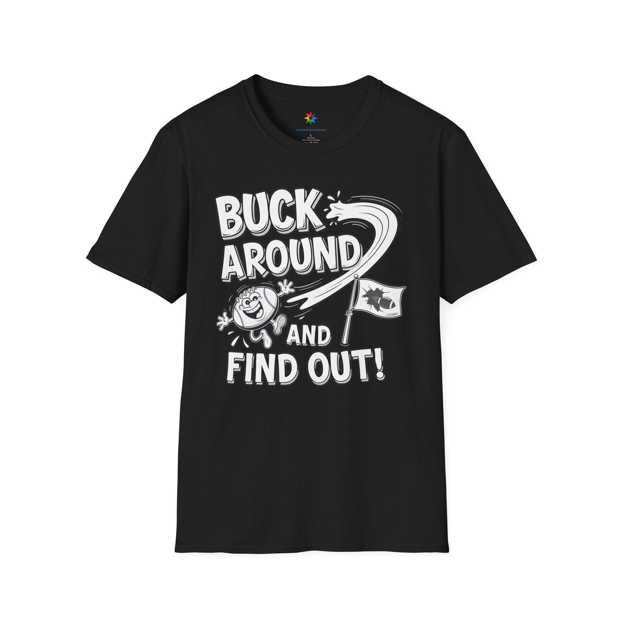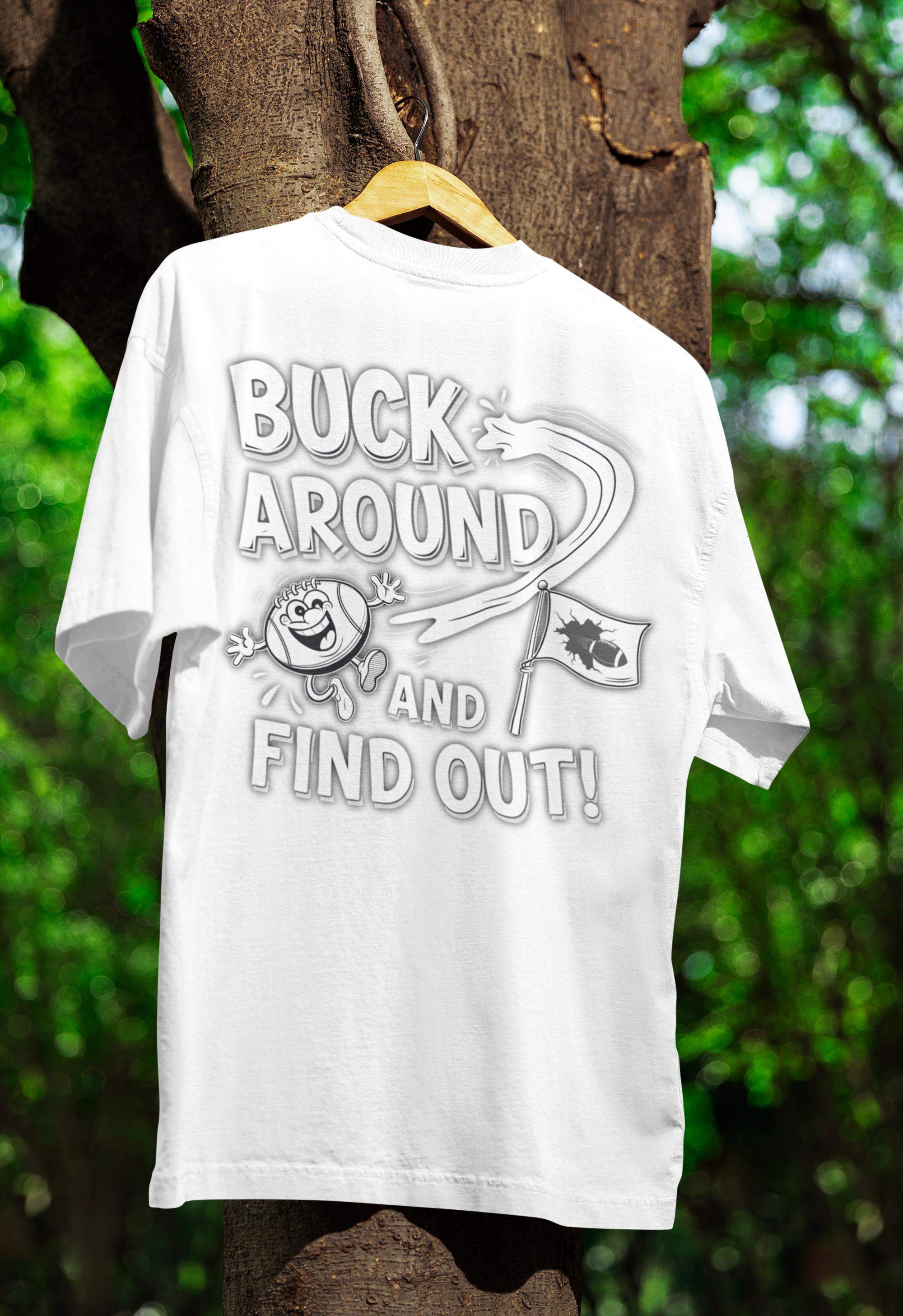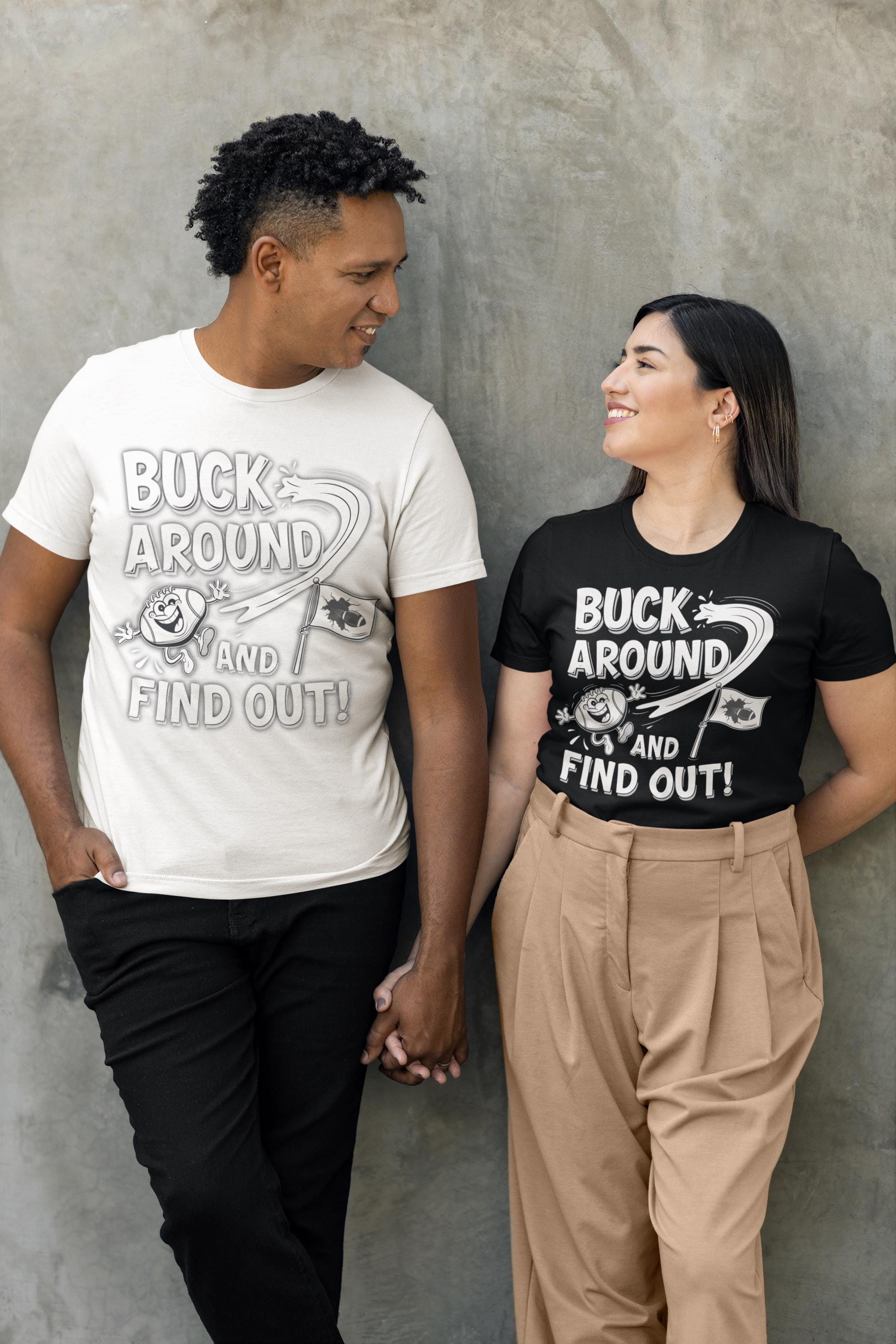 Make a bold statement with this funny unisex t-shirt featuring a retro cartoon graphic and a sarcastic football-inspired design. The playful phrase "Buck Around and Find Out" adds a touch of humor, making it a great gift for sports fans, athletes, or anyone who loves witty apparel.