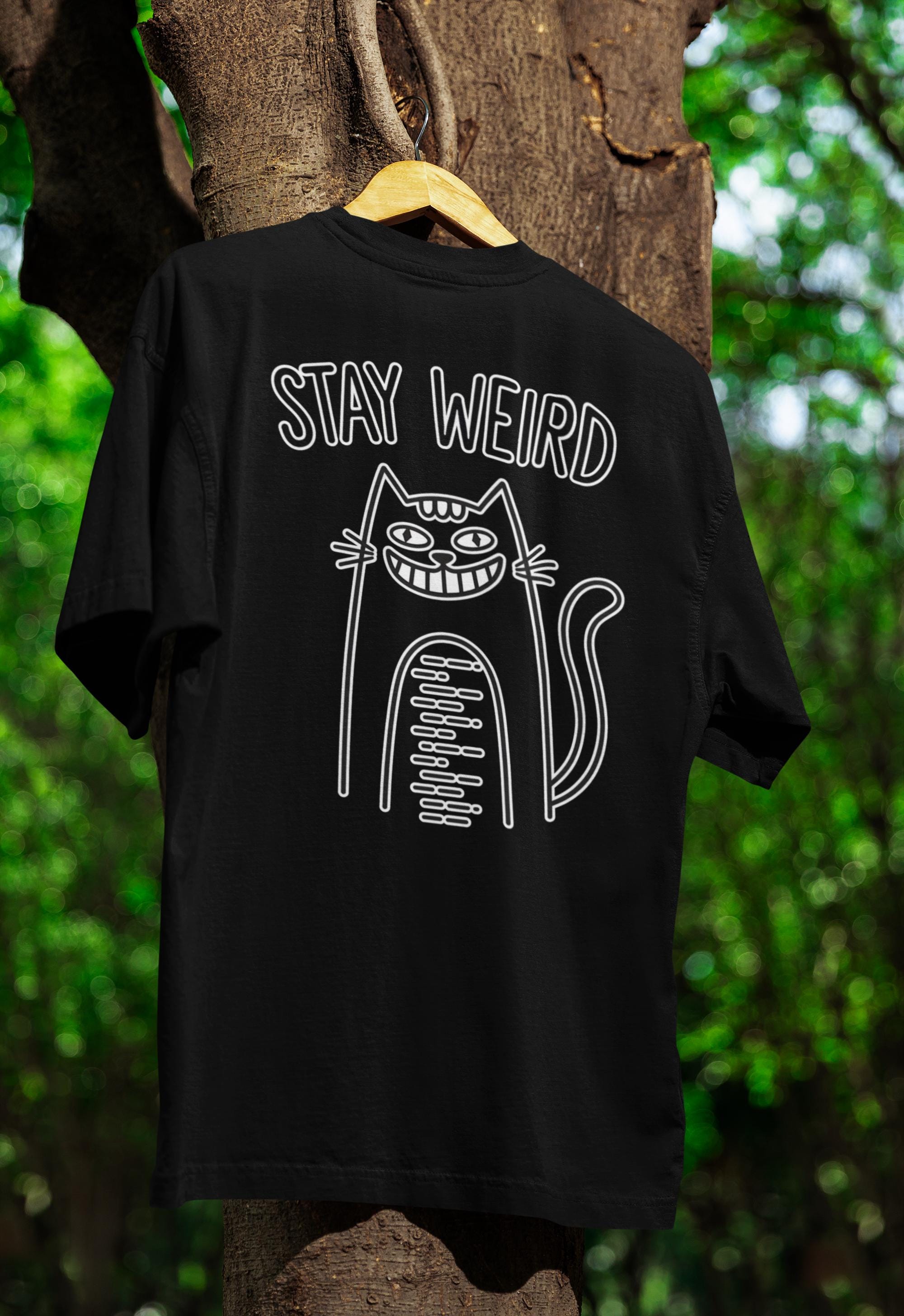 - Features a hand-drawn, minimalist line art cat illustration with the phrase “Stay Weird”