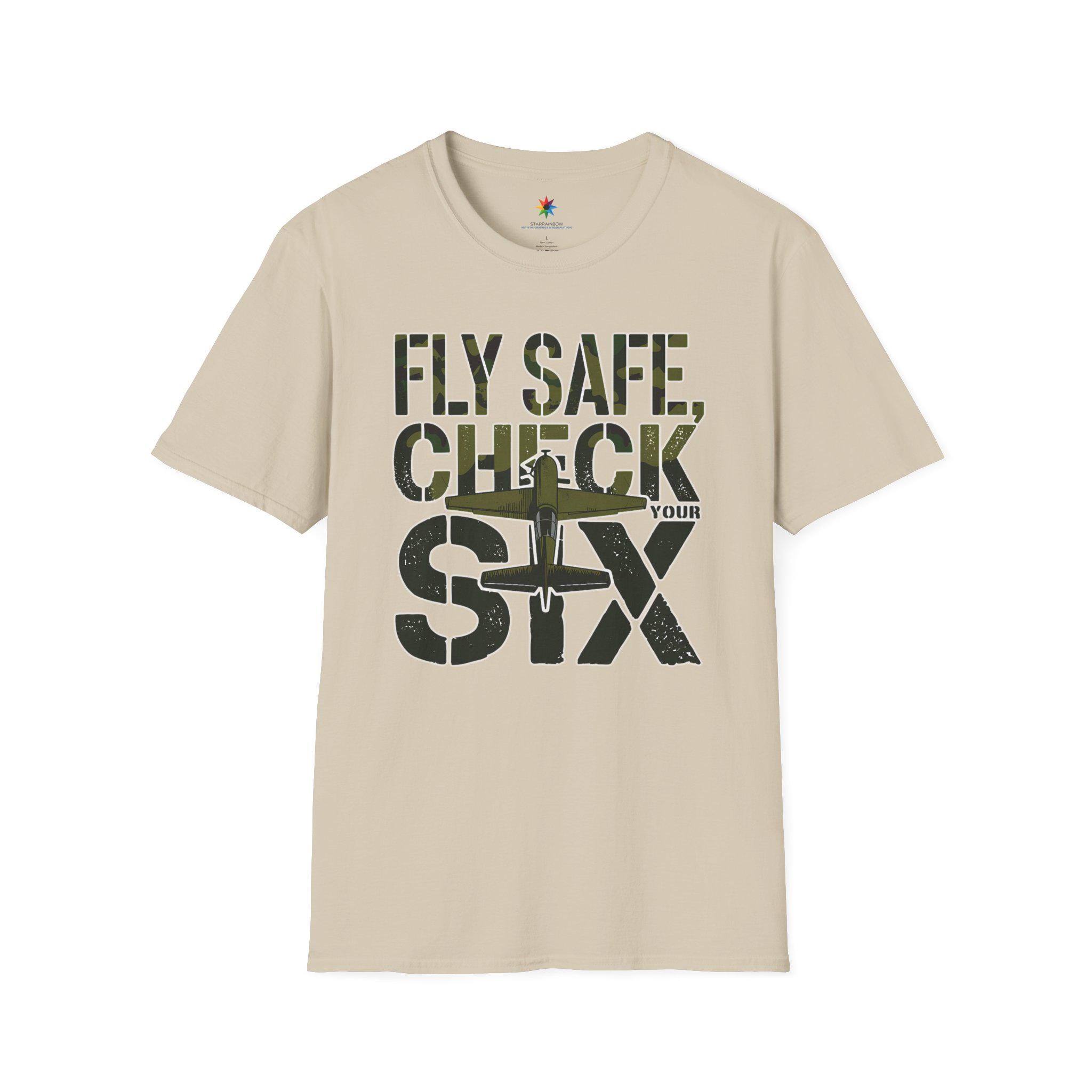 FLY SAFE, CHECK YOUR SIX. This aviation graphic brings a crisp, vintage military vibe to your wardrobe with a bold camo design and a classic warbird silhouette. Inspired by WWII fighter art and made for airplane lovers, it blends humor and heritage into a standout piece that feels right at home from the hangar to the airshow—perfect for any patriot in the USA.