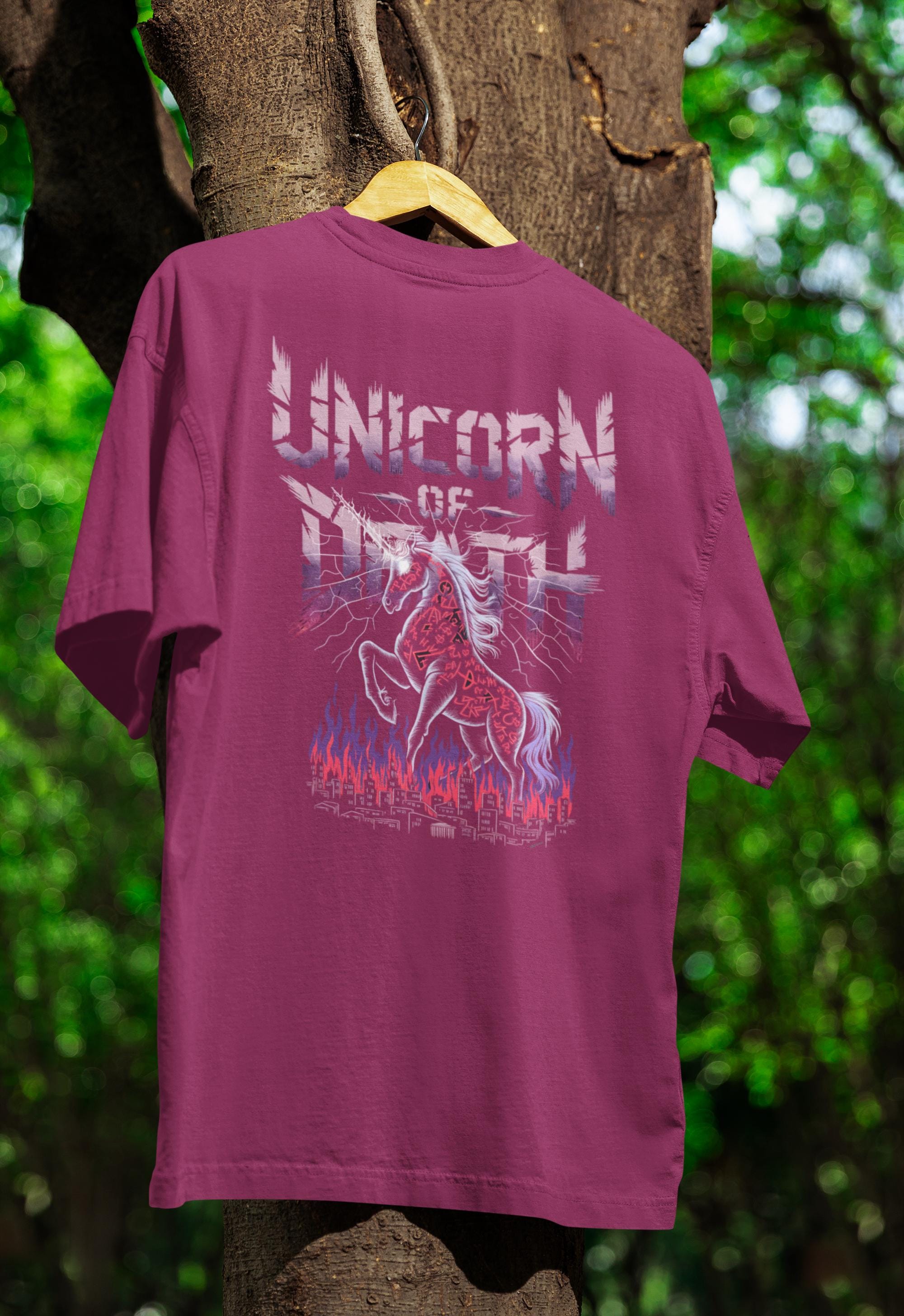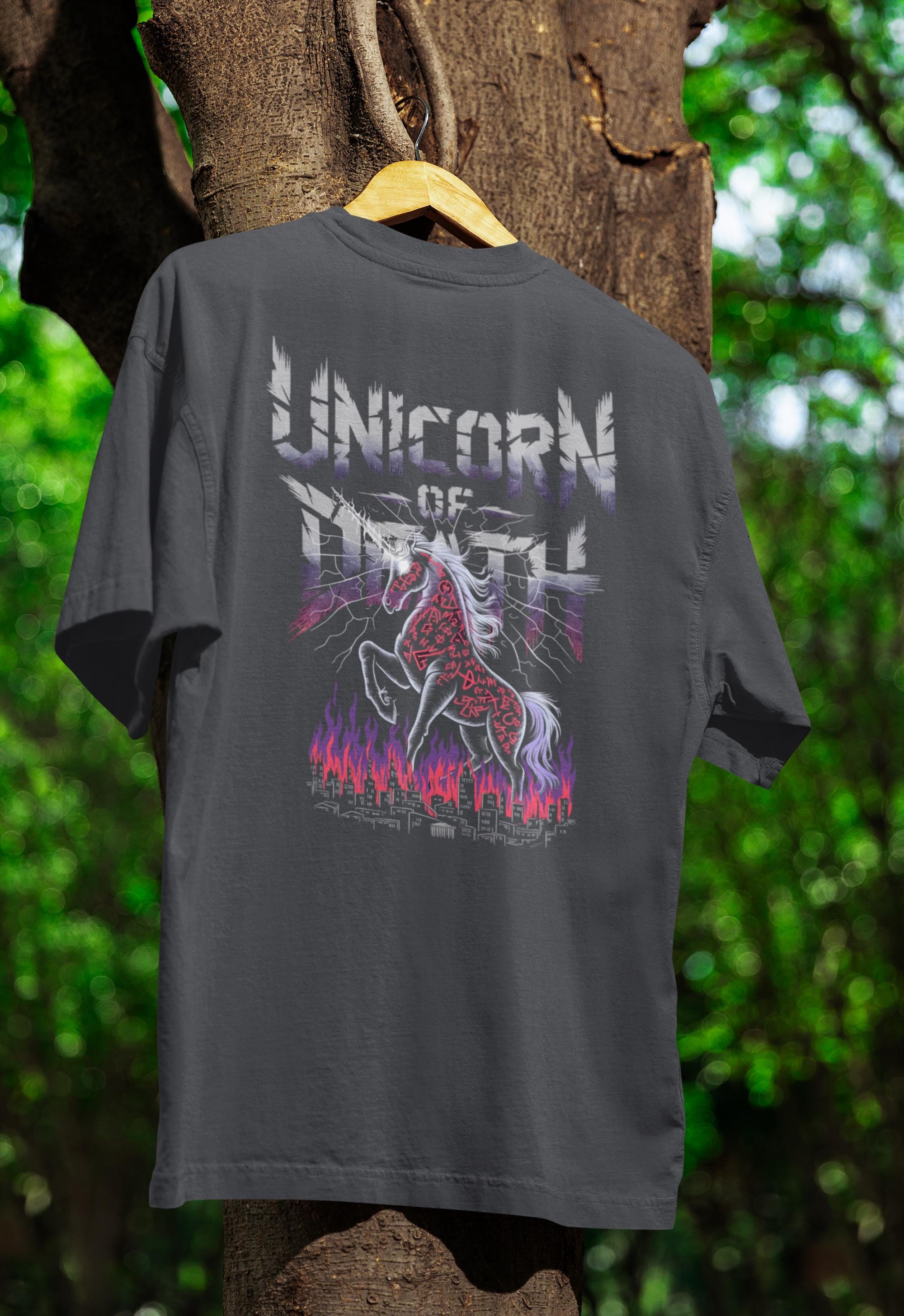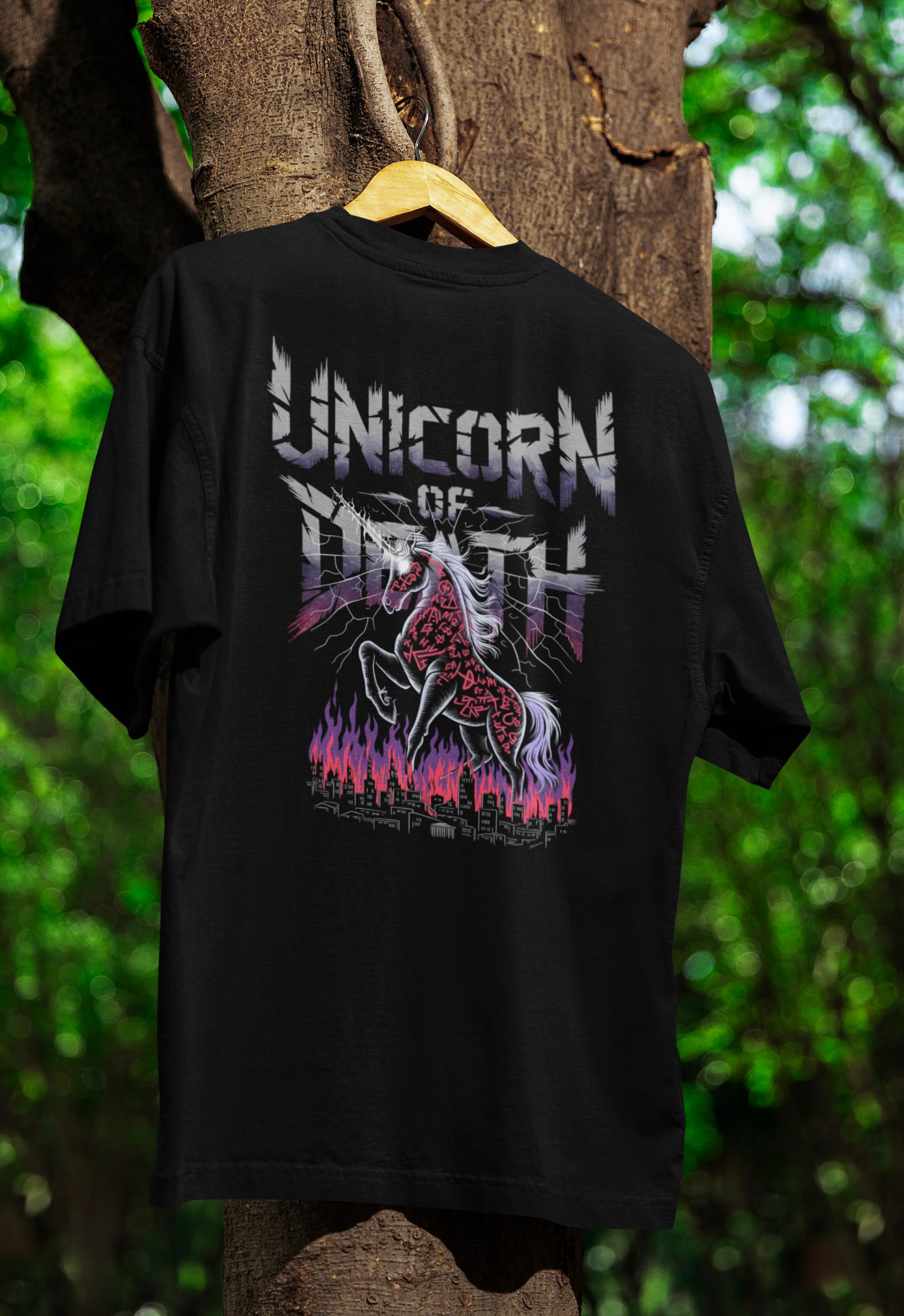 Unleash your dark fantasy and punk rock spirit with the Unicorn of Death Shirt, a heavy metal tee that embodies gothic unicorn aesthetic and mythical rebellion. This striking graphic tee features a skull unicorn amidst an electrifying neon fire and lightning storm backdrop, perfectly capturing the essence of dark fantasy occult style and rebellious punk fashion. Designed for lovers of edgy, alternative looks, this shirt blends mythical horse imagery with apocalyptic themes, making it a bold statement piece for those who embrace the enchanted gothic rocker vibe.