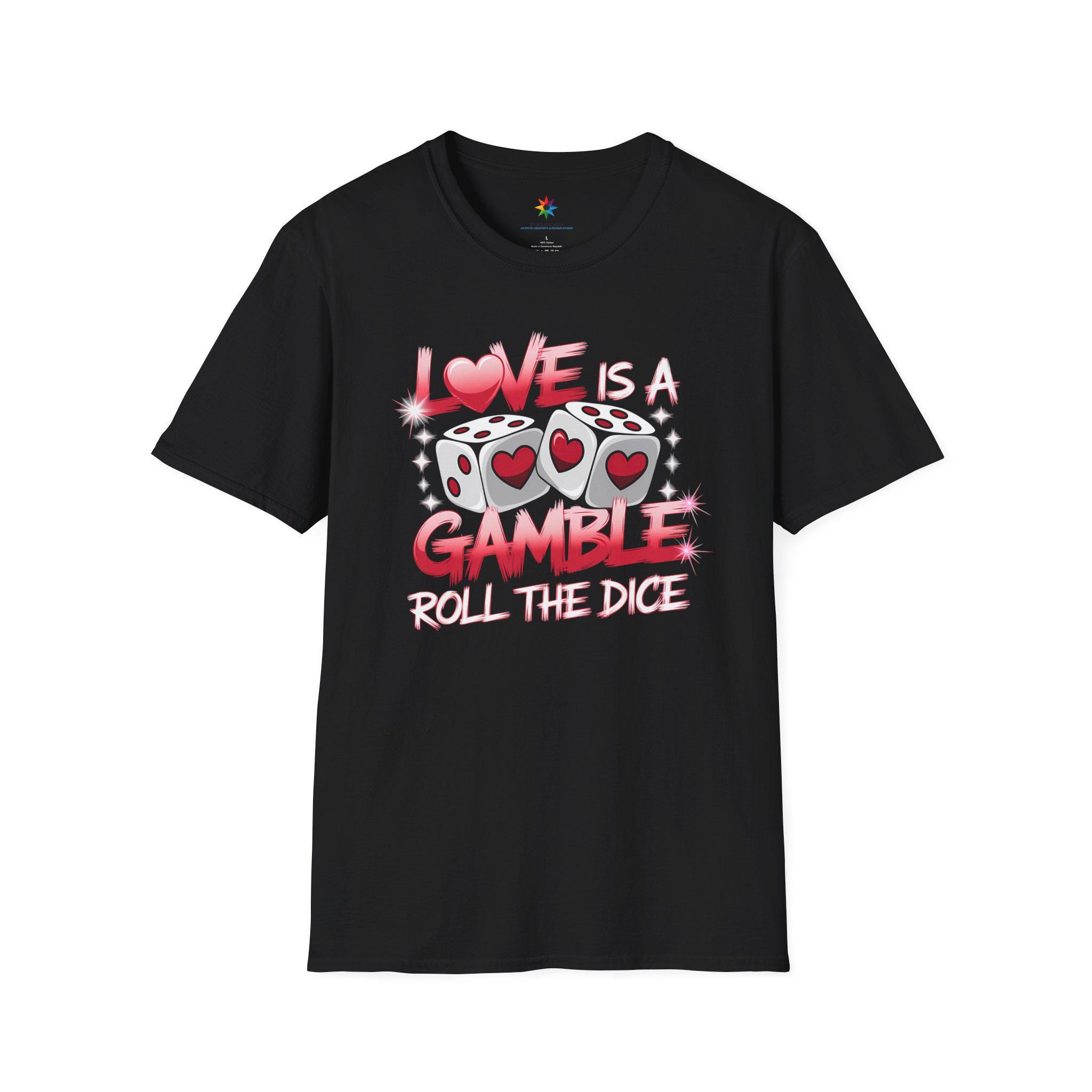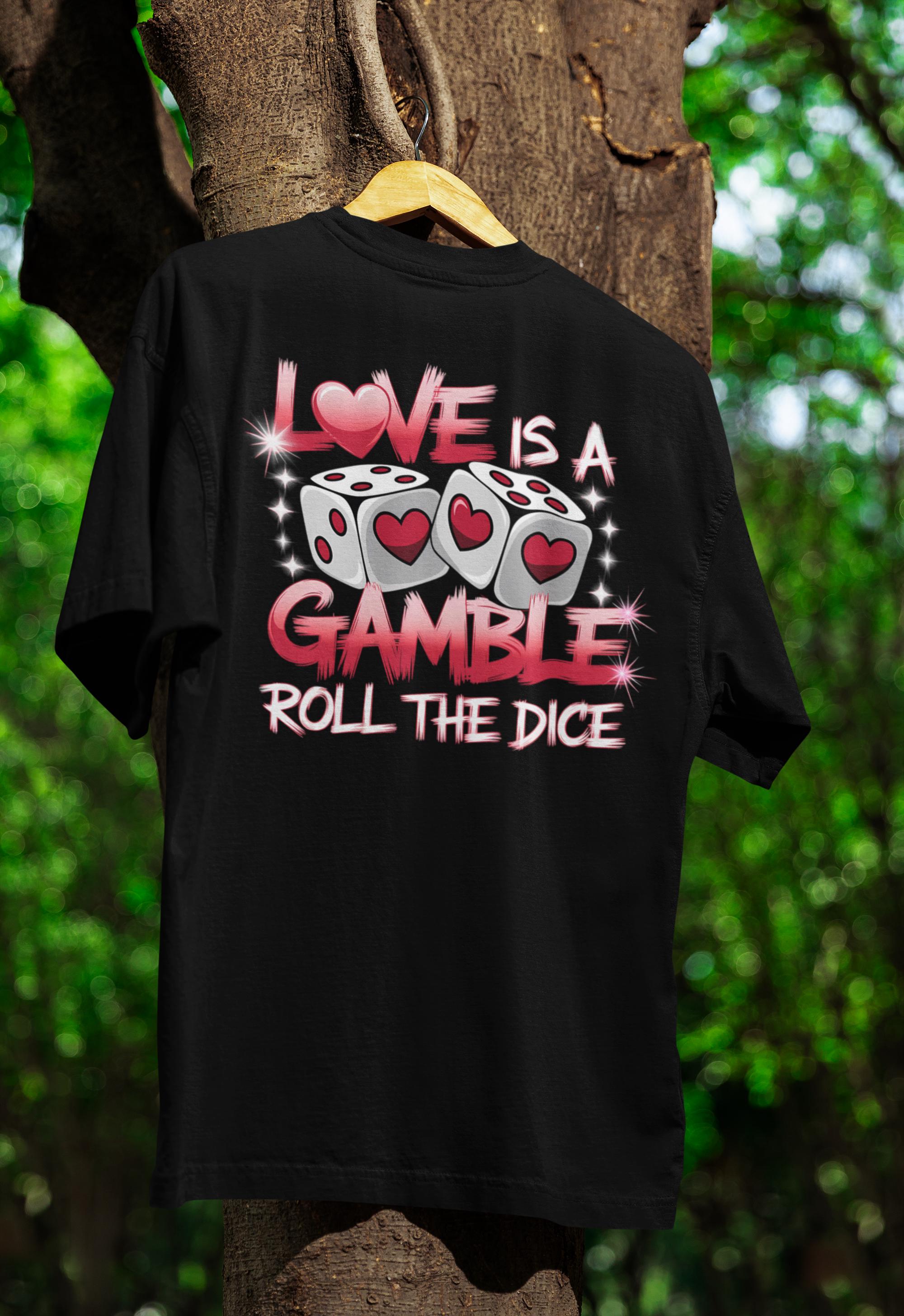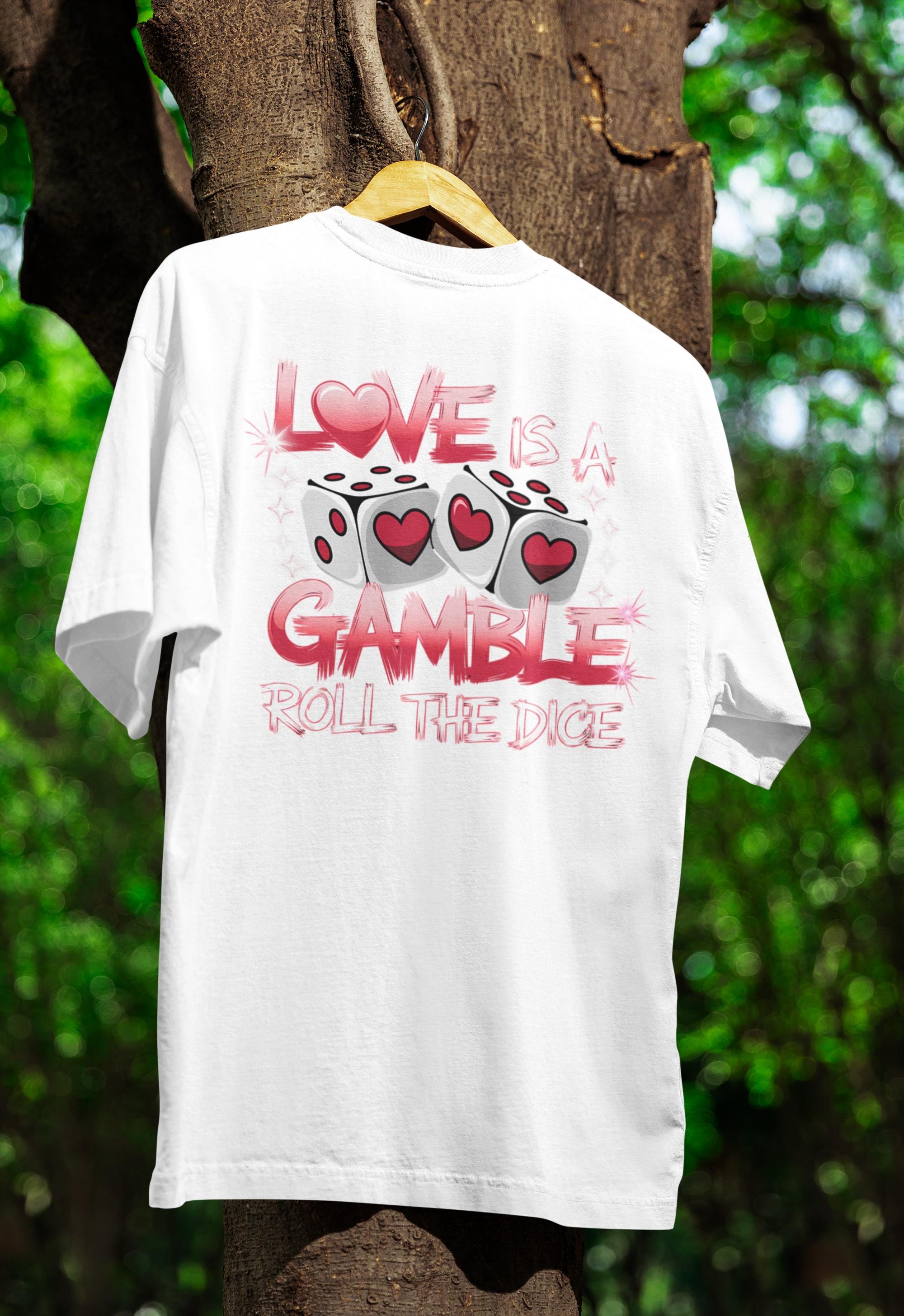 Take a chance on love with this playful "Love is a Gamble" t-shirt! Featuring a vibrant design of dice adorned with hearts and the phrase "Roll the Dice," this romantic graphic is perfect for Valentine's Day, anniversaries, or anyone who enjoys a fun and unique style. Ideal for couples, casino enthusiasts, or those who love bold designs with a touch of humor.