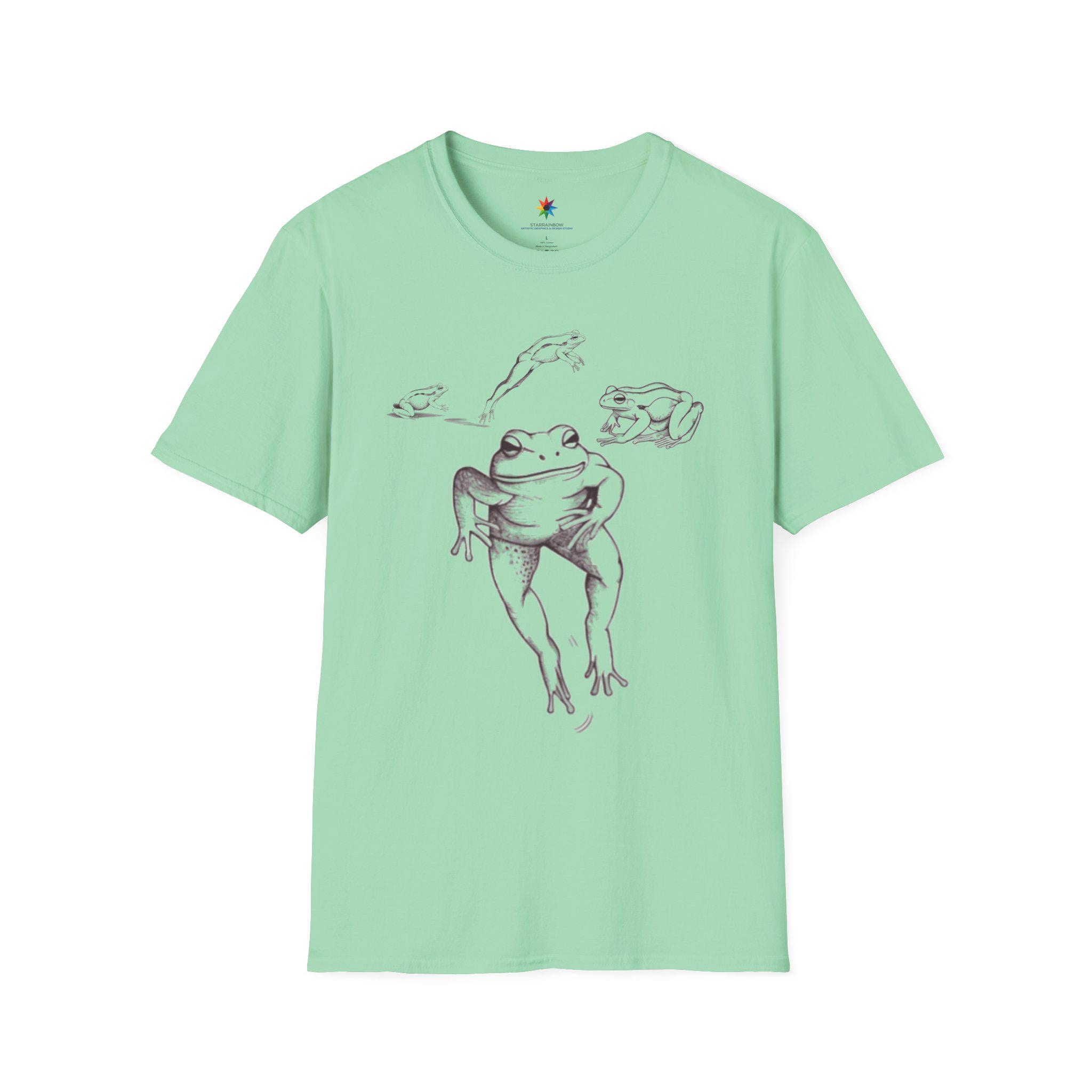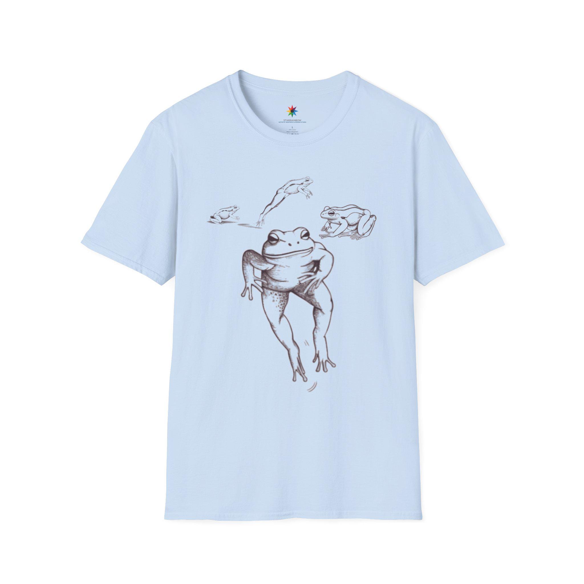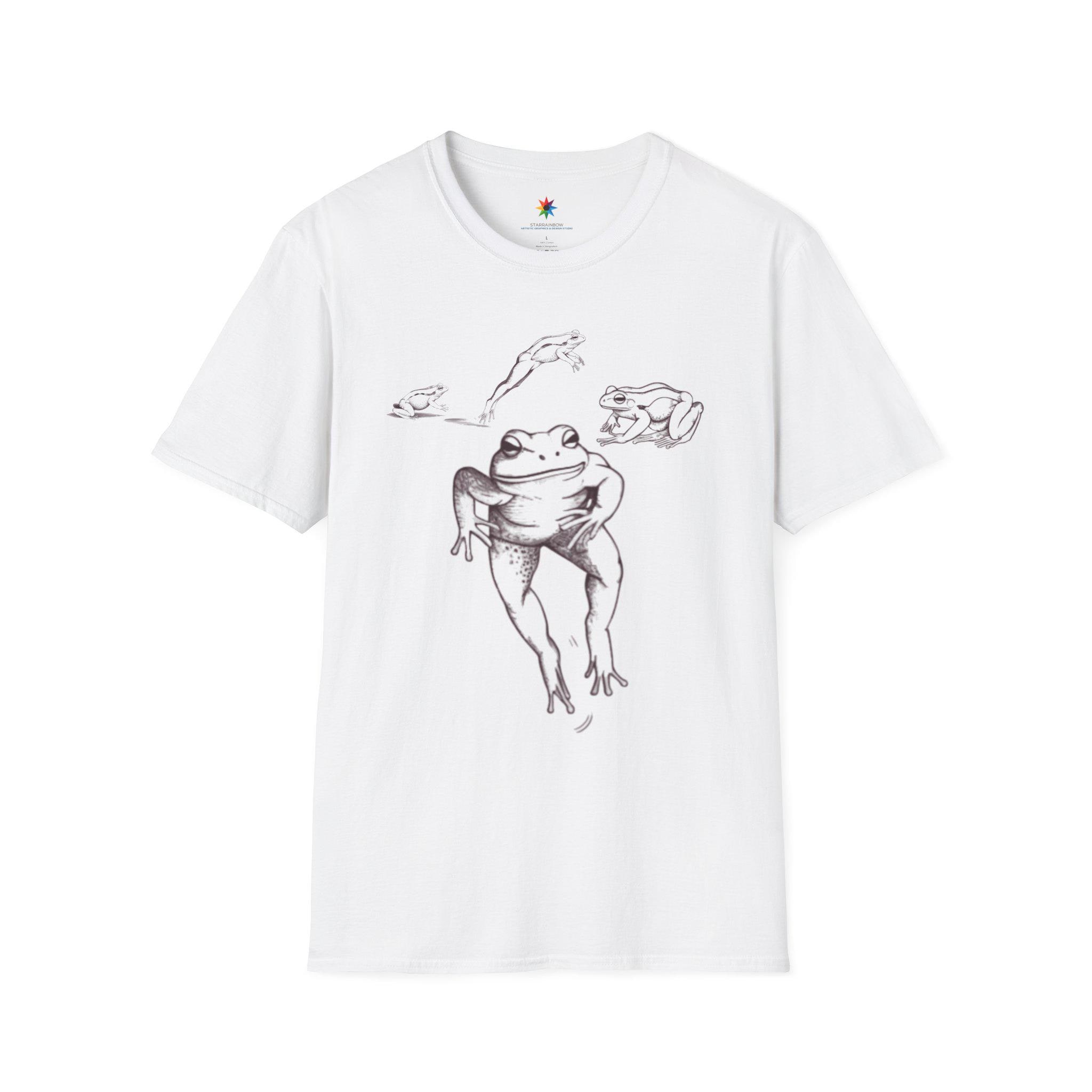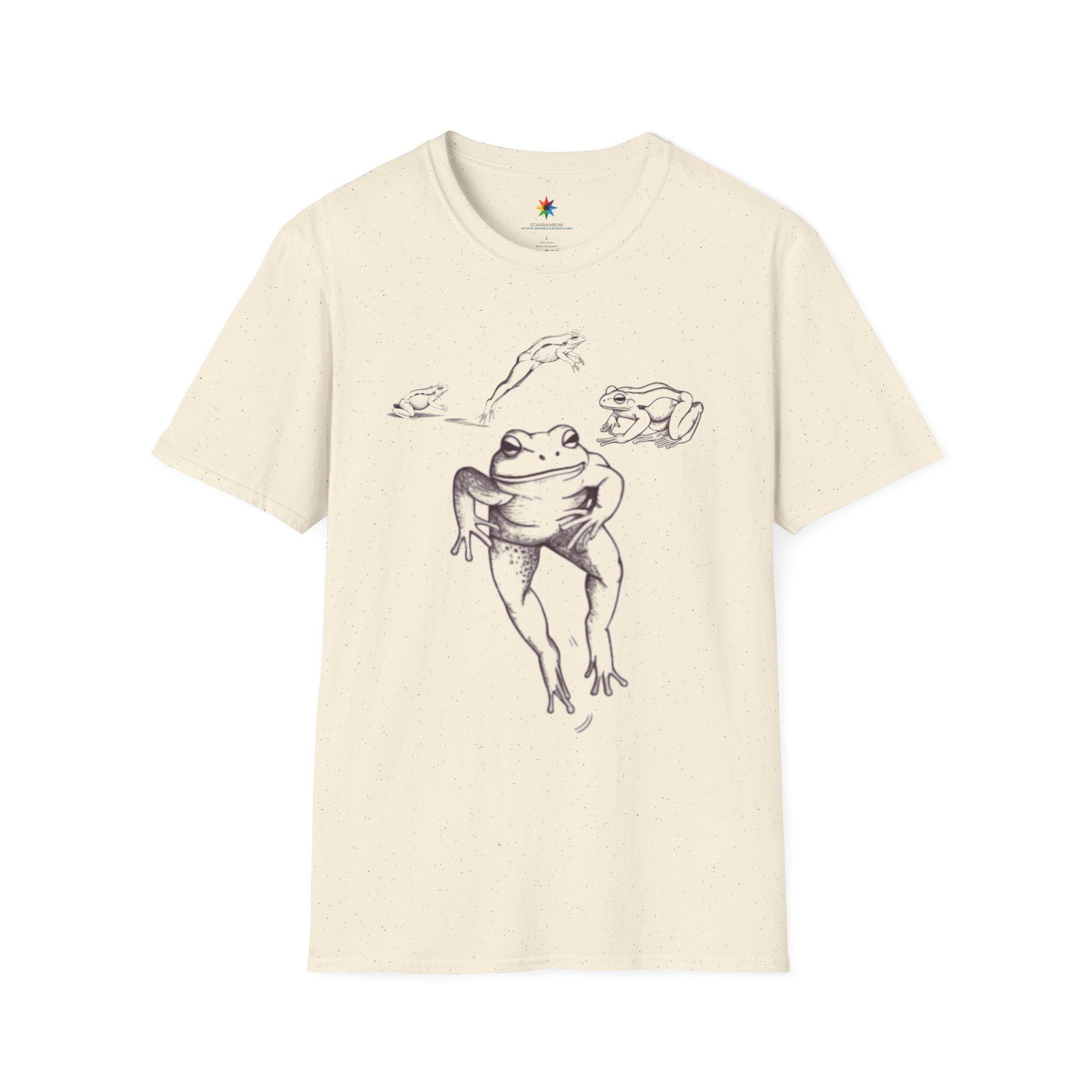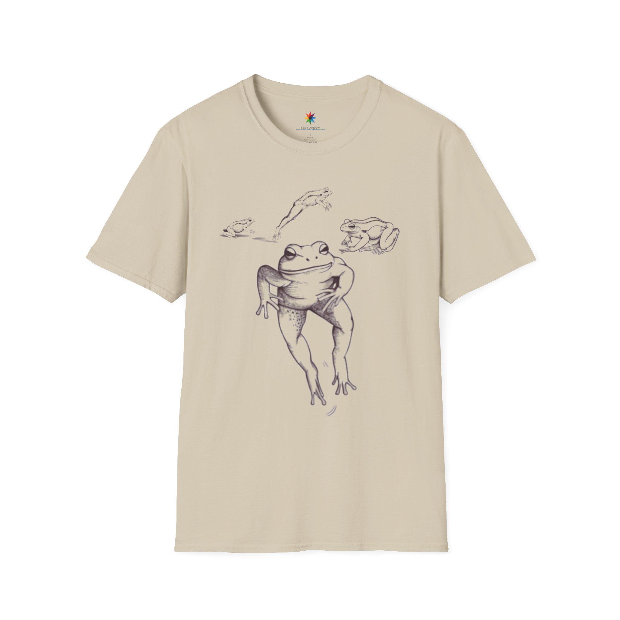 Meet your new go-to tee: a funny frog vintage drawing T-shirt that delivers instant smiles. The centerpiece is a dancing frog rendered like a classic sketch—a retro nature art vibe with crisp black and white ink linework. This graphic scene feels both minimalist and quirky, making the shirt easy to dress up or down. It's a unisex soft cotton tshirt built for everyday comfort, perfect for anyone who loves wildlife, a cool aesthetic, and a dash of humor.