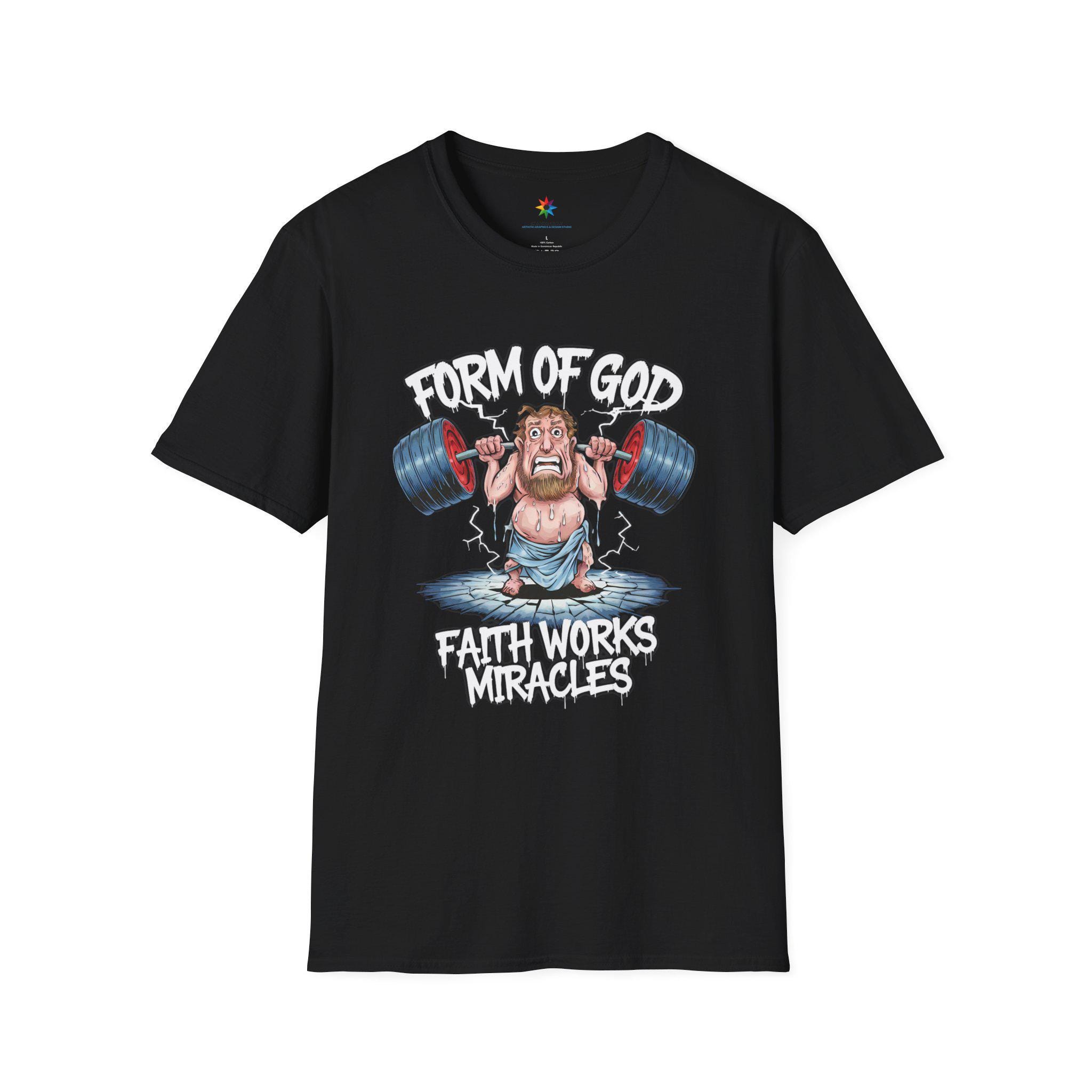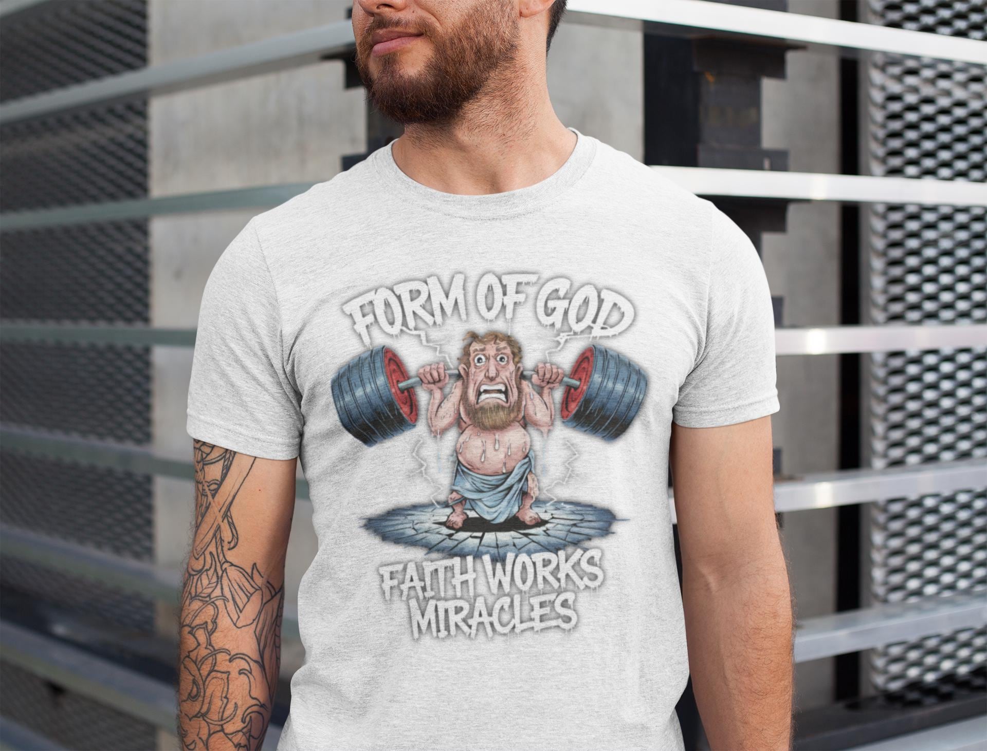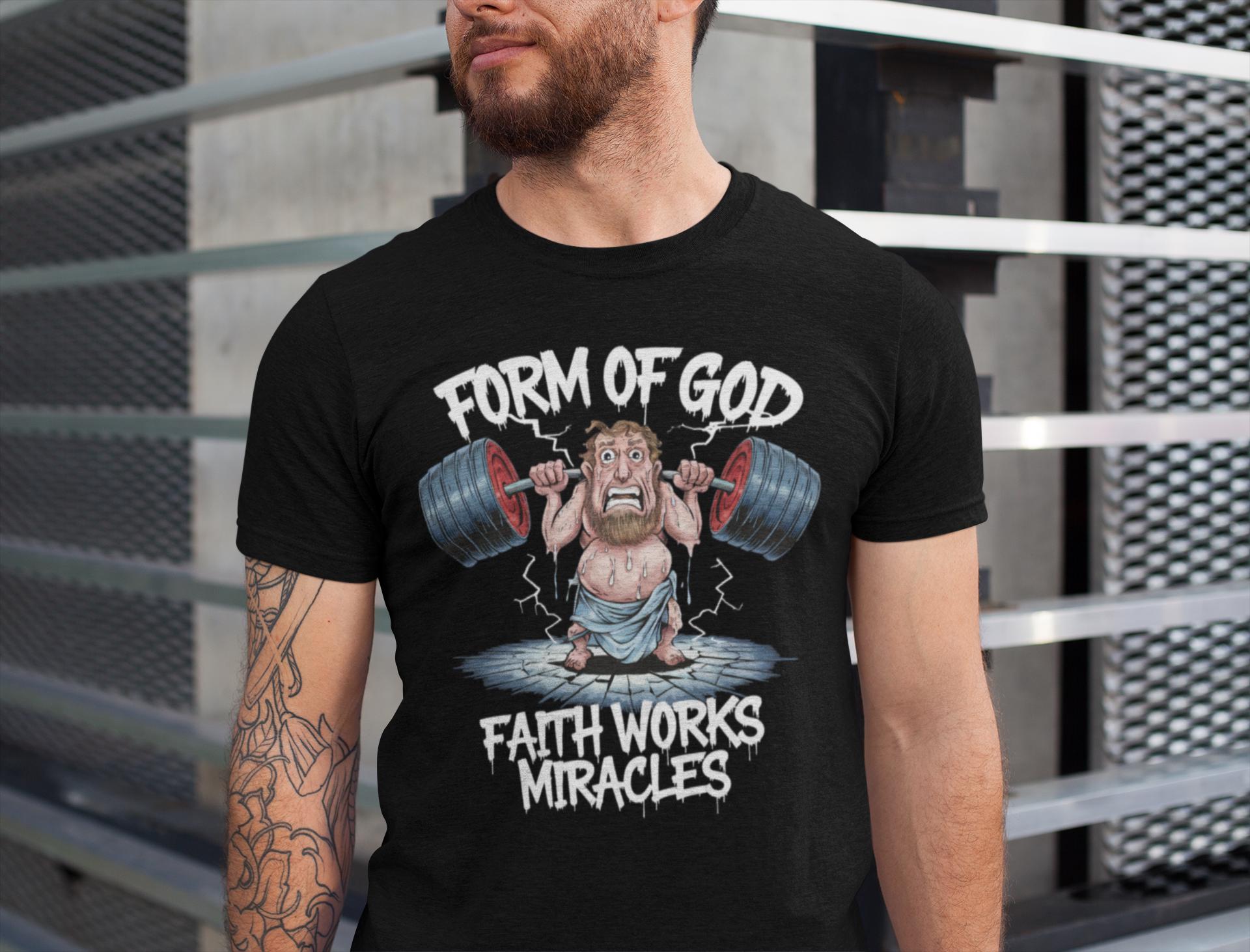 Elevate your workout wardrobe with this inspiring Christian gym shirt that combines faith and strength in a bold, eye-catching design. Featuring the powerful message “Form of God” alongside “Faith Works Miracles,” this unisex fitness tee is perfect for spiritual athletes who want to showcase their faith during every rep. The dynamic illustration of Jesus lifting a barbell adds a humorous yet meaningful touch, making this shirt not only a conversation starter but also a reminder of divine strength.