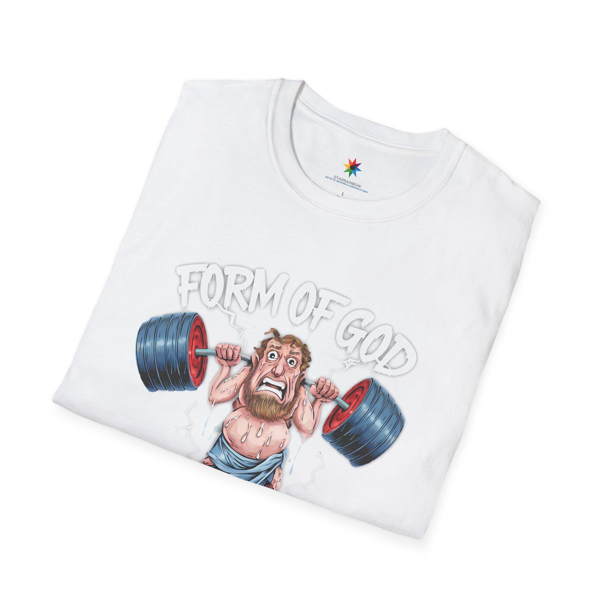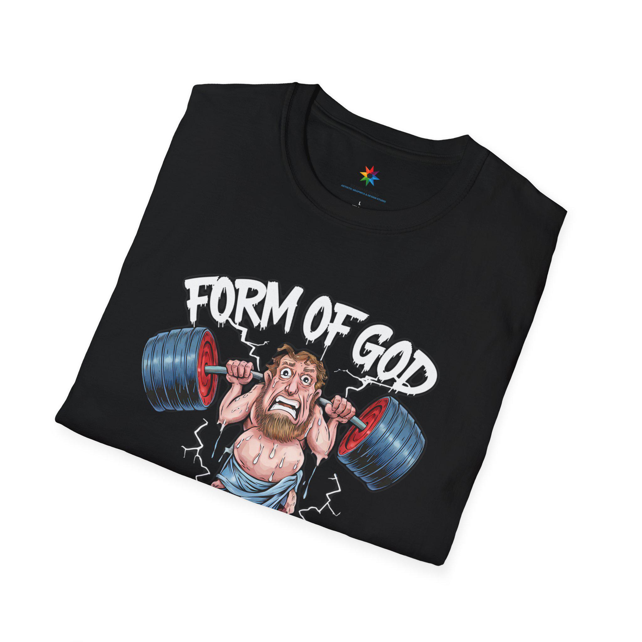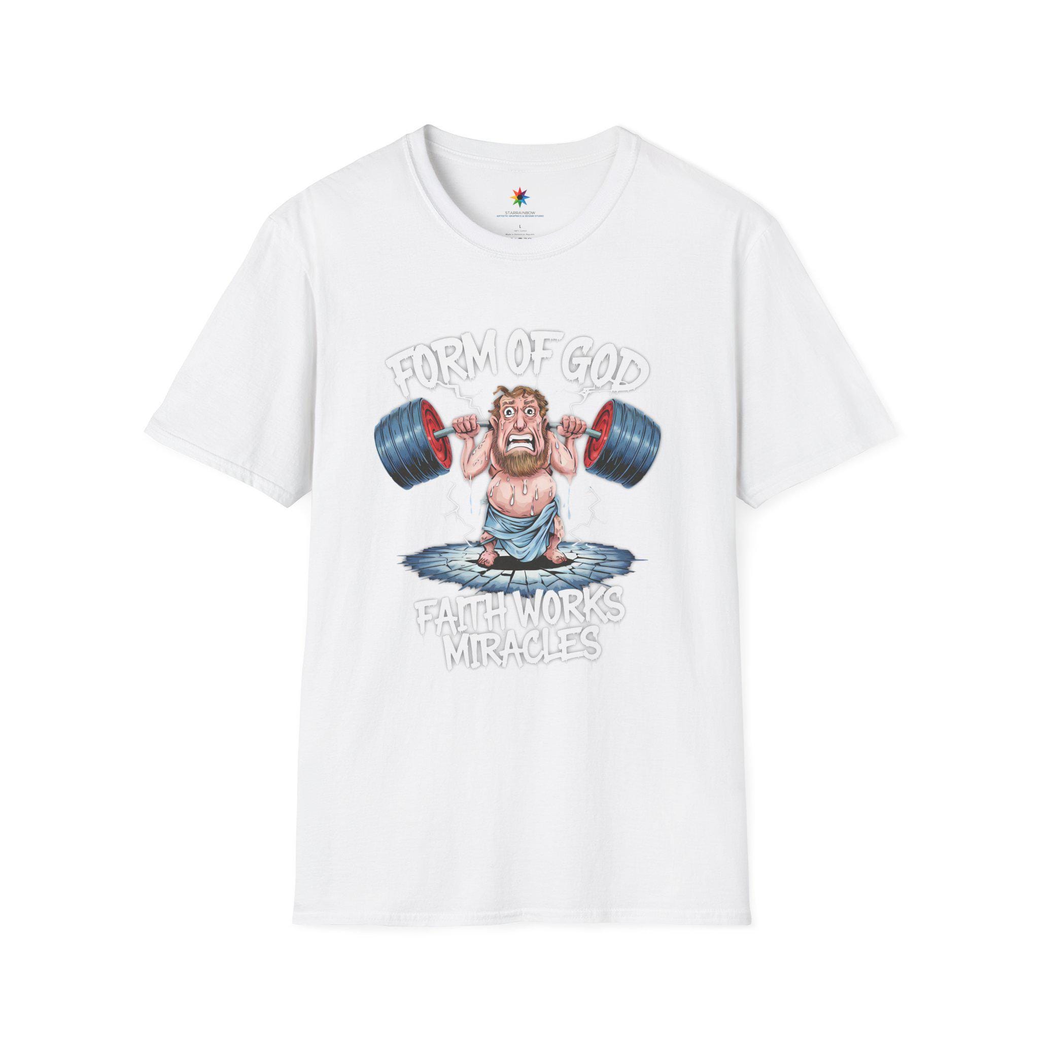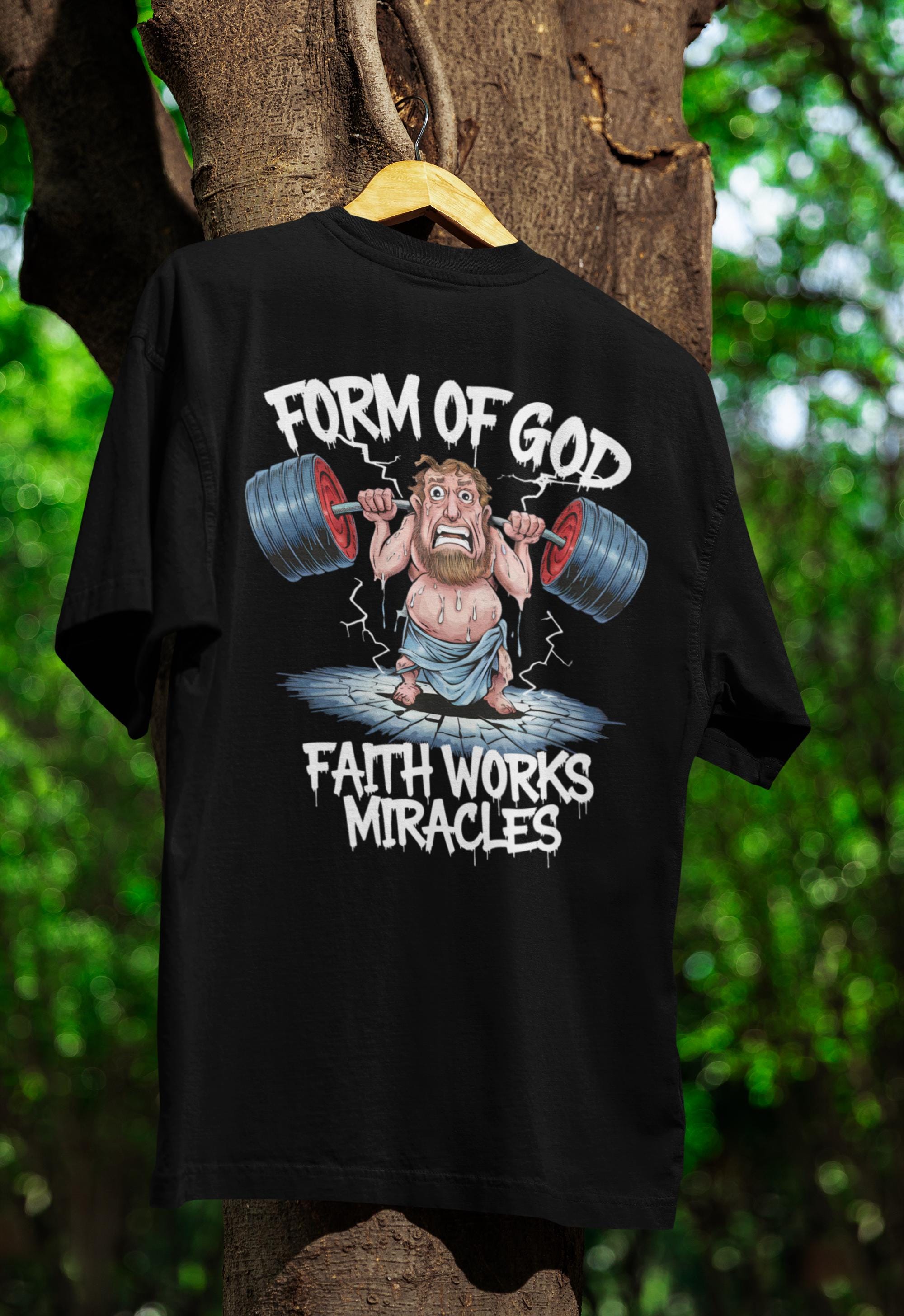 Elevate your workout wardrobe with this inspiring Christian gym shirt that combines faith and strength in a bold, eye-catching design. Featuring the powerful message “Form of God” alongside “Faith Works Miracles,” this unisex fitness tee is perfect for spiritual athletes who want to showcase their faith during every rep. The dynamic illustration of Jesus lifting a barbell adds a humorous yet meaningful touch, making this shirt not only a conversation starter but also a reminder of divine strength.