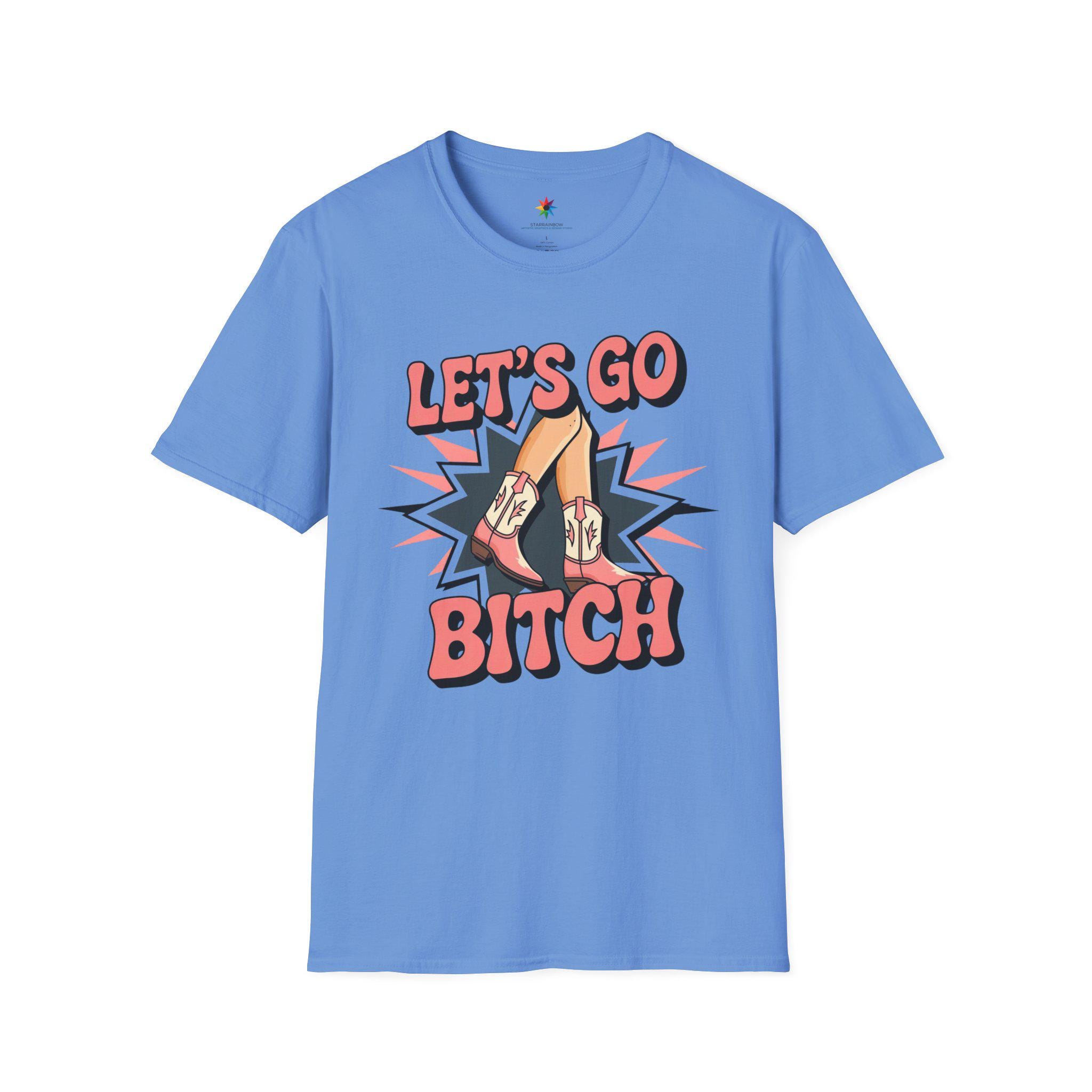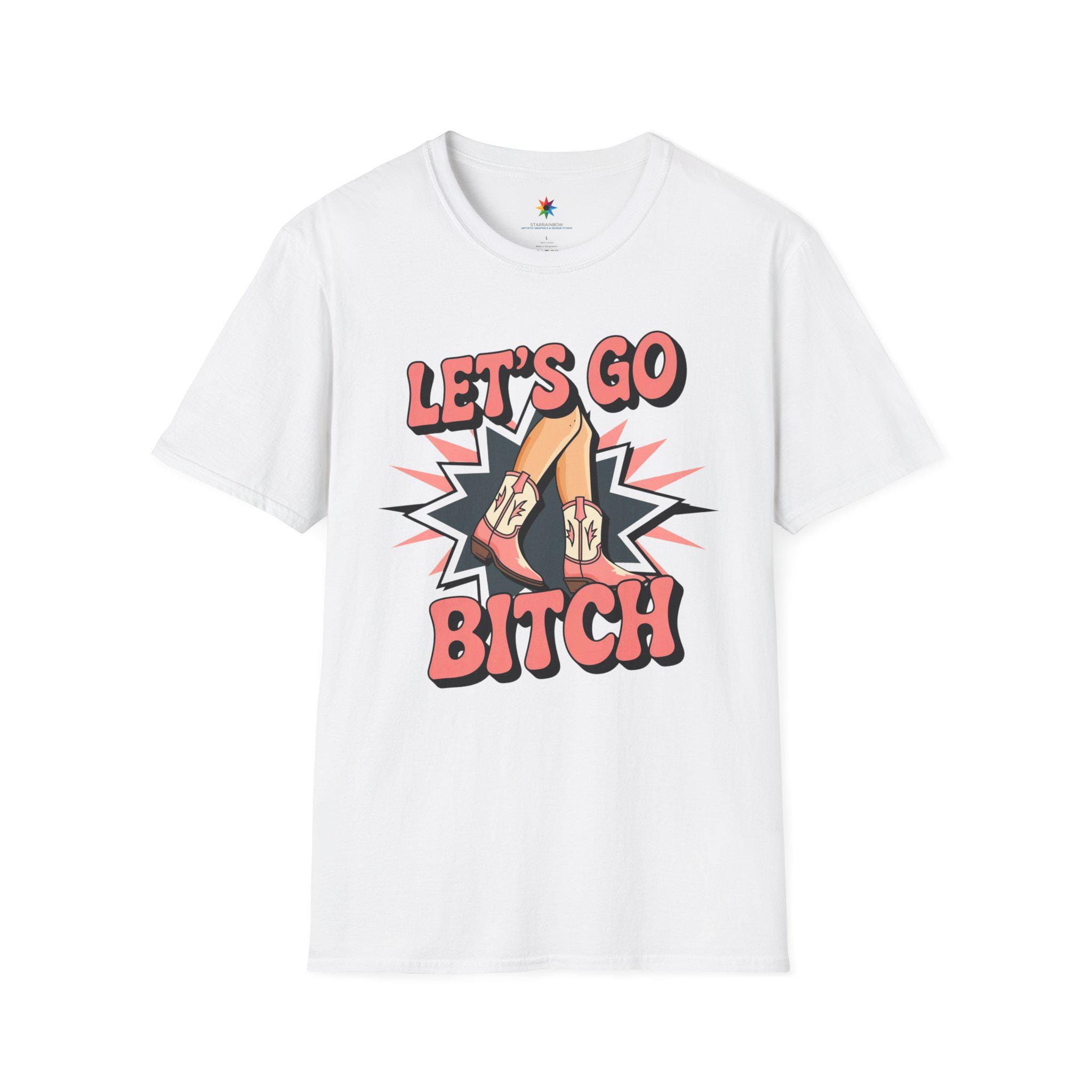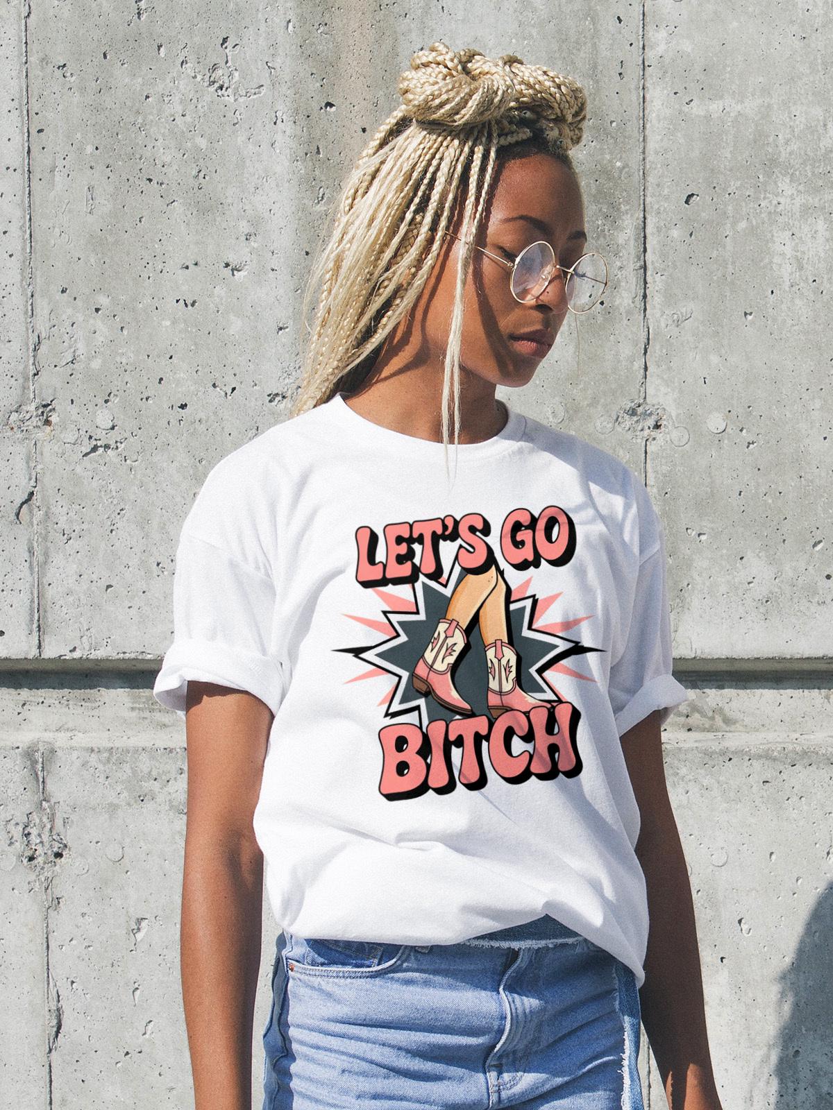 Embrace your wild side with our bold 'Let's Go Bitch' TShirt! This striking Womens Graphic Tee features vibrant pink cowboy boots and legs bursting with energy on a sleek black background, perfect for any Cowboy Girl who loves the fierce spirit of the Rodeo Graphic. Designed for fans of Wild West Fashion, this Western Style Shirt captures the rebellious energy of Western Rodeo with a trendy, country-inspired Country Chic vibe.