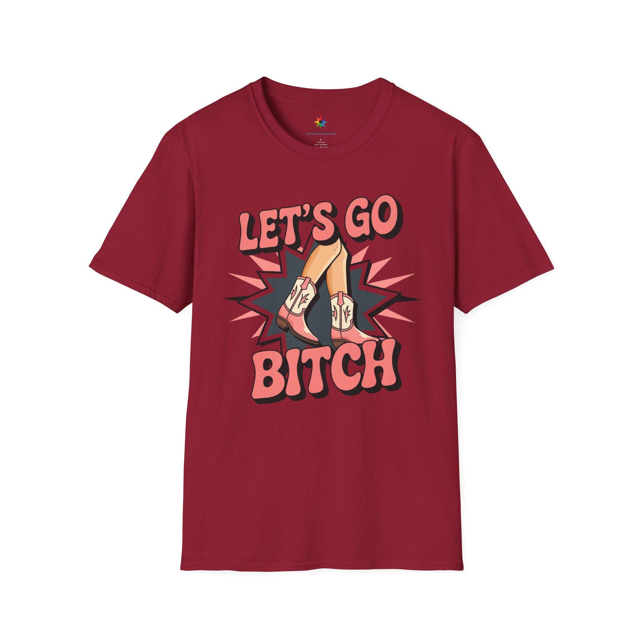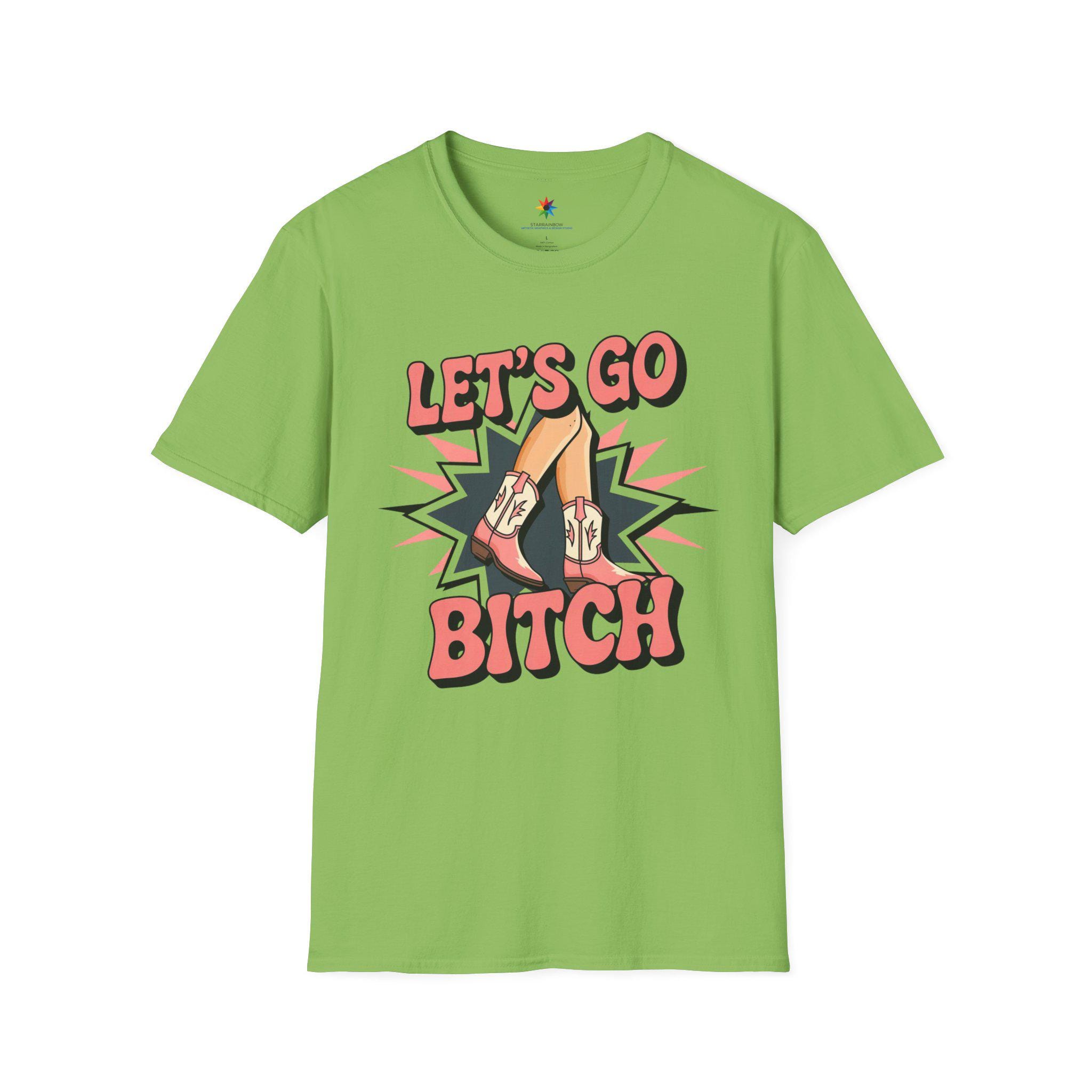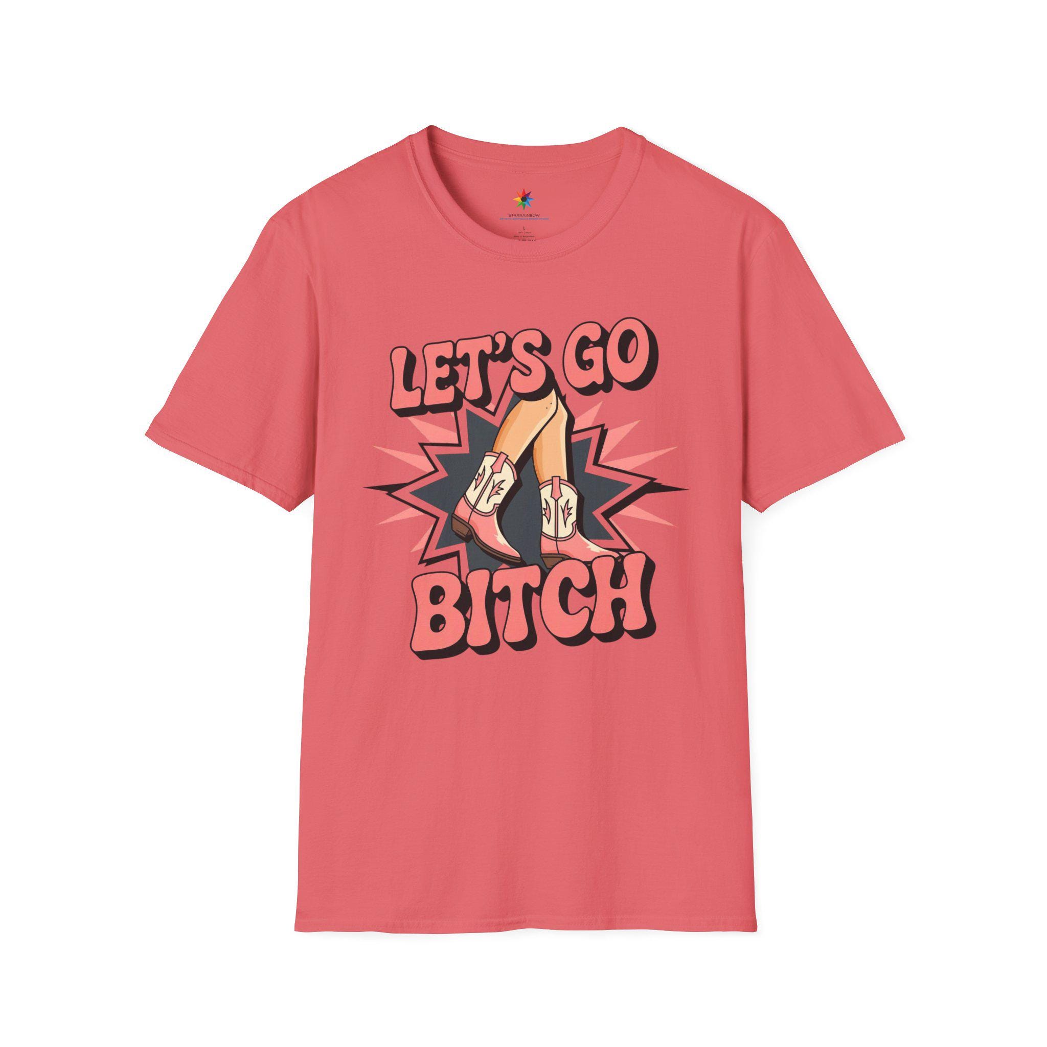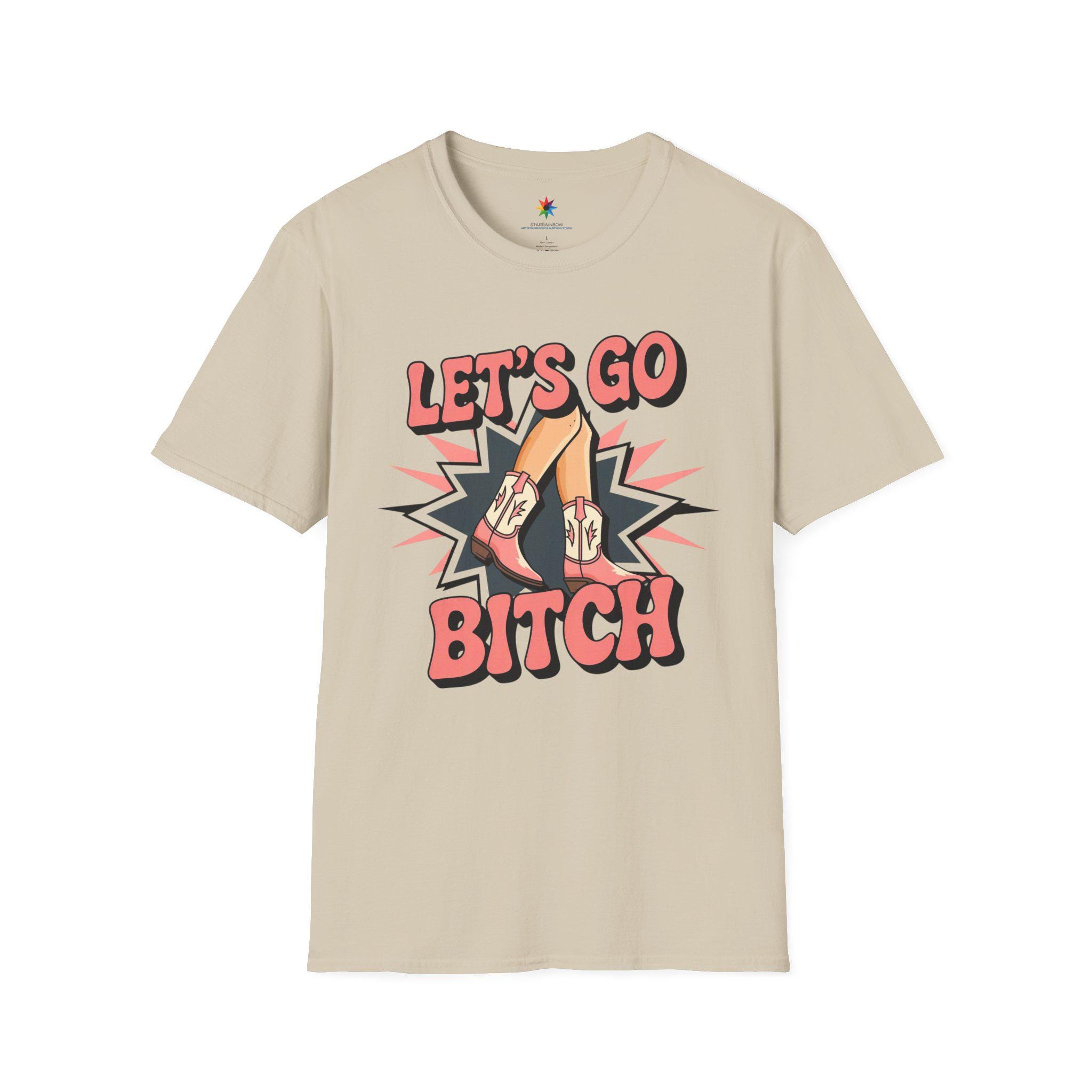 Embrace your wild side with our bold 'Let's Go Bitch' TShirt! This striking Womens Graphic Tee features vibrant pink cowboy boots and legs bursting with energy on a sleek black background, perfect for any Cowboy Girl who loves the fierce spirit of the Rodeo Graphic. Designed for fans of Wild West Fashion, this Western Style Shirt captures the rebellious energy of Western Rodeo with a trendy, country-inspired Country Chic vibe.