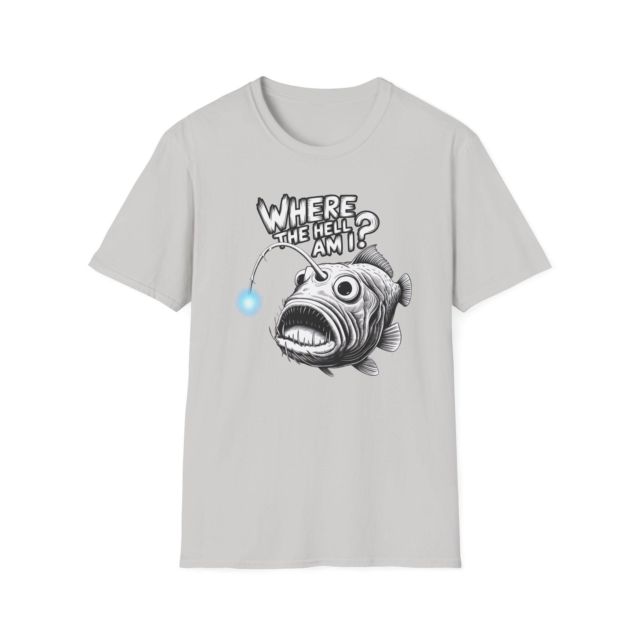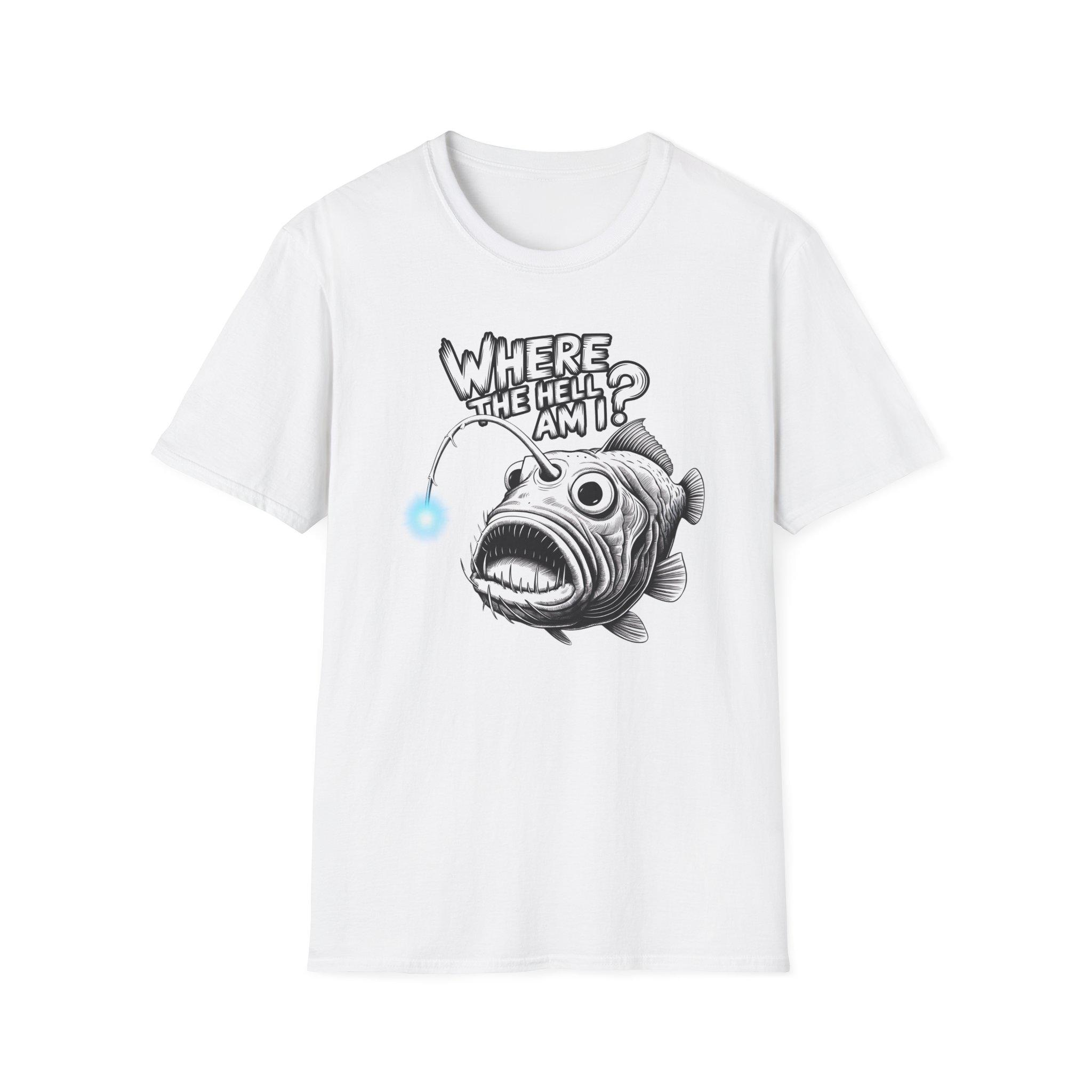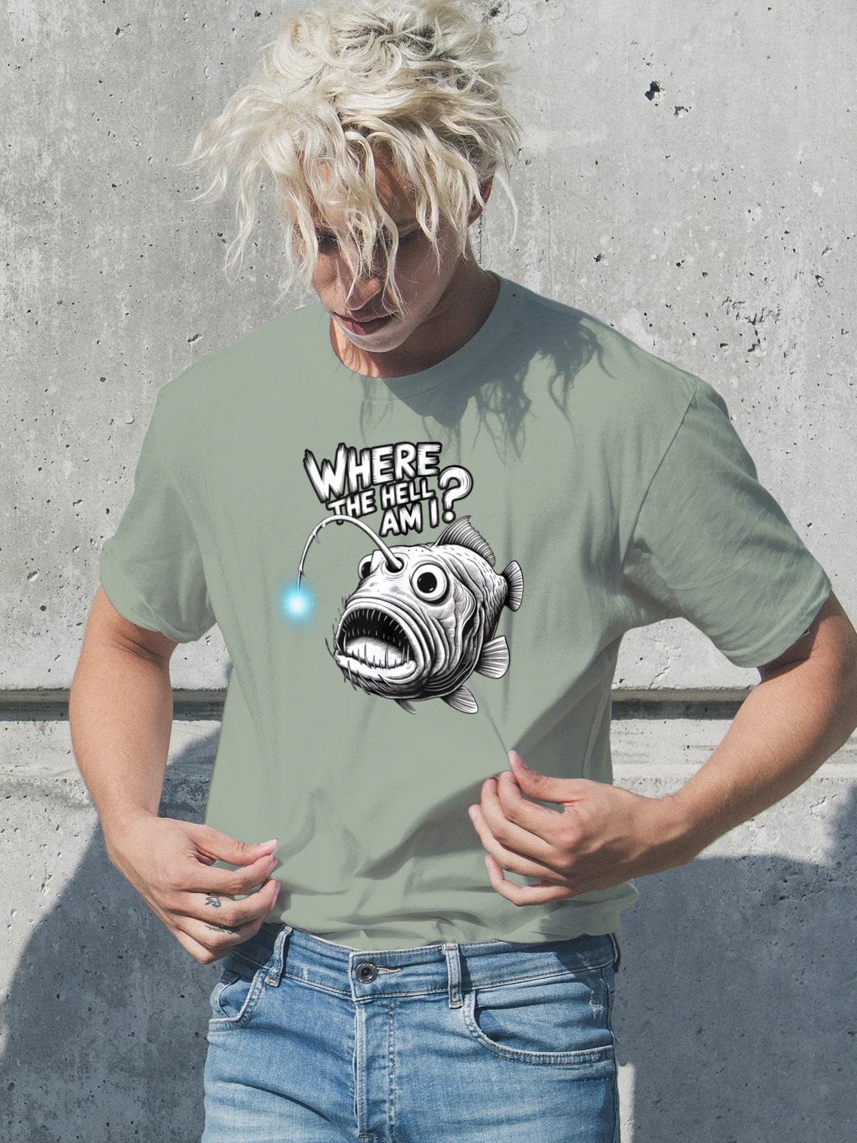 Meet the Funny Anglerfish Ocean Tee — a unisex graphic shirt that delivers a big laugh with a bioluminescent vibe. The wide-eyed deep sea character pops in bold black-and-white art with the hand-lettered quip “Where The Hell Am I?” It's a sarcastic deep sea TShirt built for people who love absurd humor, ocean life, and offbeat design. Whether you call it a tee, tshirt, or shirt, this bioluminescent fish gift for men and women shines in any casual lineup.