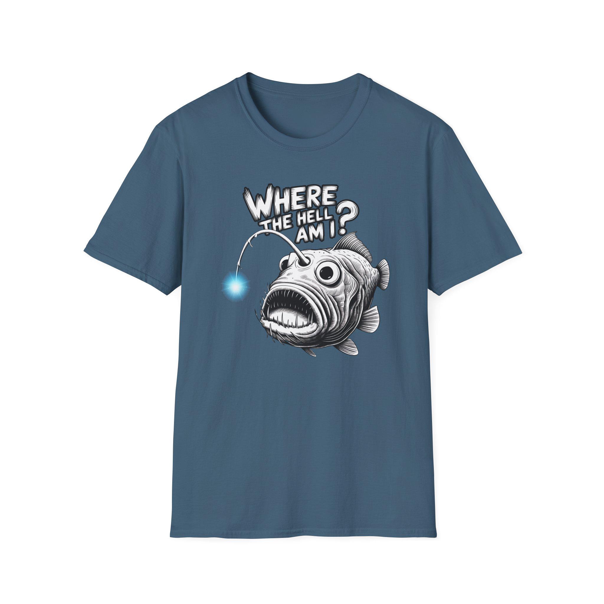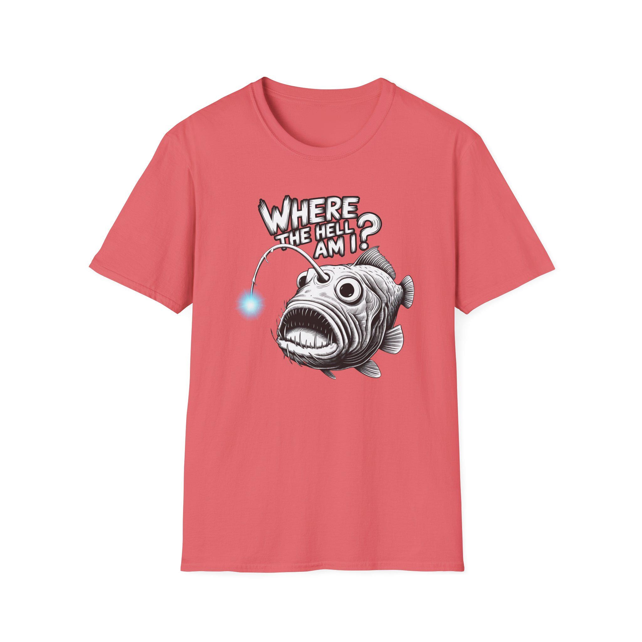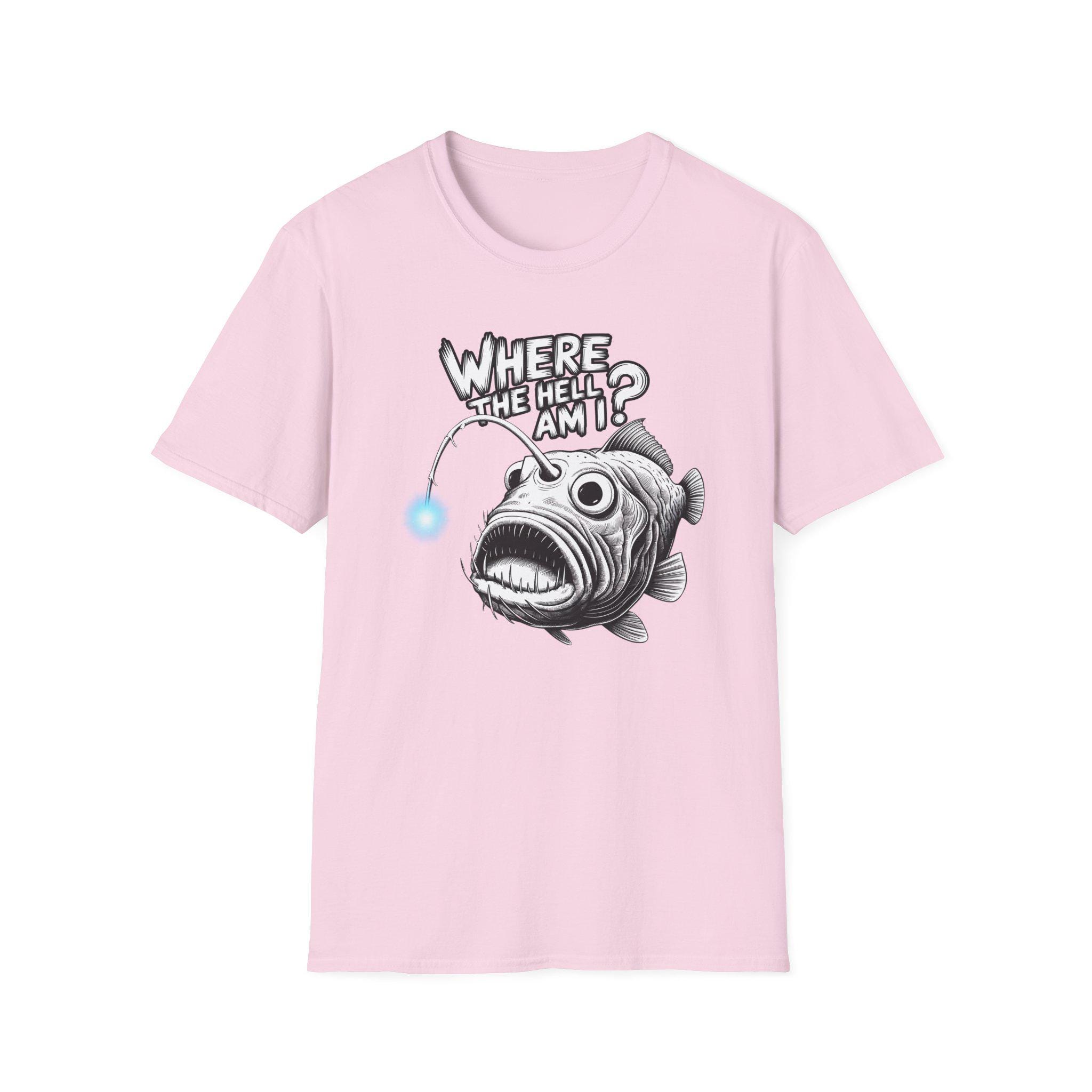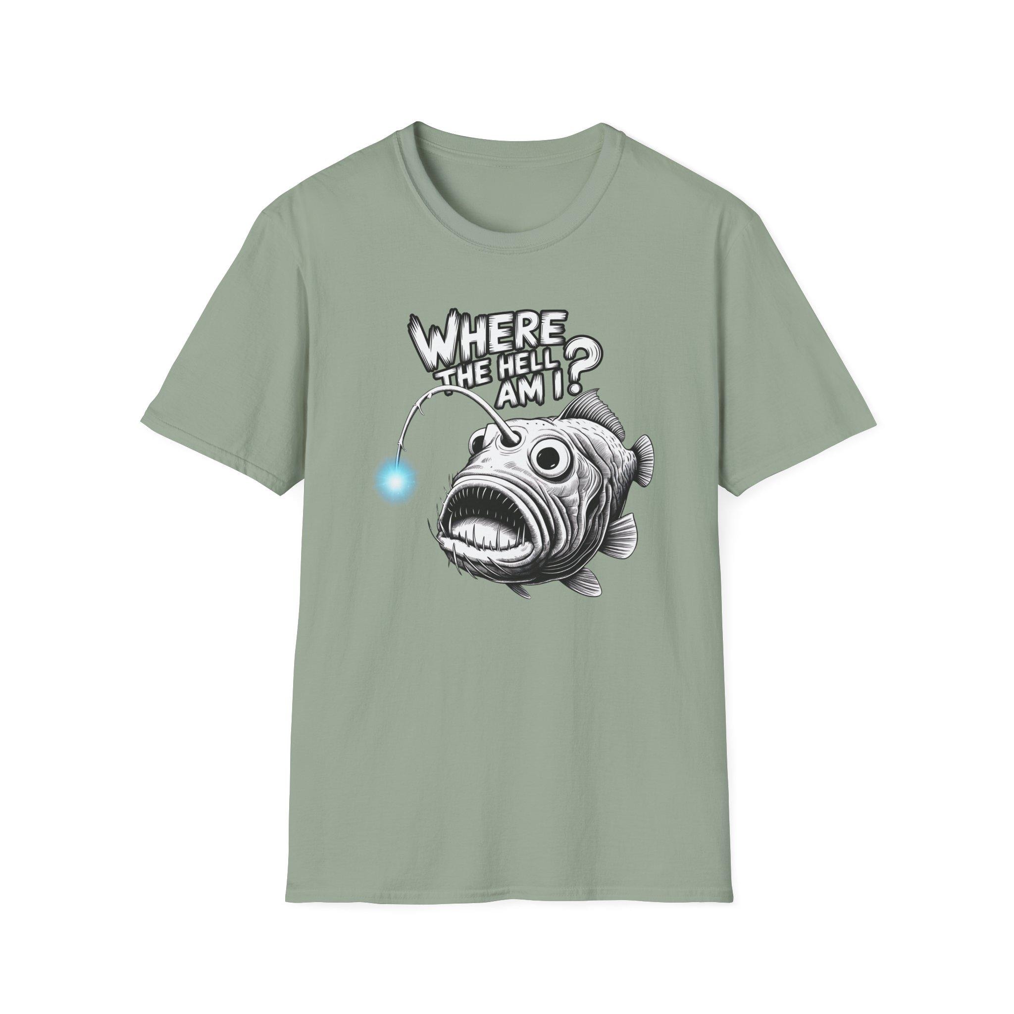 Meet the Funny Anglerfish Ocean Tee — a unisex graphic shirt that delivers a big laugh with a bioluminescent vibe. The wide-eyed deep sea character pops in bold black-and-white art with the hand-lettered quip “Where The Hell Am I?” It's a sarcastic deep sea TShirt built for people who love absurd humor, ocean life, and offbeat design. Whether you call it a tee, tshirt, or shirt, this bioluminescent fish gift for men and women shines in any casual lineup.