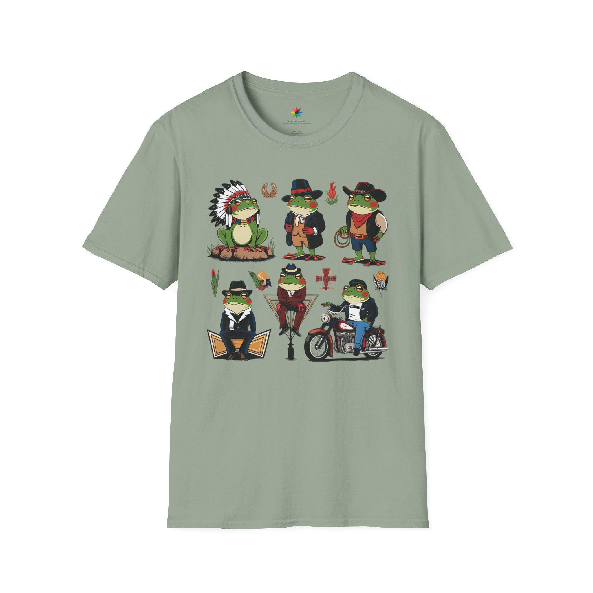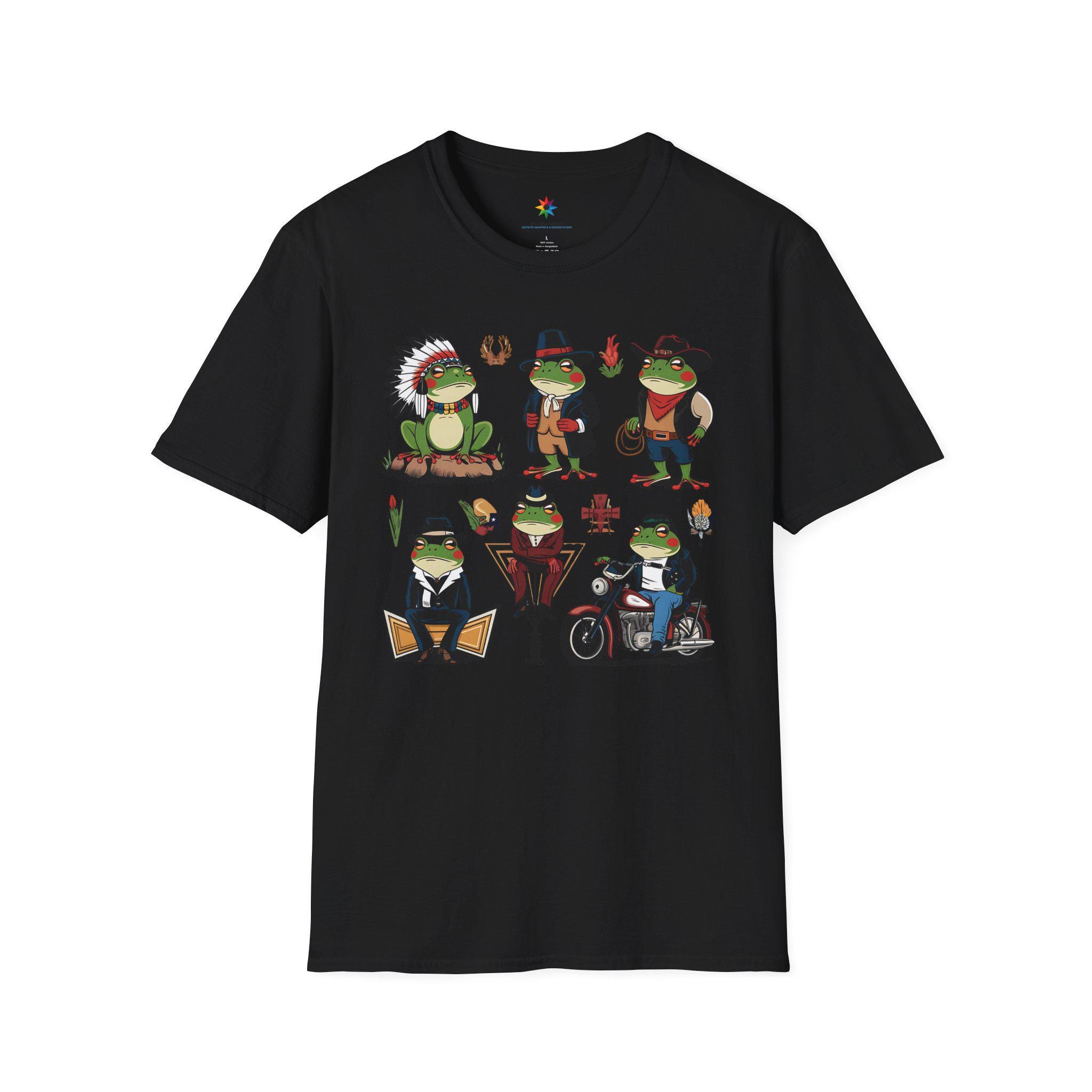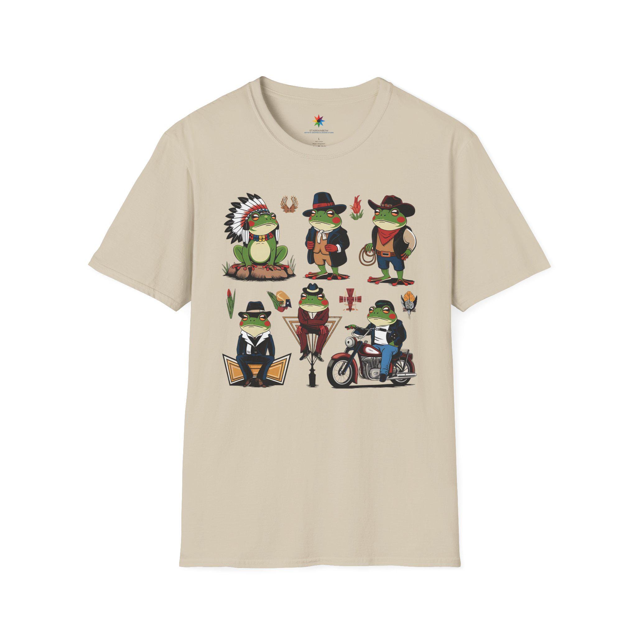 Designed with attention to detail, this retro frog character print showcases frogs dressed as outlaws, cowboys, and indigenous warriors, creating a nostalgic yet fun vibe. Whether you're a proud frog enthusiast or looking for a distinctive gift for a native American frog lover, this shirt is sure to turn heads and spark conversations.