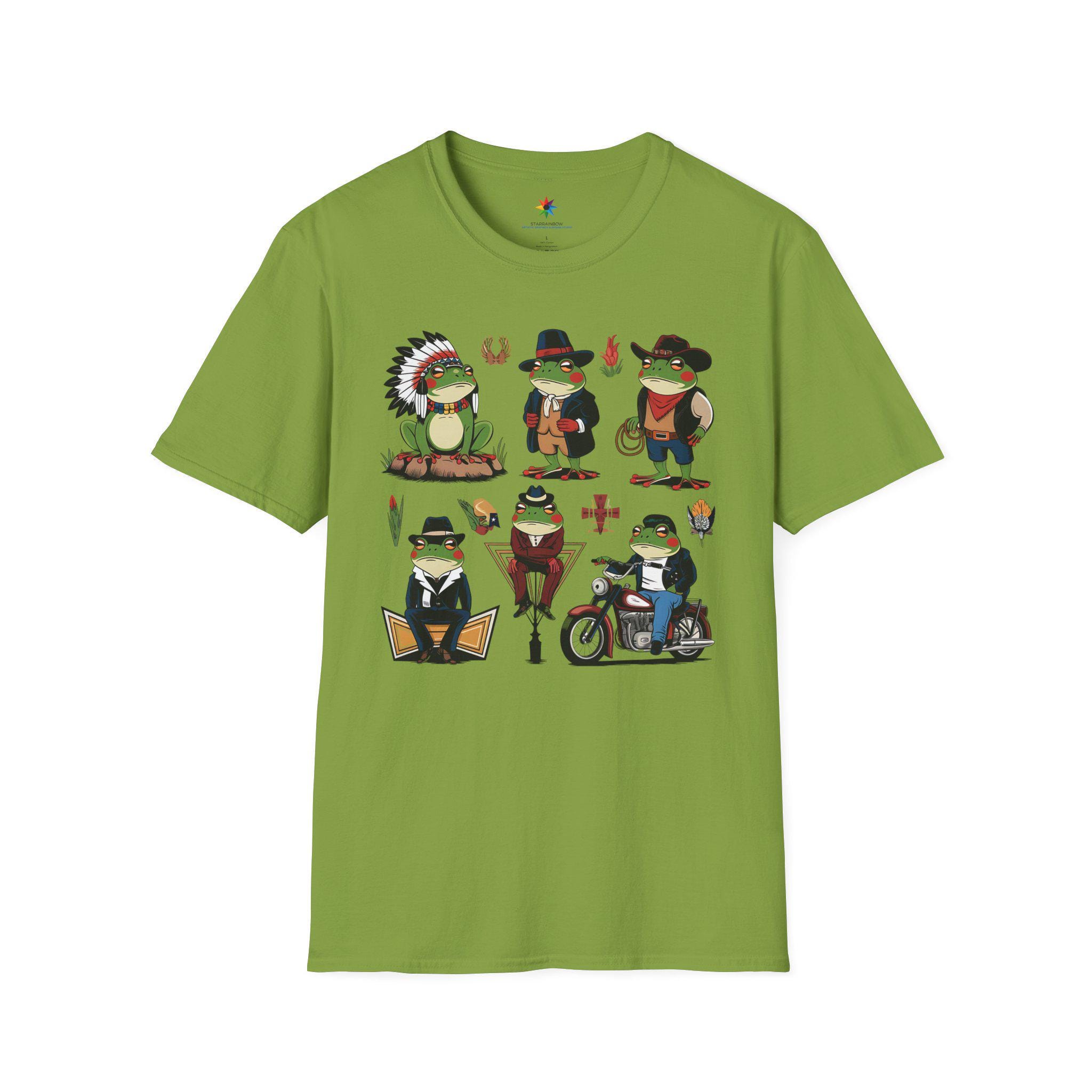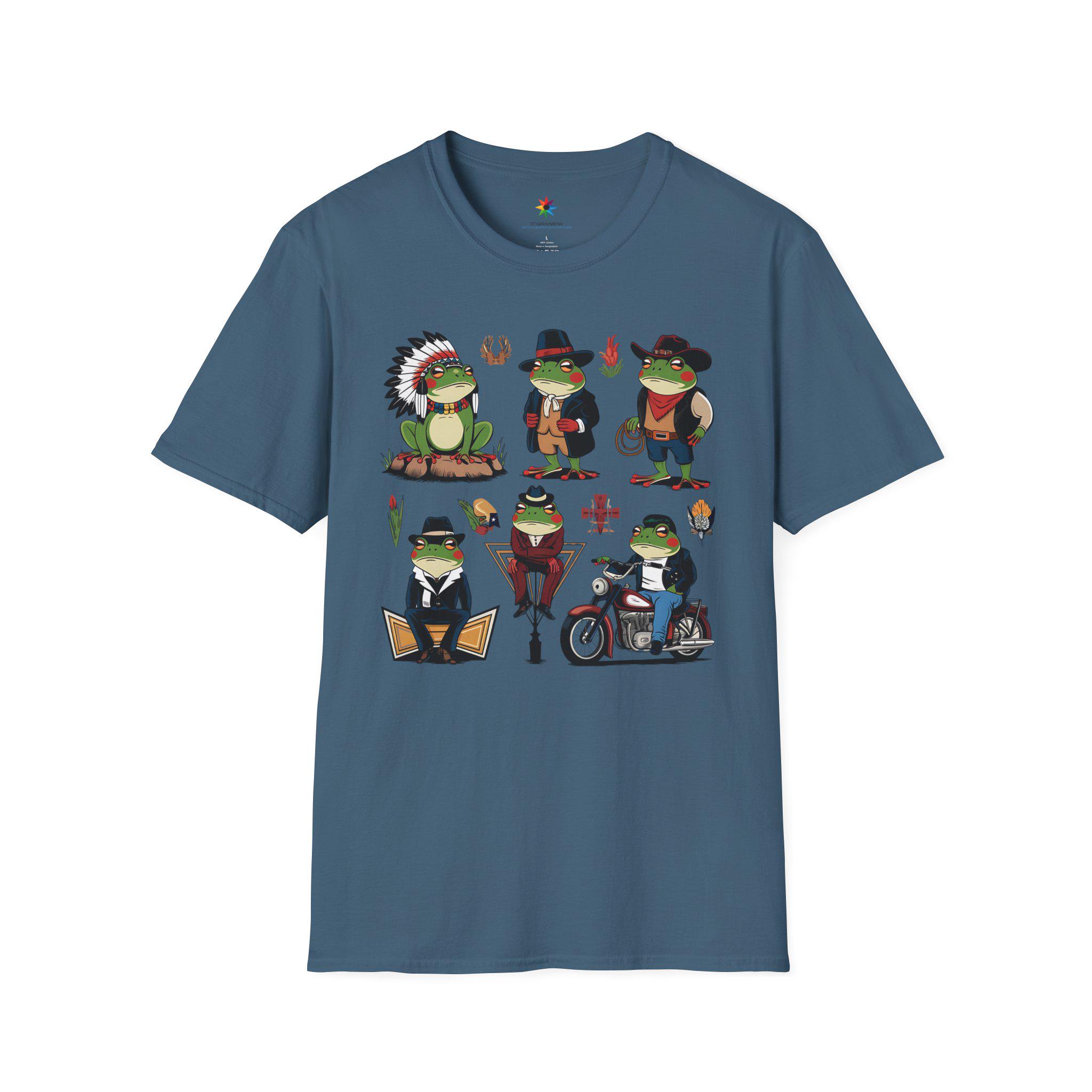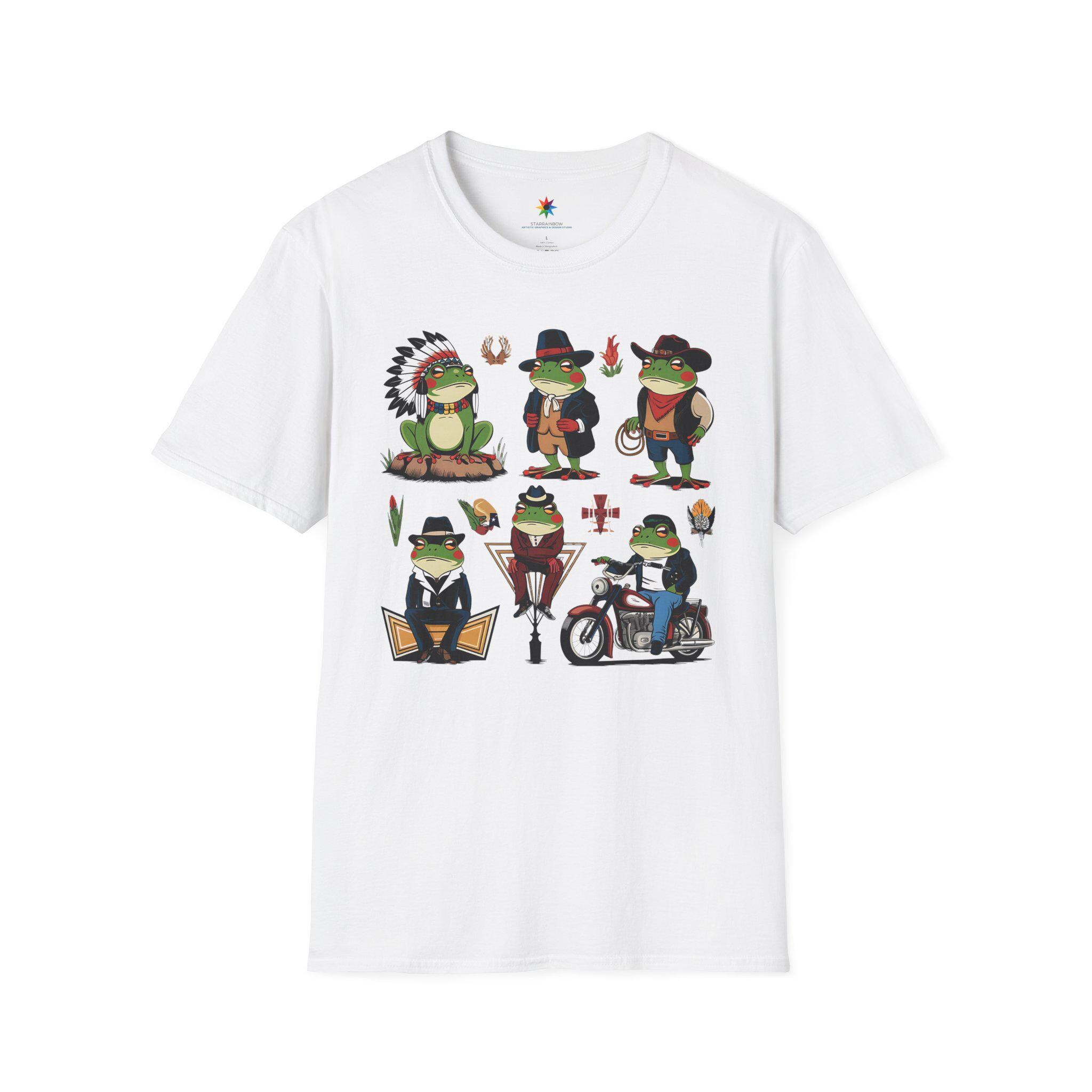 Designed with attention to detail, this retro frog character print showcases frogs dressed as outlaws, cowboys, and indigenous warriors, creating a nostalgic yet fun vibe. Whether you're a proud frog enthusiast or looking for a distinctive gift for a native American frog lover, this shirt is sure to turn heads and spark conversations.