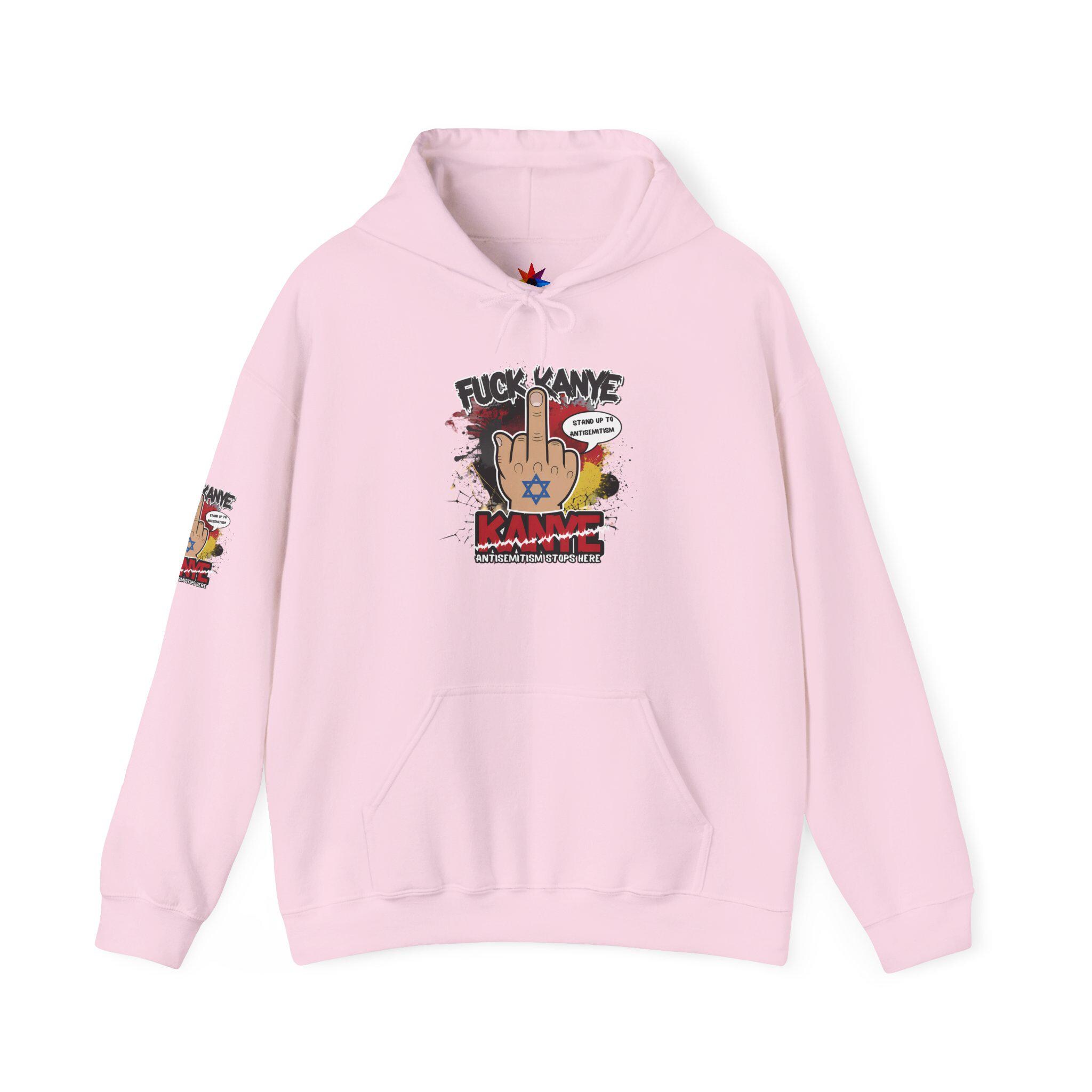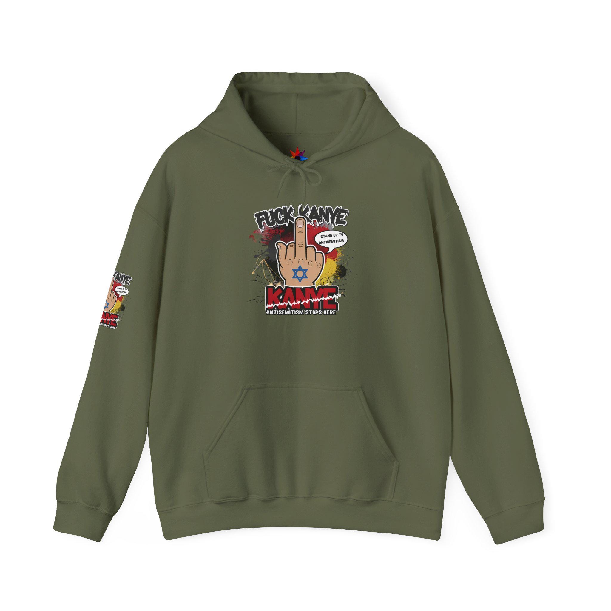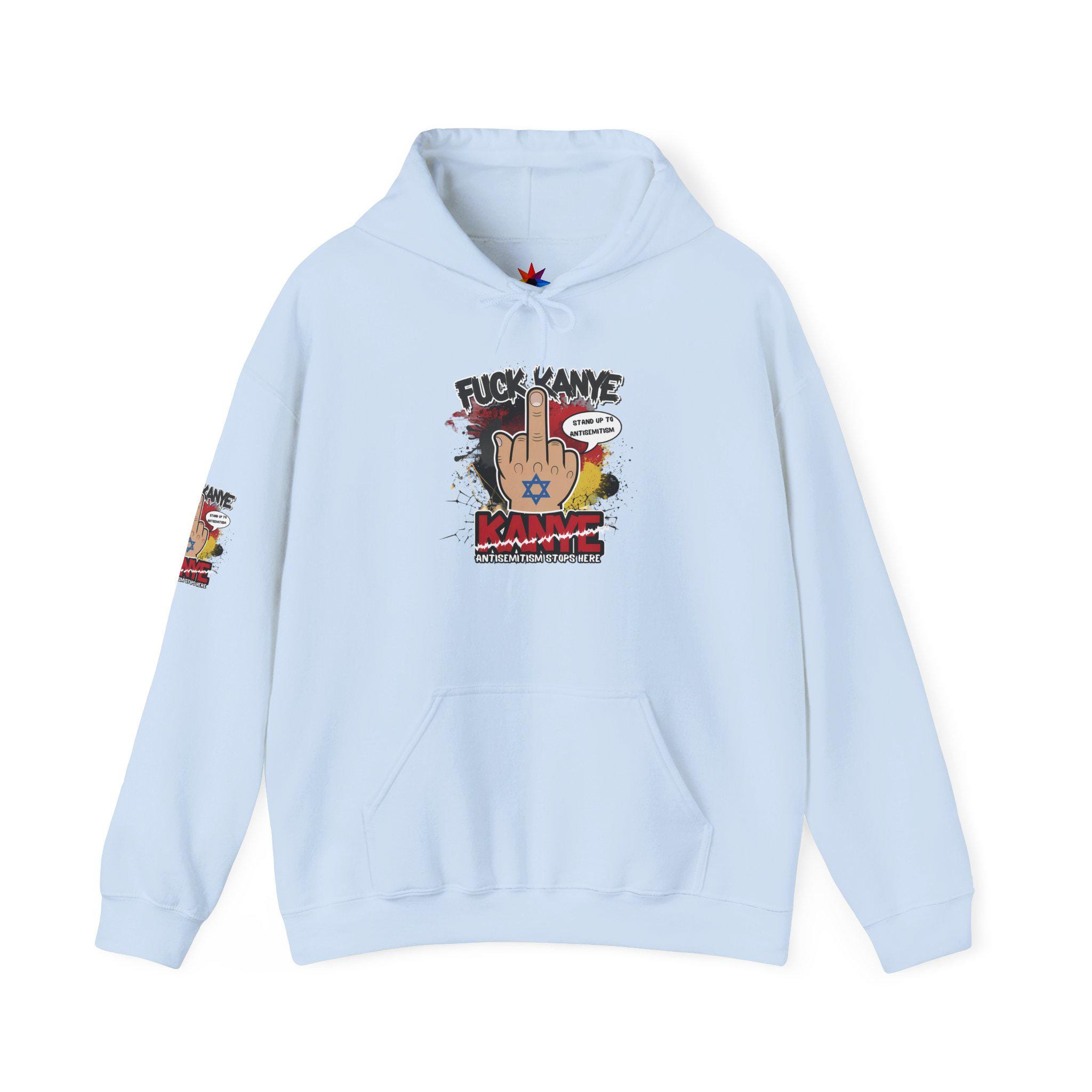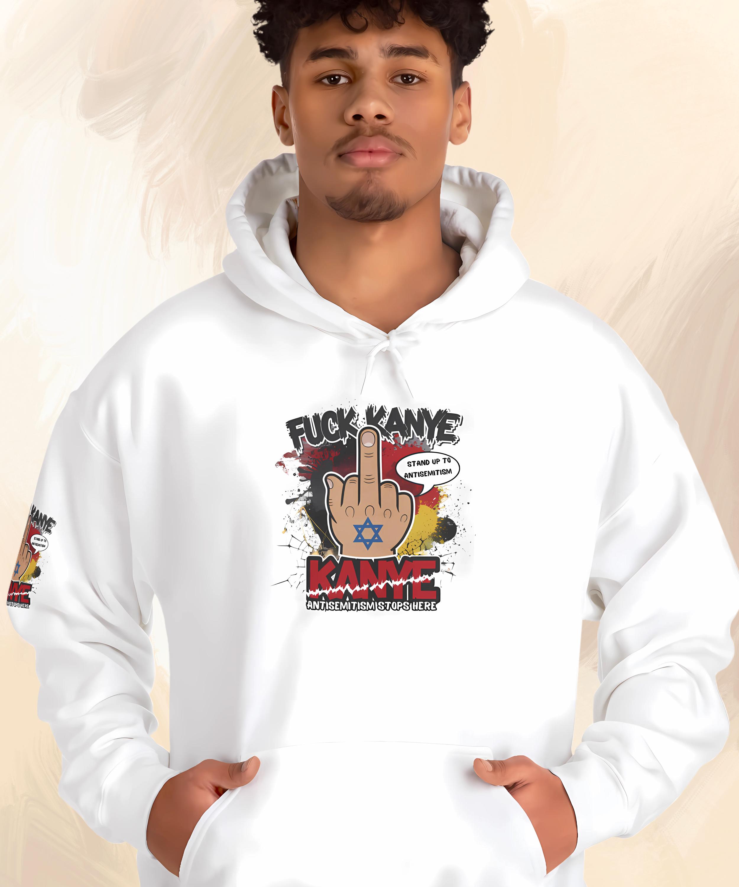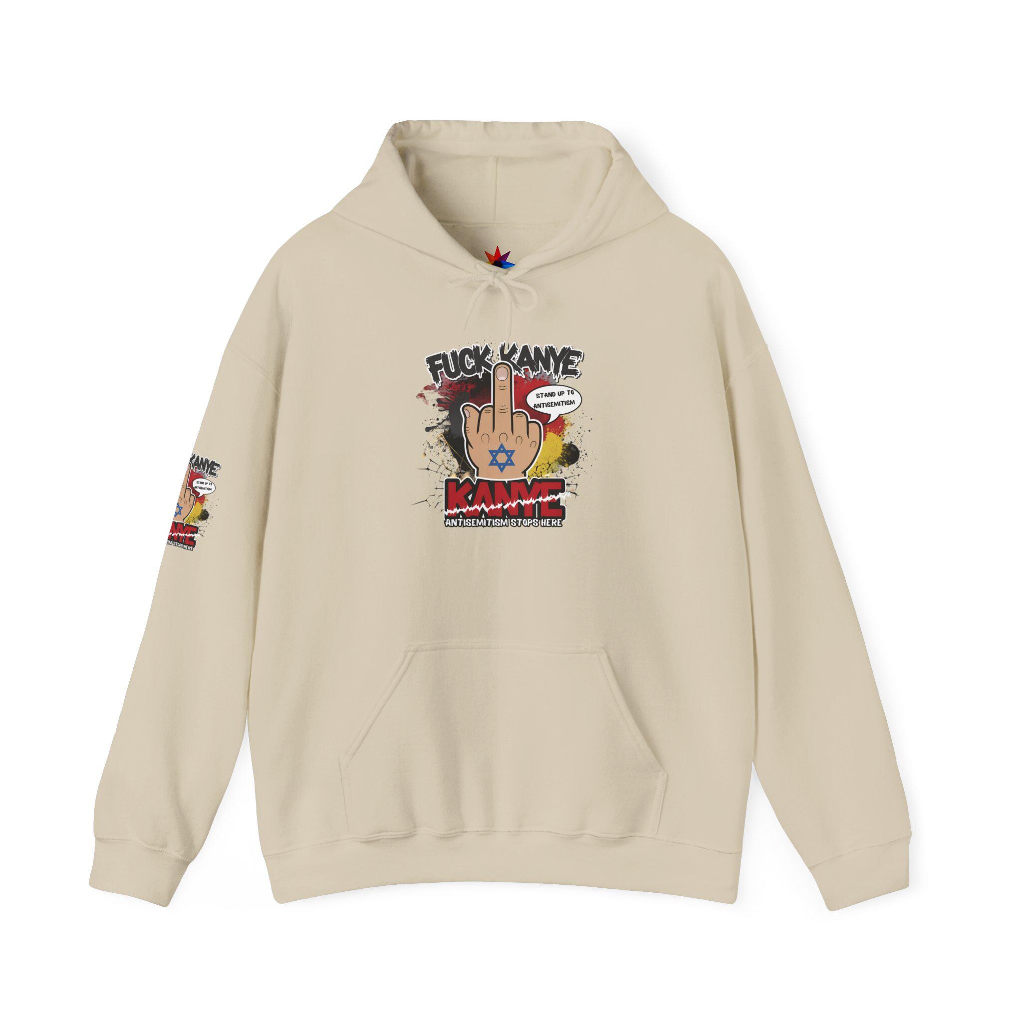 Make a powerful statement with the FUCK KANYE Hoodie Stand Up To Antisemitism Hooded Sweatshirt. Crafted from a premium cotton-polyester blend, this hoodie offers exceptional warmth and comfort, making it perfect for everyday wear or activist events. The bold front design features the striking phrase "FUCK KANYE" alongside the Star of David, symbolizing resilience, strength, and Jewish pride. The hooded sweatshirt also includes an additional tee-style accent on the right sleeve for a unique and stylish look. Available in various sizes, it provides a comfortable regular fit suitable for men and women alike.
