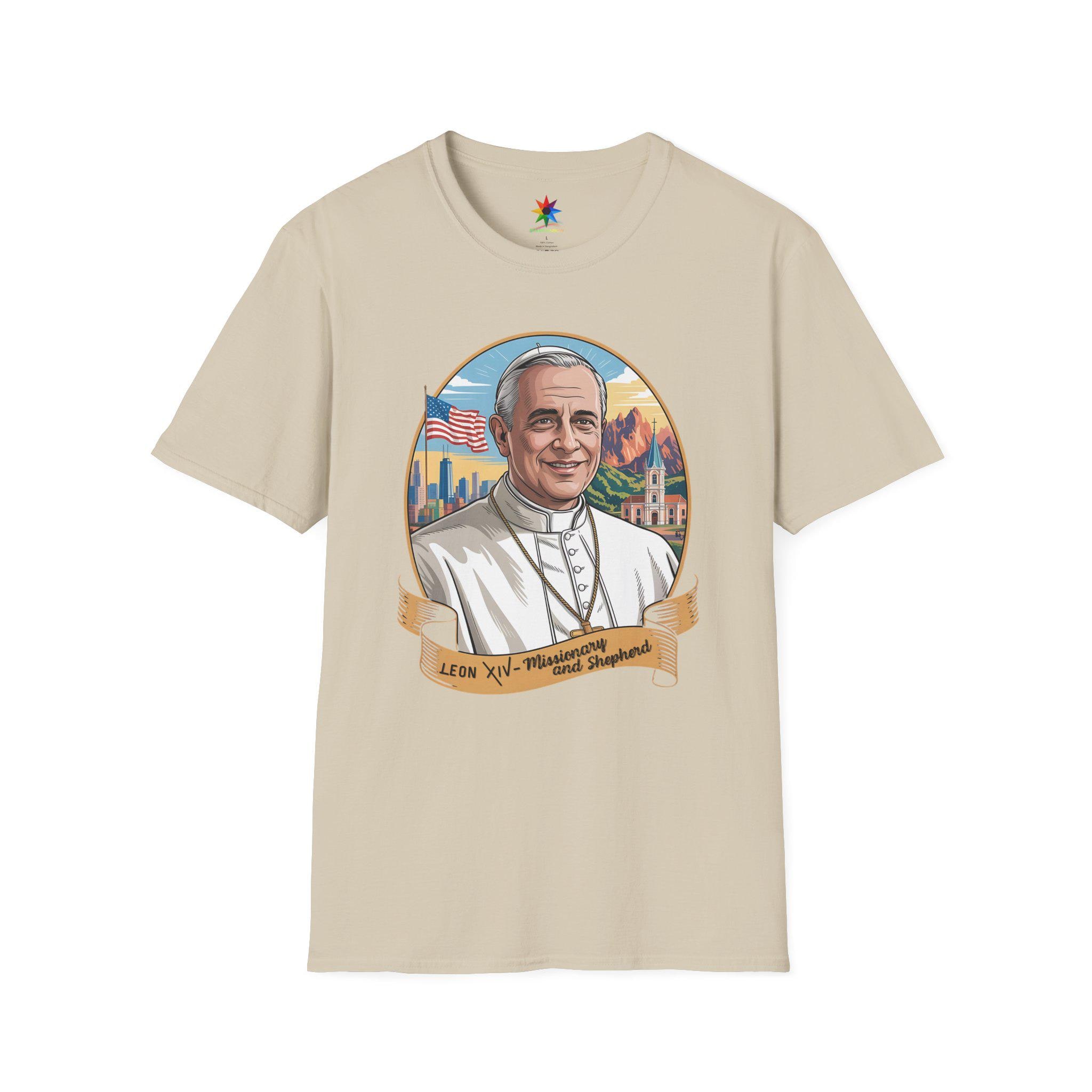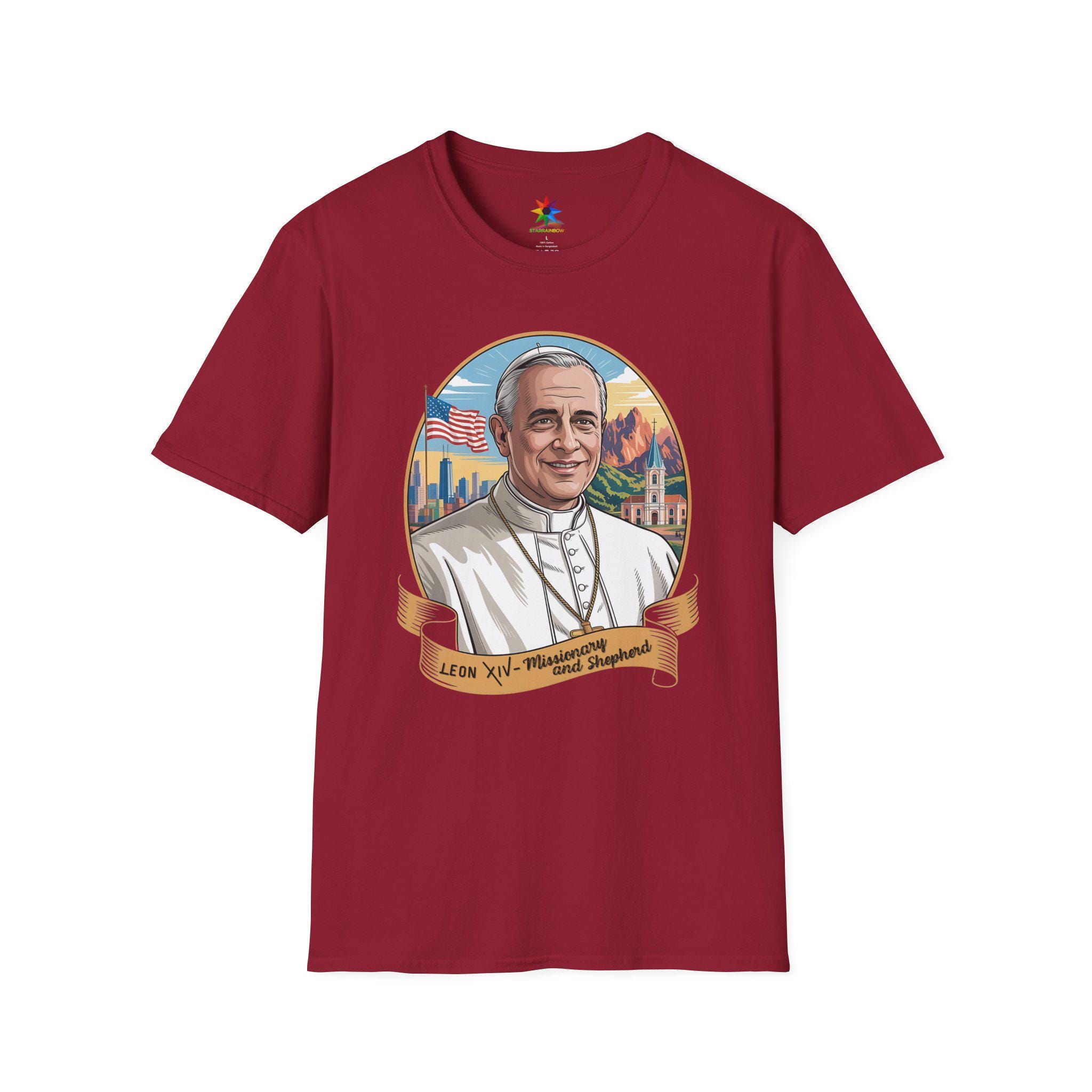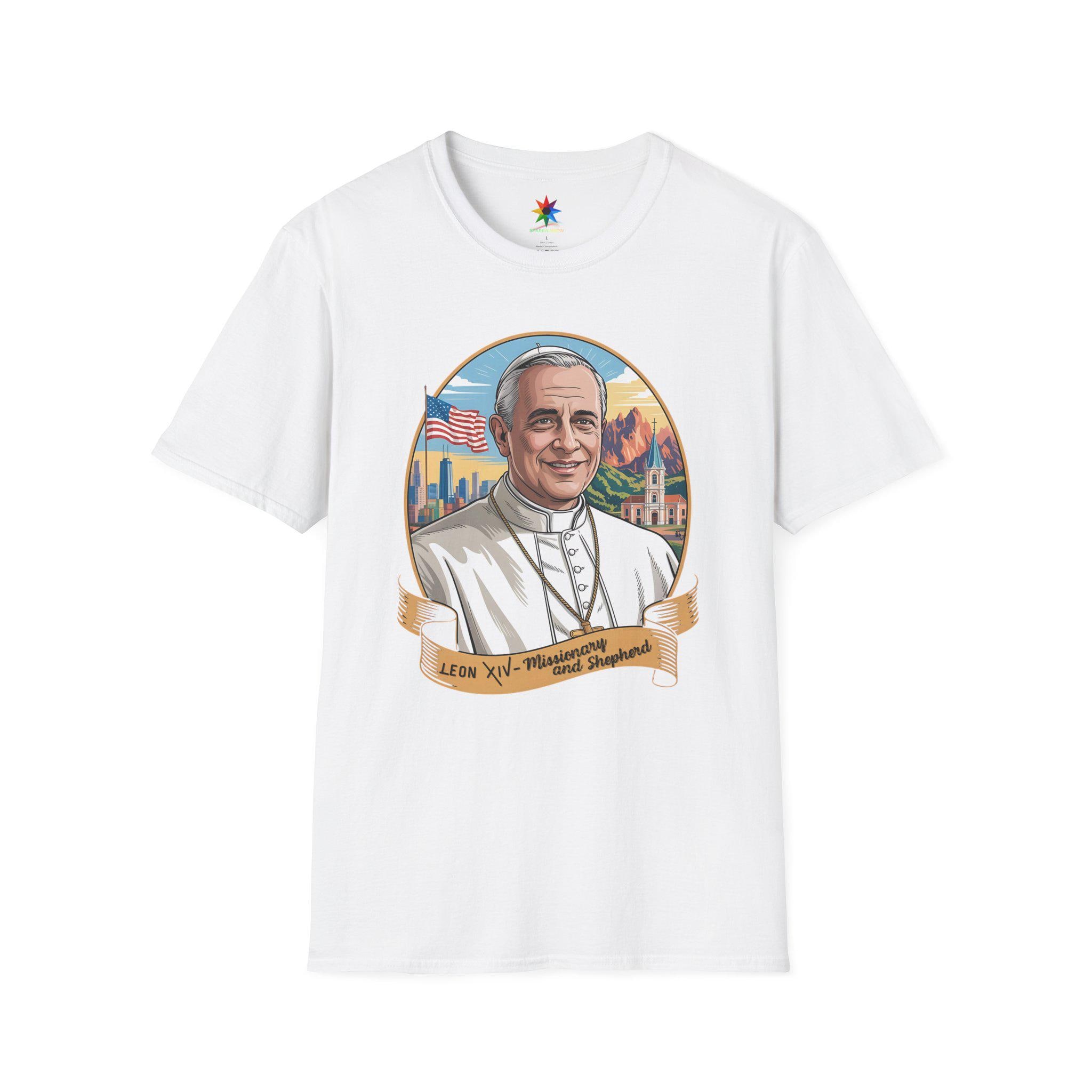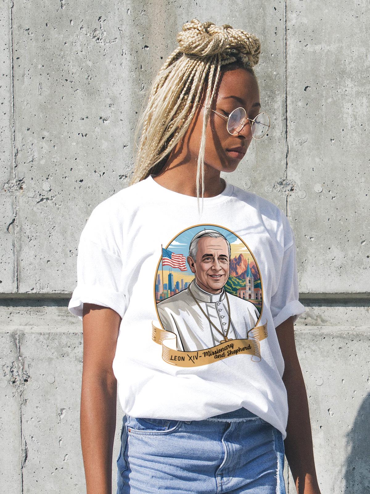 Honor tradition with modern style in this Catholic Pope Portrait Shirt featuring “Leo XVI - Missionary and Shepherd.” Framed by a scenic skyline and subtle USA flag art, this respectful portrait brings heritage to life on a soft, everyday graphic tee. Designed for a comfortable unisex fit, this Christian faith tshirt pairs easily with jeans, chinos, or a cardigan, and makes a thoughtful church pastor gift for any season.