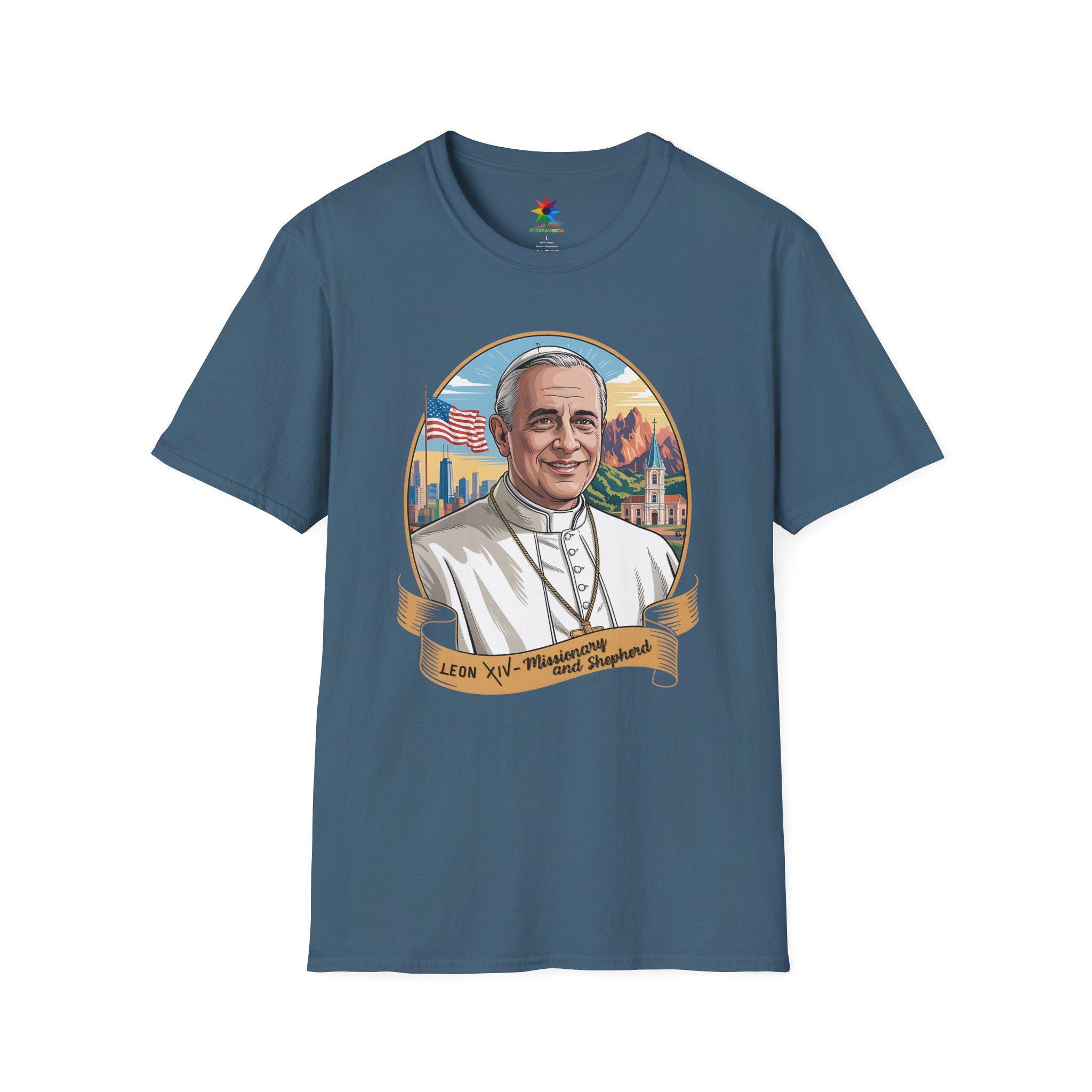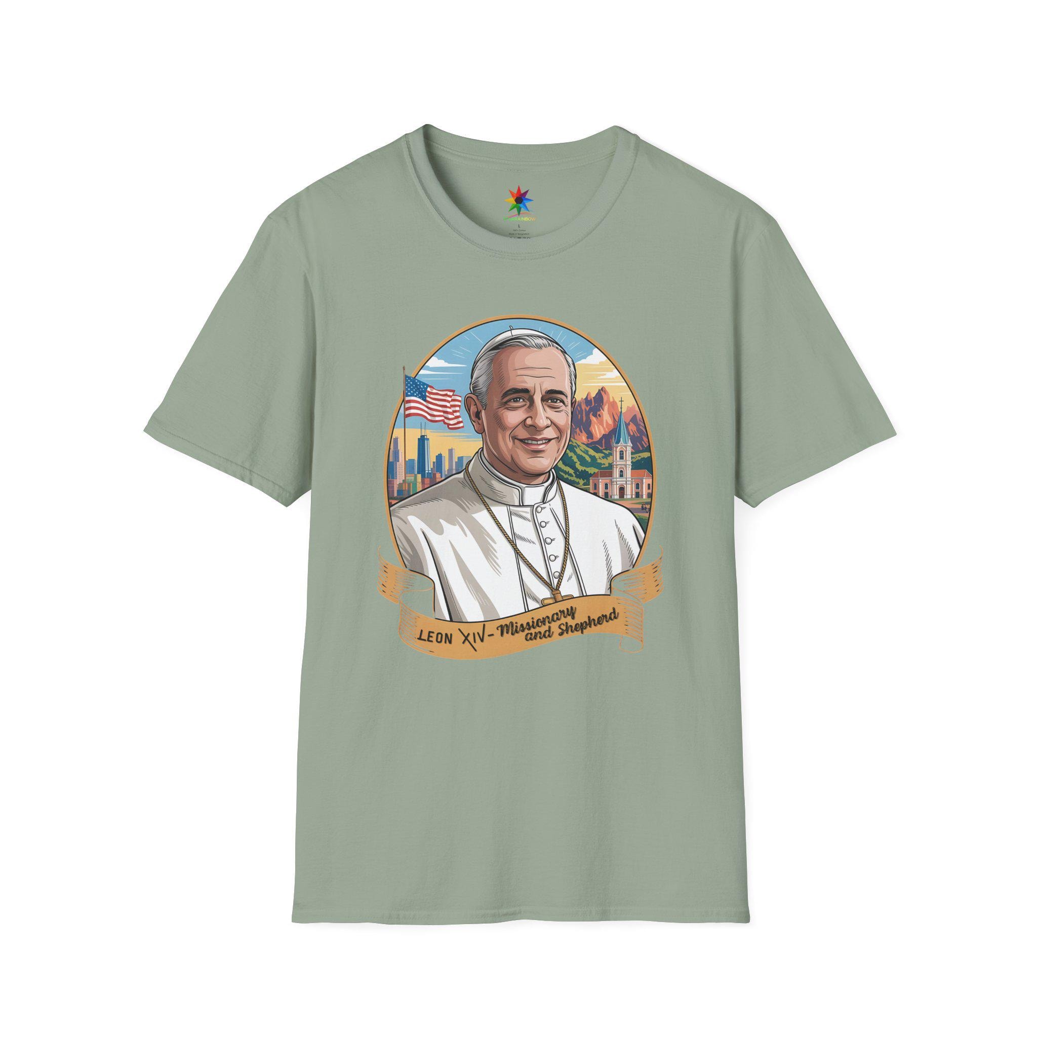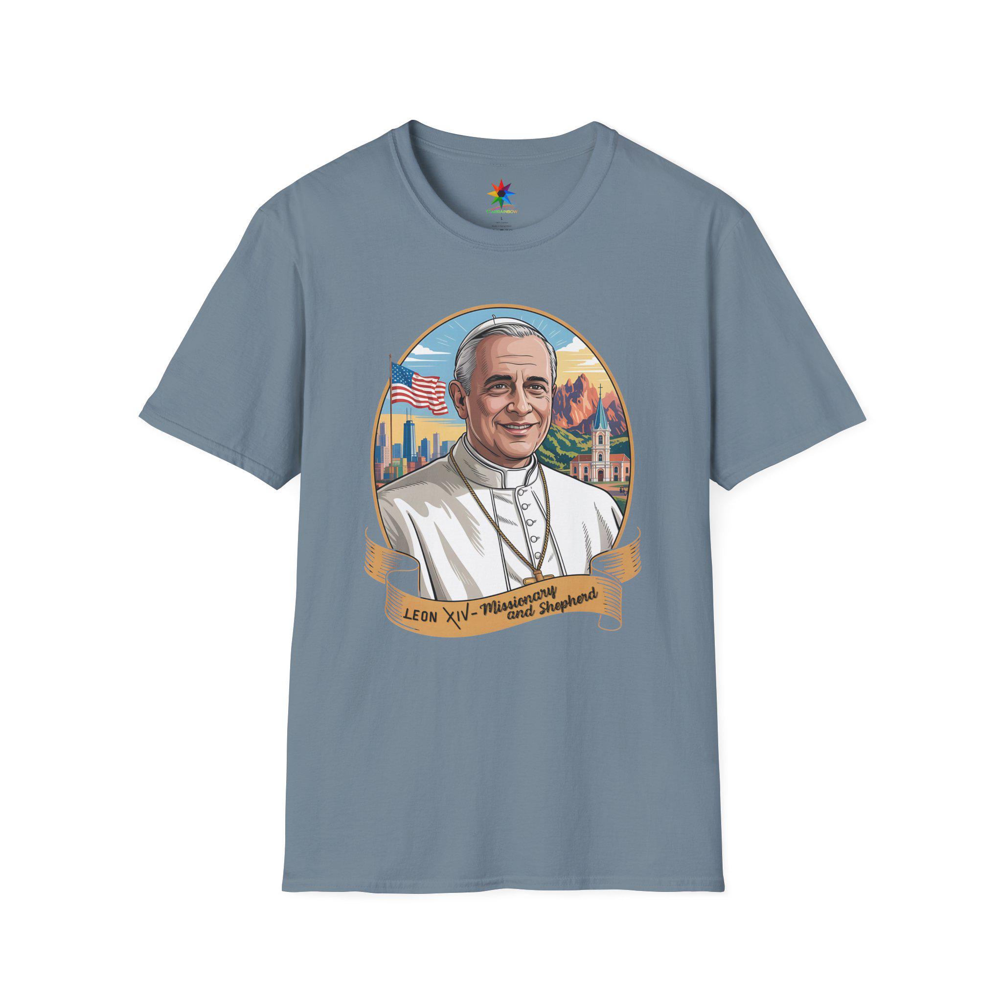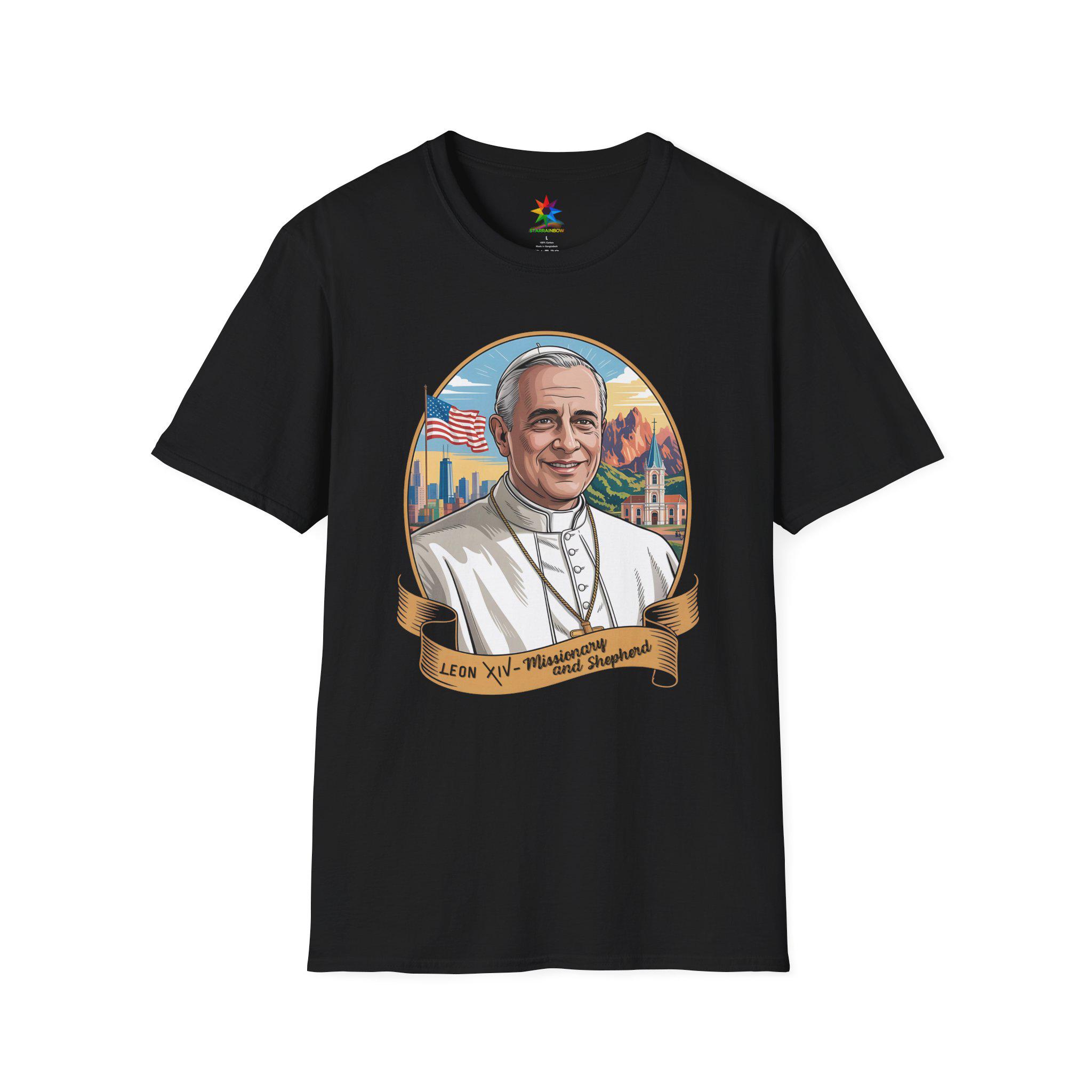 Honor tradition with modern style in this Catholic Pope Portrait Shirt featuring “Leo XVI - Missionary and Shepherd.” Framed by a scenic skyline and subtle USA flag art, this respectful portrait brings heritage to life on a soft, everyday graphic tee. Designed for a comfortable unisex fit, this Christian faith tshirt pairs easily with jeans, chinos, or a cardigan, and makes a thoughtful church pastor gift for any season.