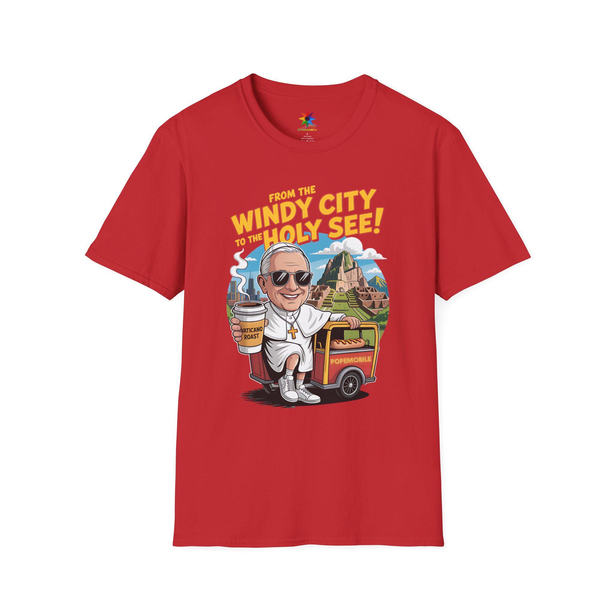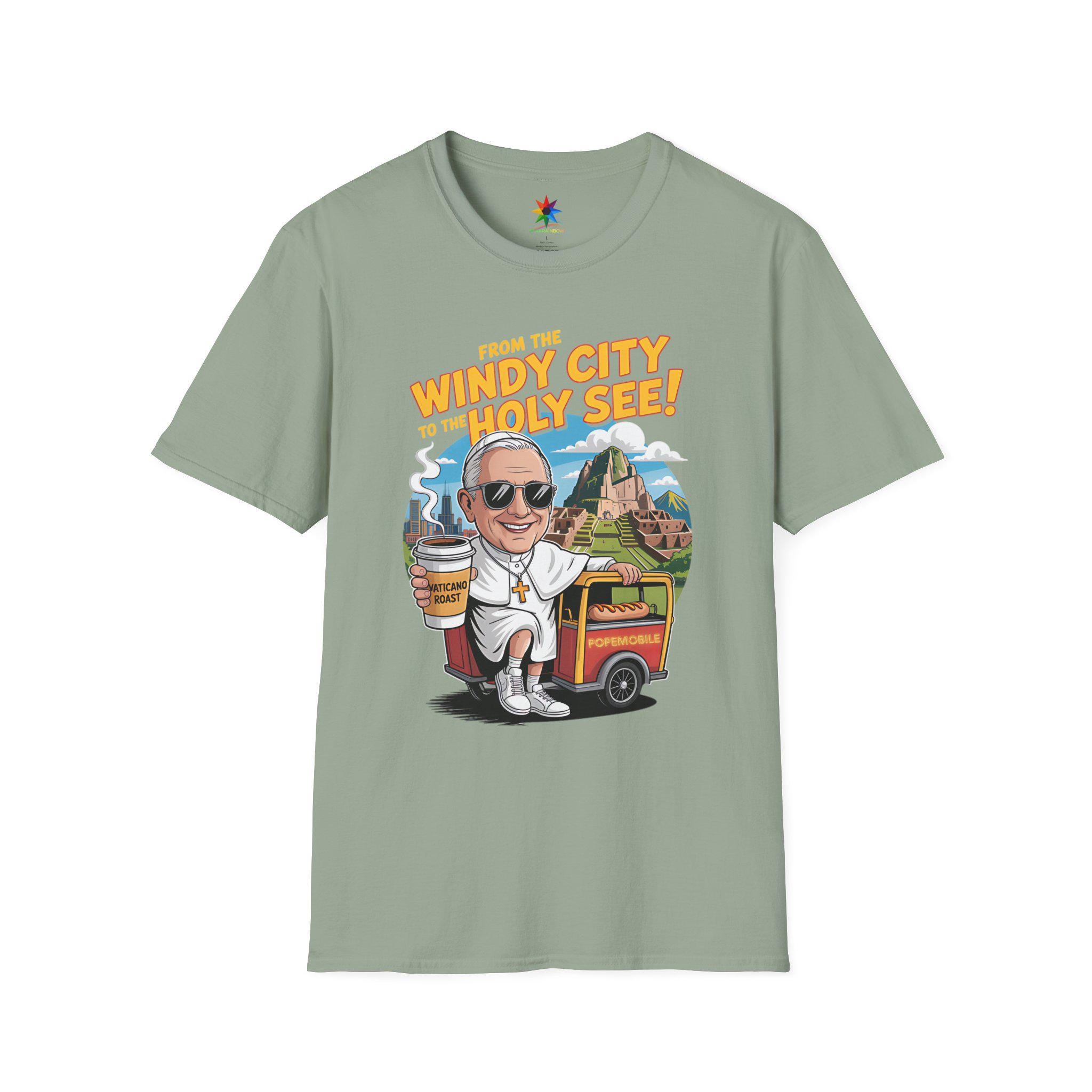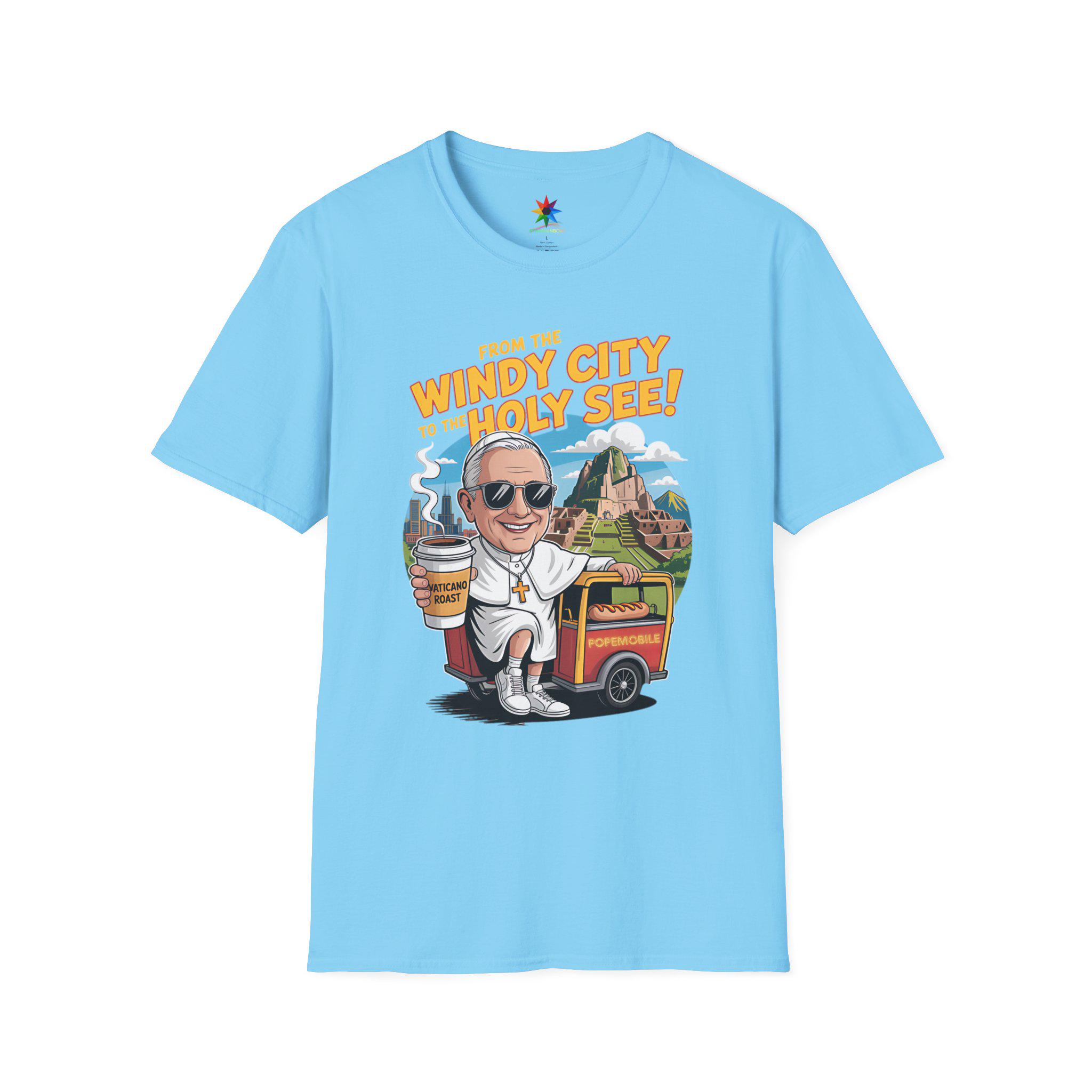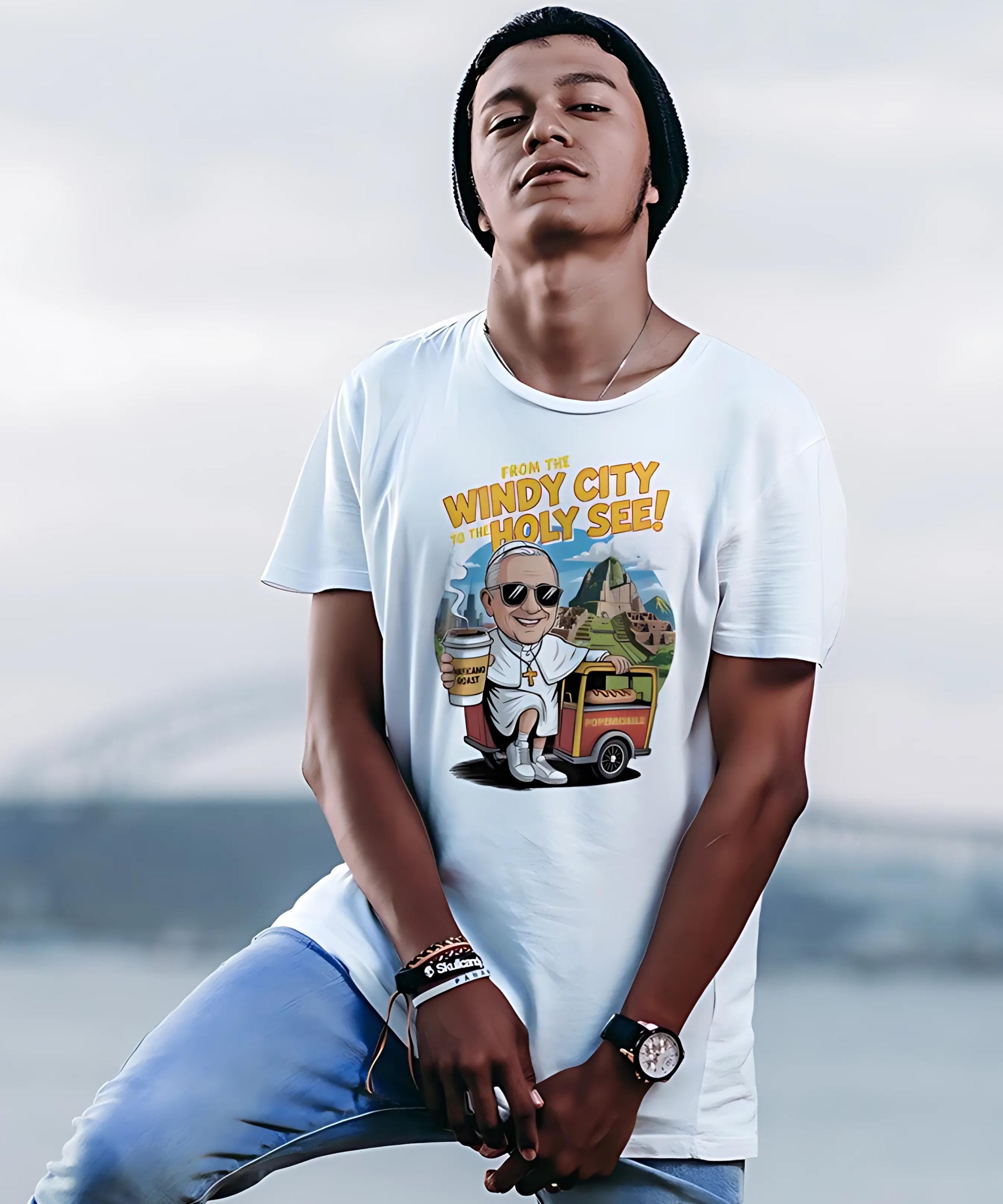 Get ready to laugh from Chicago to the Vatican! This Funny Catholic Pope Leon XIV Comic Shirt features a cool pope sipping his "Vaticano Roast" in style, cruising in a mini Popemobile past the skyline of the Windy City and the ruins of Machu Picchu.
