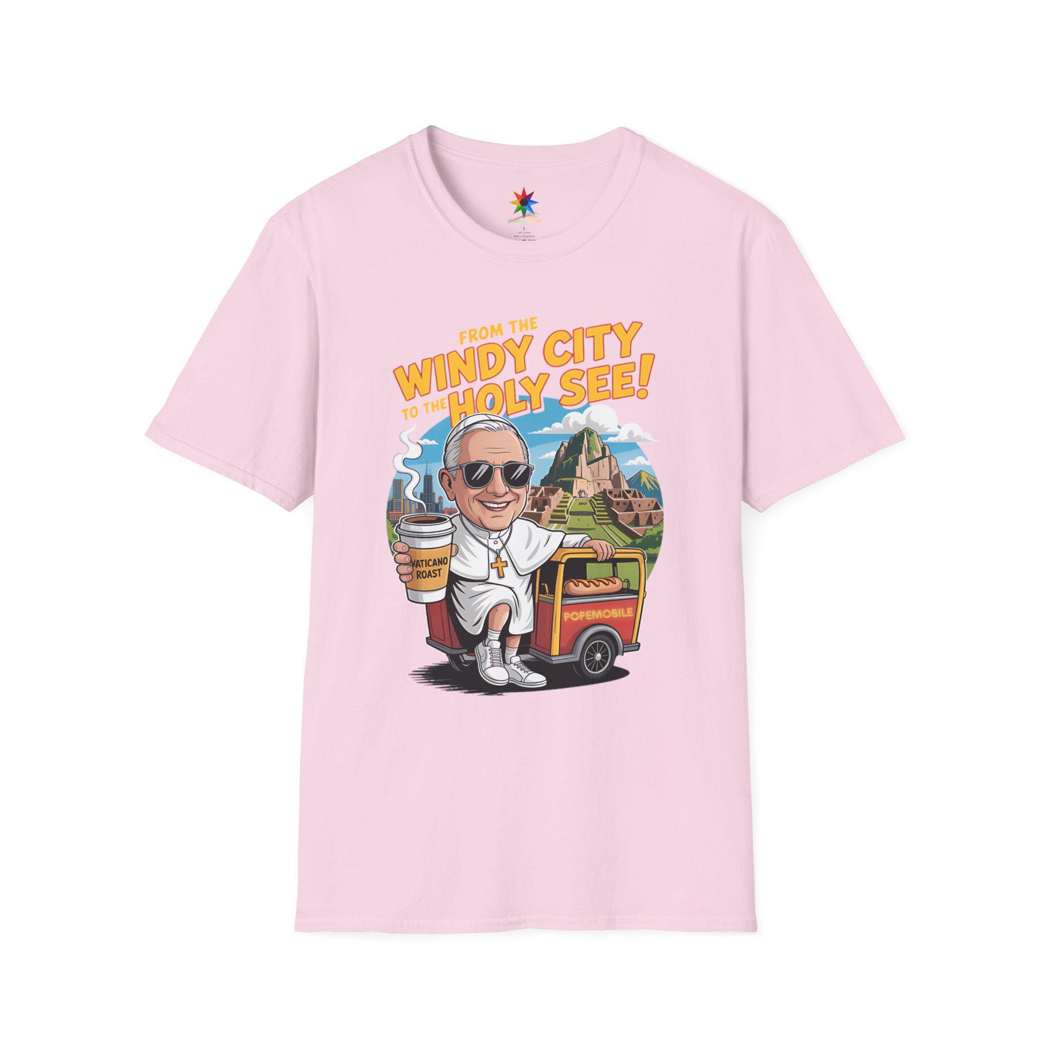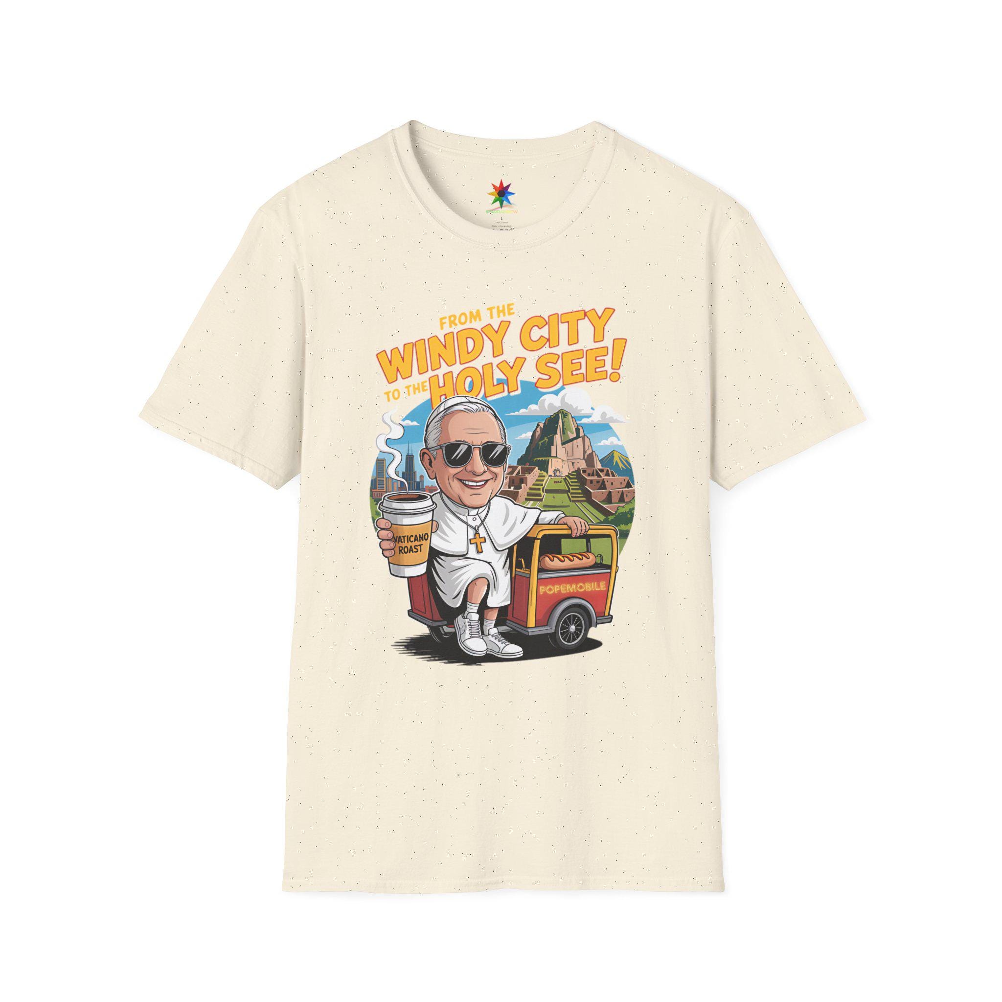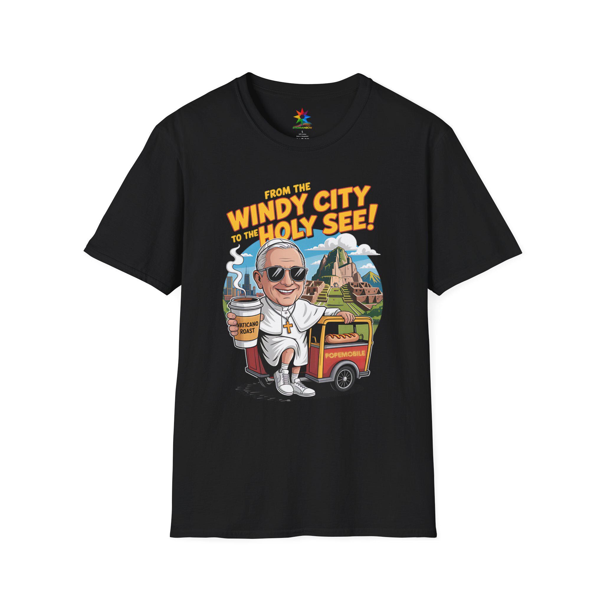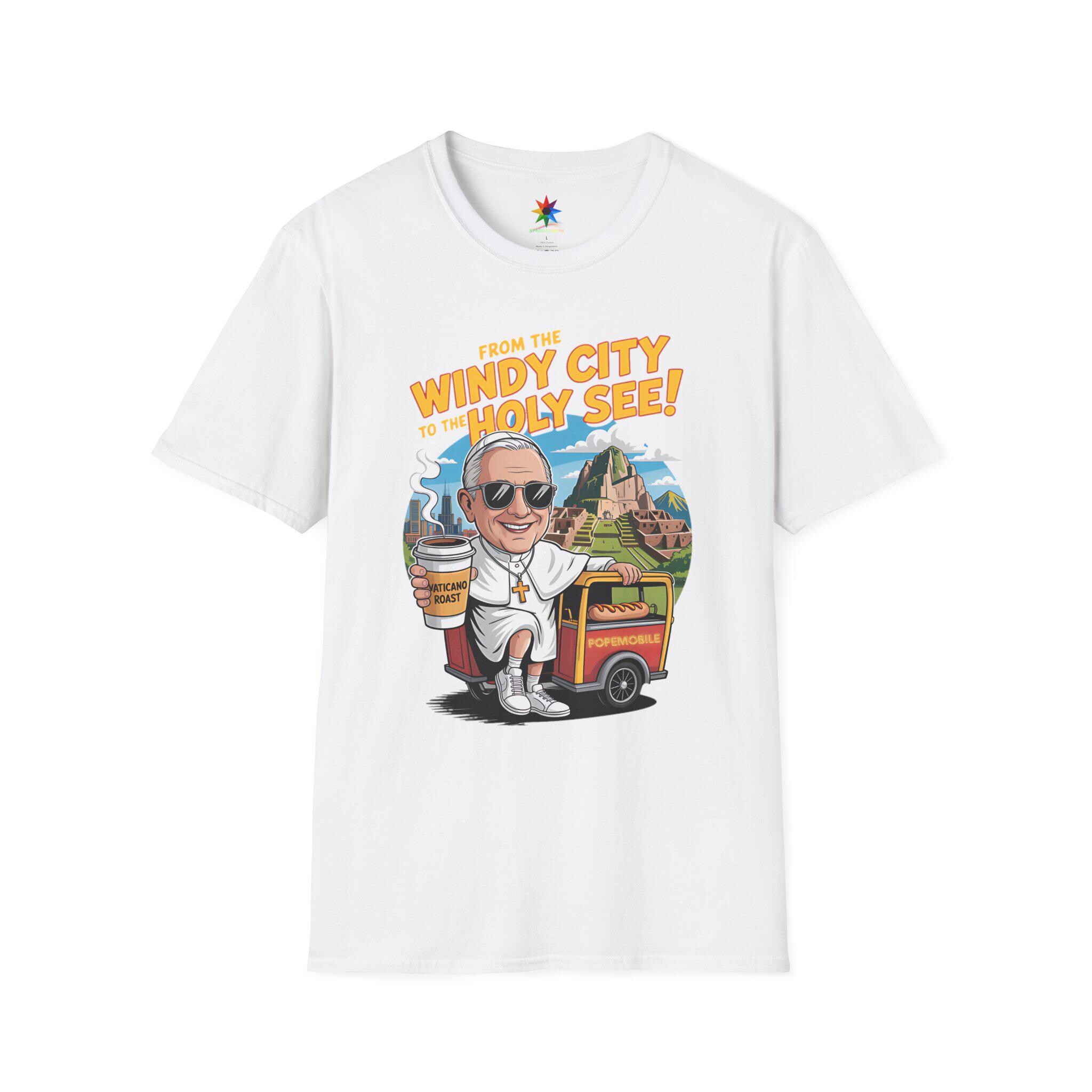 Get ready to laugh from Chicago to the Vatican! This Funny Catholic Pope Leon XIV Comic Shirt features a cool pope sipping his "Vaticano Roast" in style, cruising in a mini Popemobile past the skyline of the Windy City and the ruins of Machu Picchu.