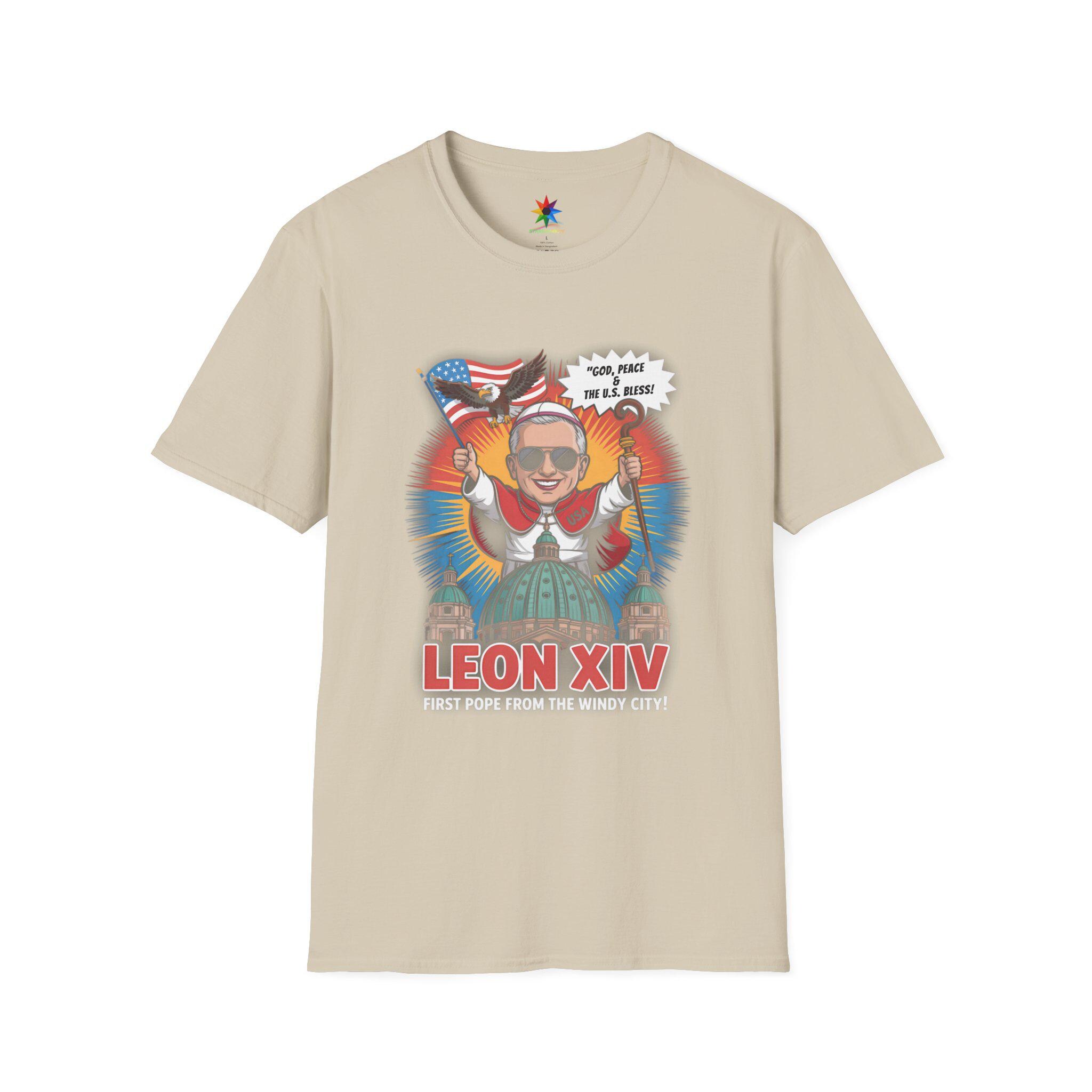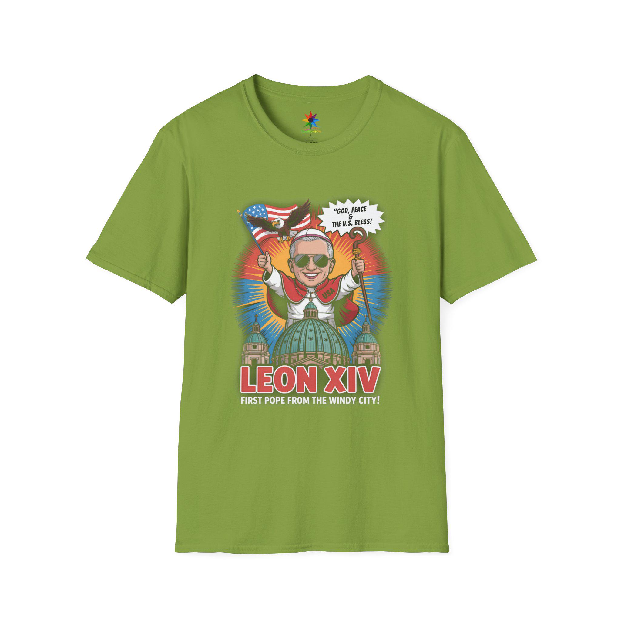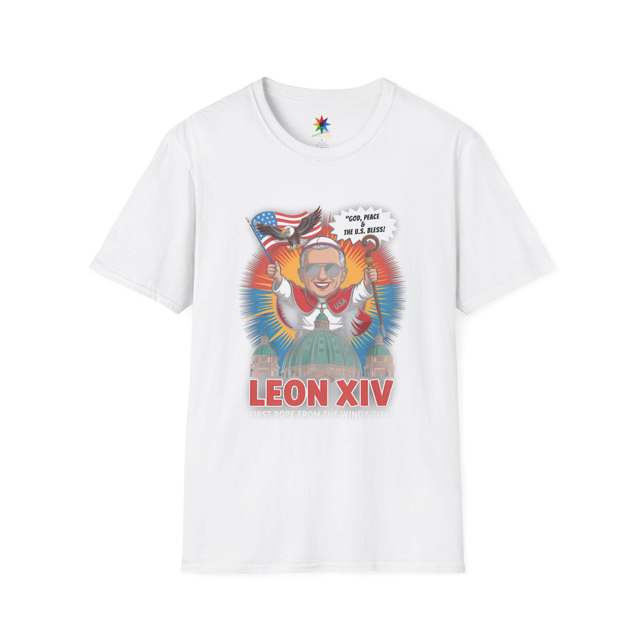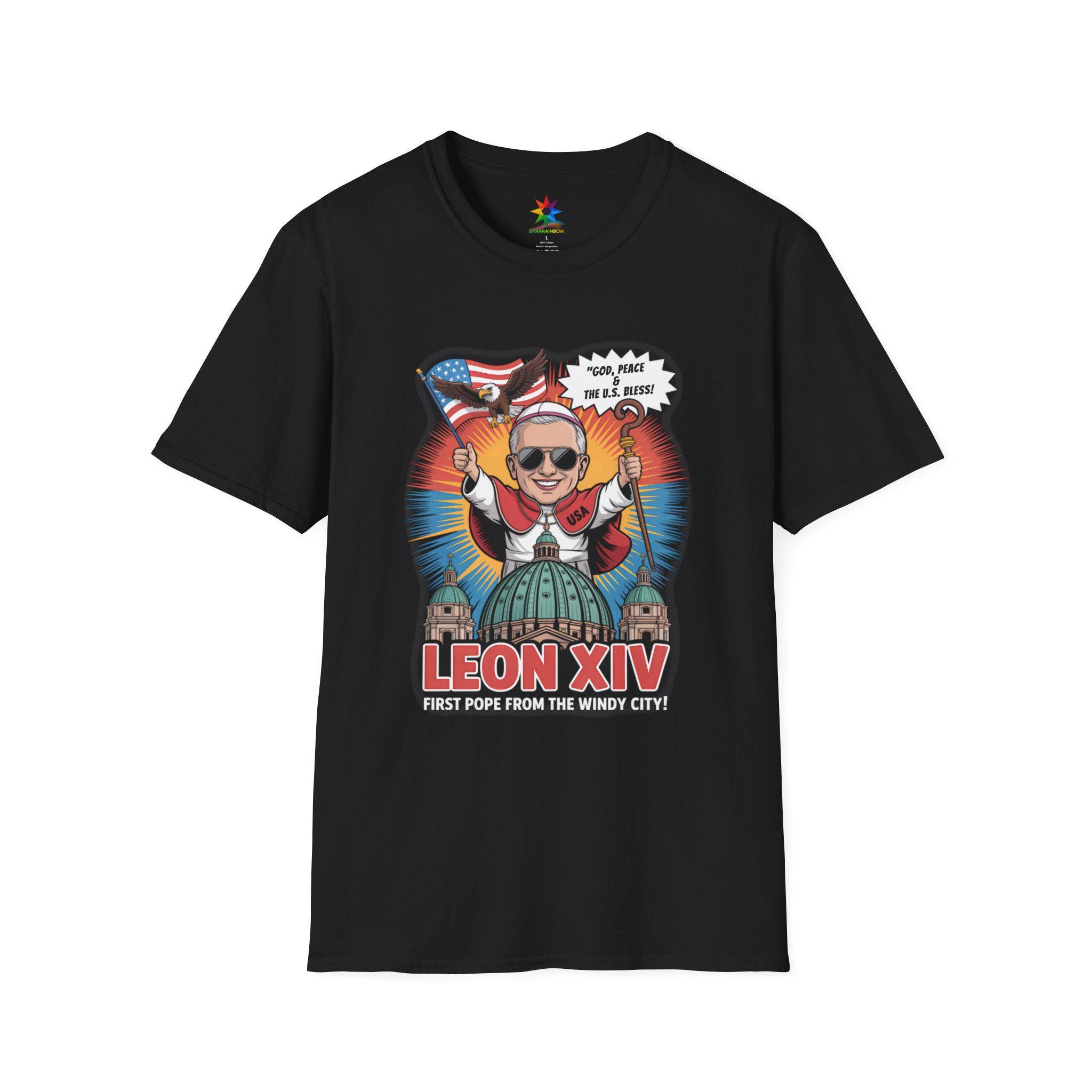 Wearing this windy city pope shirt, you're repping not just Chicago pride but also a humorous take on the Vatican itself. It’s more than just a vatican humor t-shirt – it’s a celebration of peace, freedom, and spirituality with a uniquely American flair. Featuring a smiling Pope Leo XIV, rocking aviators and waving the U.S. flag, the shirt boldly proclaims: "God, Peace & the U.S. Bless!"