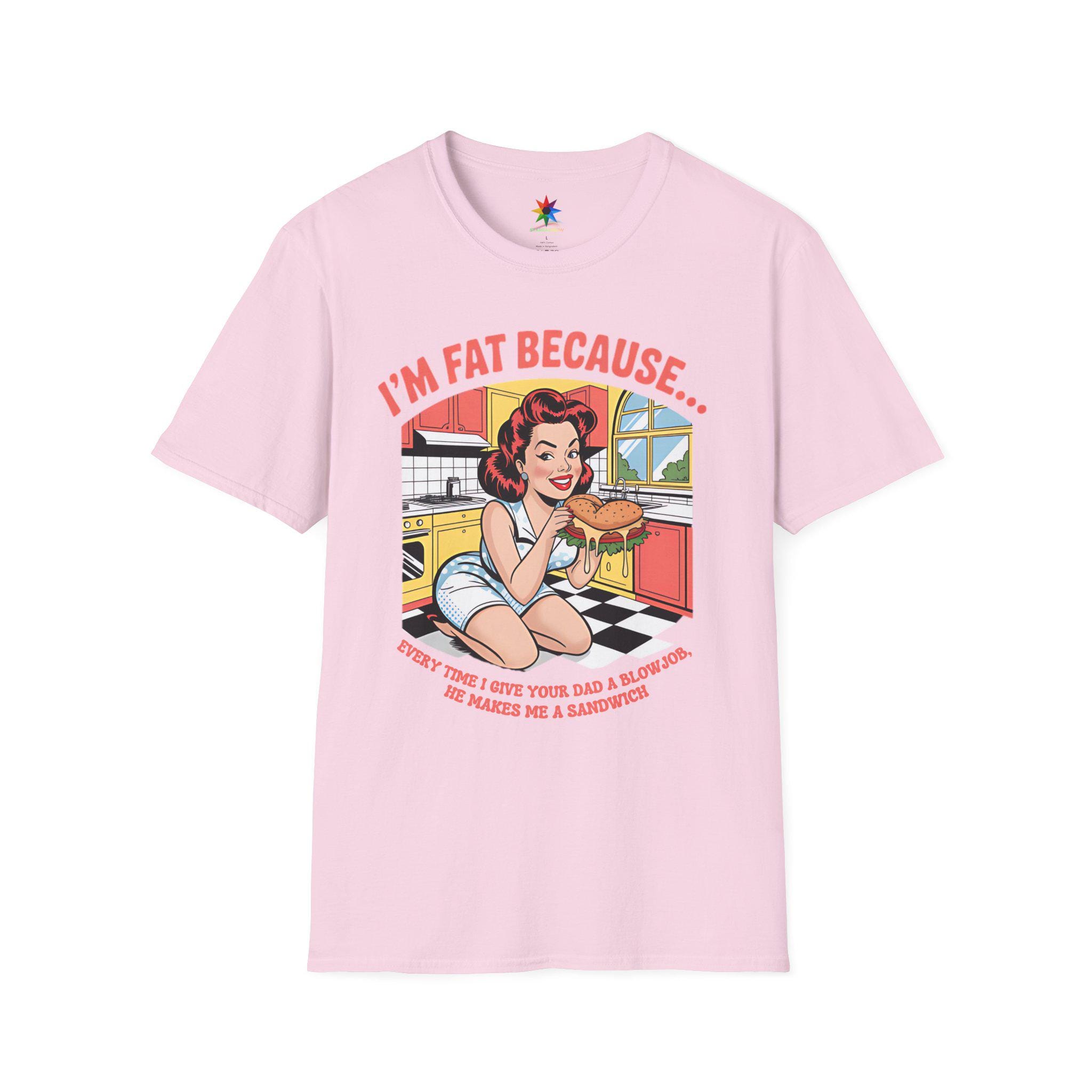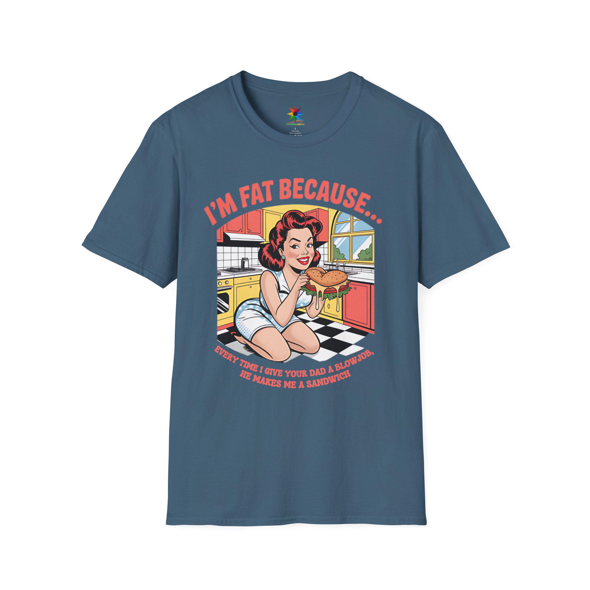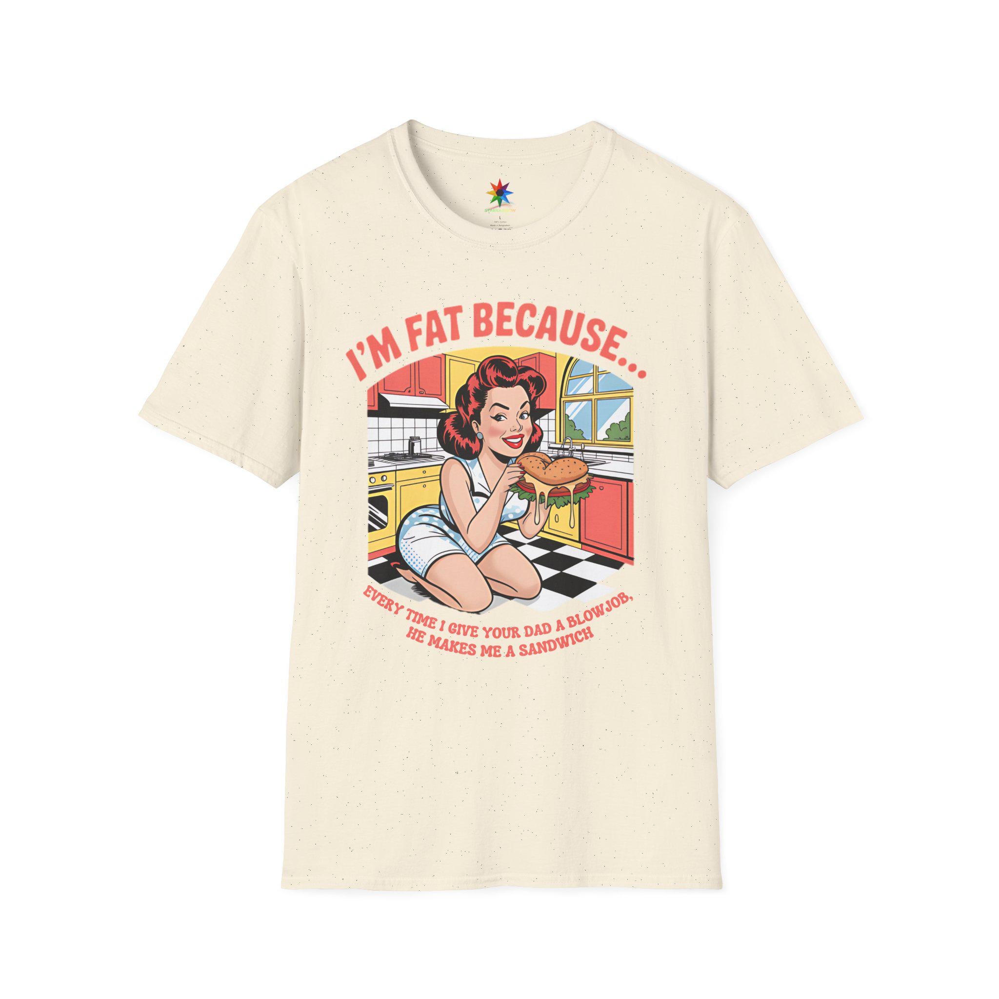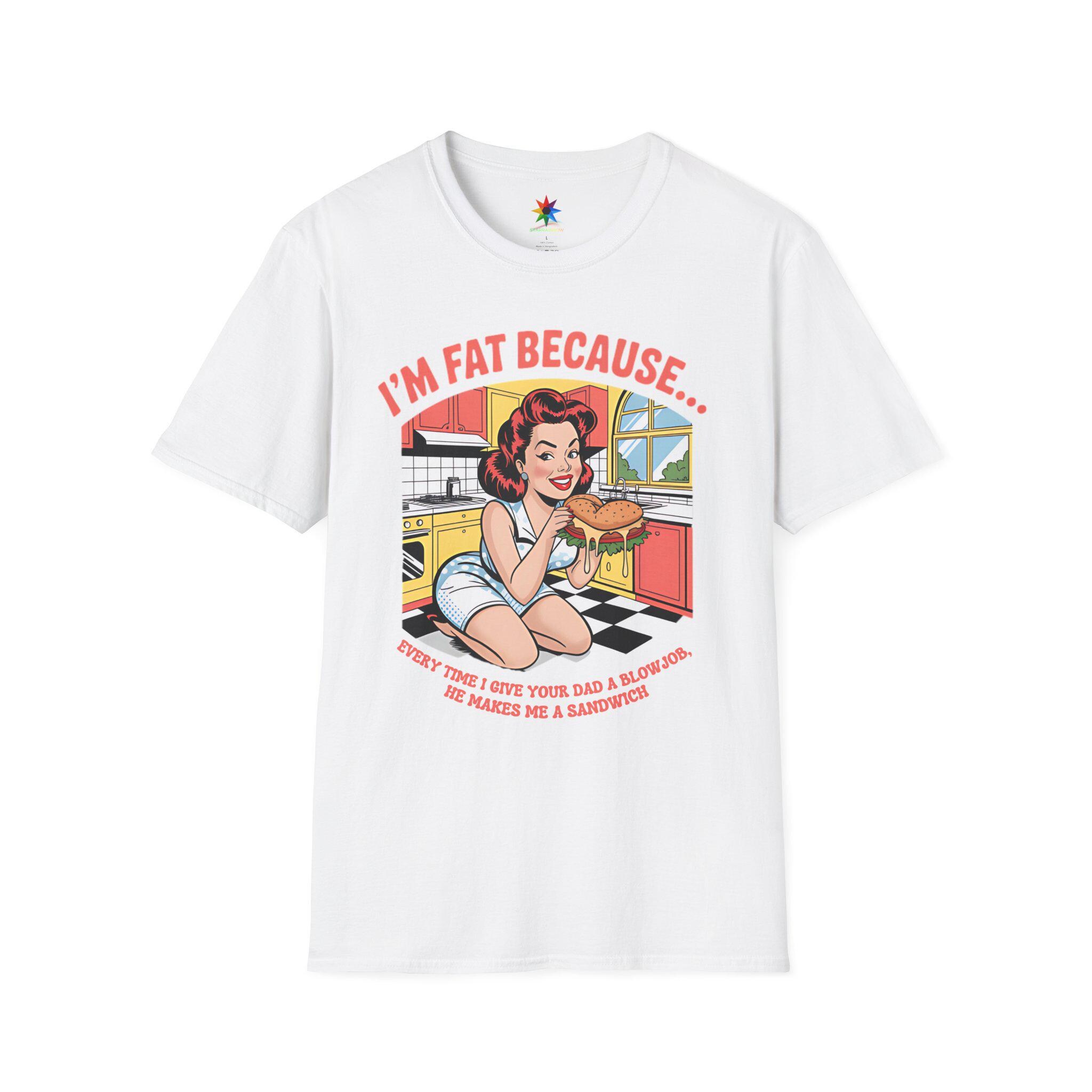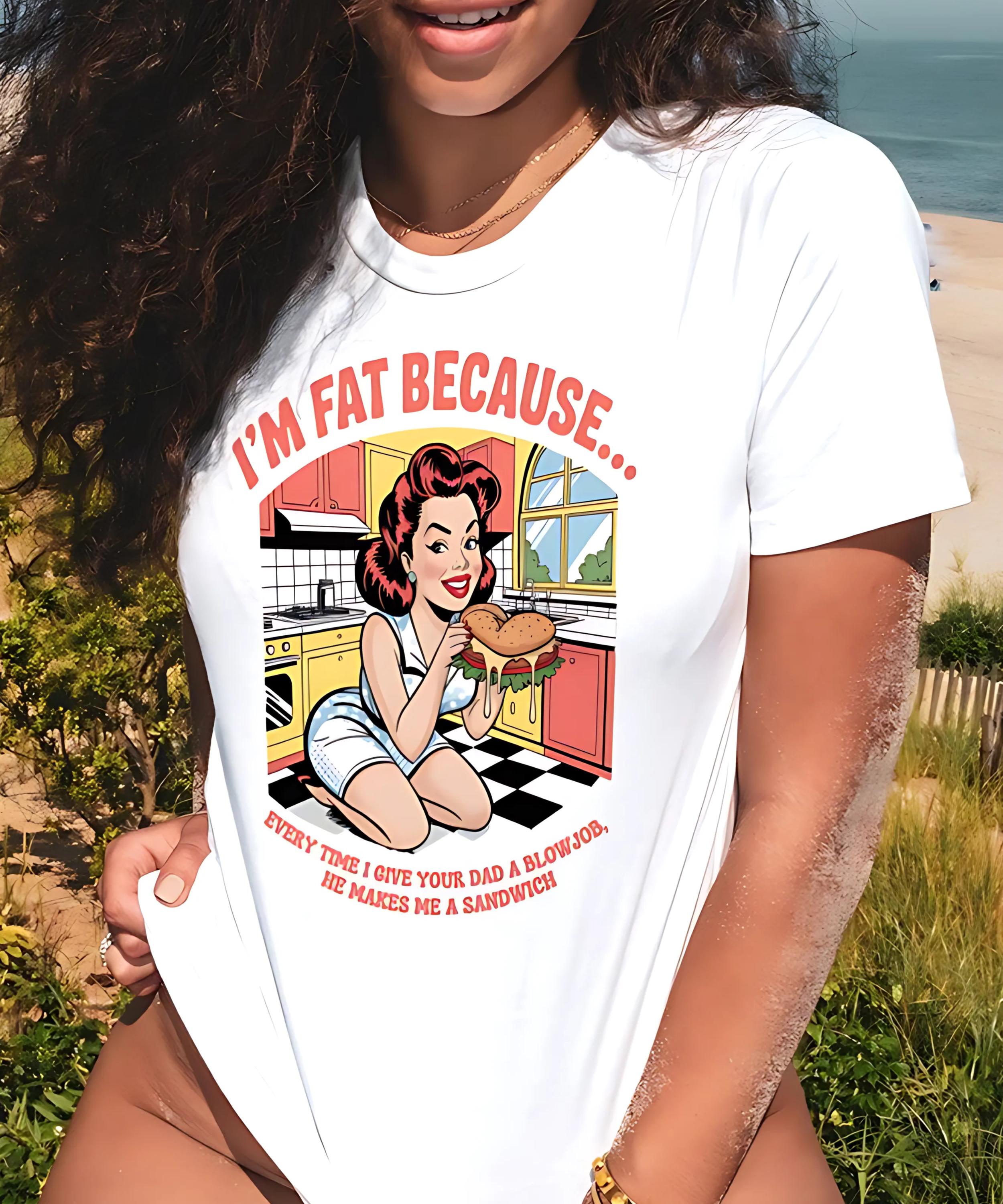 Step back into the cheeky charm of the 1950s with this funny retro shirt that blends vintage comic book style with outrageously bold humor. Featuring a vibrant pin-up girl t-shirt design, this tee proudly declares: “I'm Fat Because Every Time I Give Your Dad a Blowjob, He Makes Me a Sandwich.” For those who dare to go even edgier, we also offer a version that reads: “Every Time I Fuck Your Dad, He Makes Me a Sandwich.”*