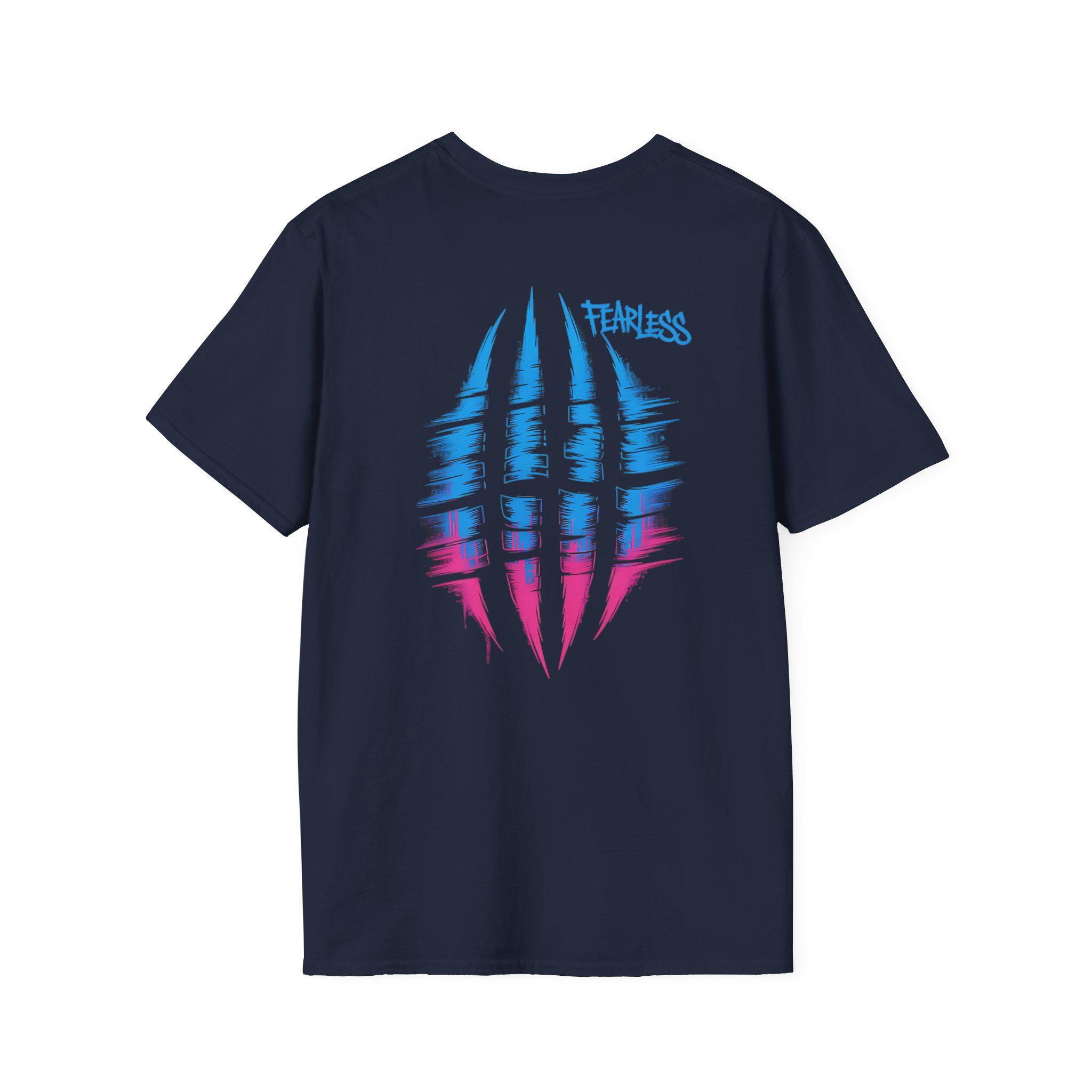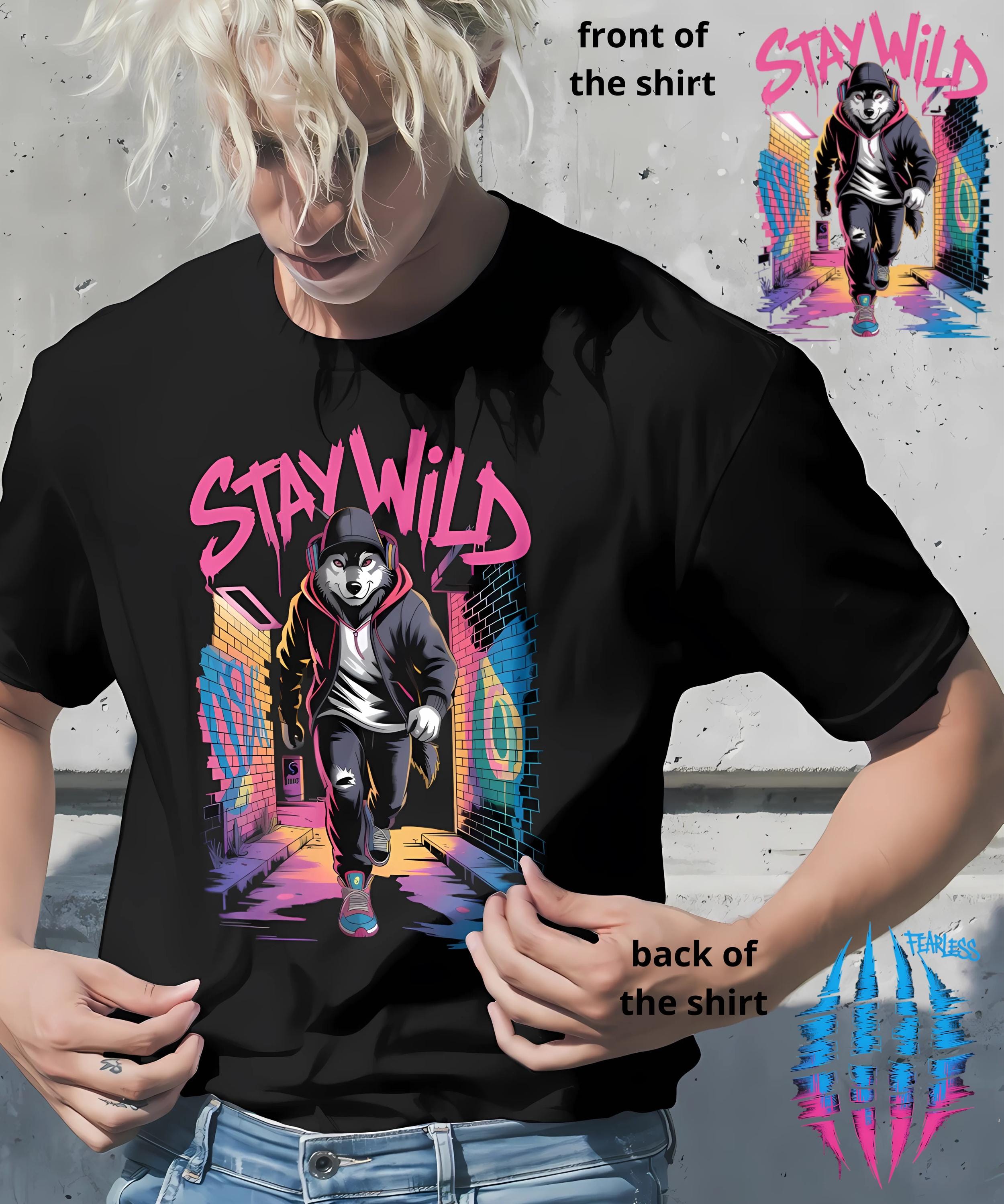 Unleash your wild side with our Stay Wild Fearless Wolf T-Shirt, a bold urban streetwear graphic tee for men and women. This eye-catching design features a badass wolf in a hoodie with headphones, walking through a graffiti alley — the ultimate symbol of freedom and confidence. Printed on a premium dual print front and back shirt, it also features a striking "FEARLESS" claw mark design on the back that screams power and individuality.
