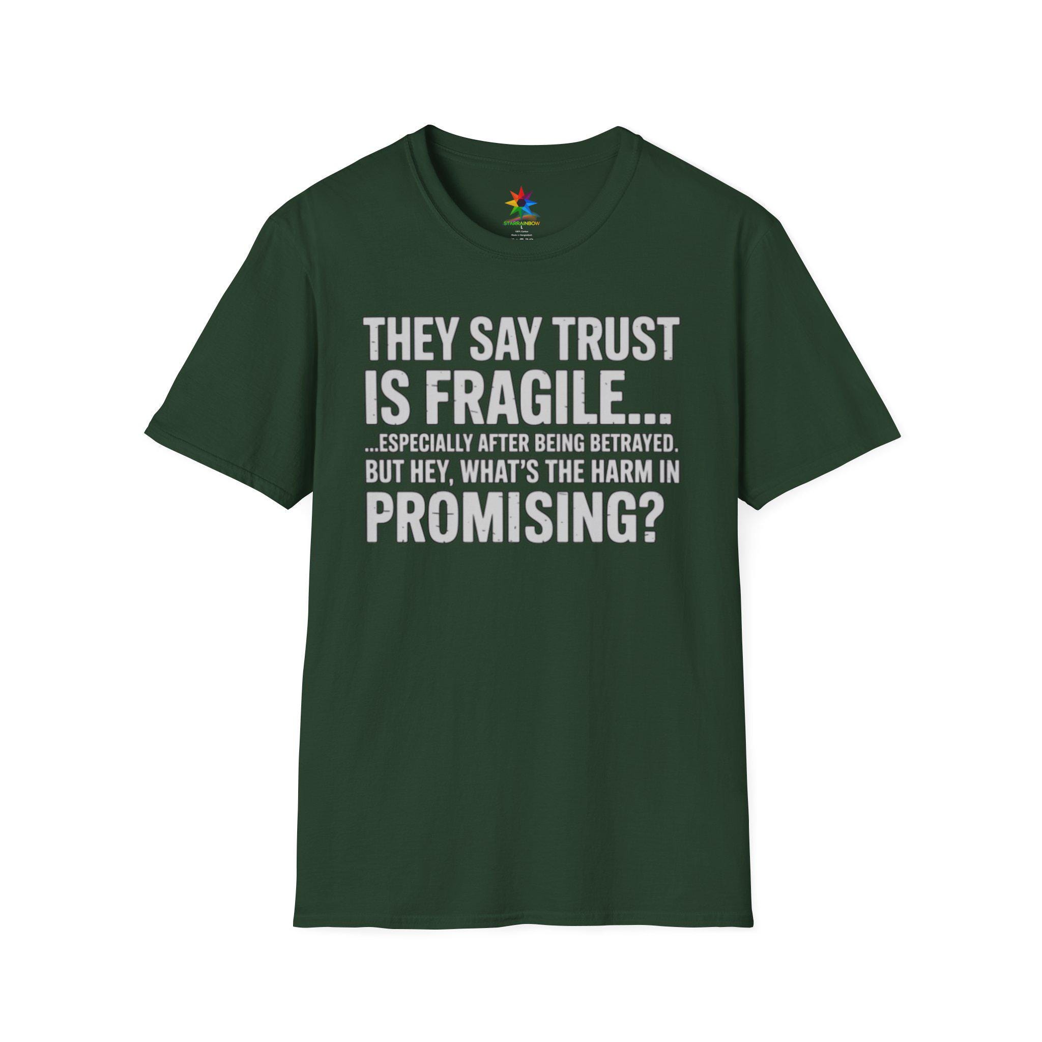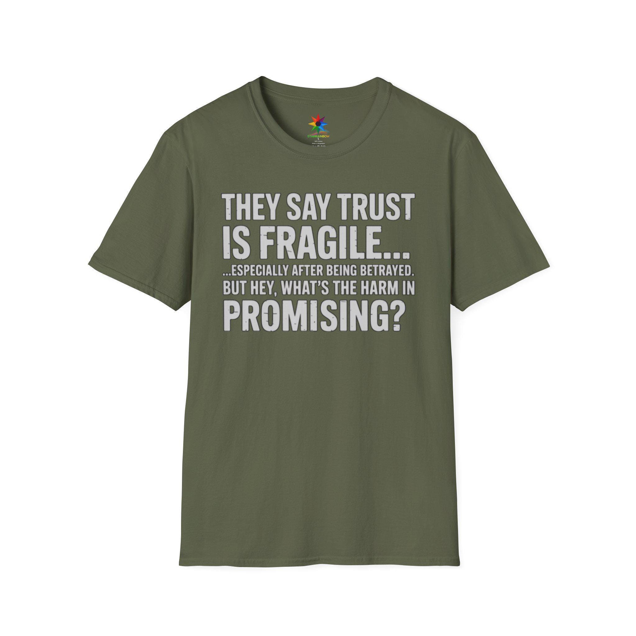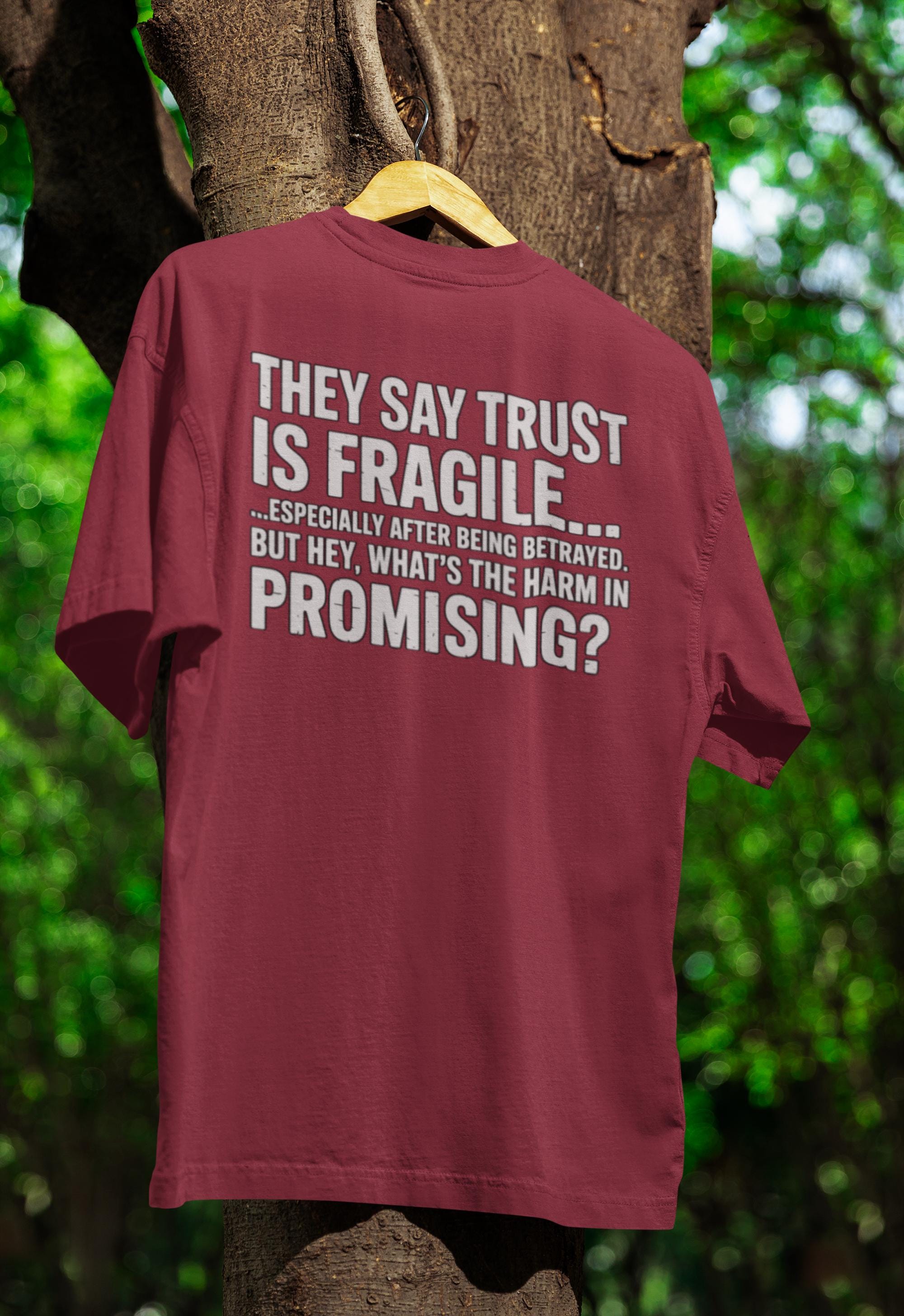 Step into the world of witty sarcasm with our "Trust Is Fragile... Betrayal" shirt. This design features the ironic quote: "They say trust is fragile... especially after being betrayed. But hey, What’s the harm in promising?" – a perfect blend of humor and truth.