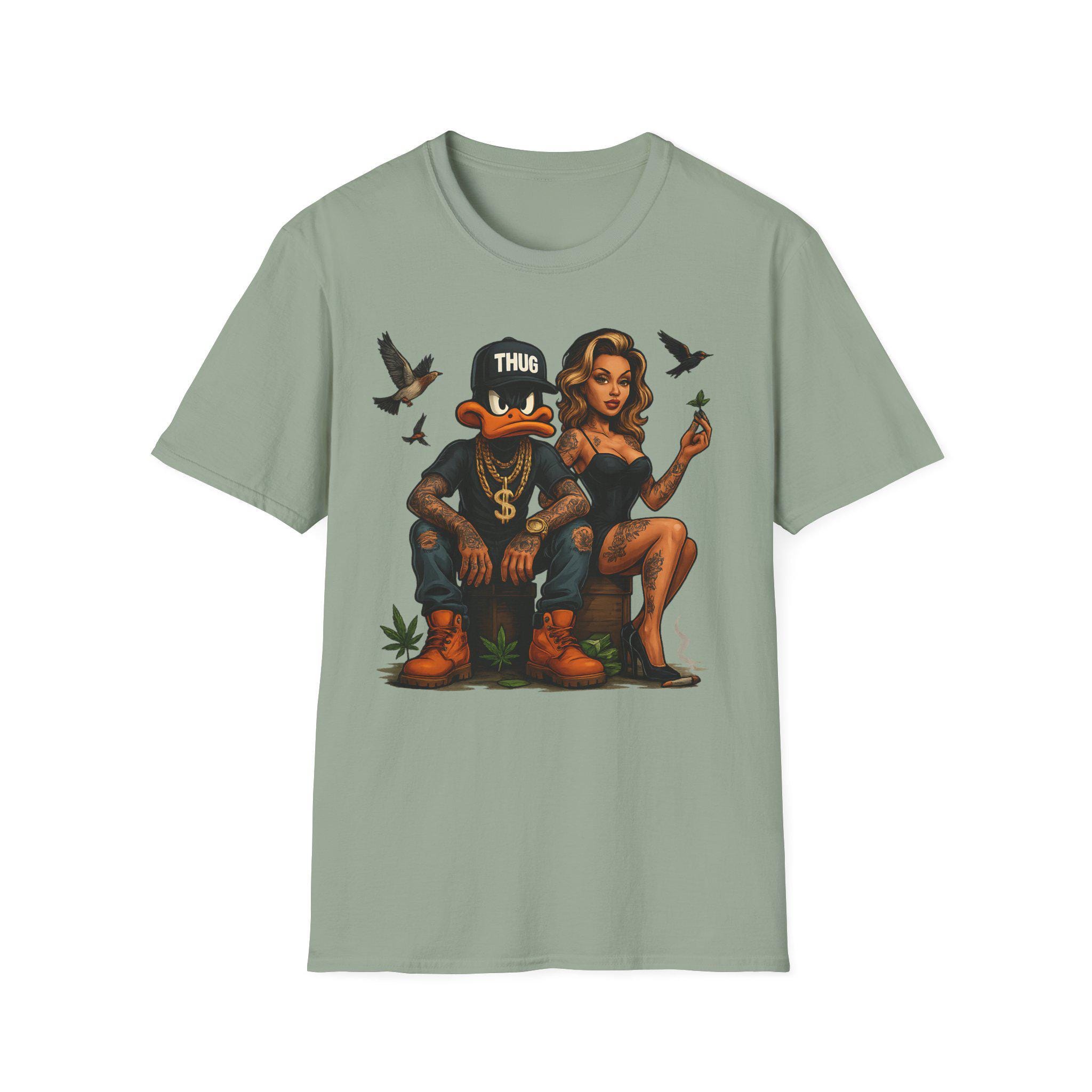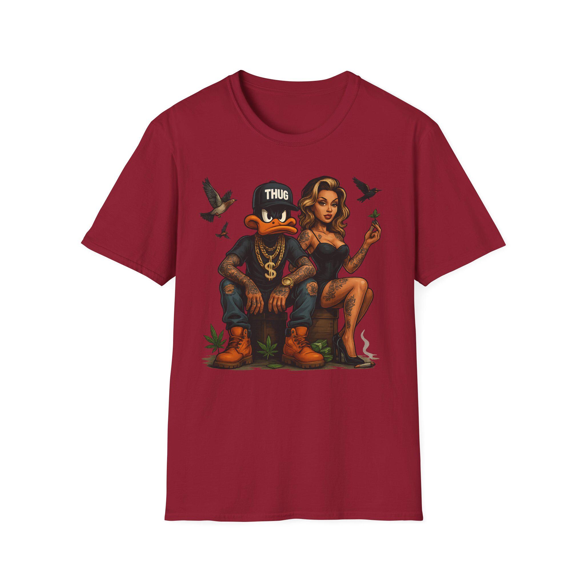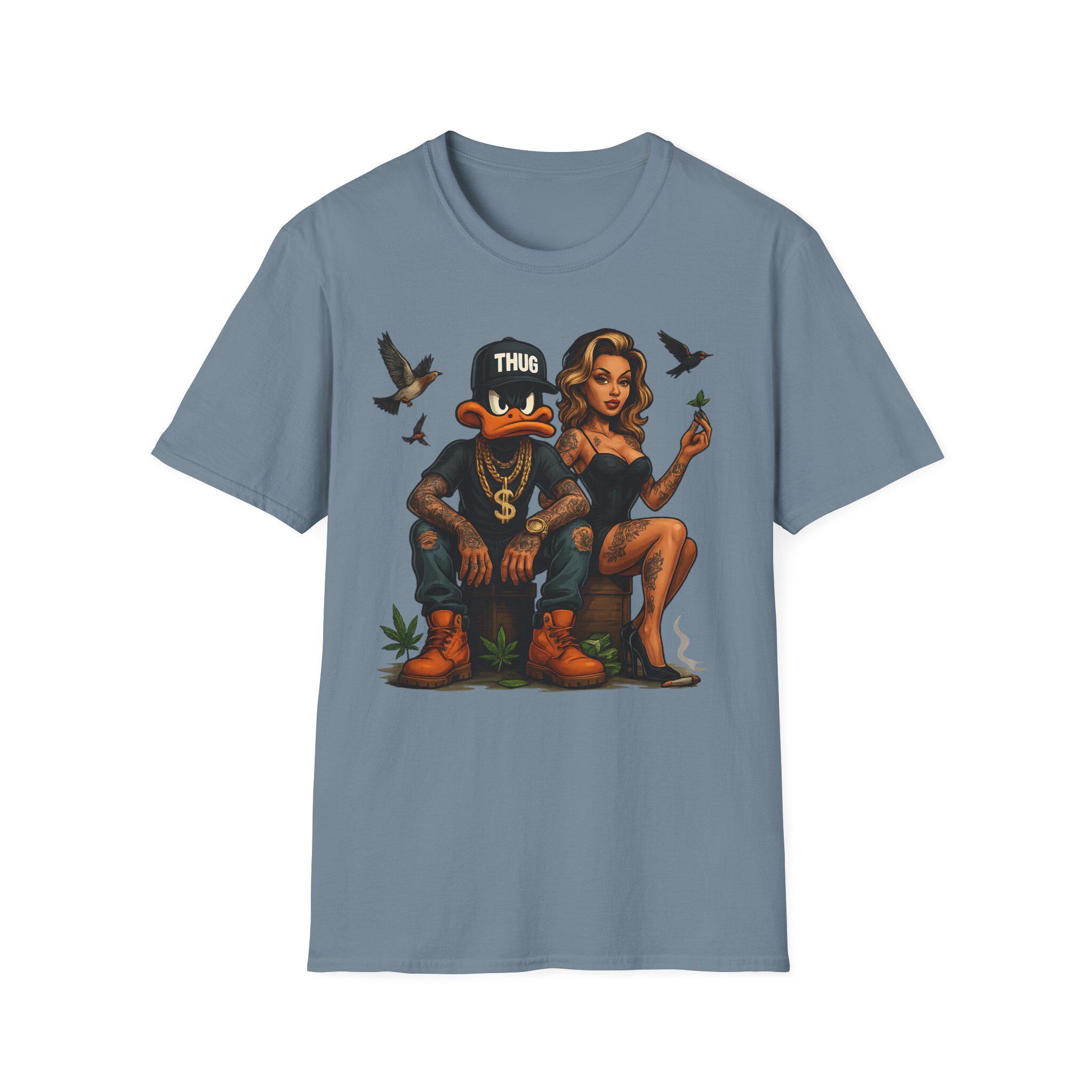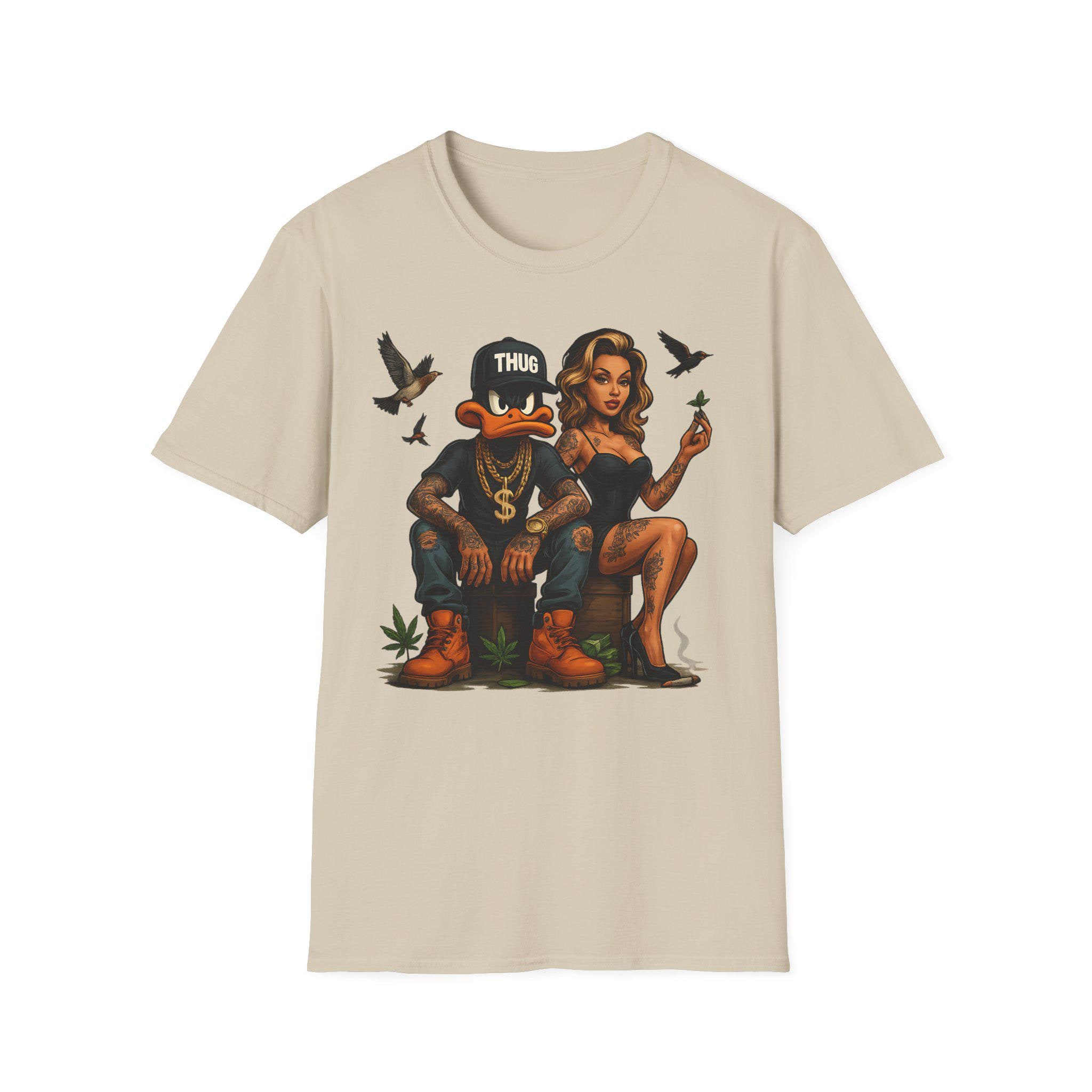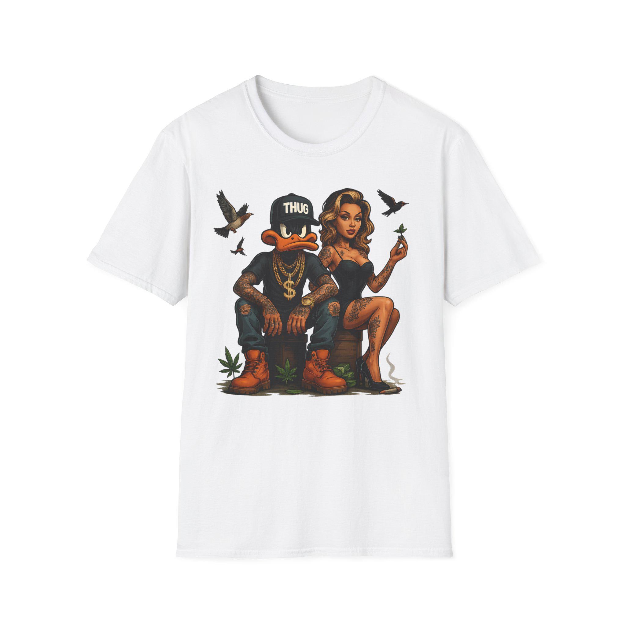 Discover your unique style with our Hip Hop Streetwear T-Shirt, Weed Cartoon Gangster Duck Shirt, Urban Art Tattoo Couple Tee, Thug Life Dope Stoner Graphic Shirt! This original t-shirt is the perfect choice for anyone who loves hip hop culture, streetwear, urban art, and bold, eye-catching graphics. The shirt features a one-of-a-kind design with a cartoon gangster duck rocking a “THUG” cap, gold chains, and boots, sitting next to a stunning tattooed woman holding a marijuana leaf. The whole scene is brought to life with birds and leaf details, giving the artwork even more character and attitude.