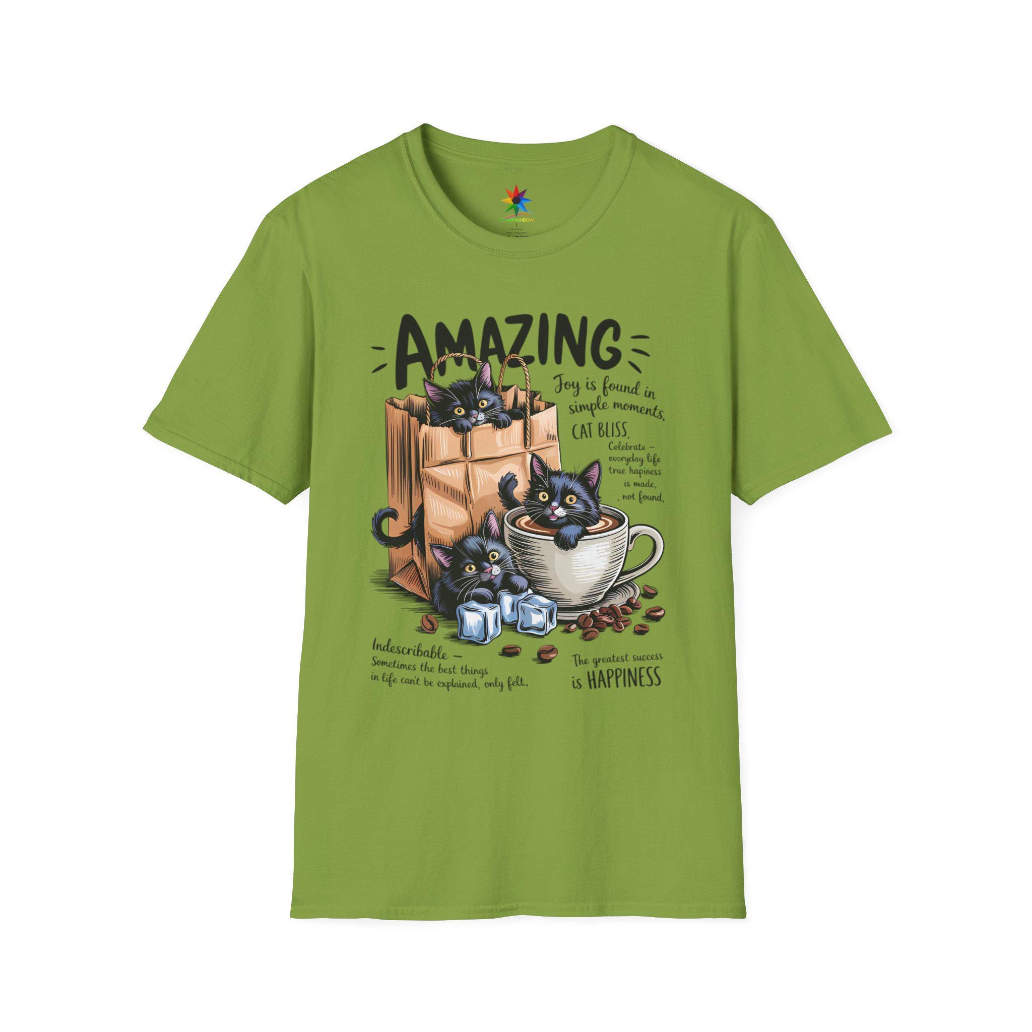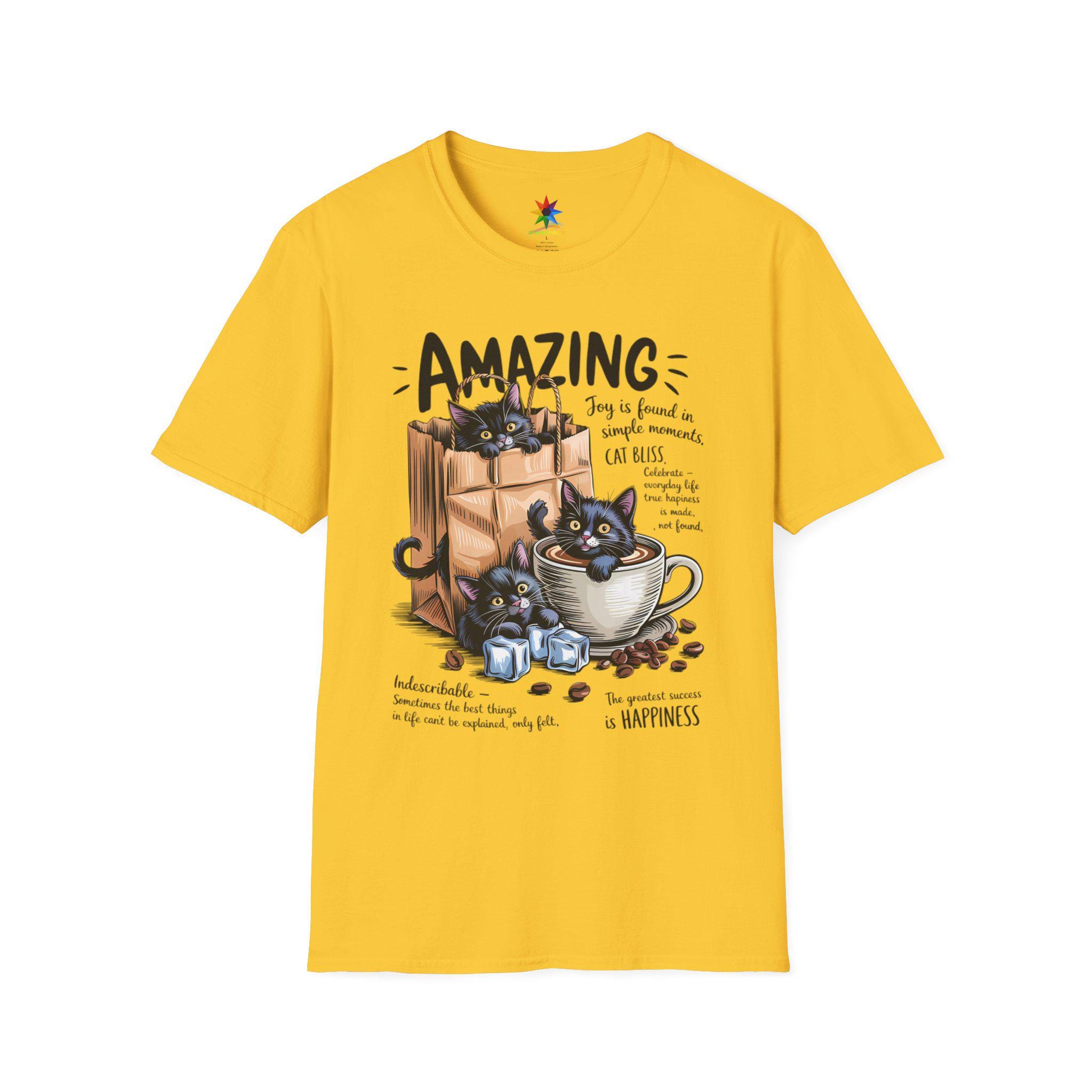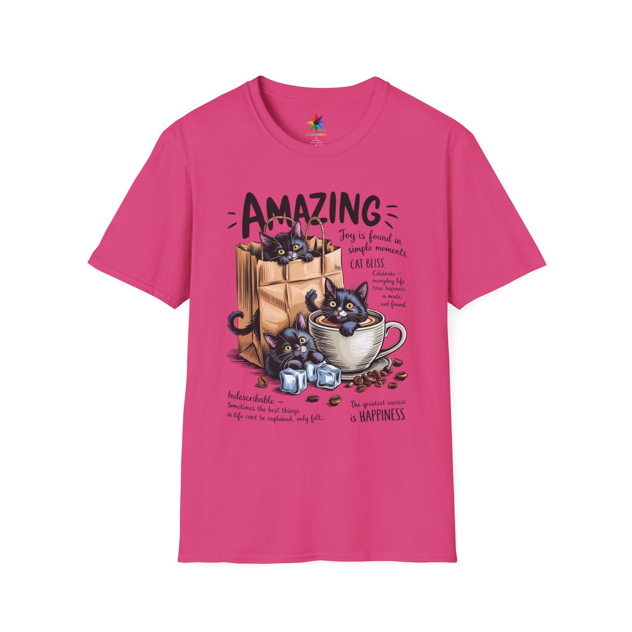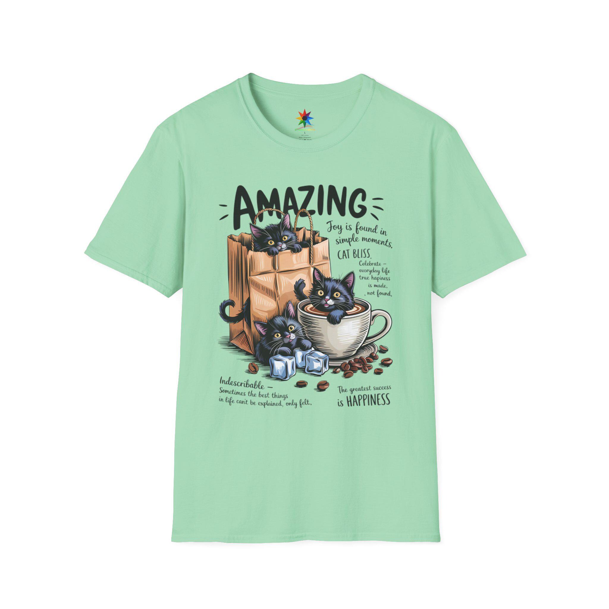 Discover the perfect blend of cuteness, comfort, and style with our Amazing Cat Shirt Oversized Coffee Cat T-Shirt! This unique unisex tee features an adorable cartoon design of black cats playing with coffee beans, ice cubes, and a paper bag, all brought together with a motivational message about happiness and enjoying the simple moments in life. Whether you're a dedicated cat lover, a coffee enthusiast, or just someone who appreciates kawaii style, this black cat cartoon shirt is made for you.
