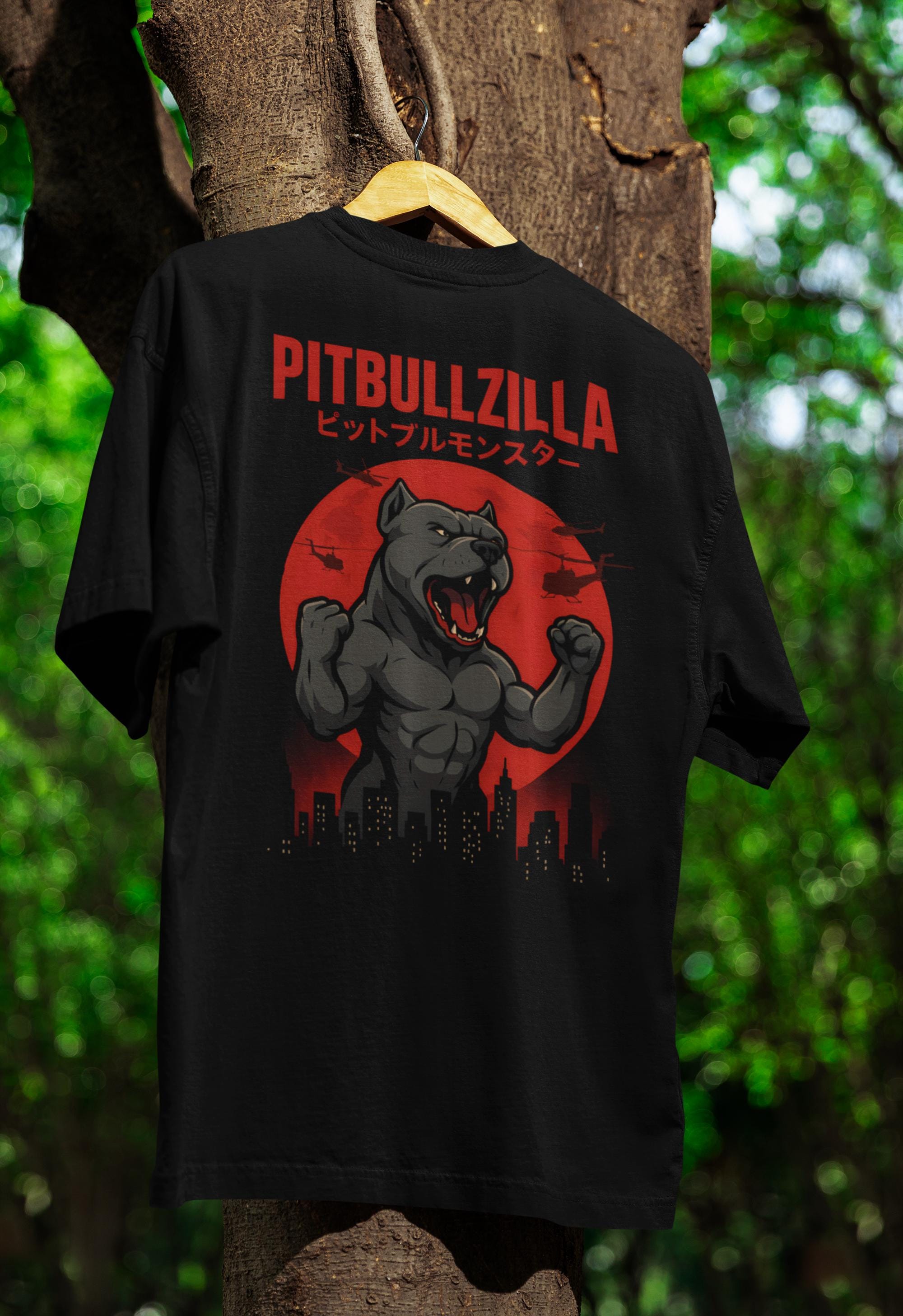 Pitbullzilla is a unique and funny pitbull design inspired by Japanese style and classic Godzilla parody art. This artwork features a muscular pitbull monster towering over a city skyline, with helicopters flying in the background and a bold red sun, all in a pop culture streetwear vibe. The text "PITBULLZILLA" and Japanese characters add an authentic touch for fans of Japanese aesthetics.