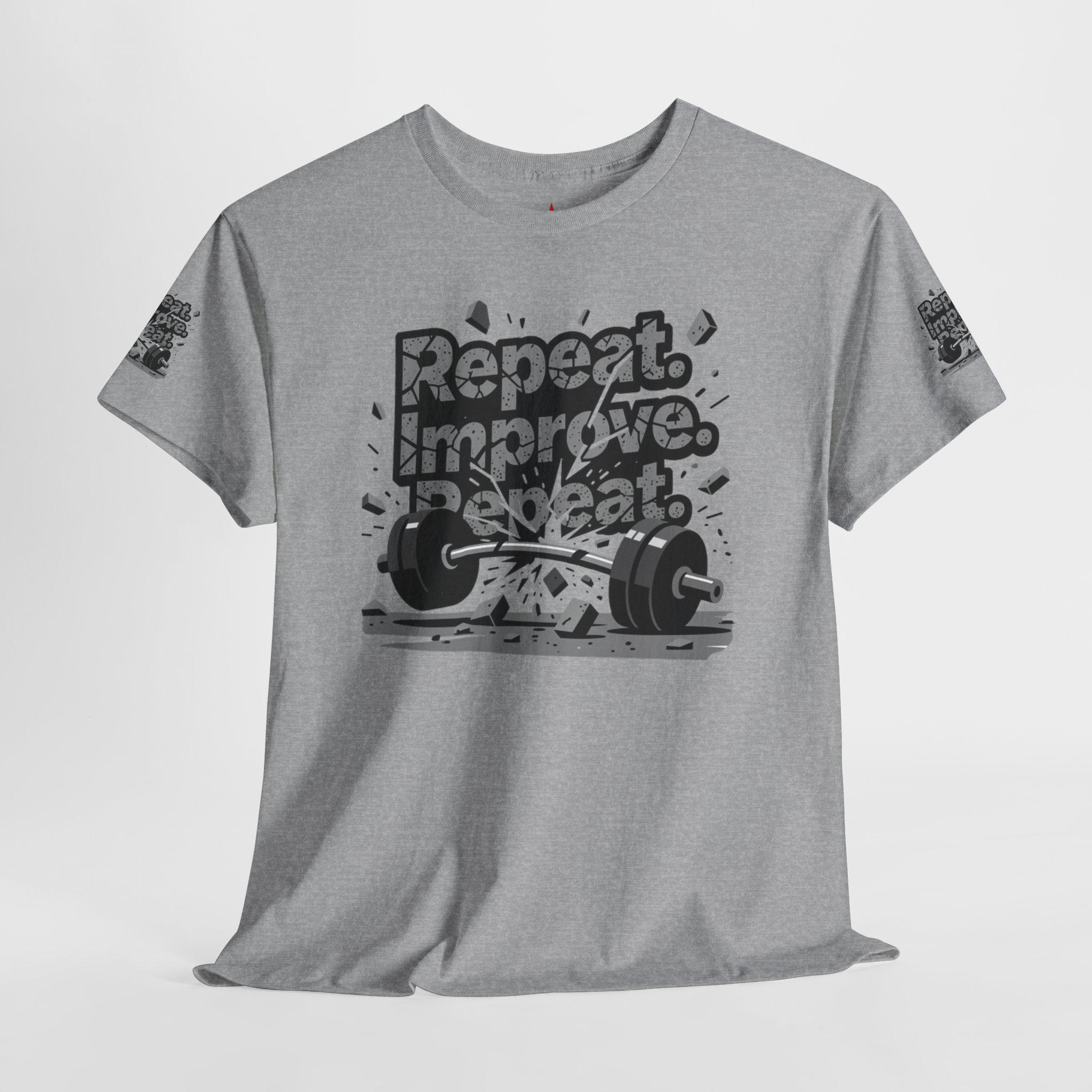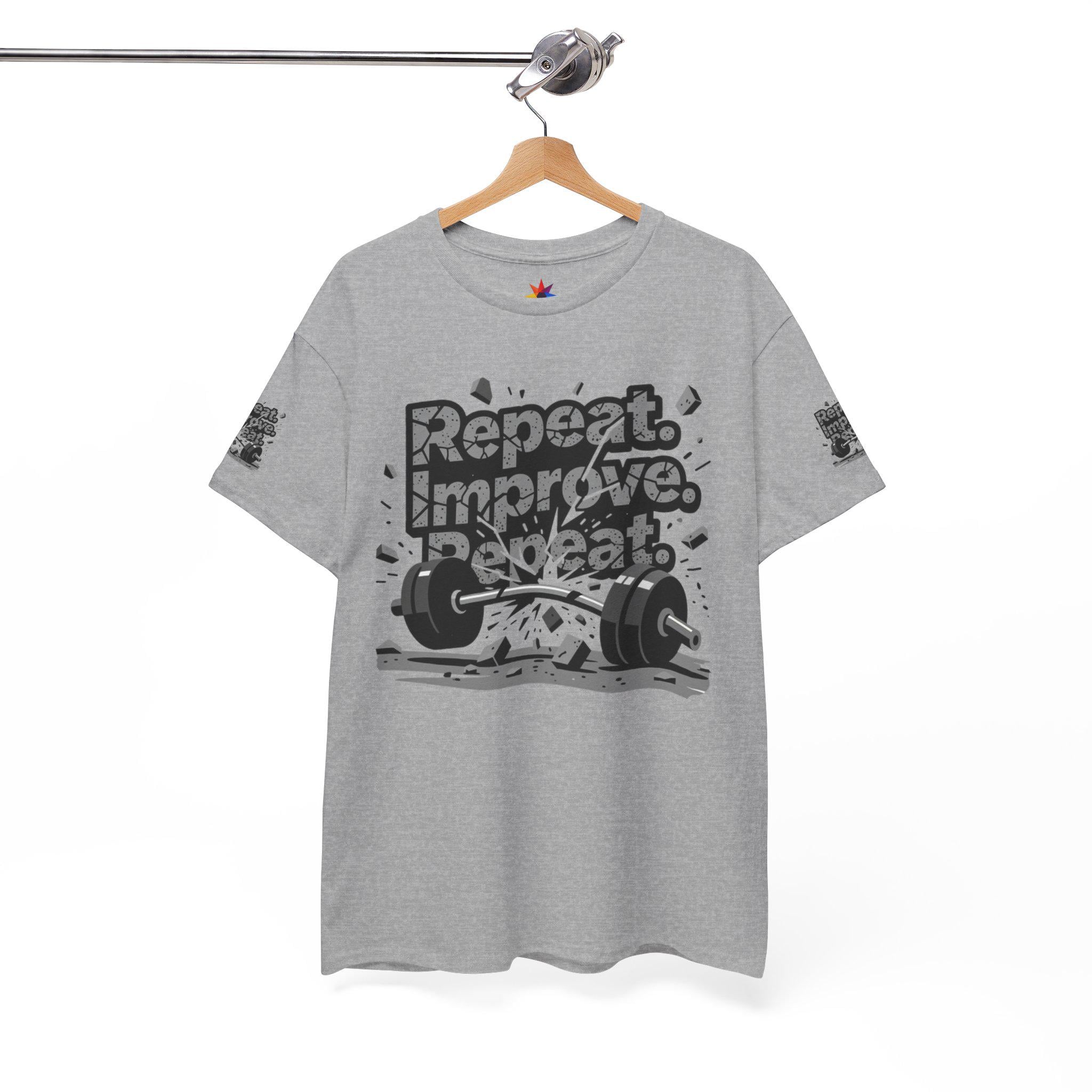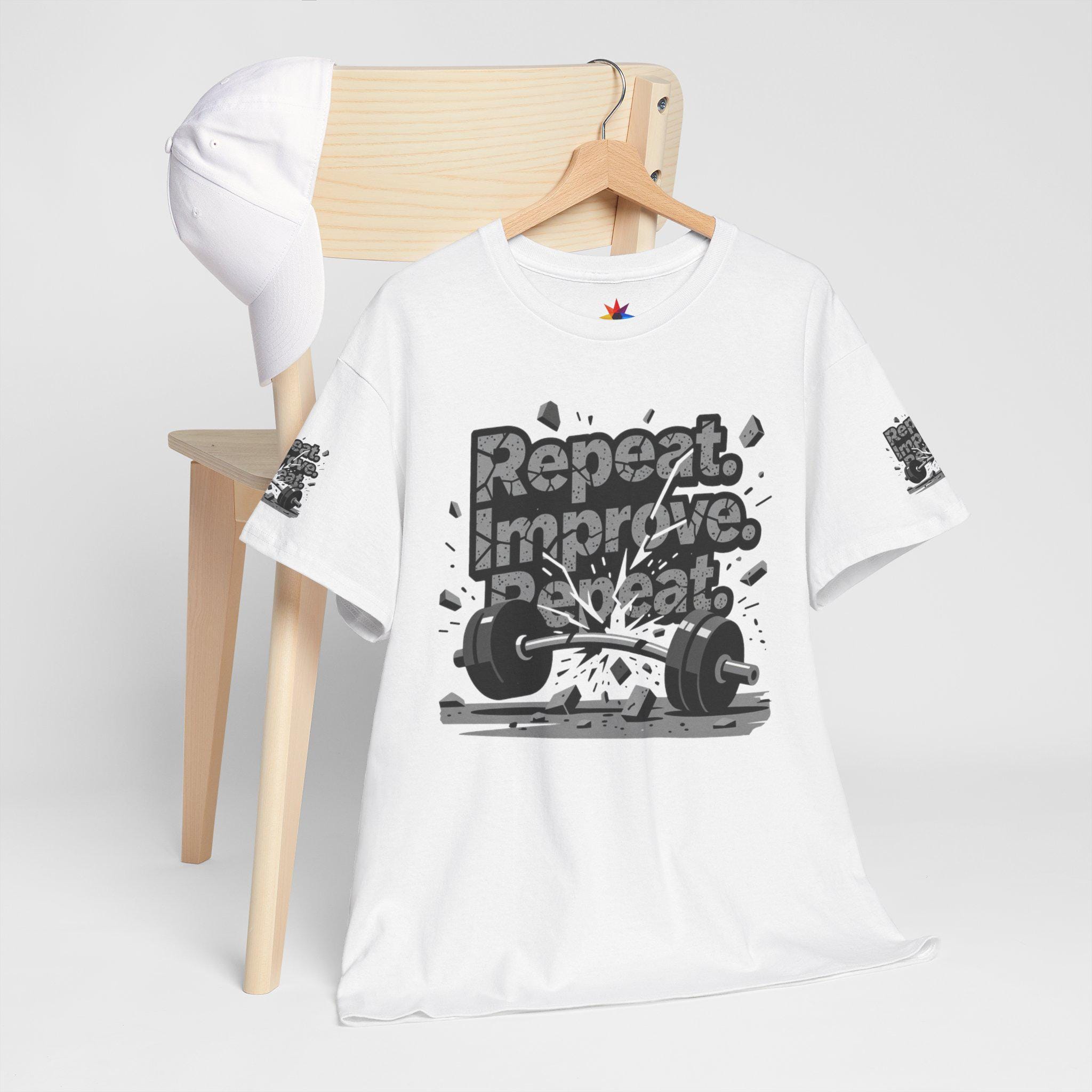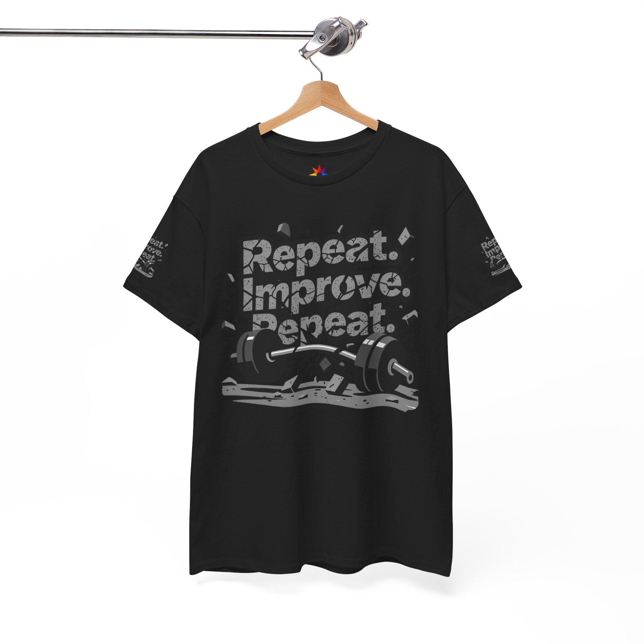 Elevate your workout wardrobe with our Motivational Barbell Gym T-Shirt for Men and Women, featuring the powerful "Repeat. Improve. Repeat." design. Crafted for serious lifters and fitness enthusiasts, this athletic tee embodies the relentless spirit of strength training and dedication.