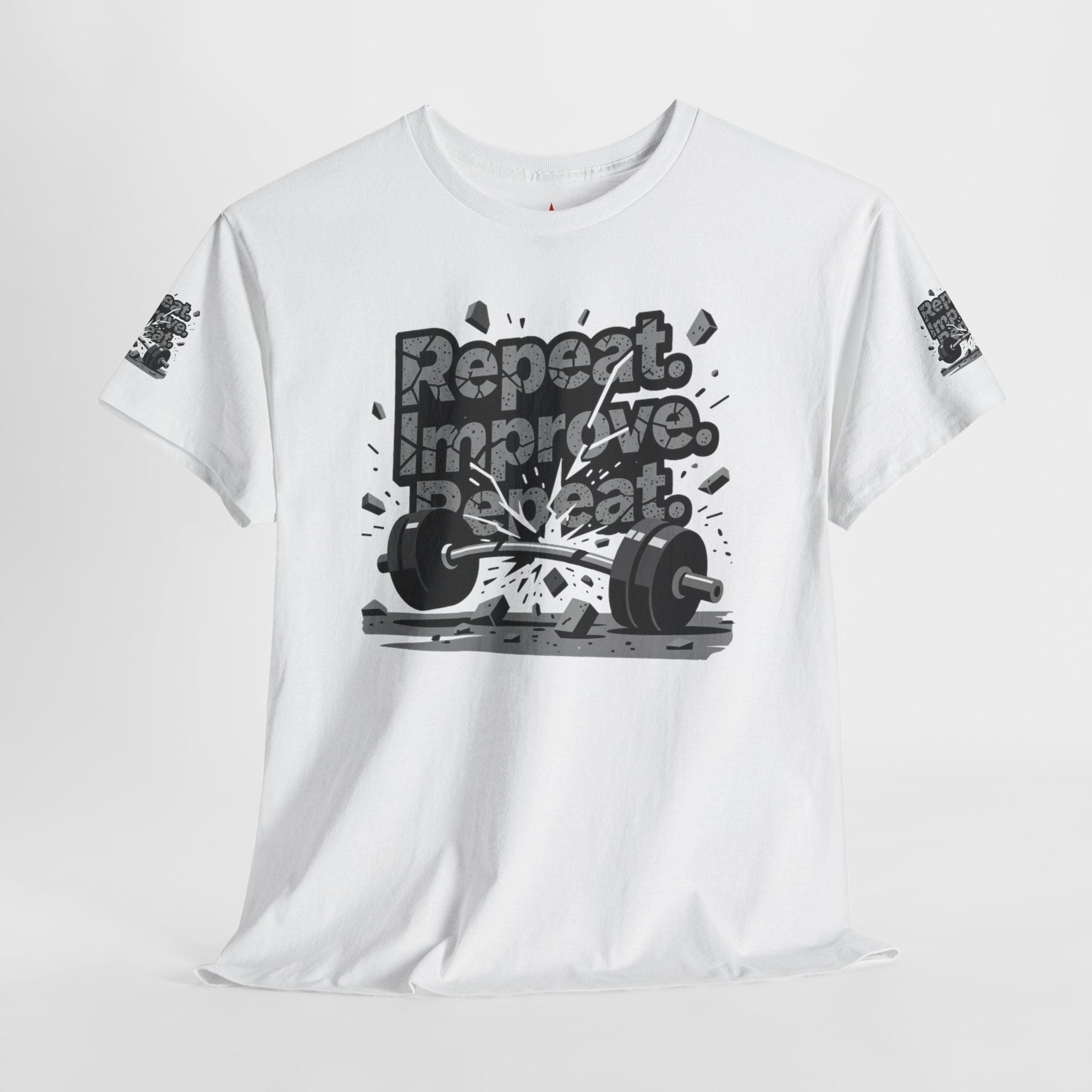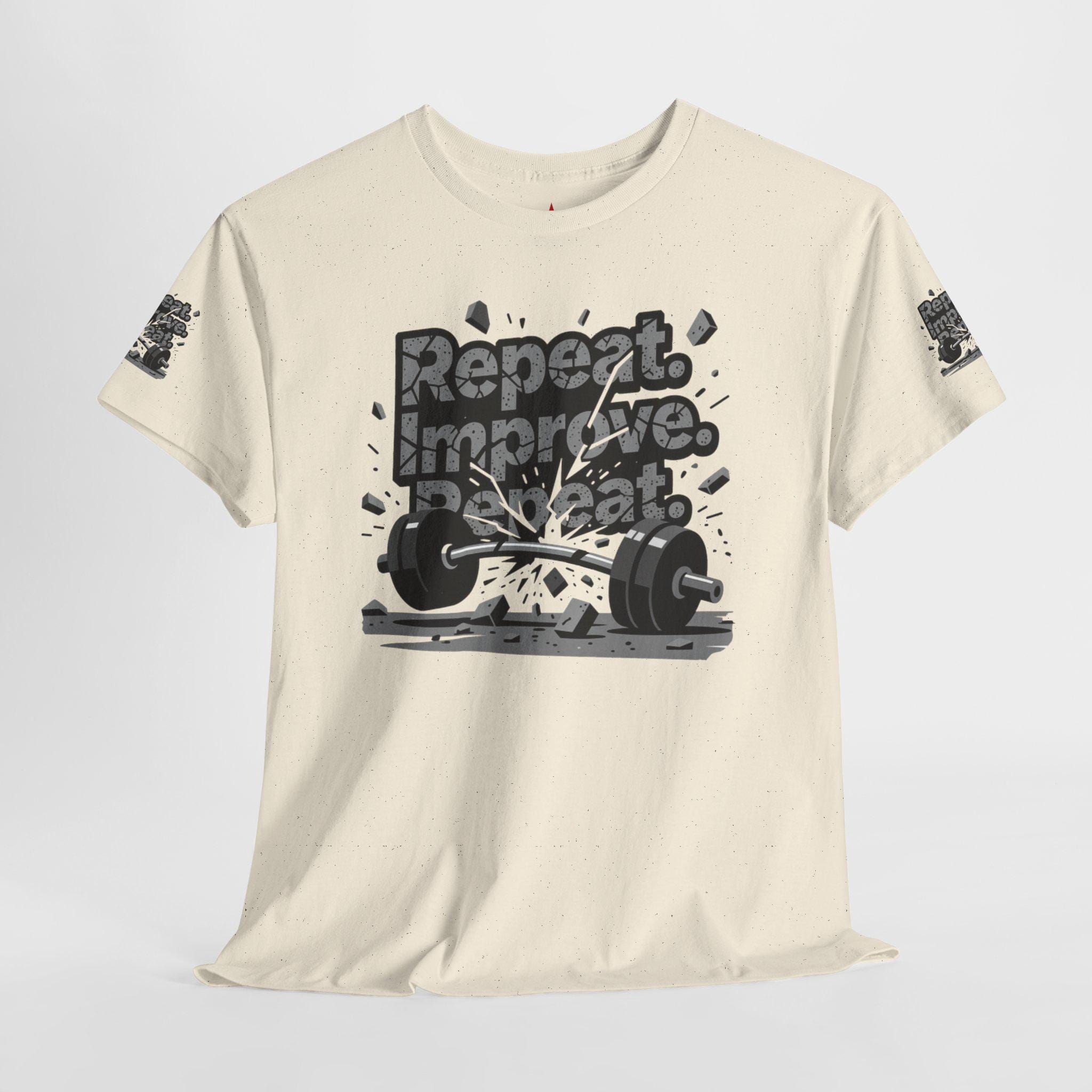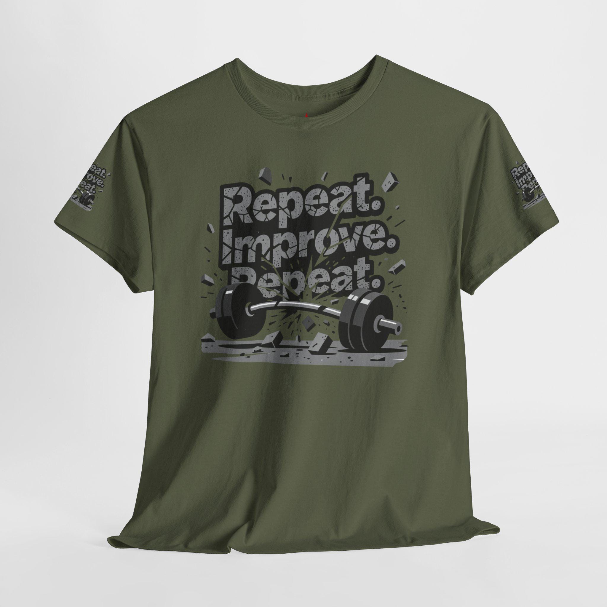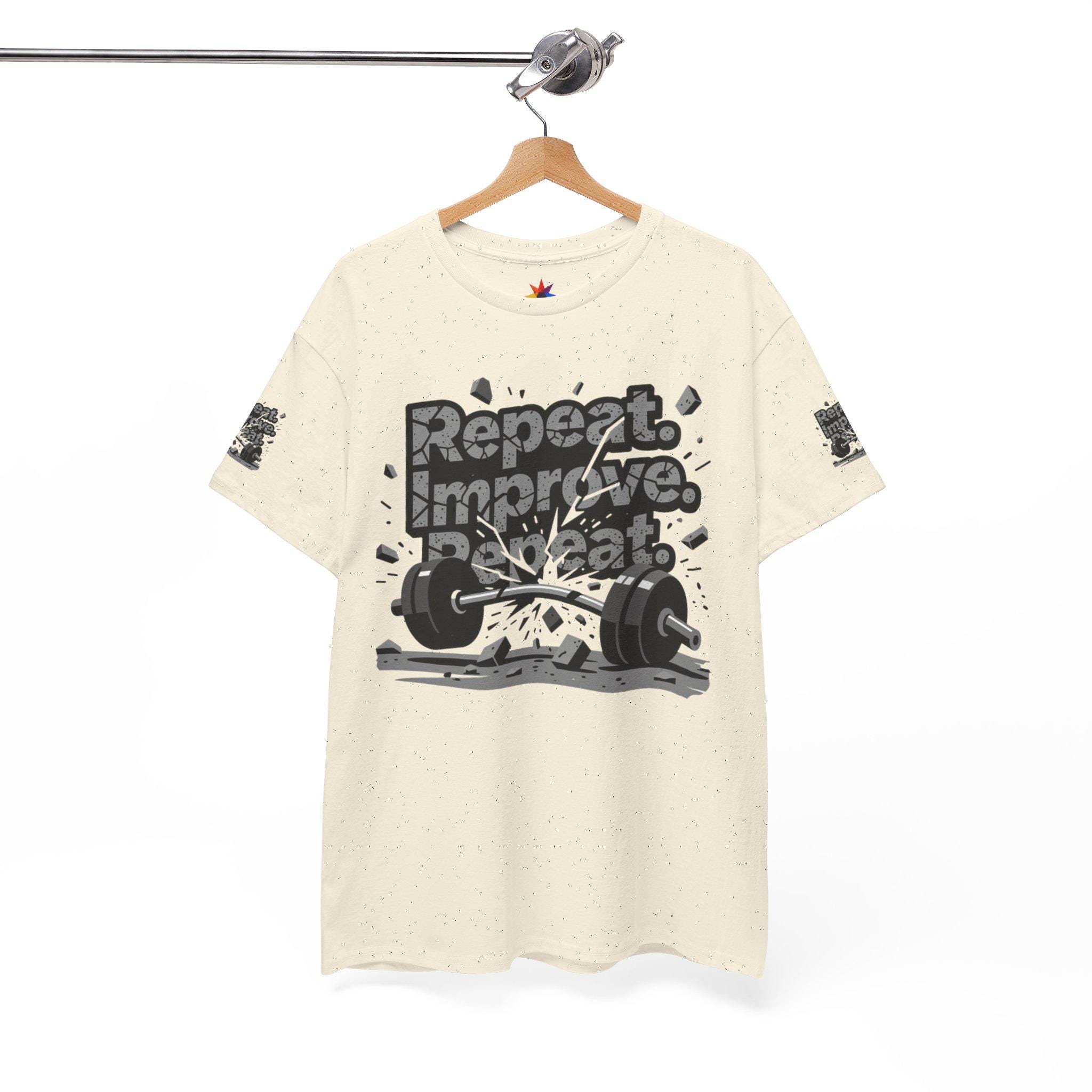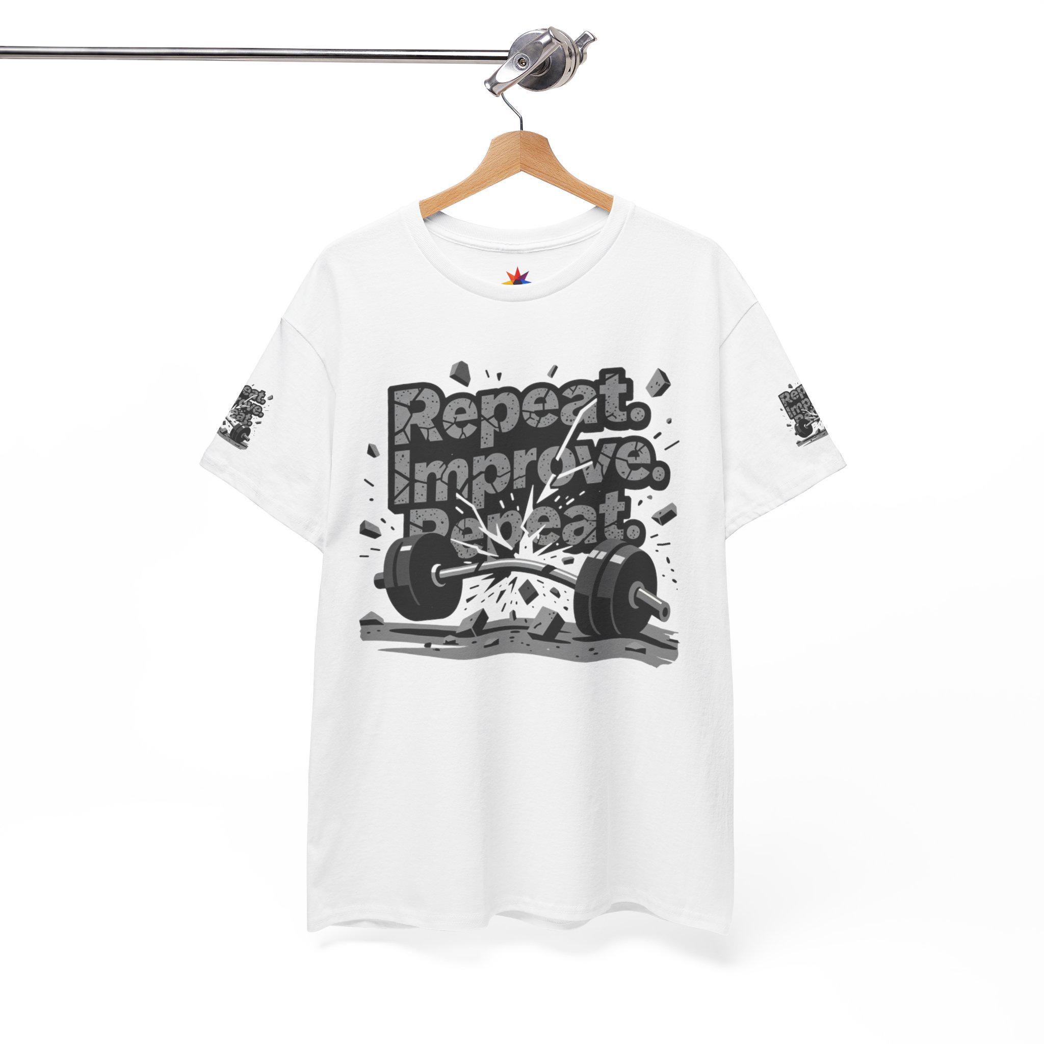 Elevate your workout wardrobe with our Motivational Barbell Gym T-Shirt for Men and Women, featuring the powerful "Repeat. Improve. Repeat." design. Crafted for serious lifters and fitness enthusiasts, this athletic tee embodies the relentless spirit of strength training and dedication.