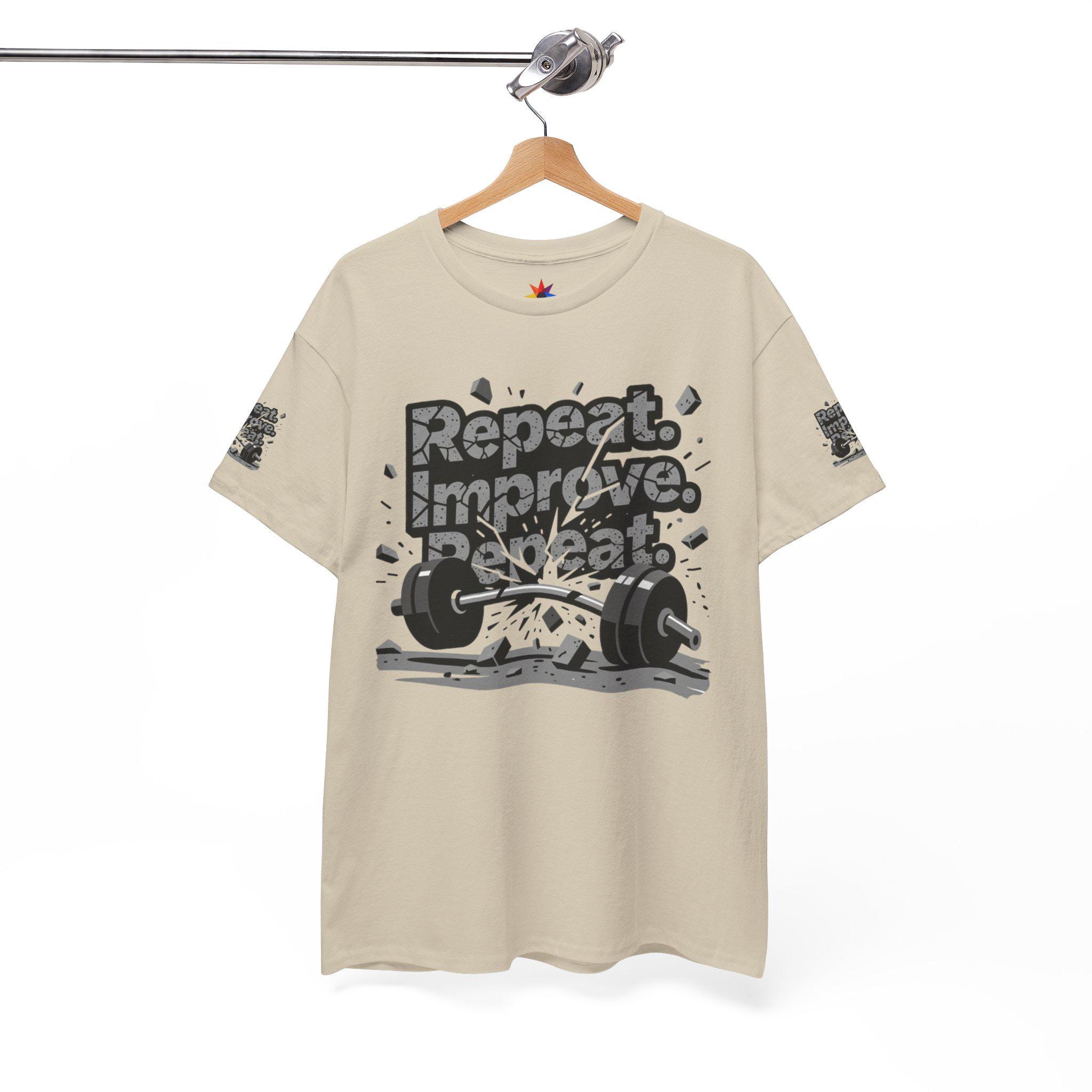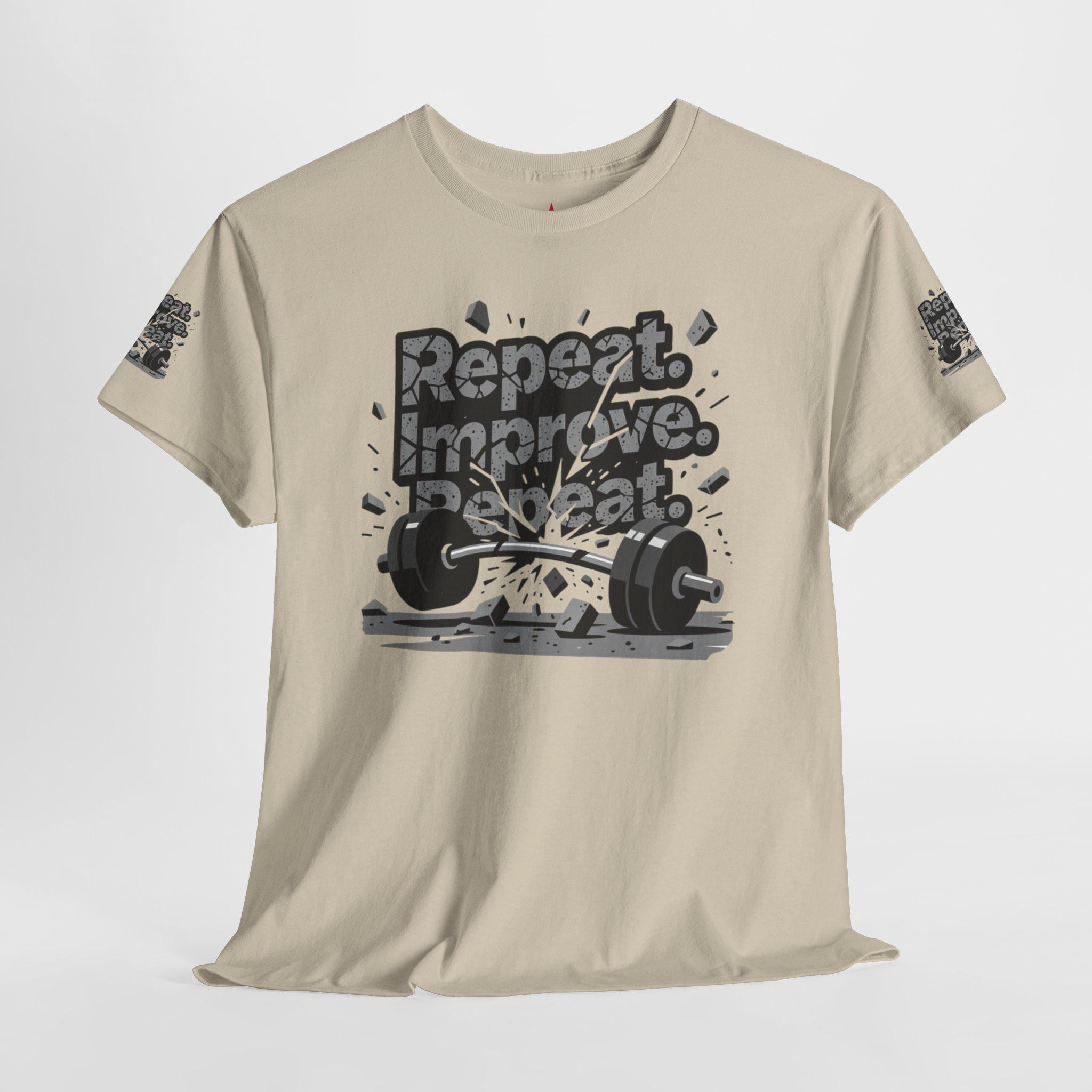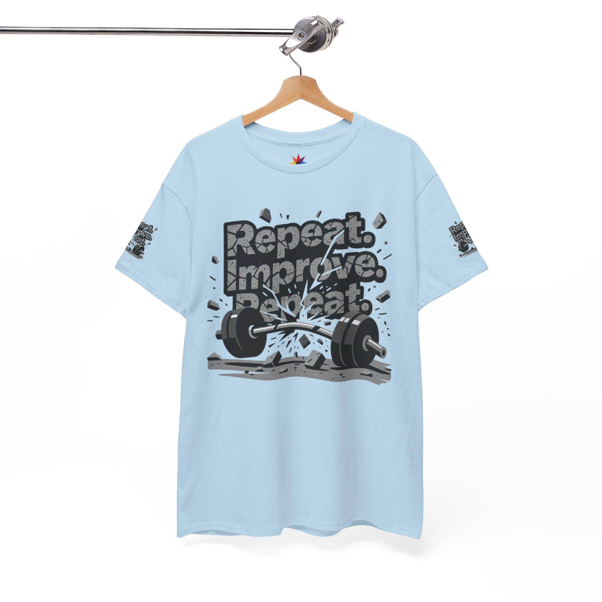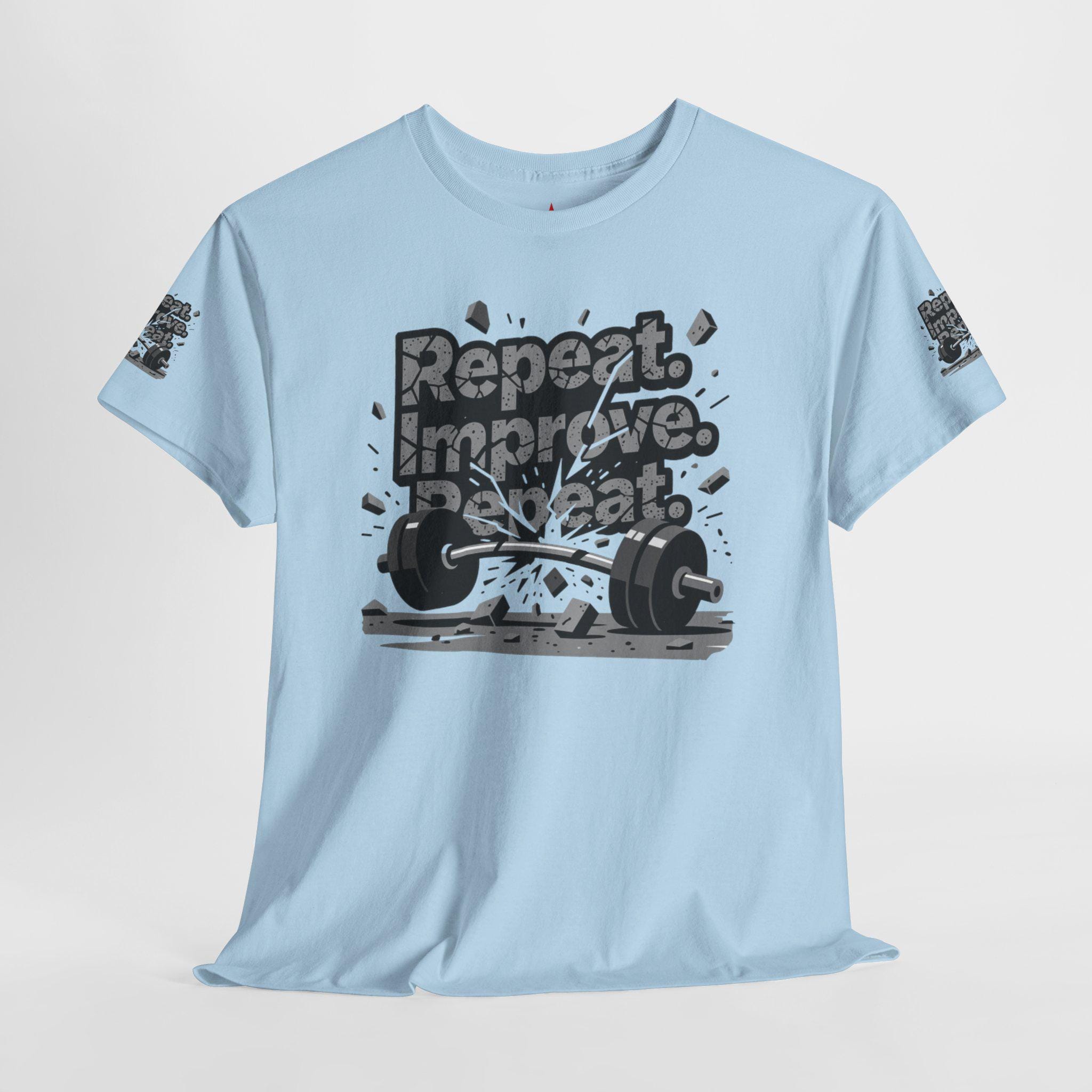 Elevate your workout wardrobe with our Motivational Barbell Gym T-Shirt for Men and Women, featuring the powerful "Repeat. Improve. Repeat." design. Crafted for serious lifters and fitness enthusiasts, this athletic tee embodies the relentless spirit of strength training and dedication.